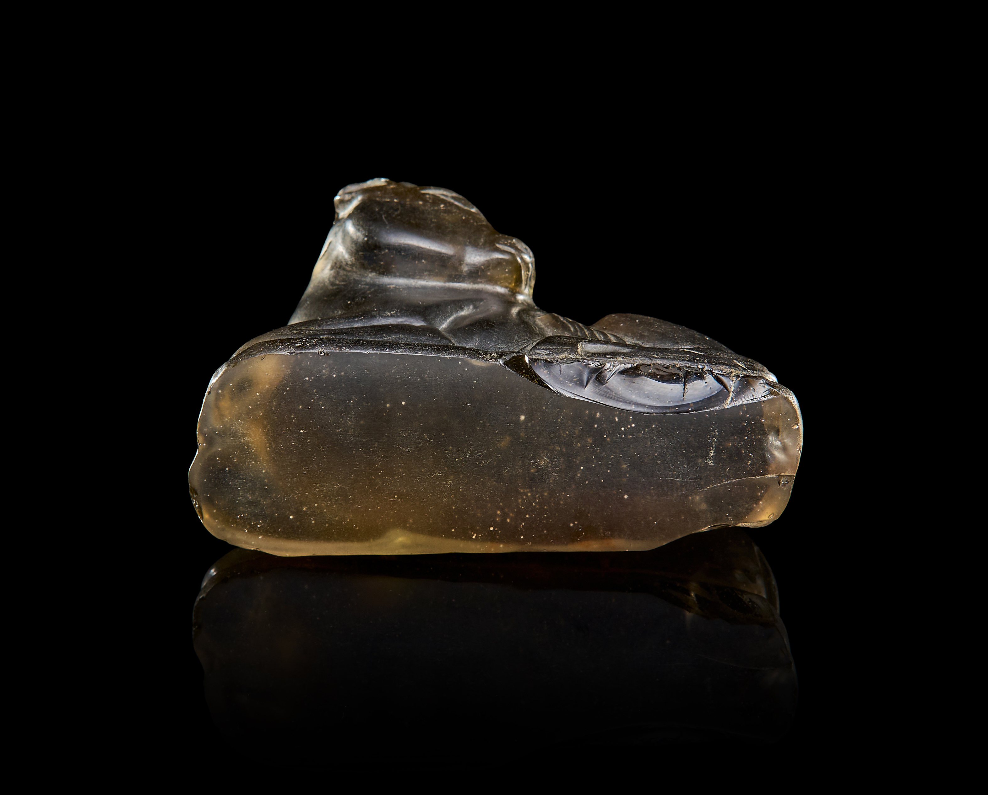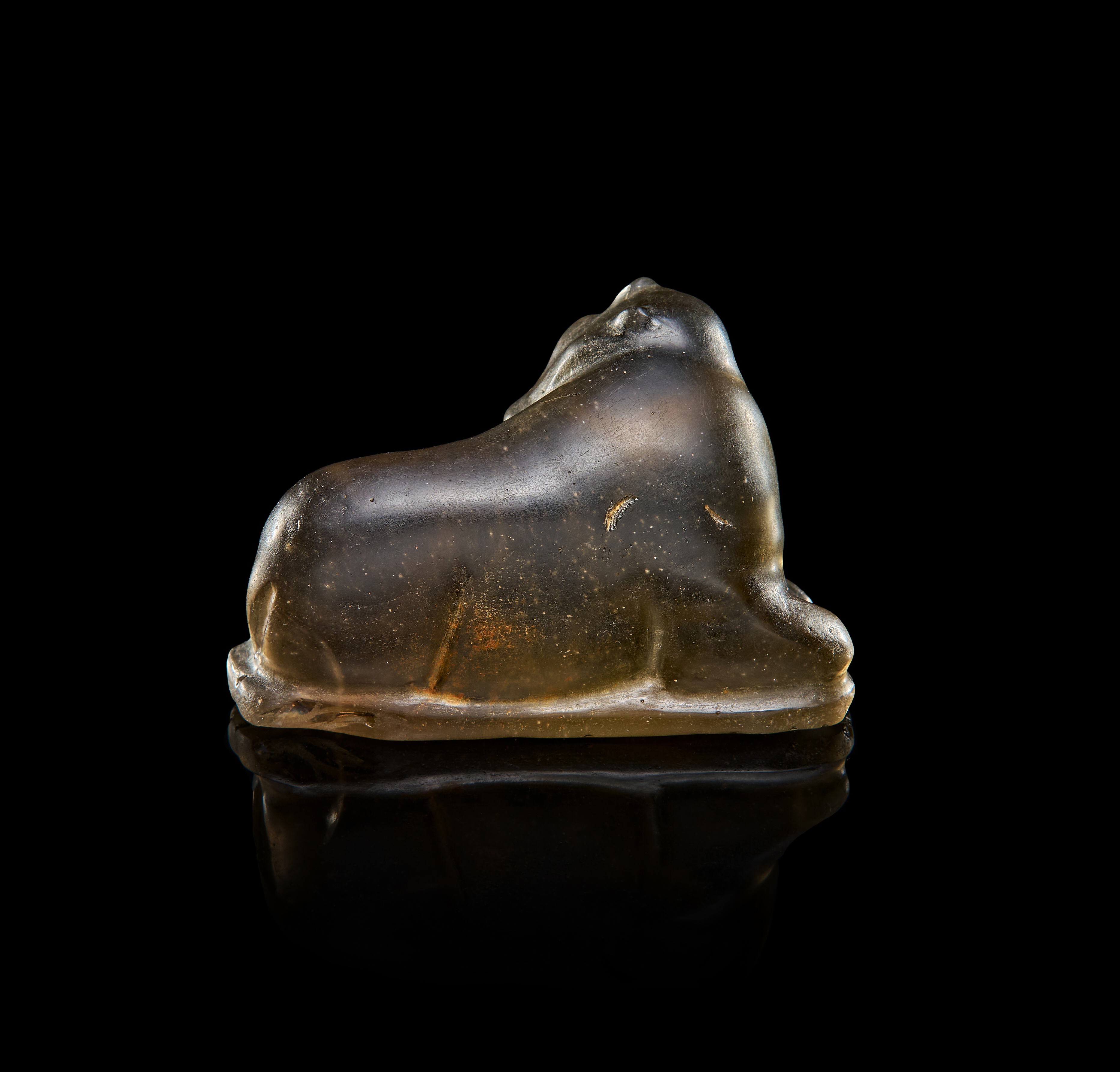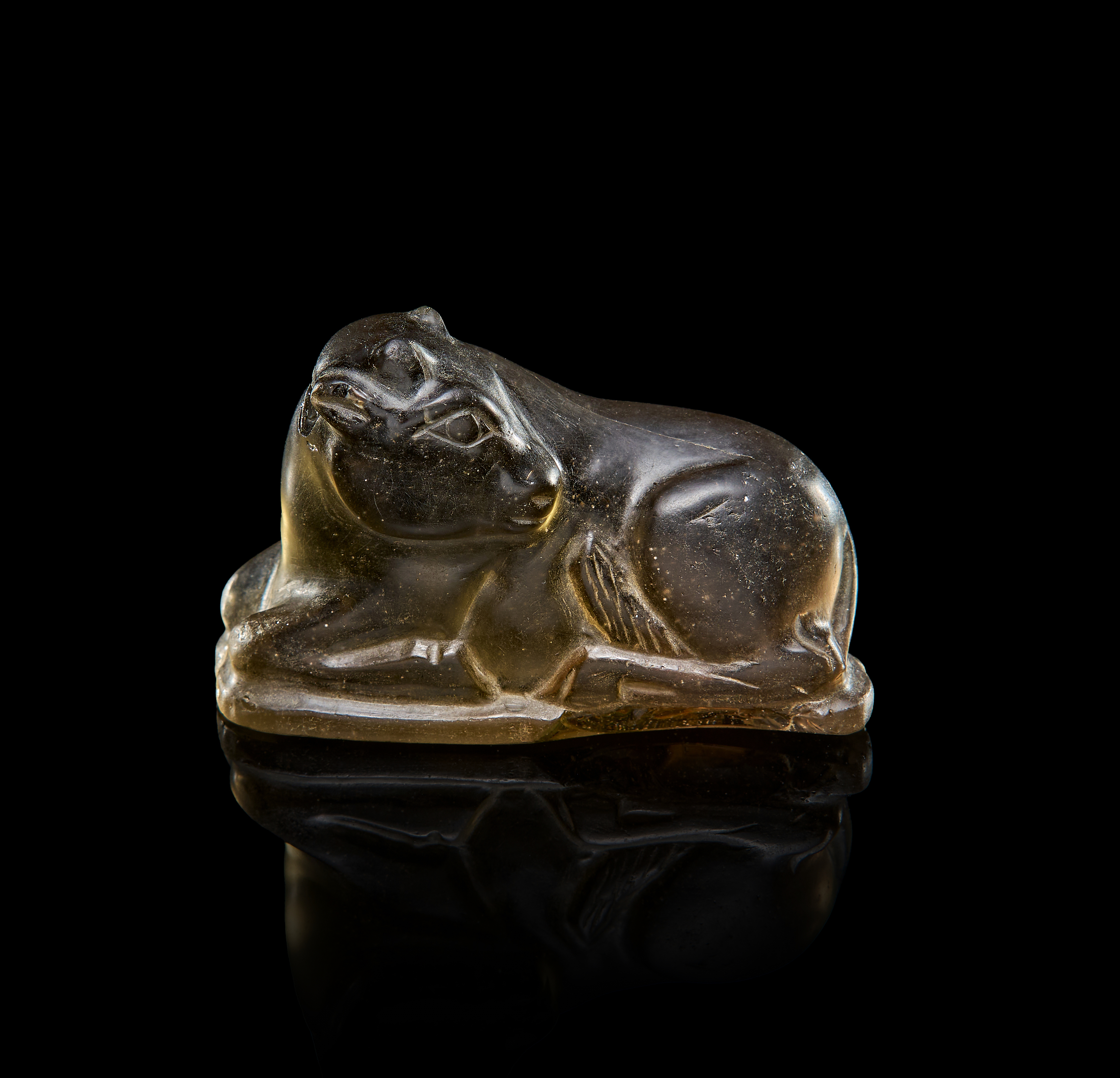 A beautifully carved representation of a recumbent cow sculpted from translucent smoky quartz, dating to the Persian Achaemenid period, circa 500 B.C. This compact yet powerful figure is rendered with a serene presence, the animal depicted in a natural resting pose with limbs tucked beneath the body and the head turned slightly to one side.