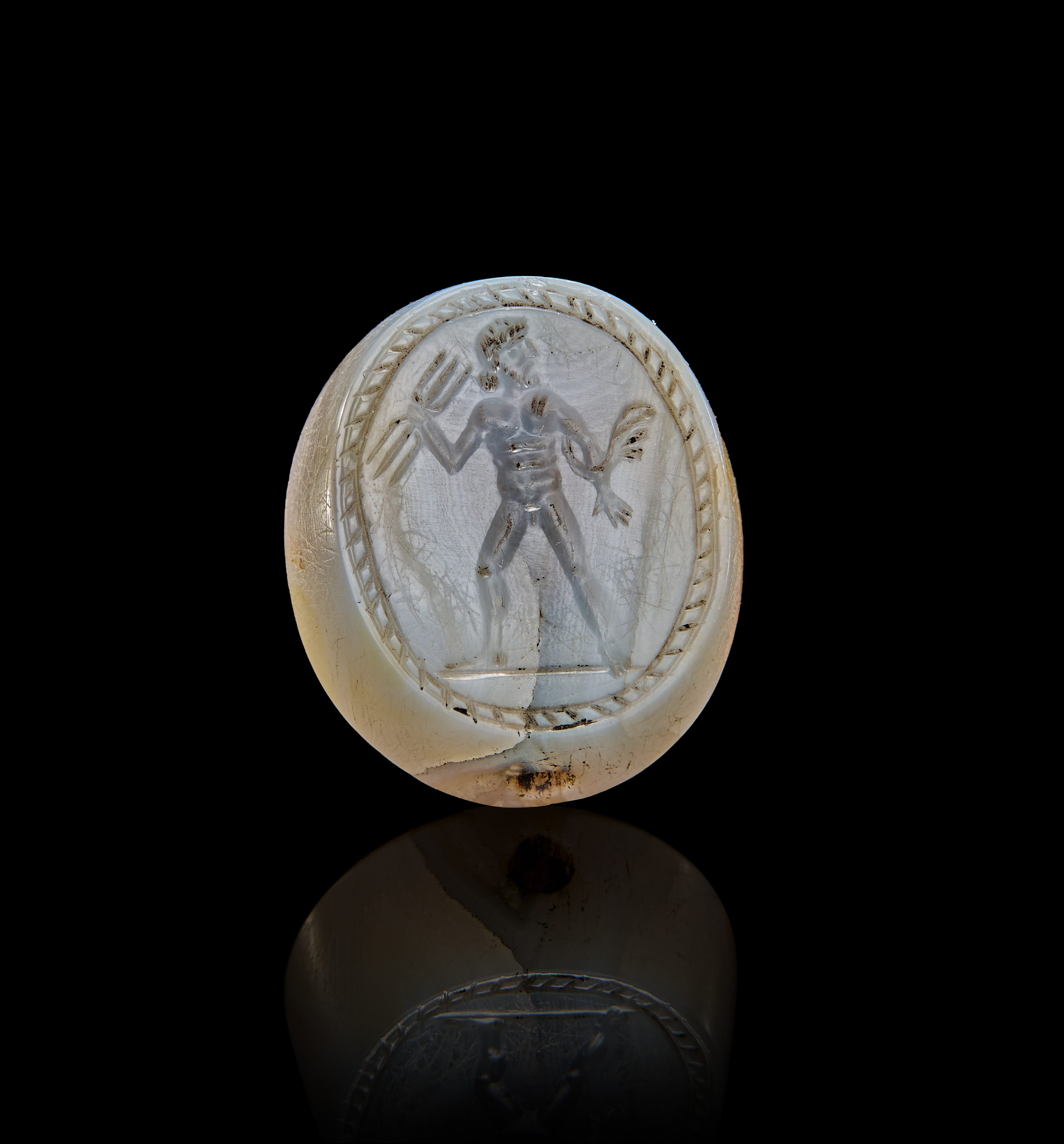 AN EARLY HELLENISTIC AGATE STAMP SEAL DEPICTING ZEUS HOLDING THUNDERBOLT, EARLY GREEK PERIOD, POSSIBLY 400-300 B.C