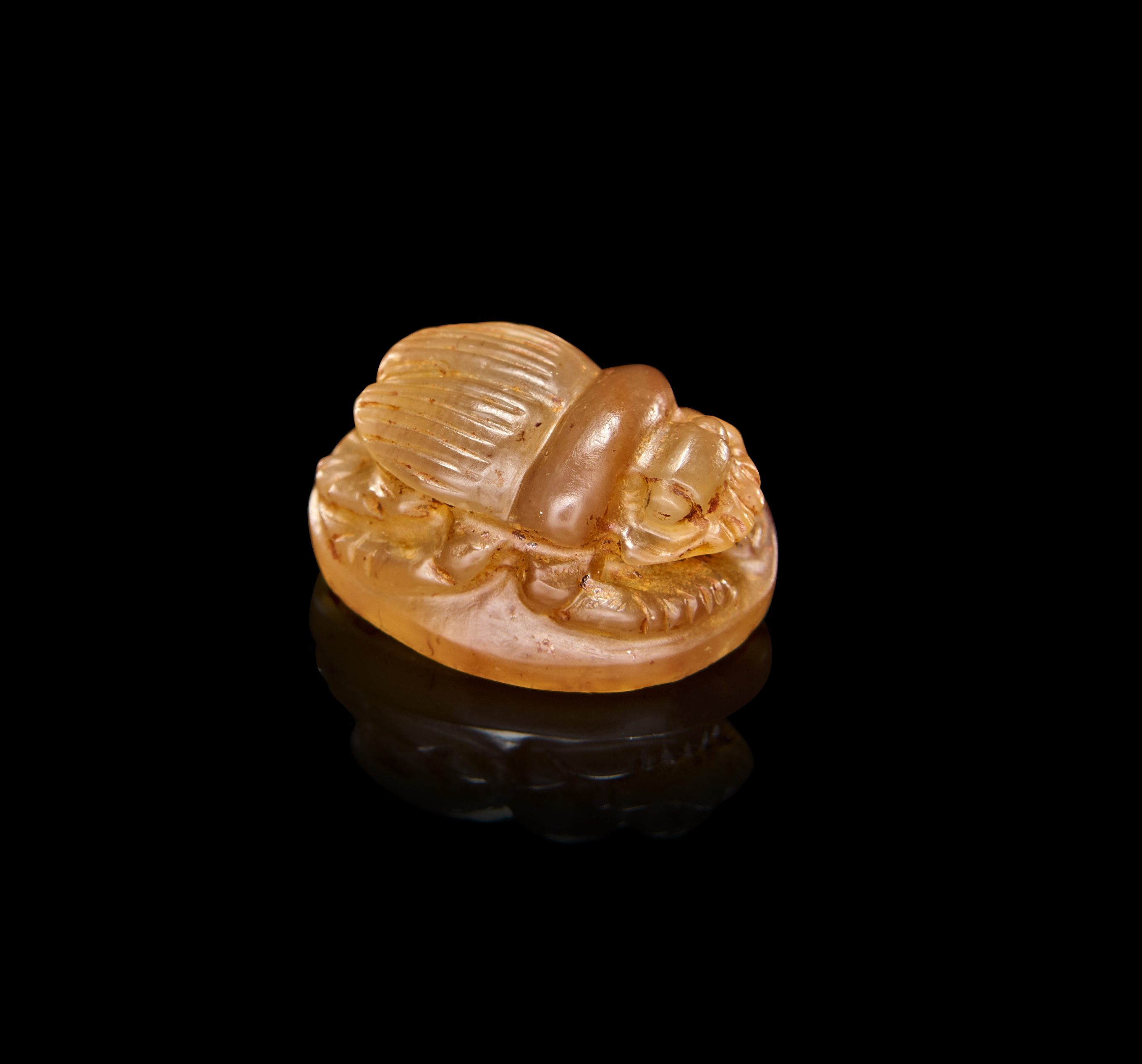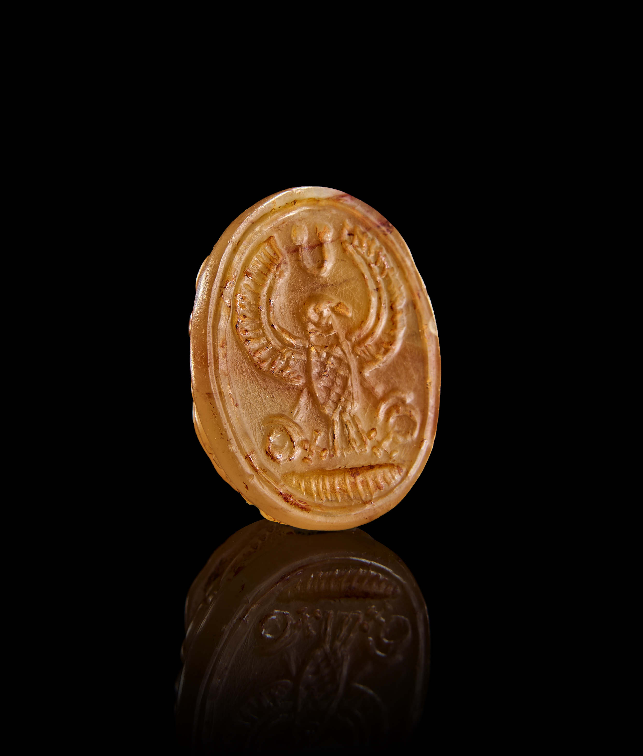 AN AGATE SCARAB WITH WINGED EAGLE, EGYPT 28TH DYNASTY