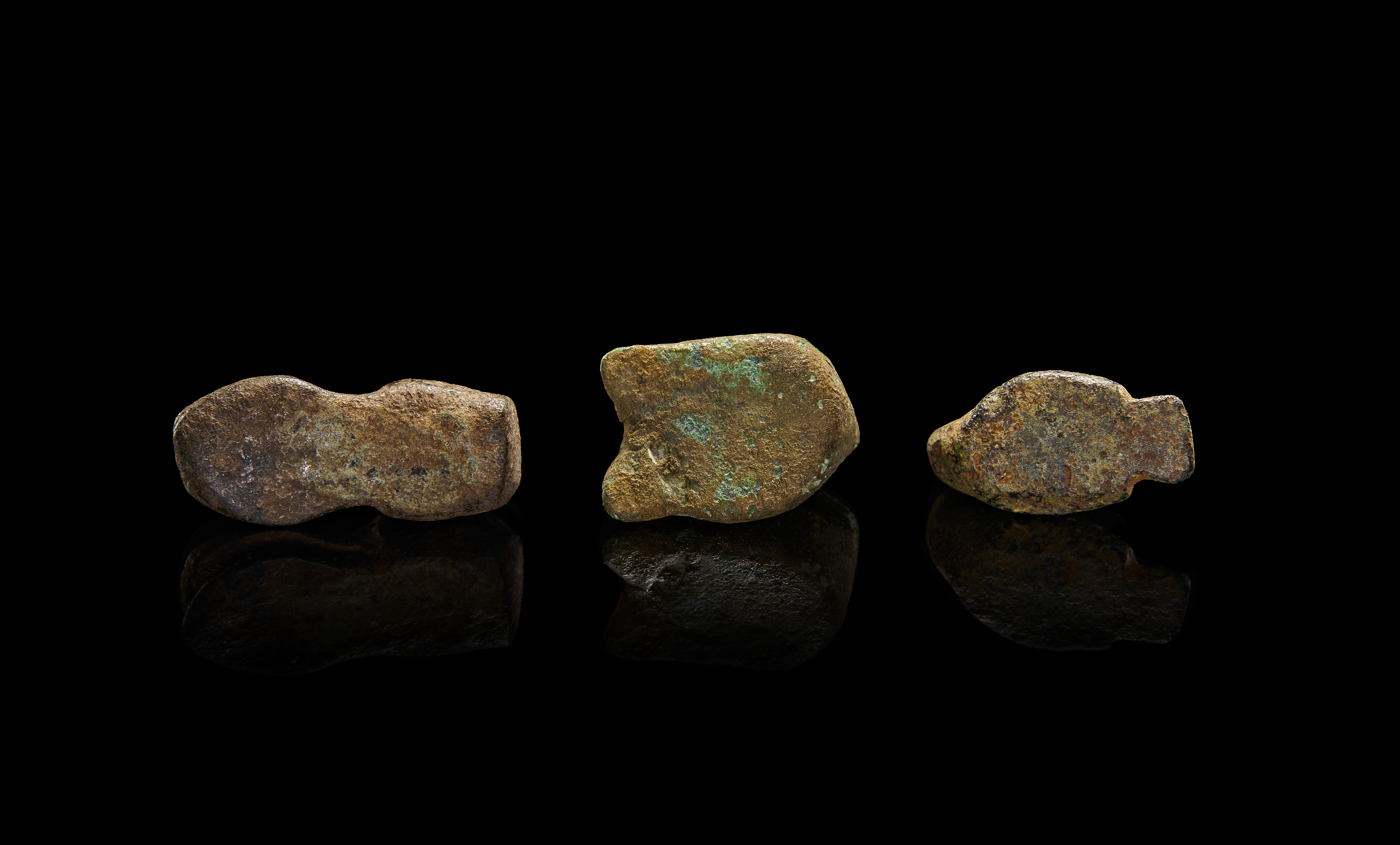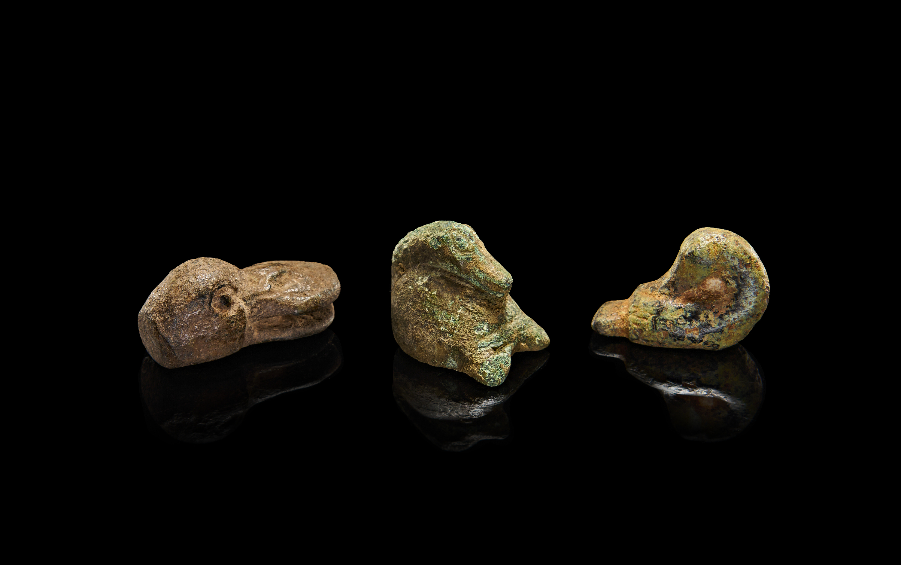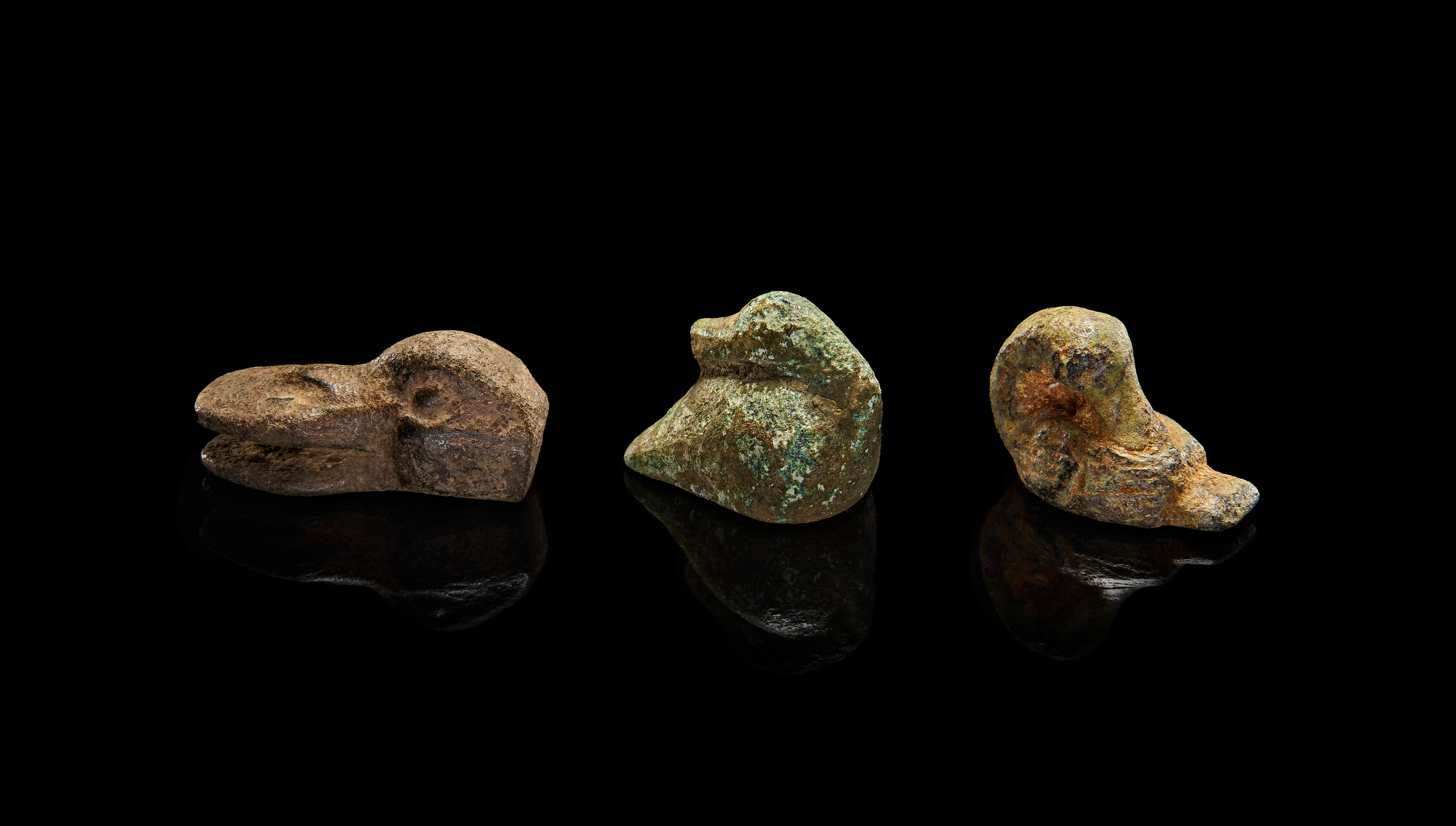 A GROUP OF BRONZE SEATED DUCKS, CIRCA 400 B.C