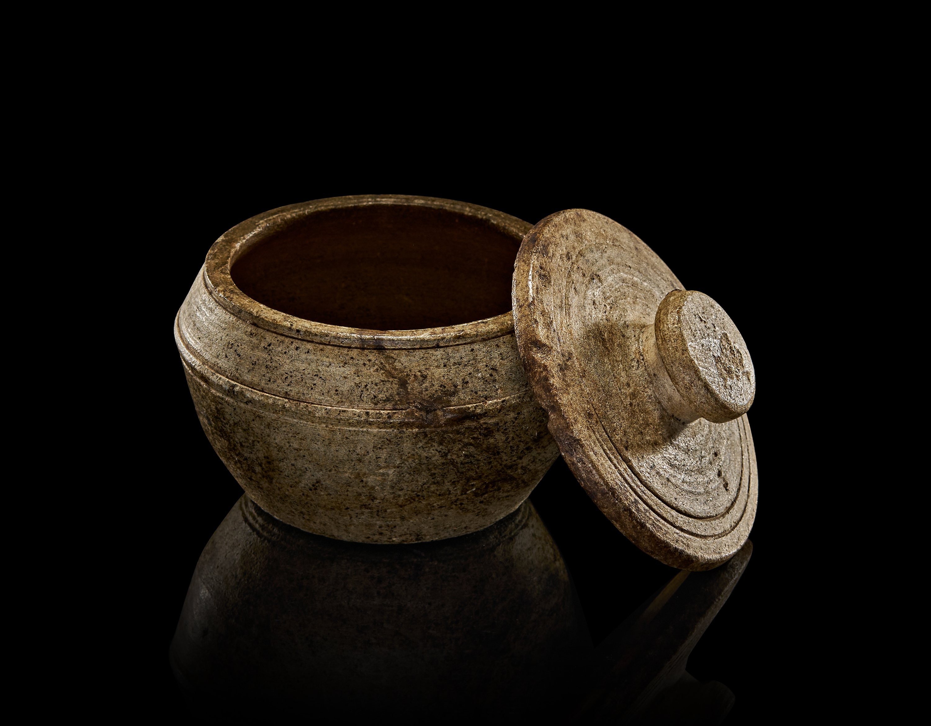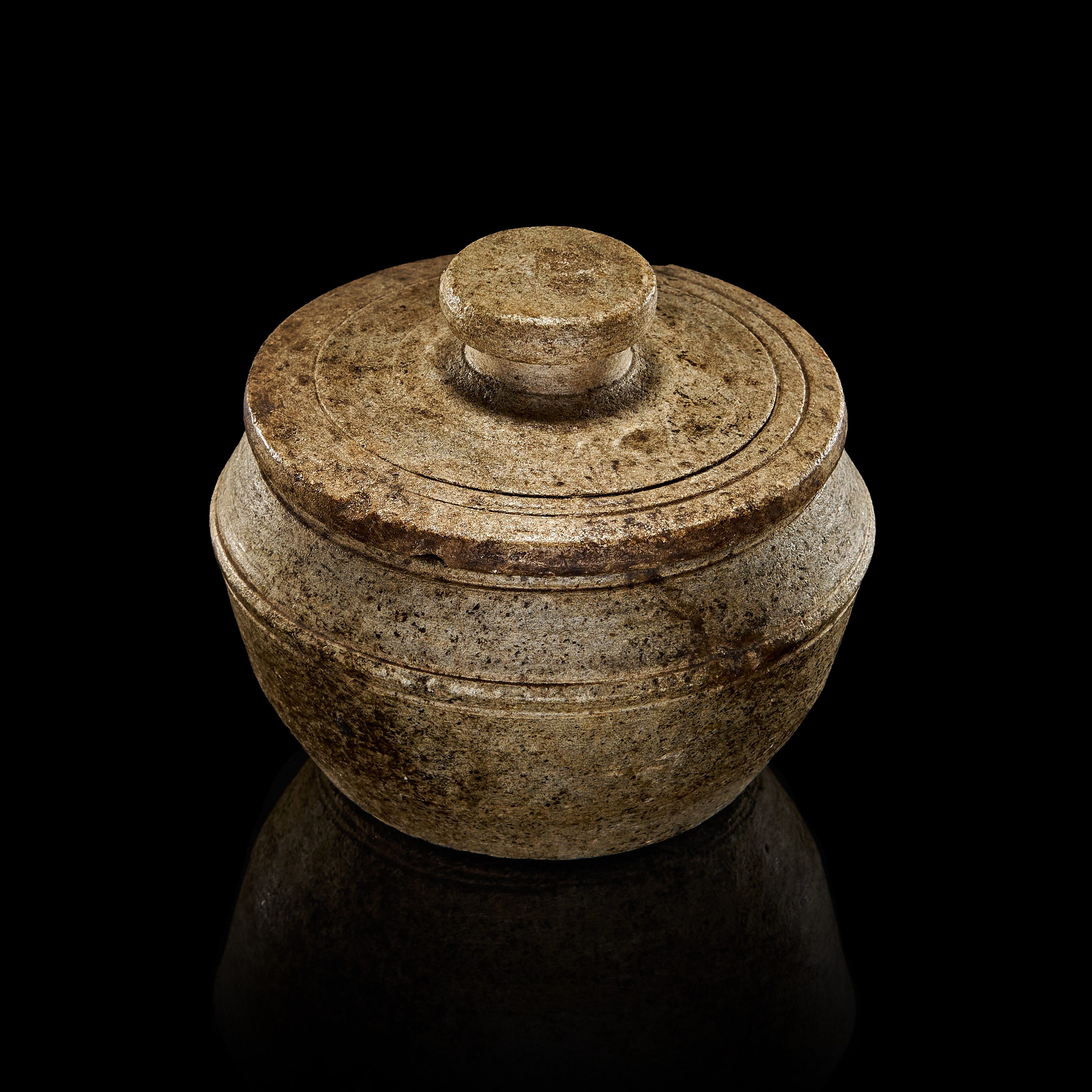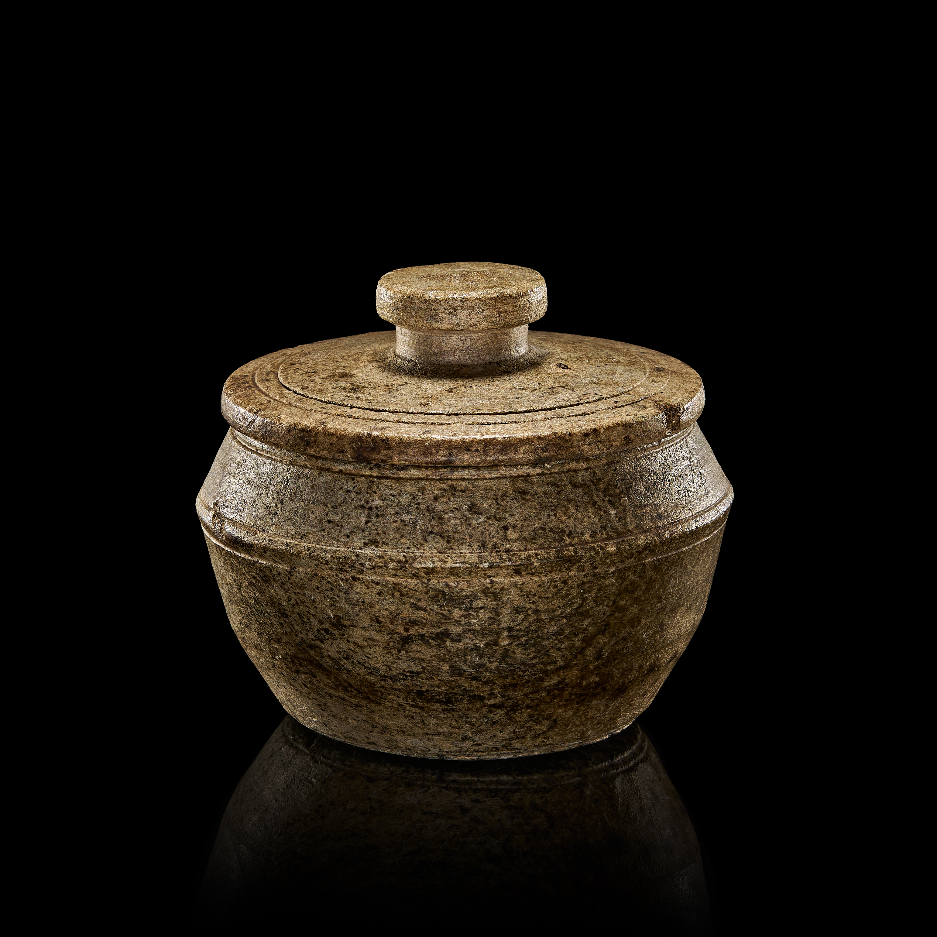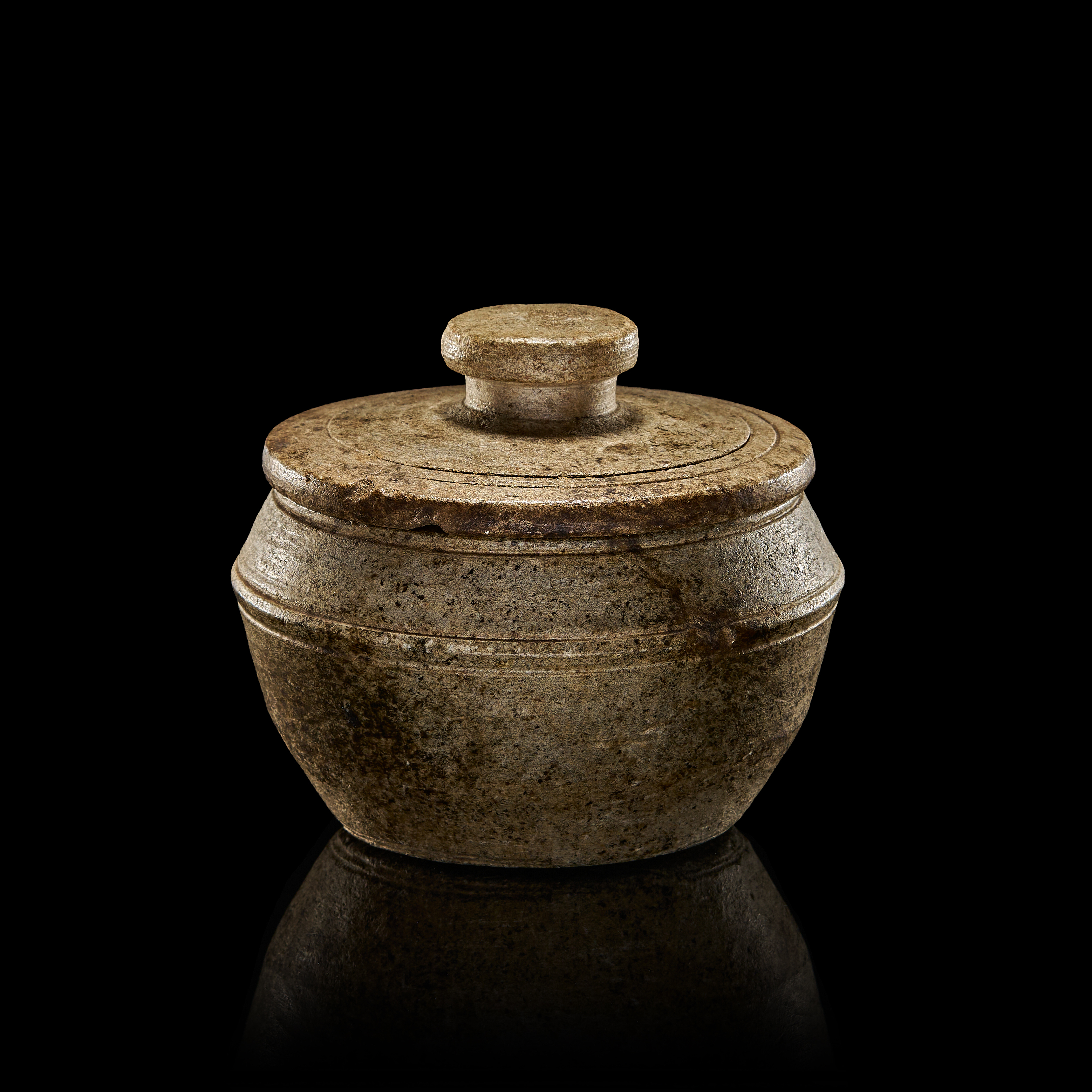 A SOFT STONE VESSEL WITH A LID, POSSIBLY COPTIC PERIOD OF ANCIENT EGYPT
