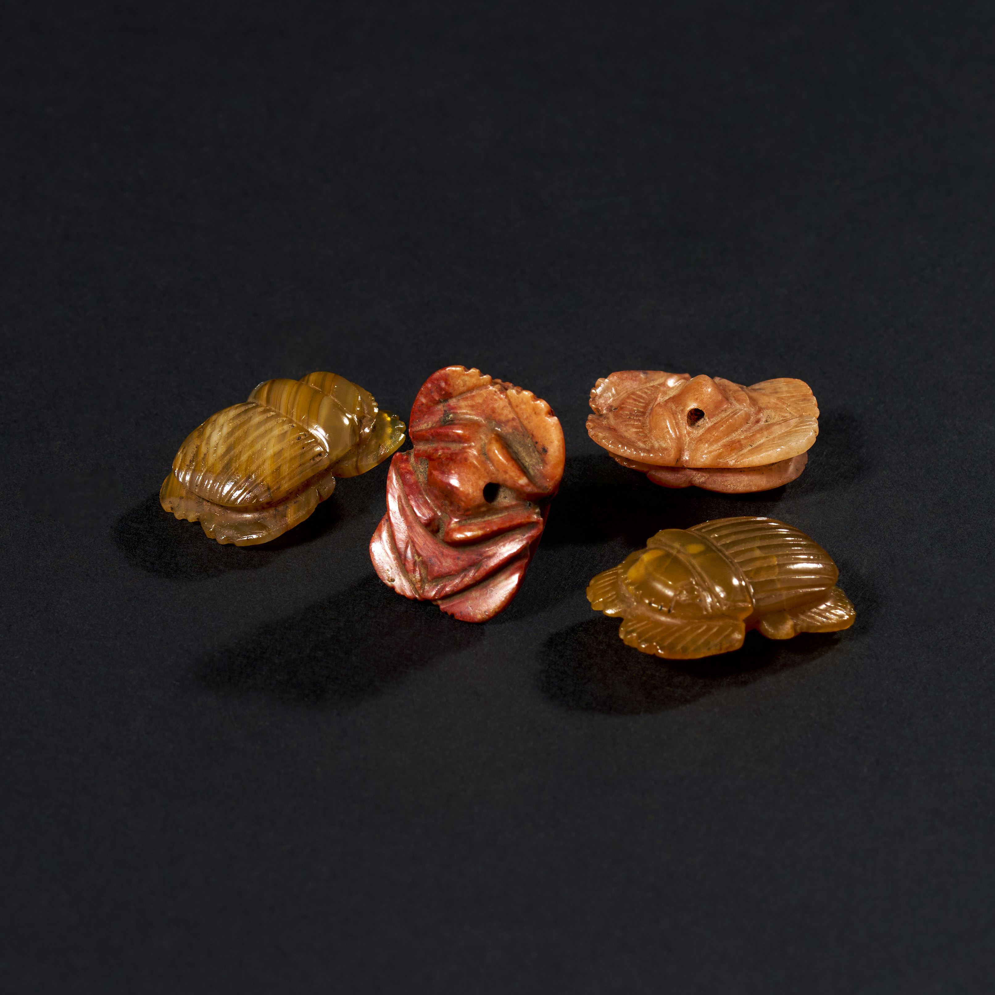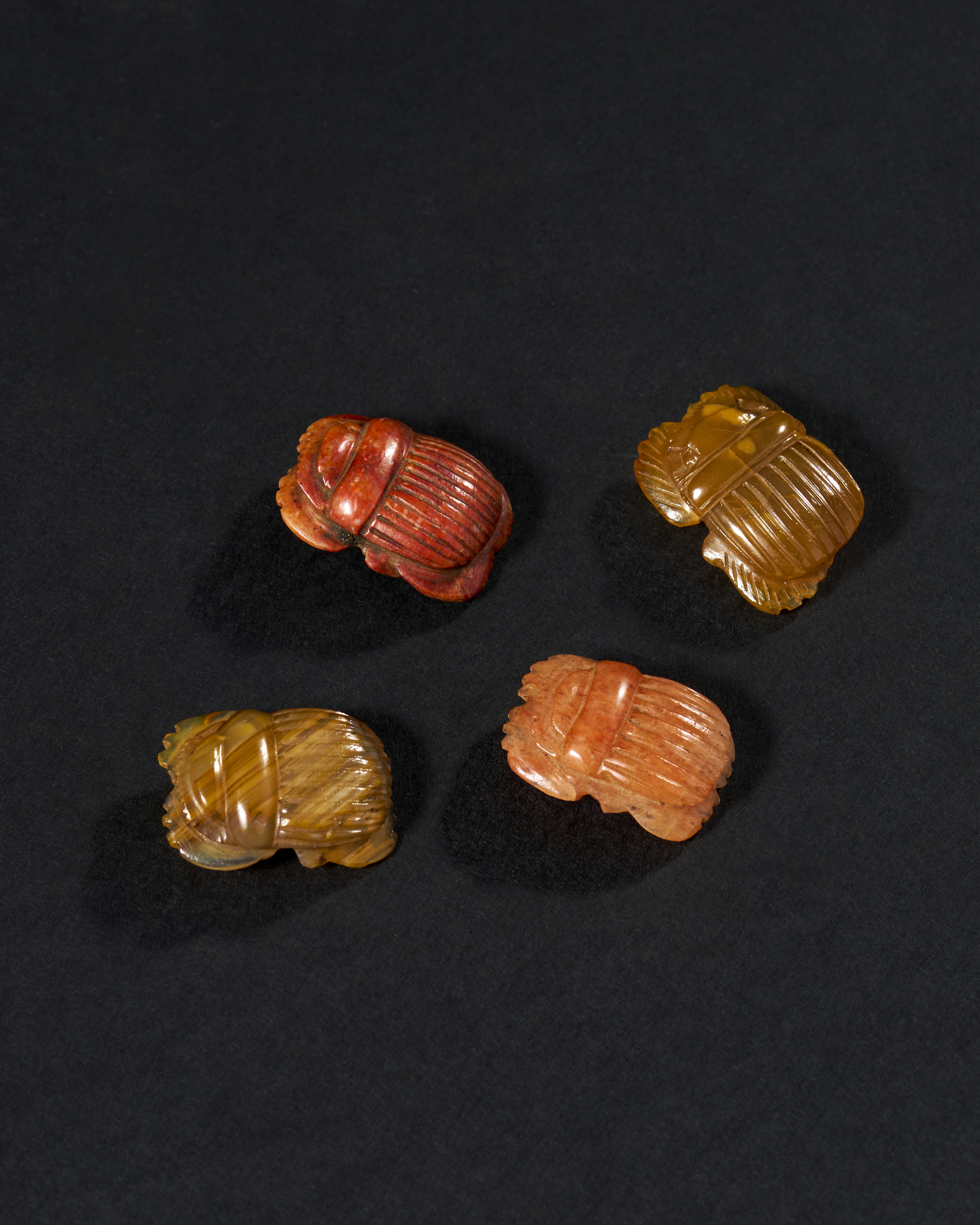 Each scarab in this collection exhibits the characteristic features of these amulets, with carefully detailed bodies and legs, and smooth, polished surfaces that highlight the natural beauty of the agate stone. The differing hues of the agate—from warm reds and oranges to more subdued yellows and browns—enhance the visual appeal of this group, demonstrating the ancient artisans’ skill in selecting and working with this semi-precious material.