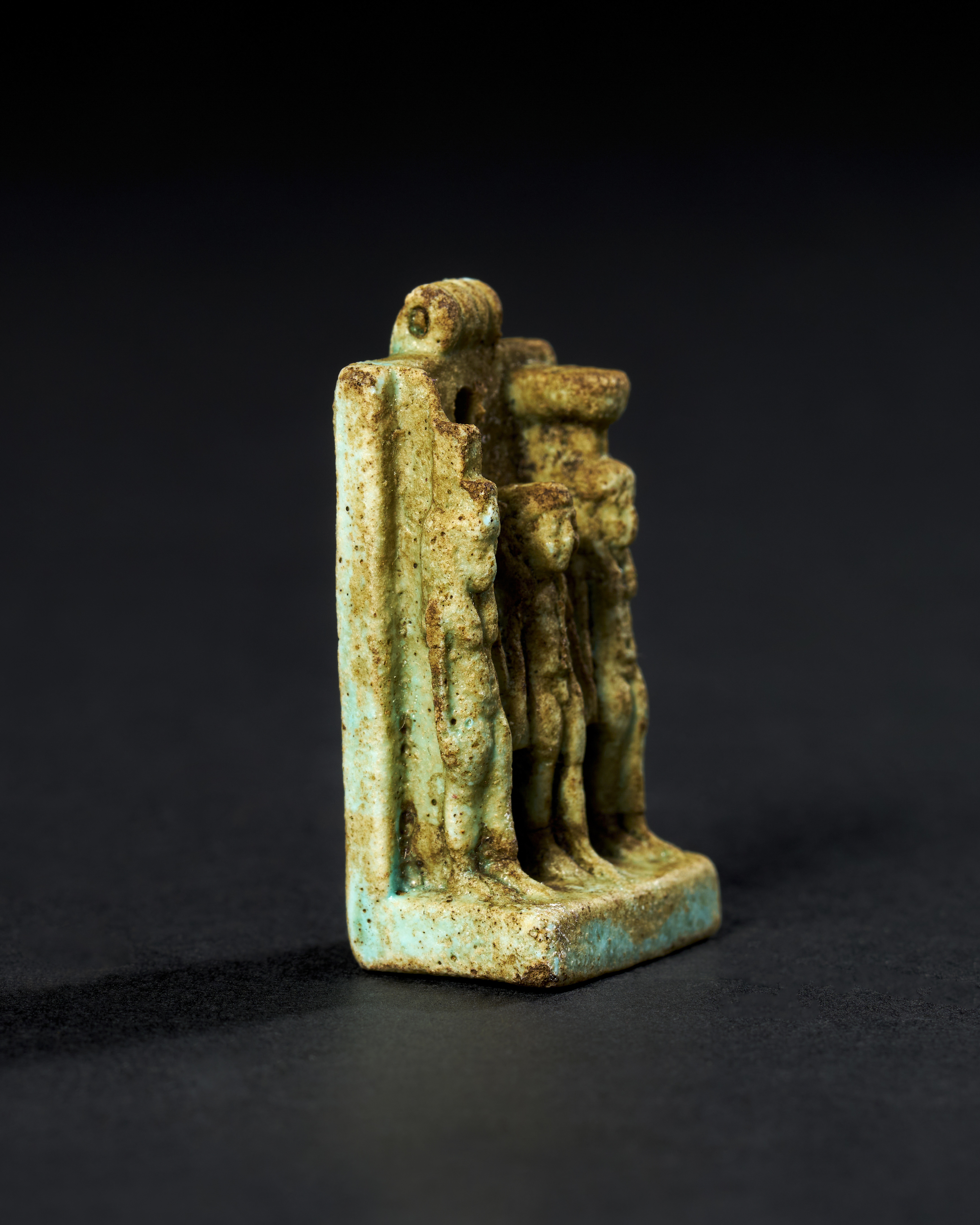 The figures are depicted standing on a rectangular base, with a large loop at the top of the amulet, indicating that it was likely worn as a pendant. The surface of the amulet shows signs of age, with the characteristic glaze of the faience in shades of green and blue, though some areas have faded or worn away over time.