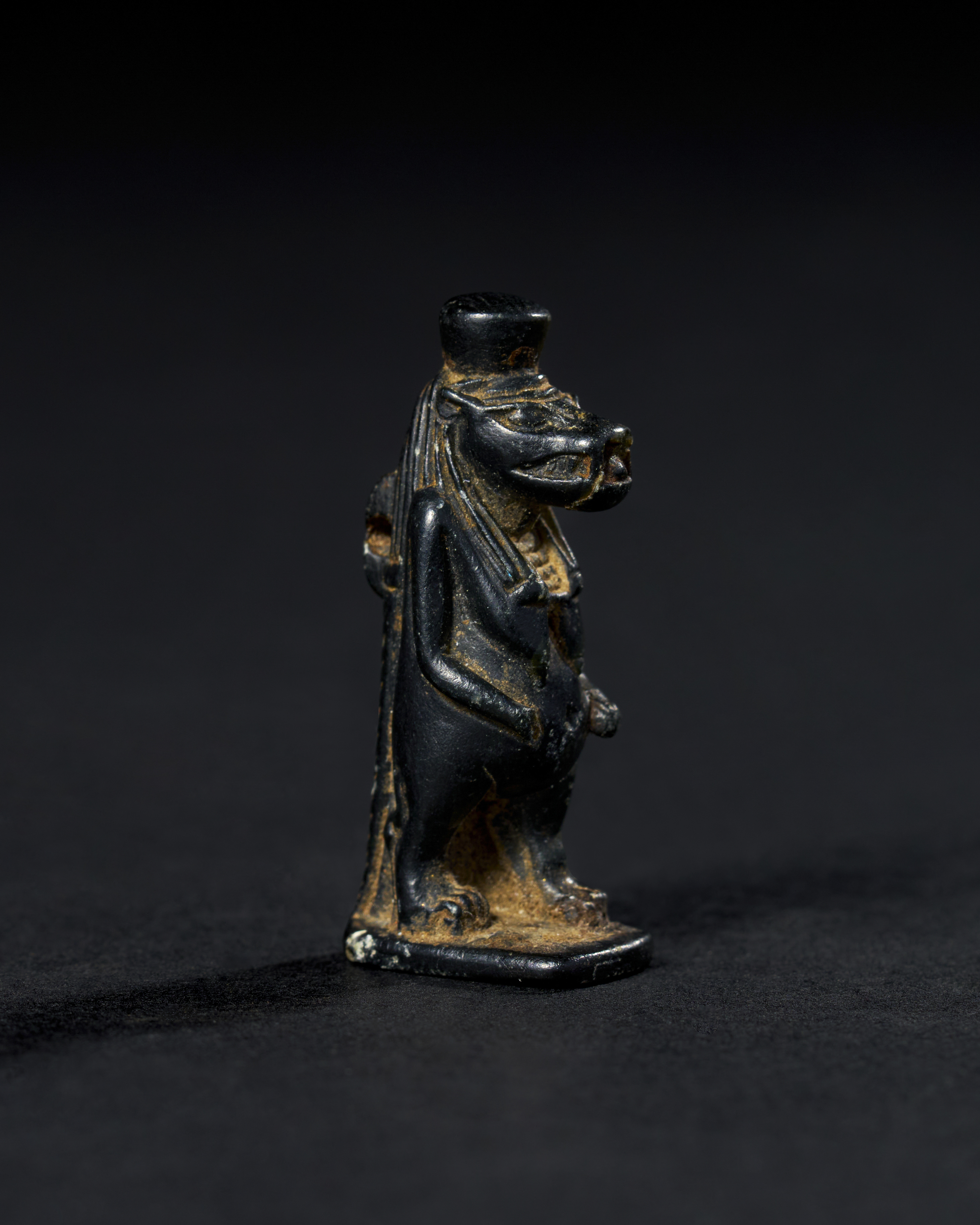 This finely detailed steatite amulet represents the goddess Taweret, revered in ancient Egyptian culture as a protector of women and childbirth. Dating back to the 26th Dynasty, circa 595-589 B.C. Taweret is depicted in her traditional form, with the body of a hippopotamus, lion limbs, and a crocodile tail, symbolising her fierce guardianship. This amulet would have been worn for protection and blessings.