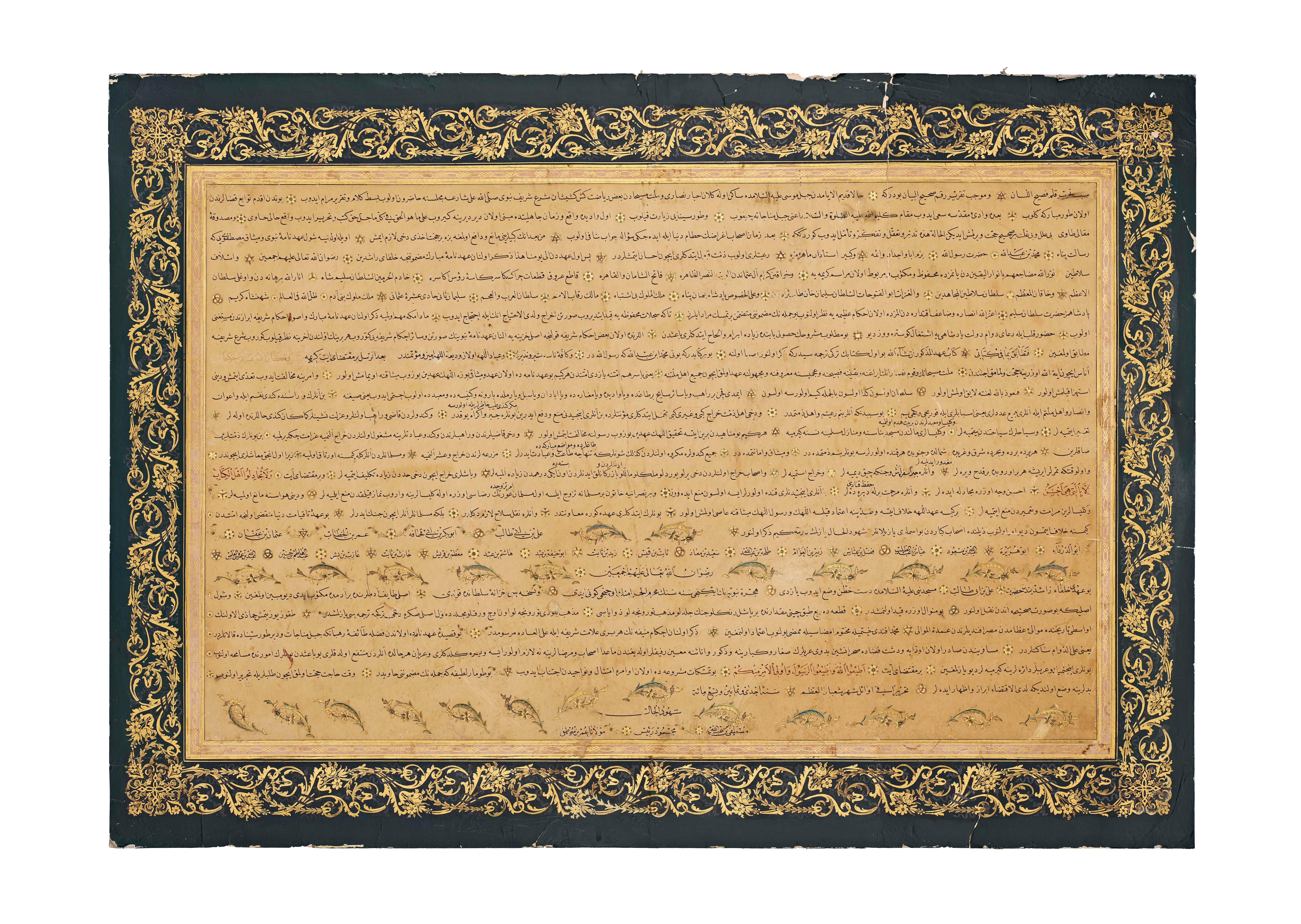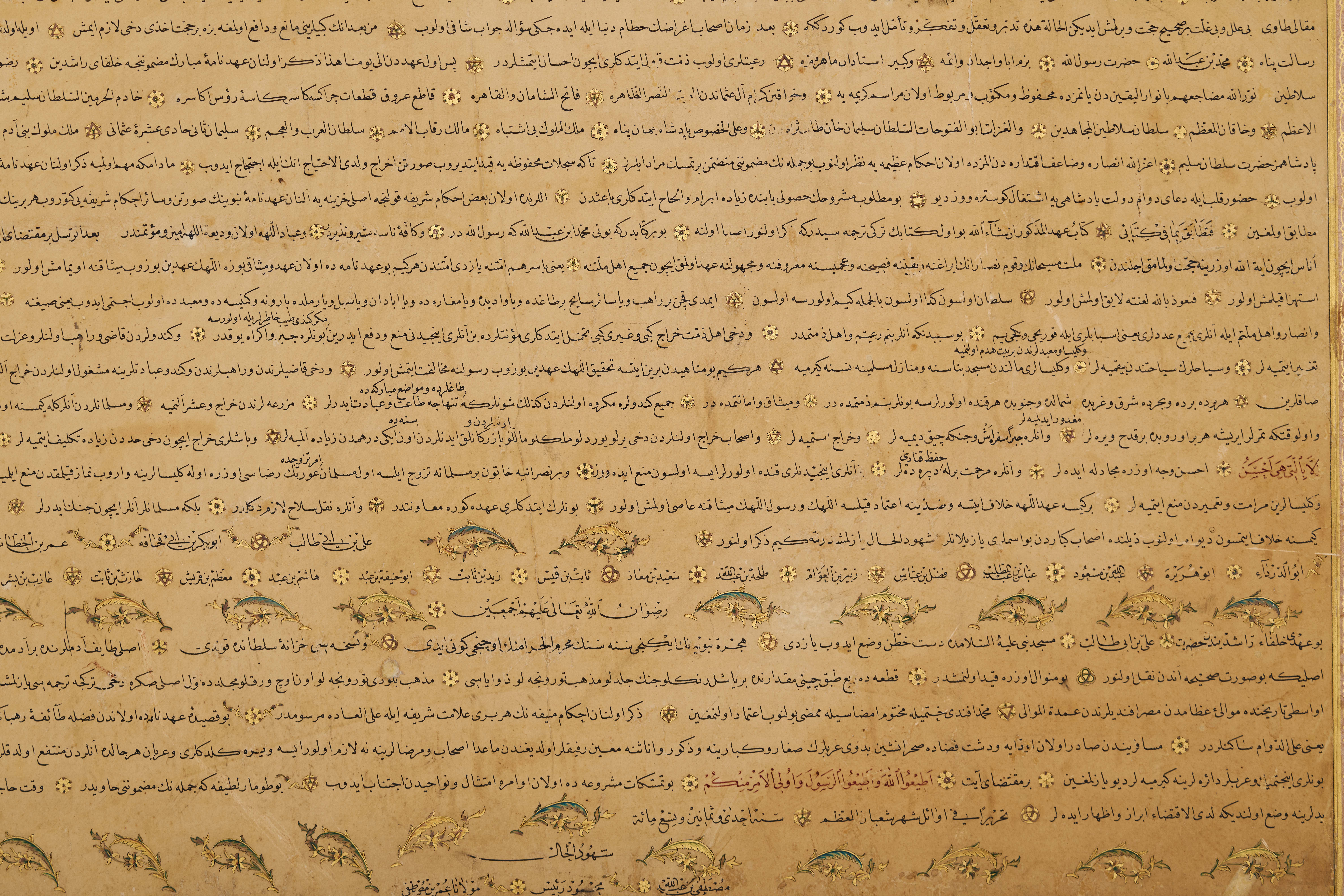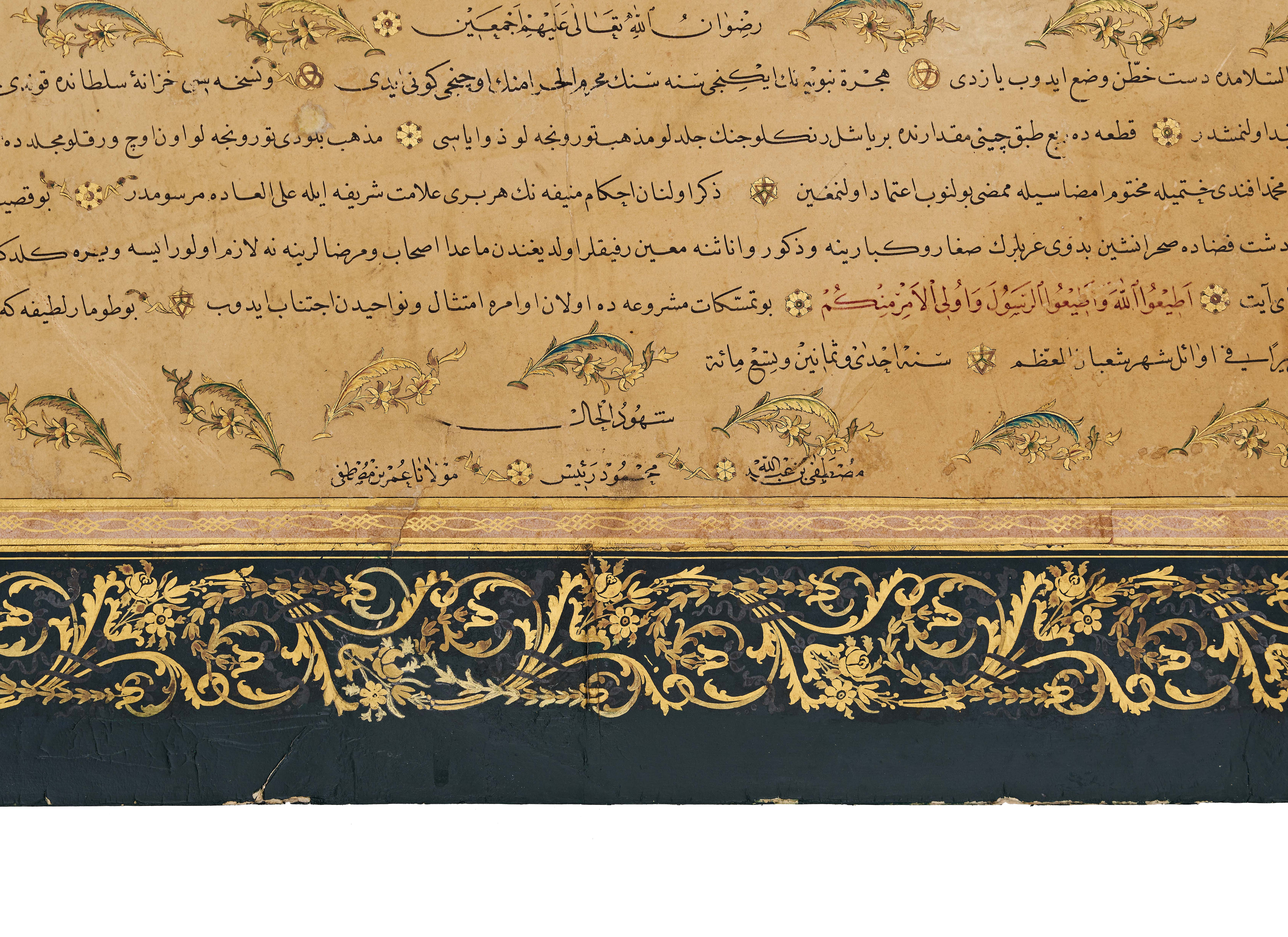 A large 16th-century Ottoman manuscript document dated 981 Hijri (1573 CE), richly decorated with gilt floral borders and signed Mustafa bin Abdullah, Mahmoud Raasi, and Omar bin Mustafa.