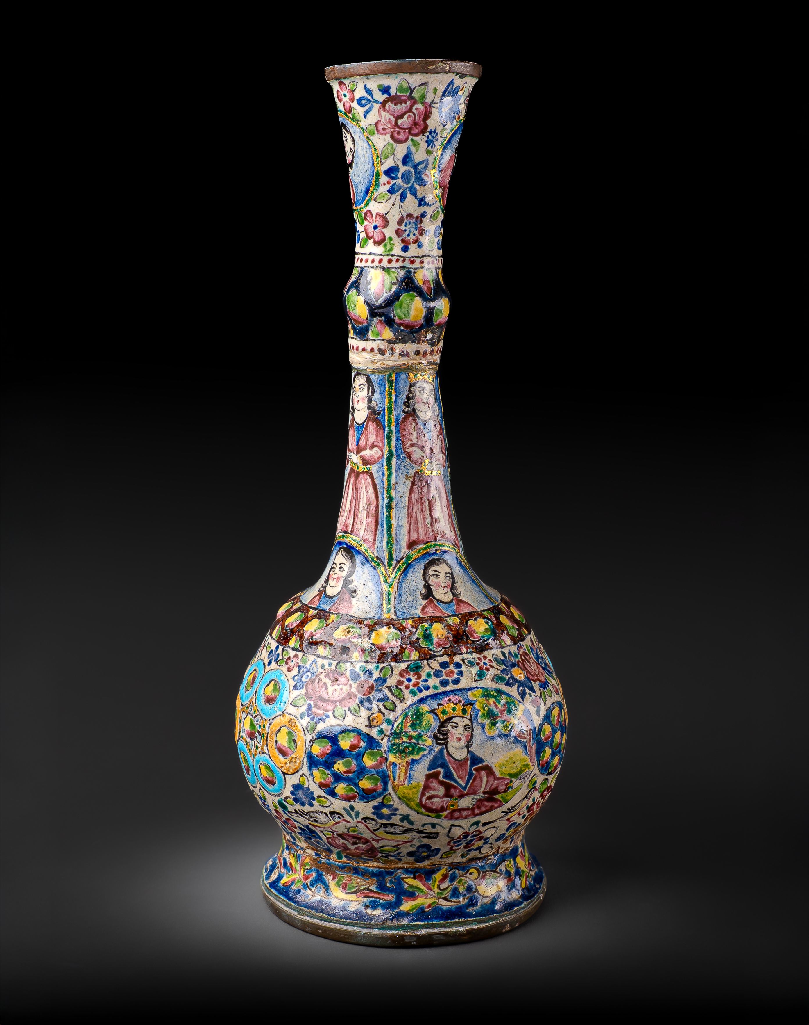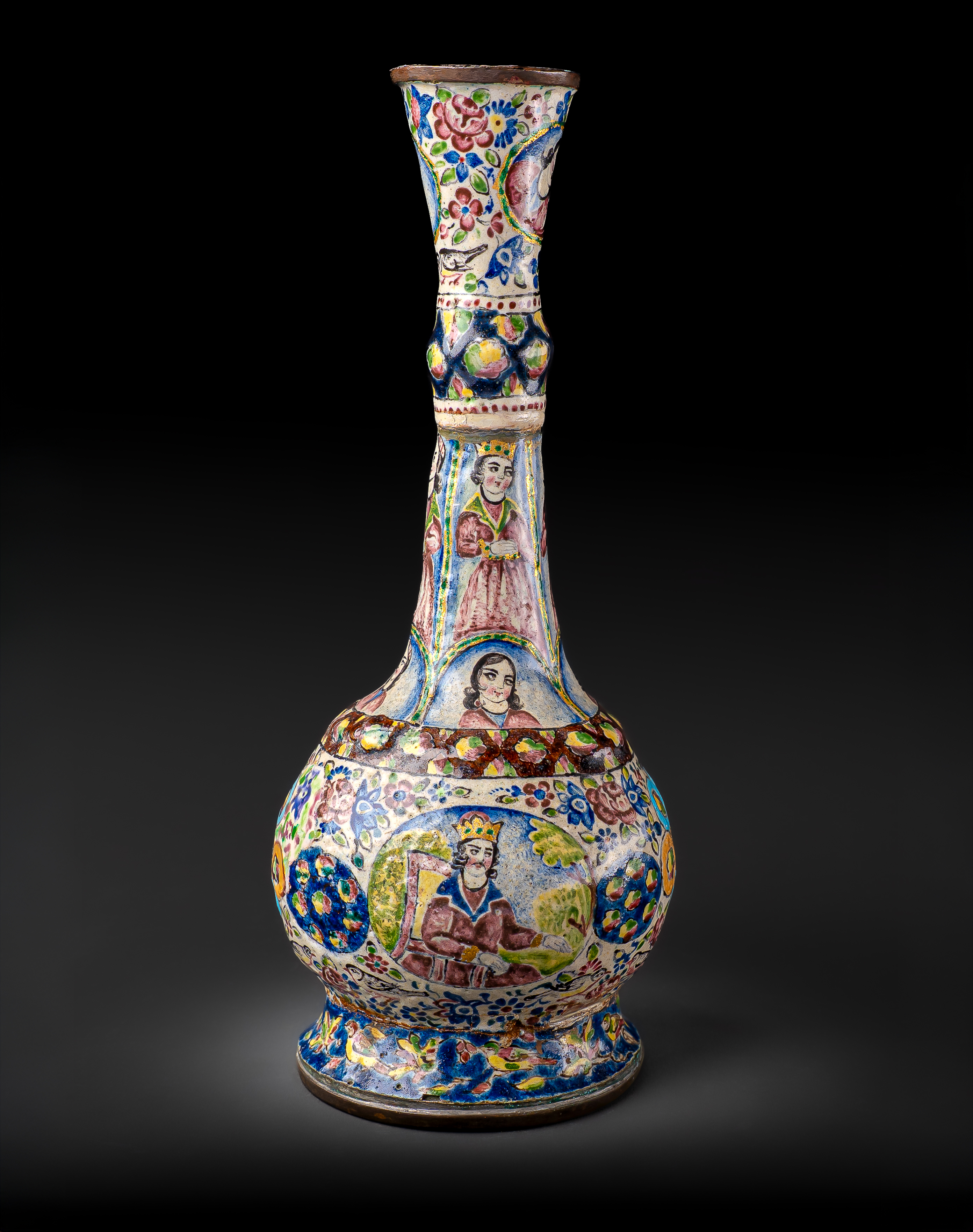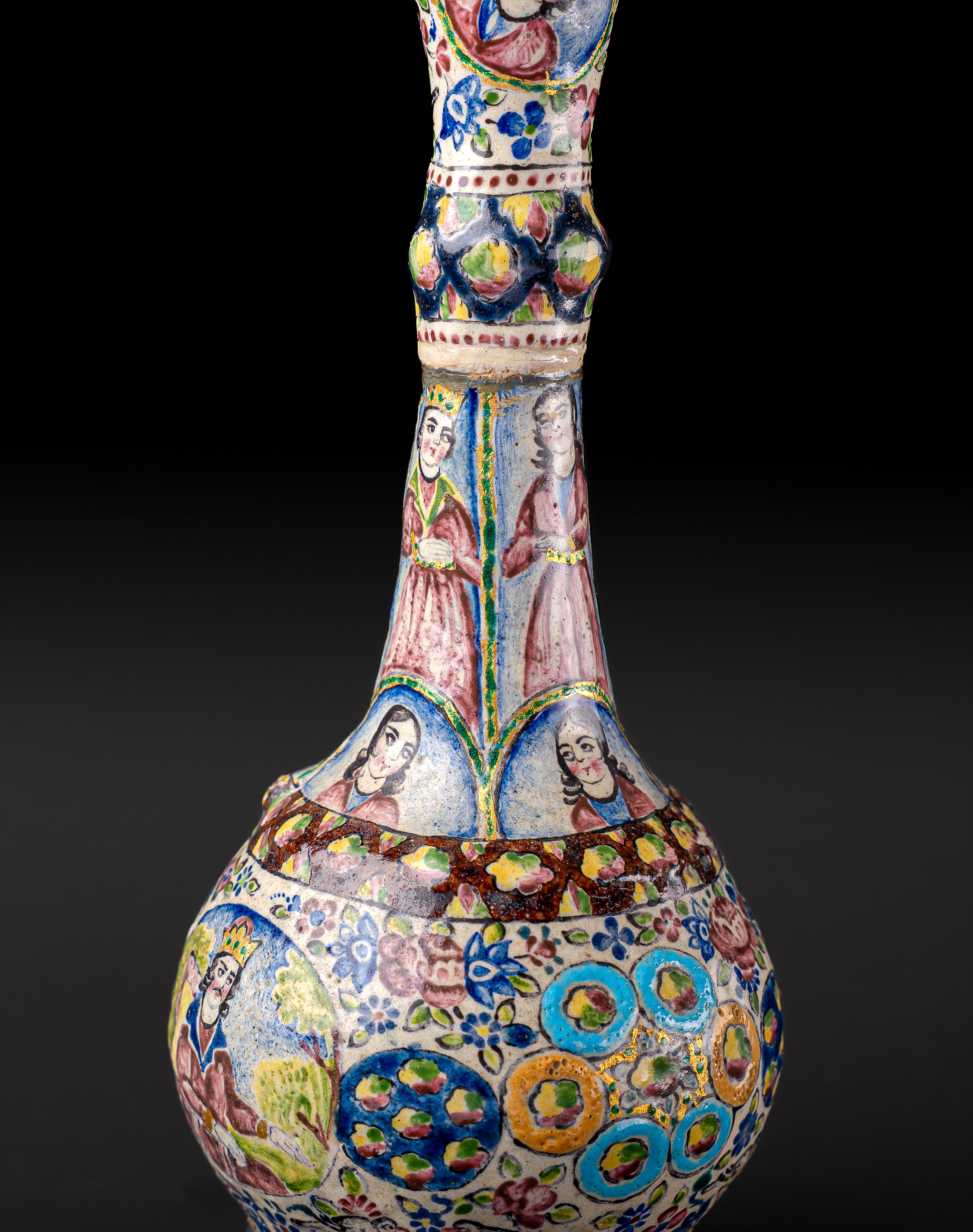 A vibrant Qajar-period minakari (enameled) vase, Persia, 19th century, finely painted in polychrome enamels with courtly and floral motifs. The vase, of elegant bulbous form with a tall tapering neck, is richly adorned with alternating medallions depicting royal and courtly figures in Qajar dress, each surrounded by dense floral sprays, arabesques, and geometric roundels in vivid shades of cobalt, turquoise, yellow, green, and crimson.