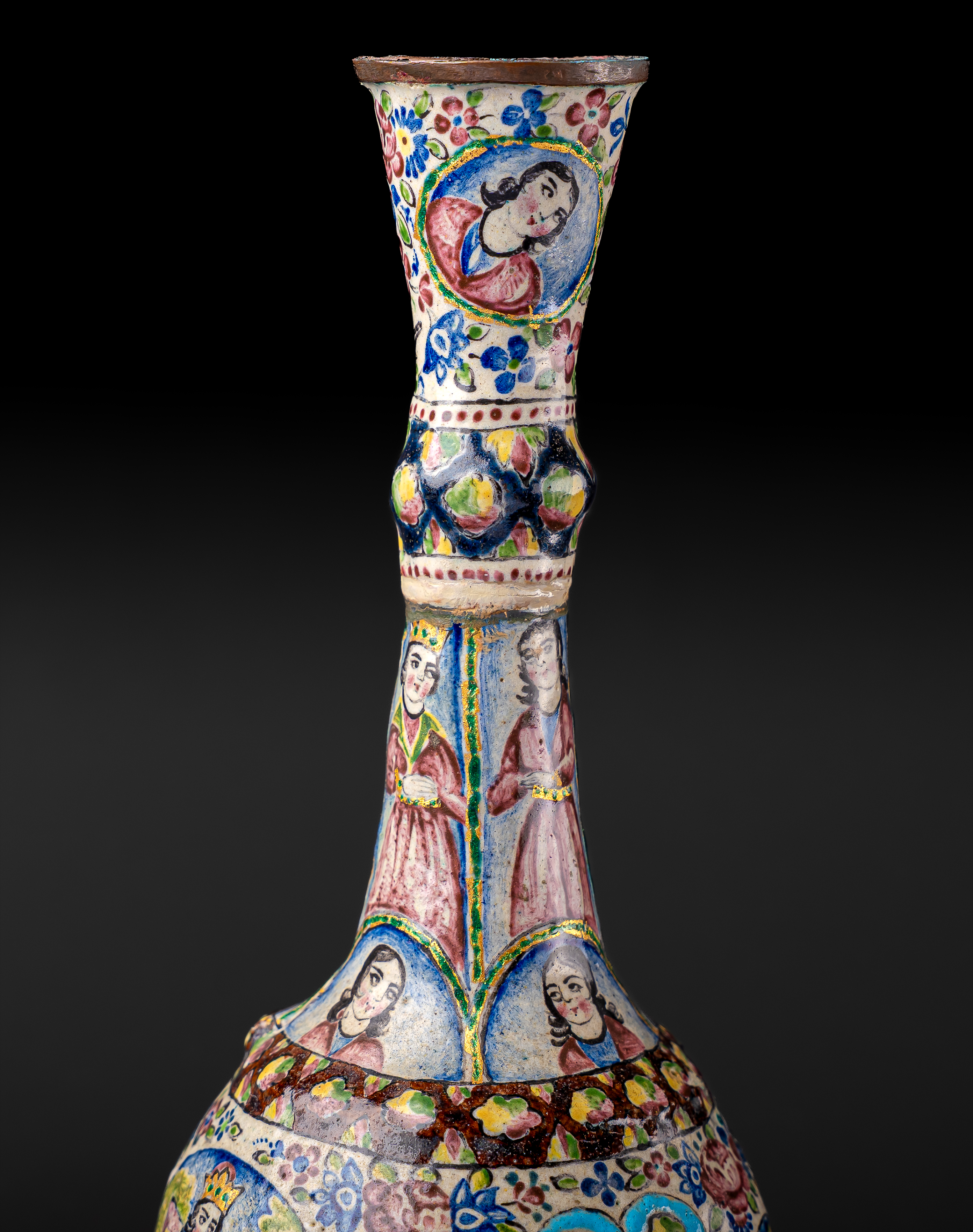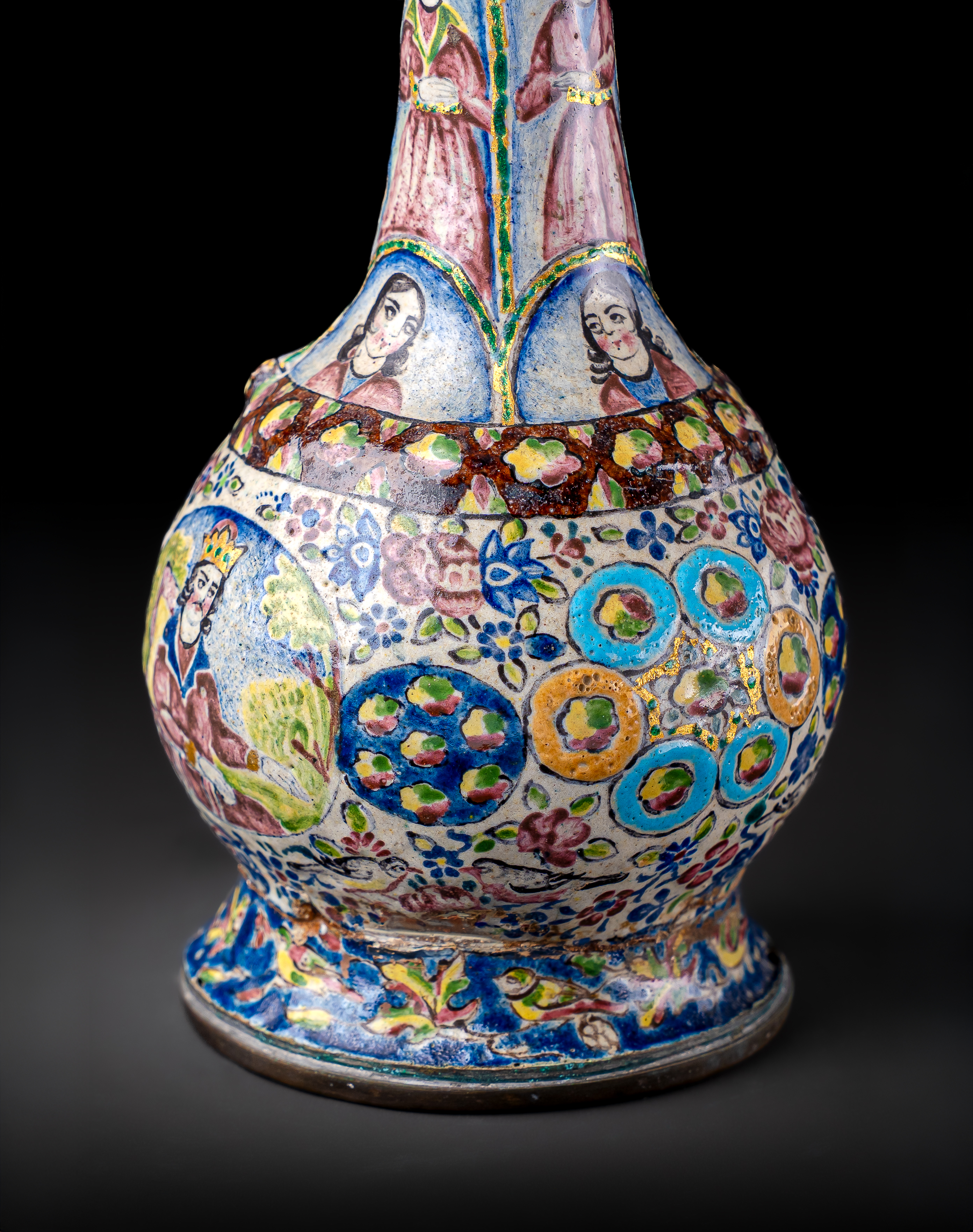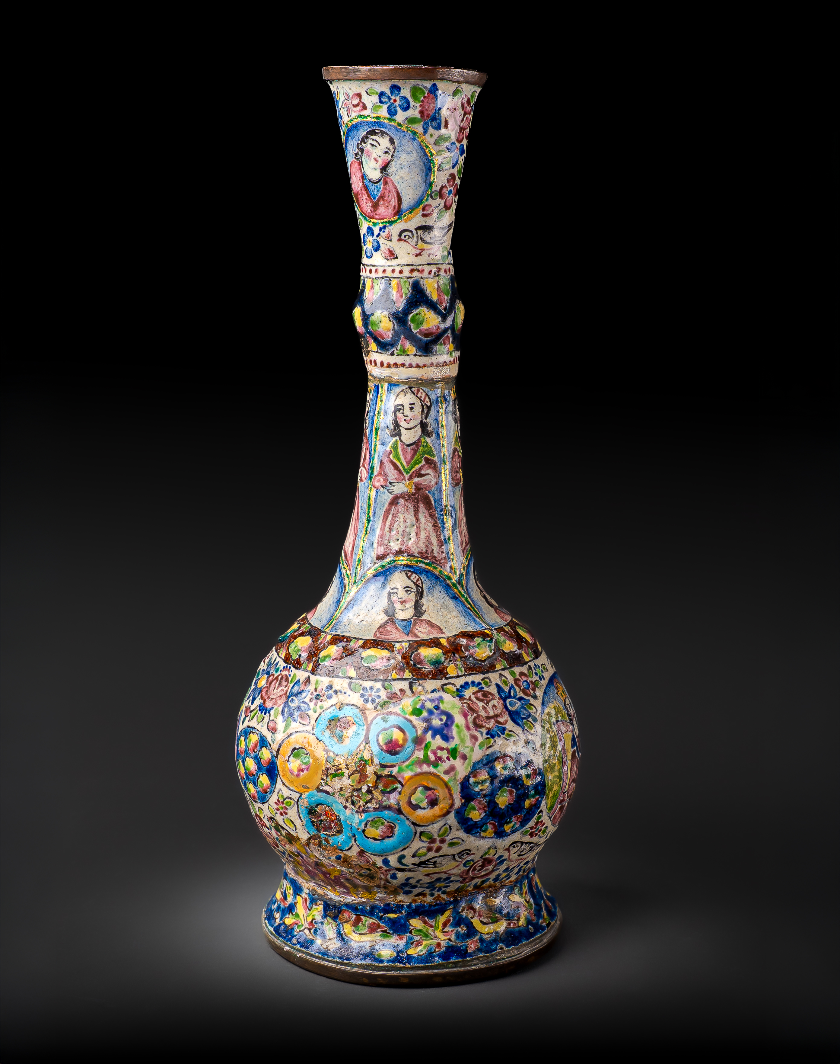 A vibrant Qajar-period minakari (enameled) vase, Persia, 19th century, finely painted in polychrome enamels with courtly and floral motifs. The vase, of elegant bulbous form with a tall tapering neck, is richly adorned with alternating medallions depicting royal and courtly figures in Qajar dress, each surrounded by dense floral sprays, arabesques, and geometric roundels in vivid shades of cobalt, turquoise, yellow, green, and crimson.