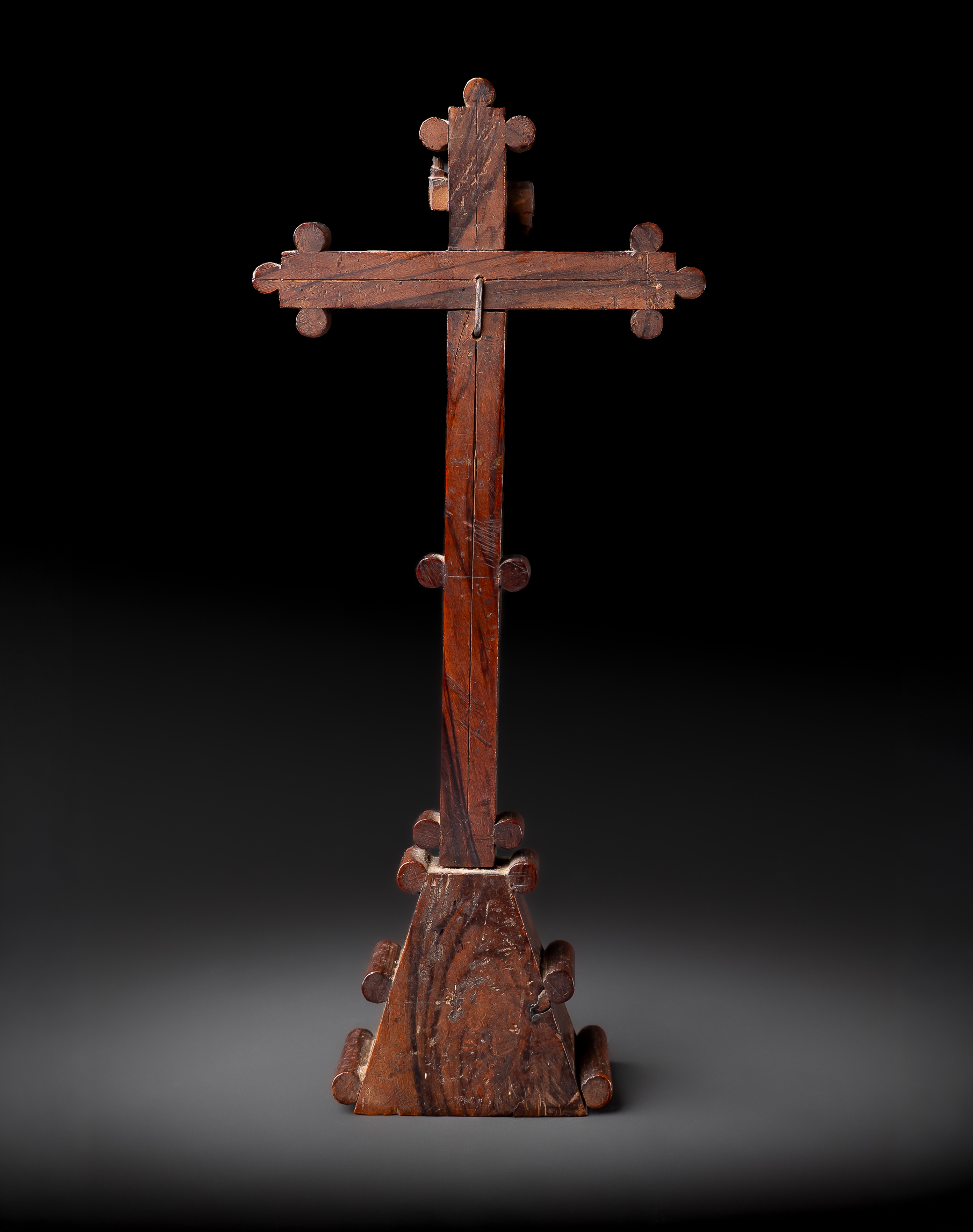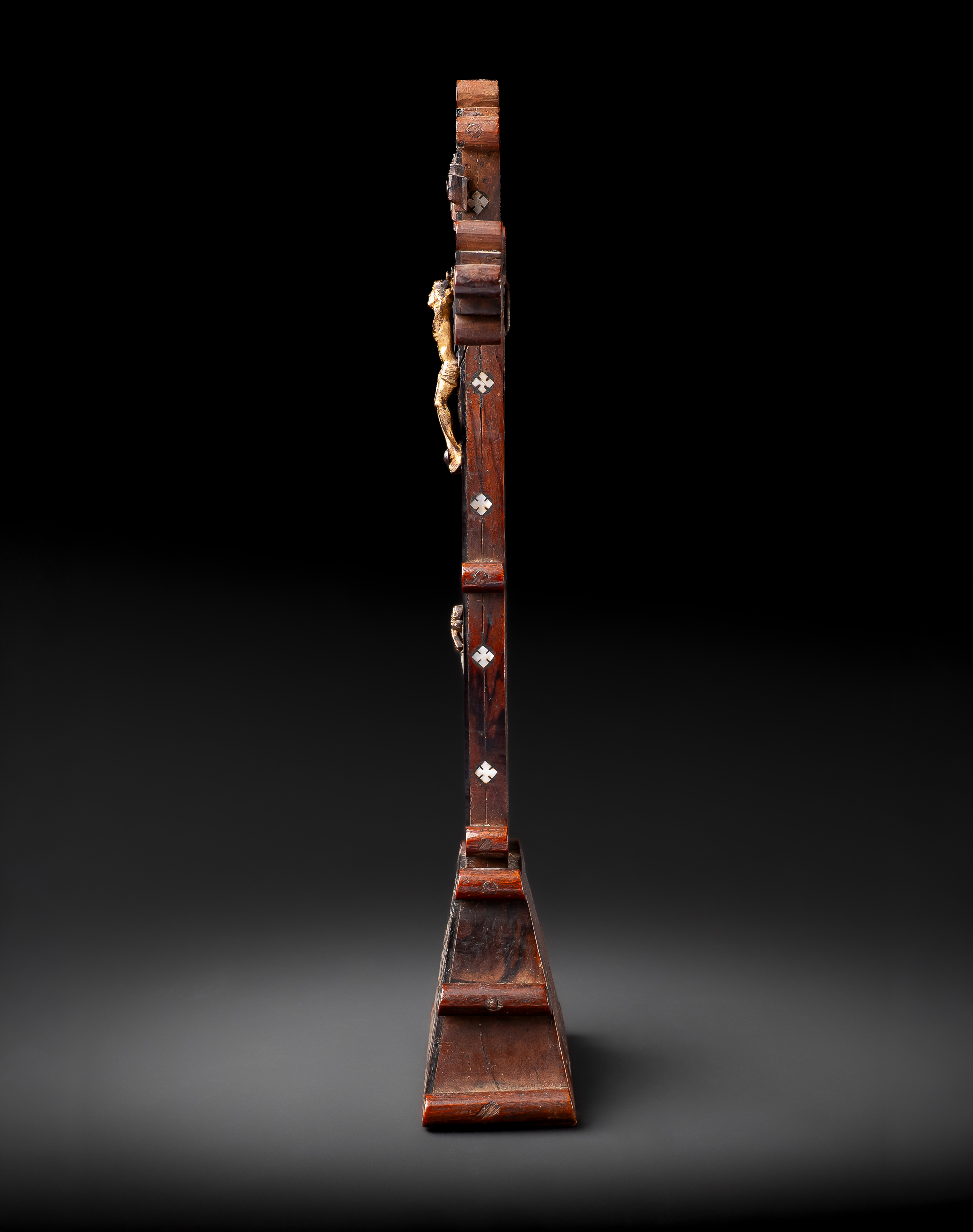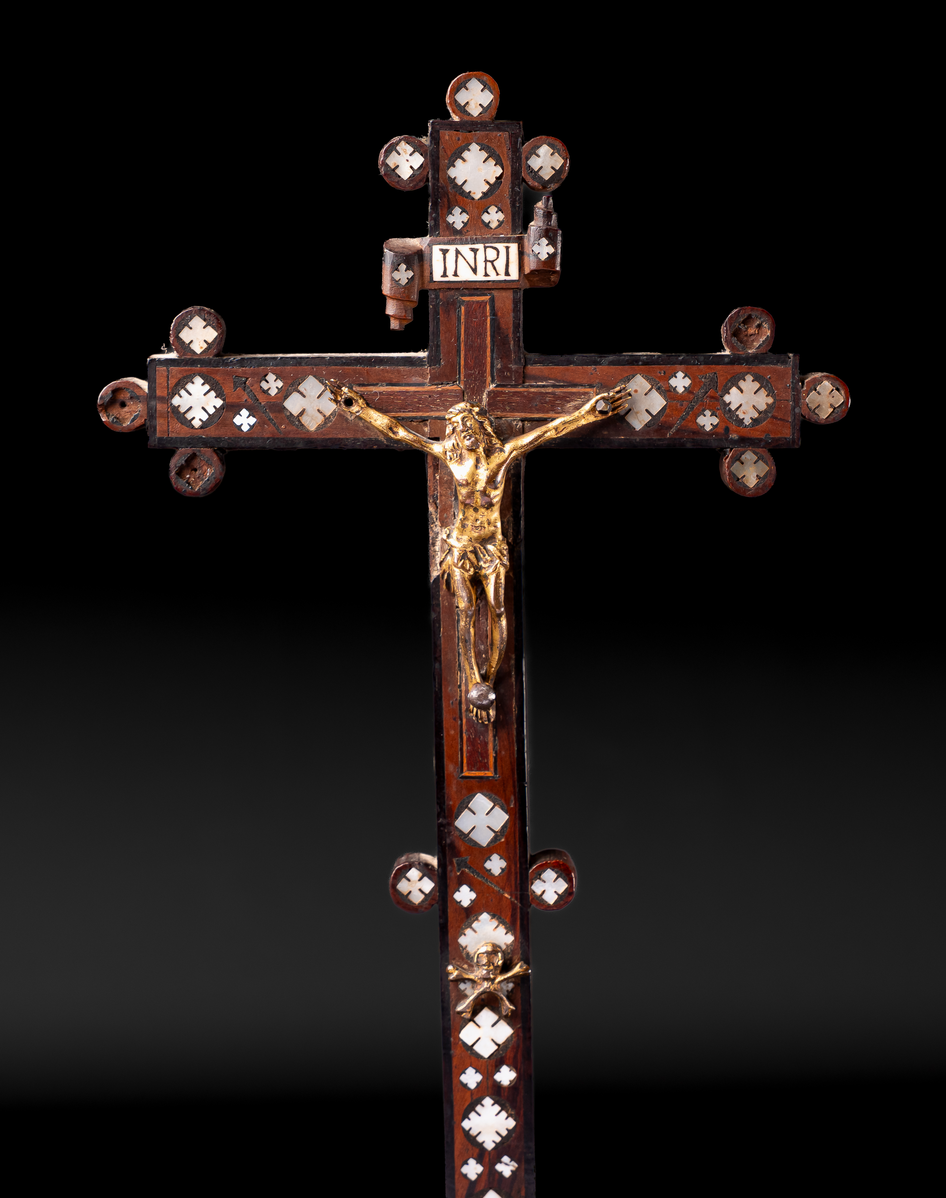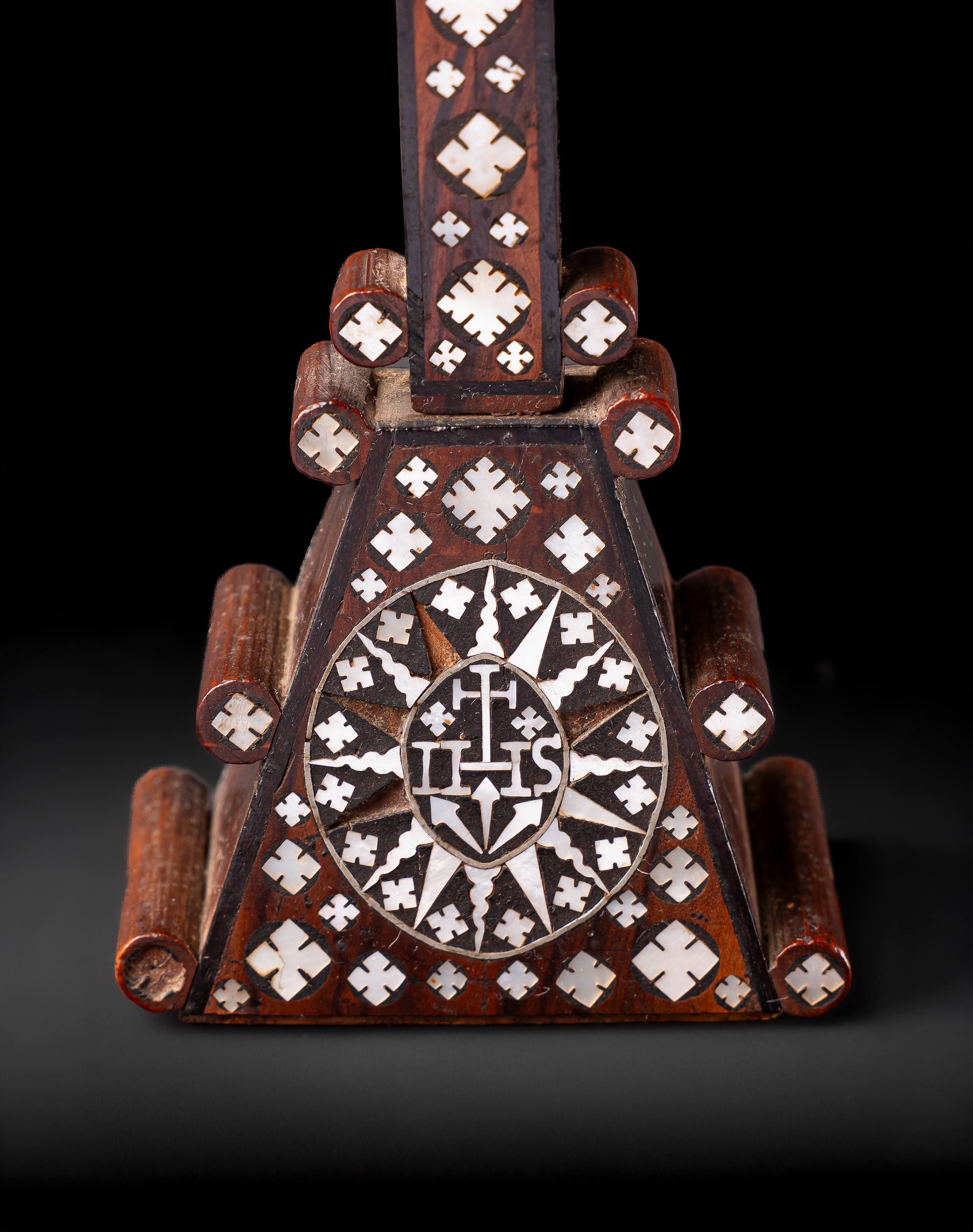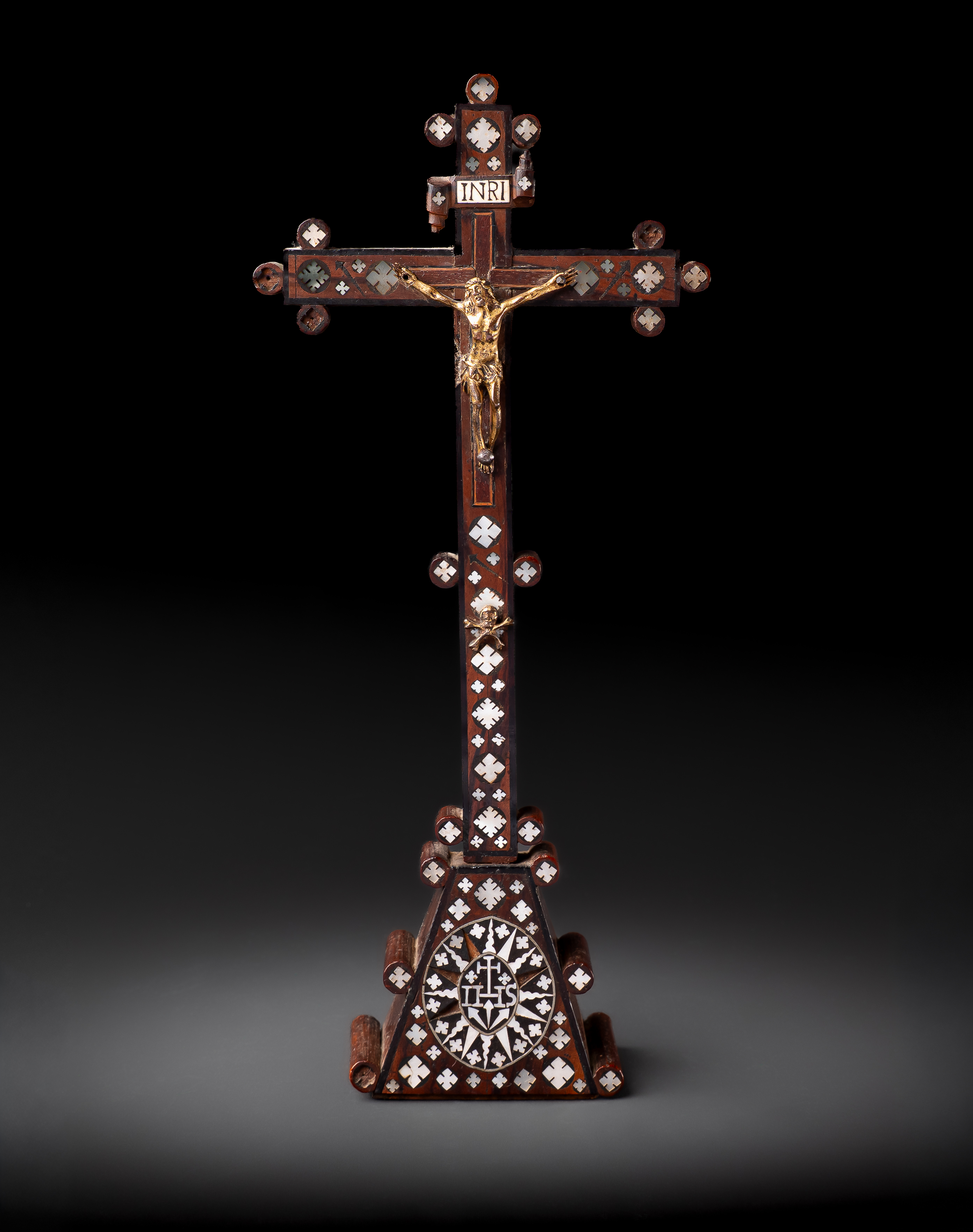 The cross is set with a gilt corpus of Christ beneath the cartouche “INRI”, the arms richly decorated with geometric mother-of-pearl inlay in diamond and cross motifs. The shaft continues with similar ornamentation, and the stepped pyramidal base is inset with a large medallion enclosing the sacred monogram IHS, surrounded by radiating floral and cross designs.