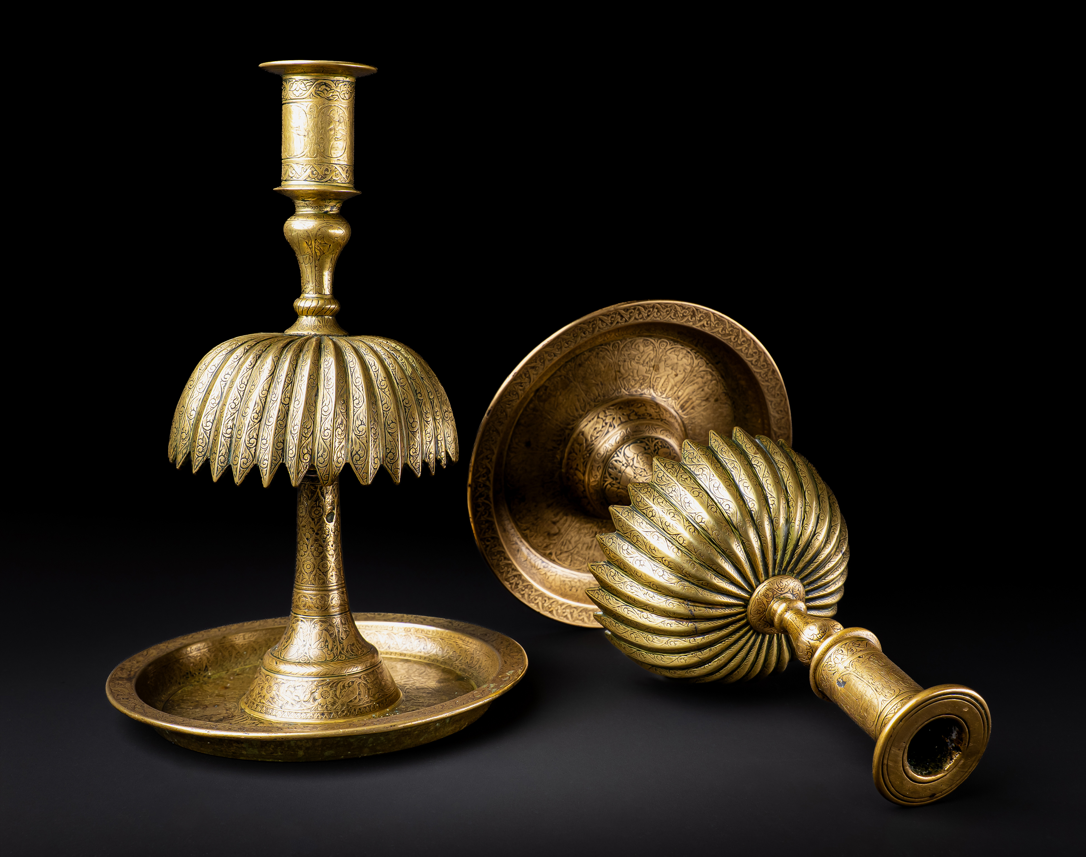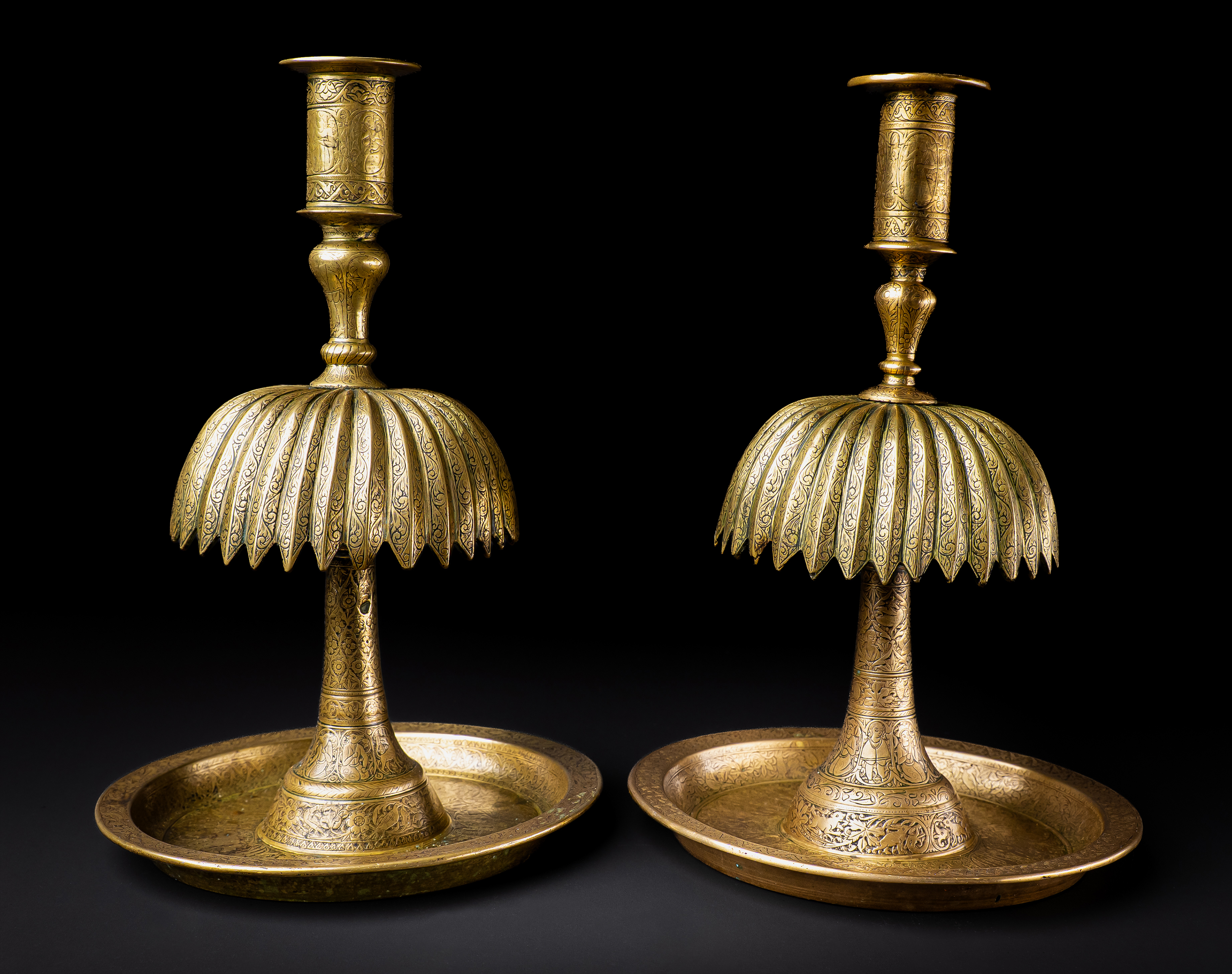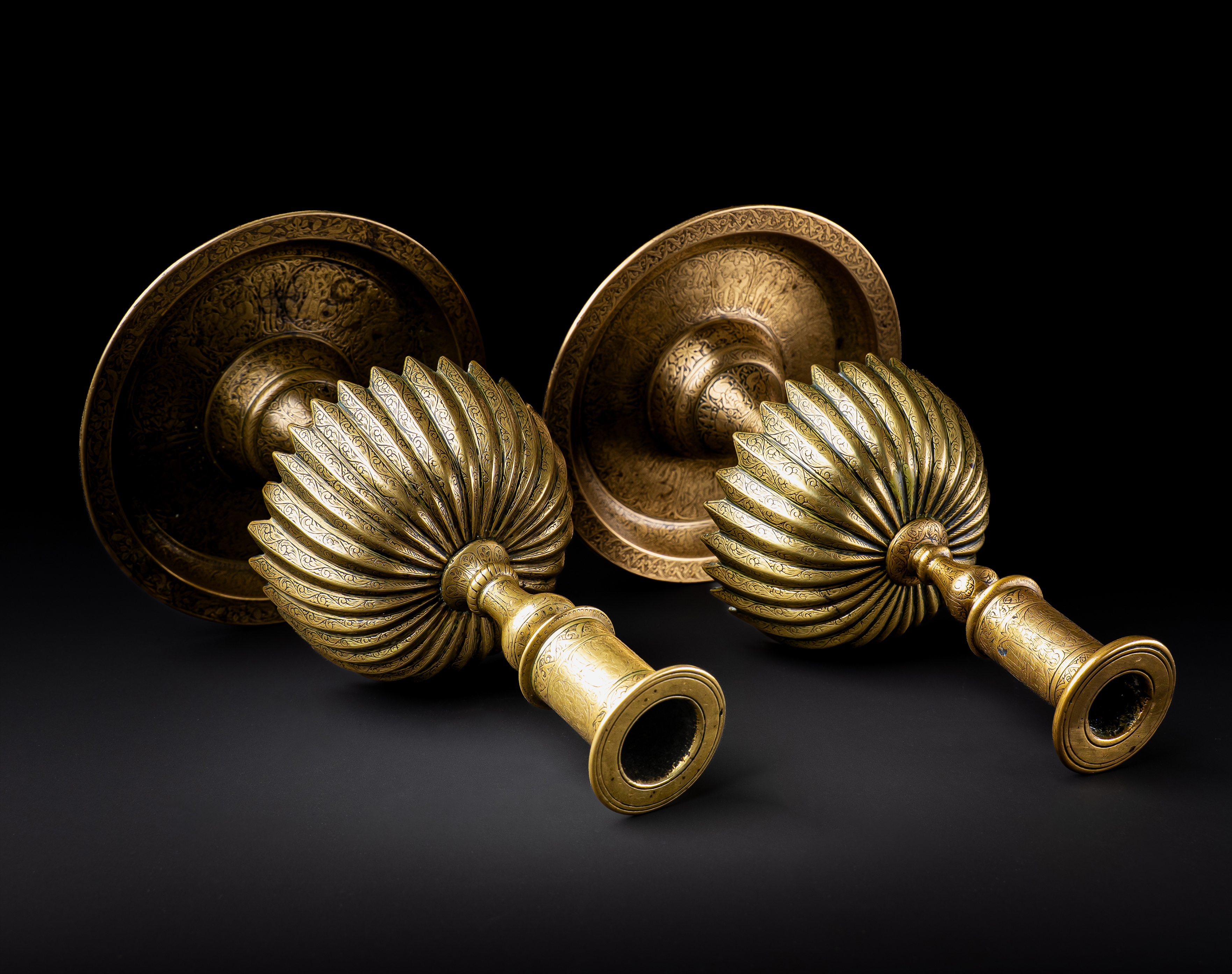 A pair of engraved Persian Islamic candlesticks, dating from the Zand or Qajar period, 18th – 19th century. Each candlestick is beautifully crafted in brass and richly decorated with intricate floral and vegetal motifs, engraved throughout the surface with great precision. The design features a wide circular tray base supporting a tall, tapering stem, surmounted by a ribbed domed section resembling stylised lotus or palm petals, and topped with a cylindrical candleholder. The engraved decoration covers nearly every surface, with arabesque patterns and figural details visible on the stem and base.
