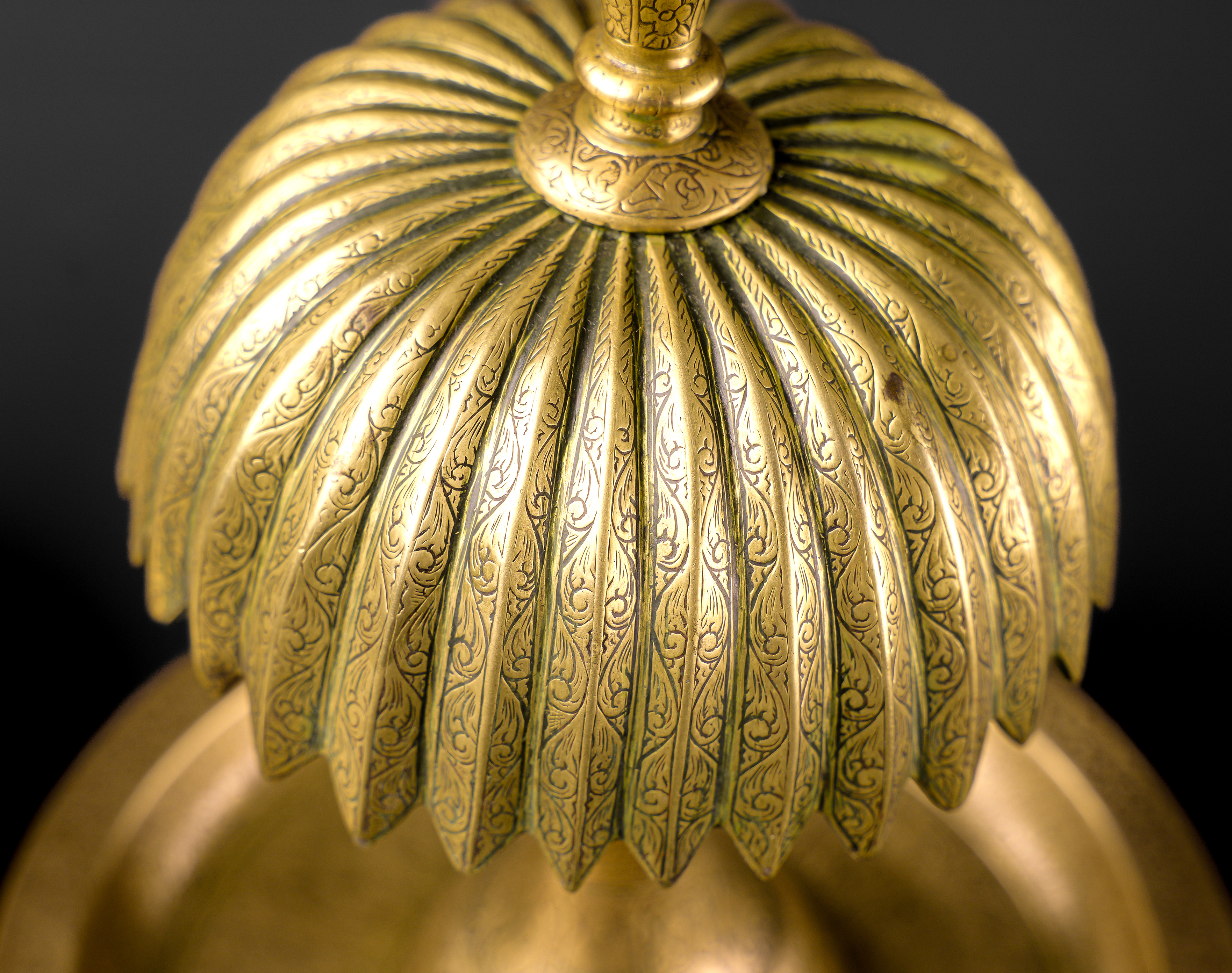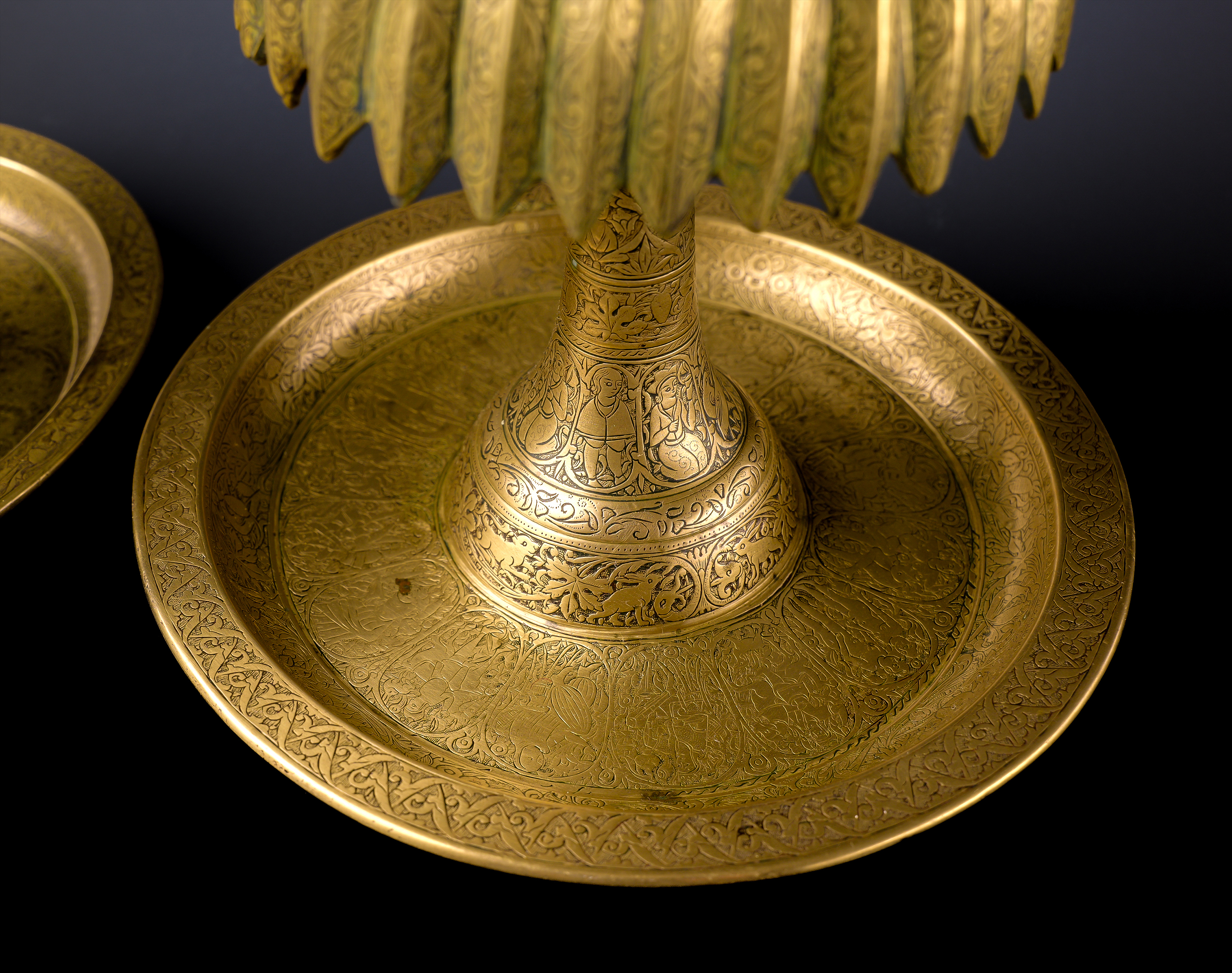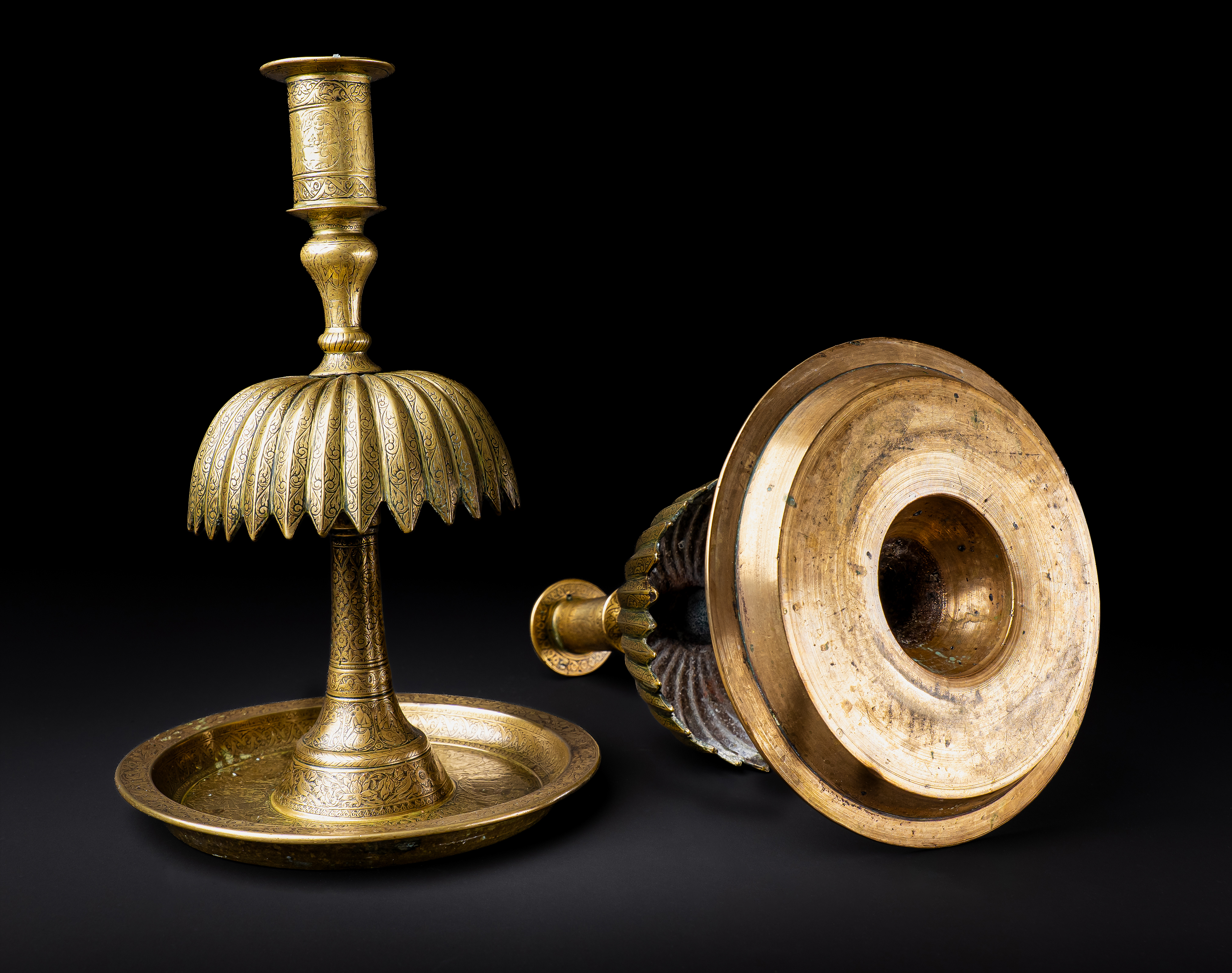 A pair of engraved Persian Islamic candlesticks, dating from the Zand or Qajar period, 18th – 19th century. Each candlestick is beautifully crafted in brass and richly decorated with intricate floral and vegetal motifs, engraved throughout the surface with great precision. The design features a wide circular tray base supporting a tall, tapering stem, surmounted by a ribbed domed section resembling stylised lotus or palm petals, and topped with a cylindrical candleholder. The engraved decoration covers nearly every surface, with arabesque patterns and figural details visible on the stem and base.
