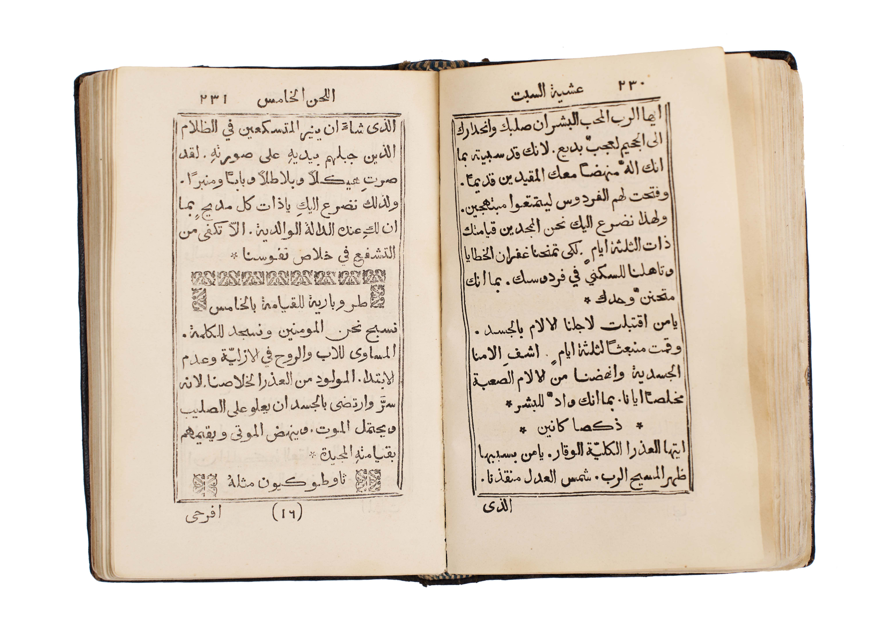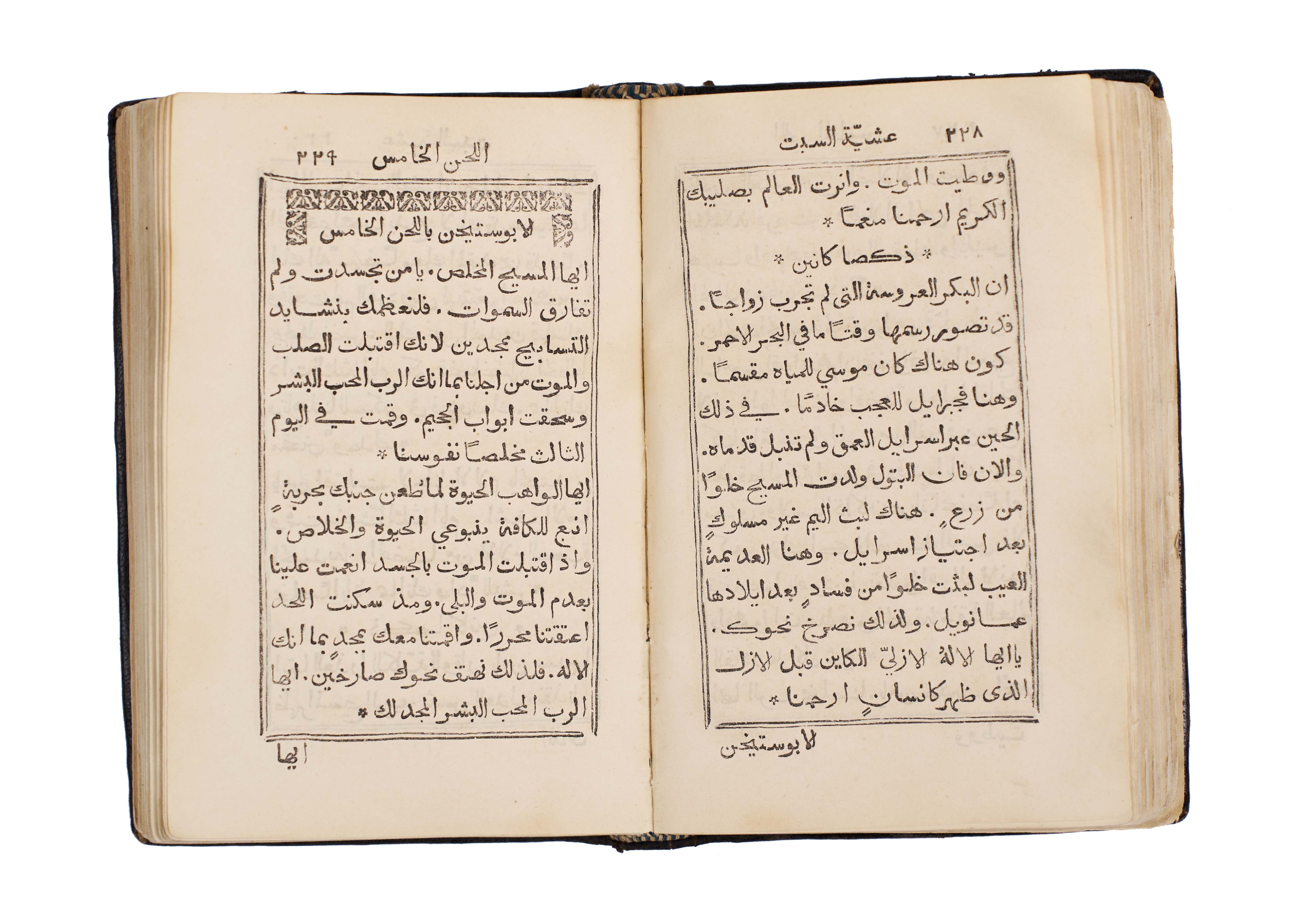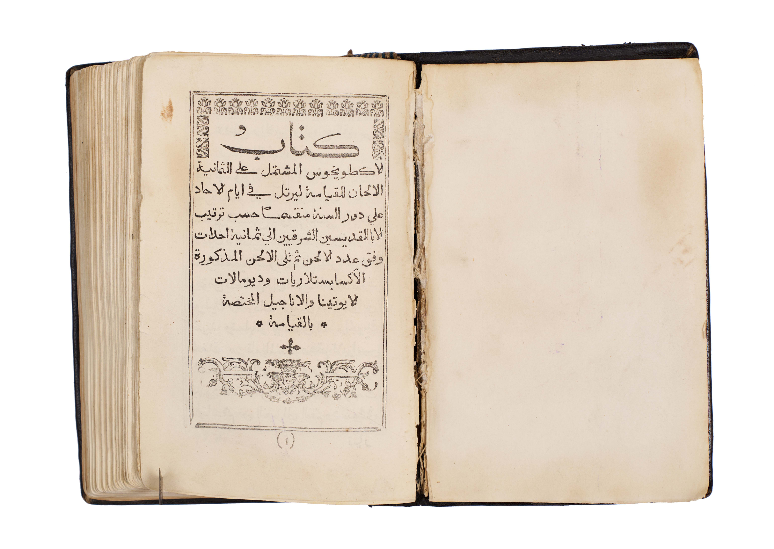 An exceptionally rare 1866 Arabic Christian liturgical book, The Book of Gospel Hymns and Chants attributed to Saint John Chrysostom (John “the Golden Mouth” / “Al-Fam al-Dhahabi”), printed at the historic Monastery of St. John the Goldsmith, Chouir Press, Lebanon. This scarce volume is a remarkable testament to the enduring Christian heritage of Lebanon, where Arabic Christian printing flourished during the 19th century. It contains a complete collection of gospel hymns, chants, and prayers, arranged according to the ecclesiastical calendar and used in church liturgy. The text is beautifully typeset in clear Arabic script with decorative headpieces, ornaments, and traditional ecclesiastical motifs. The binding is original, with dark tooled leather covers featuring blind-stamped floral and geometric designs.