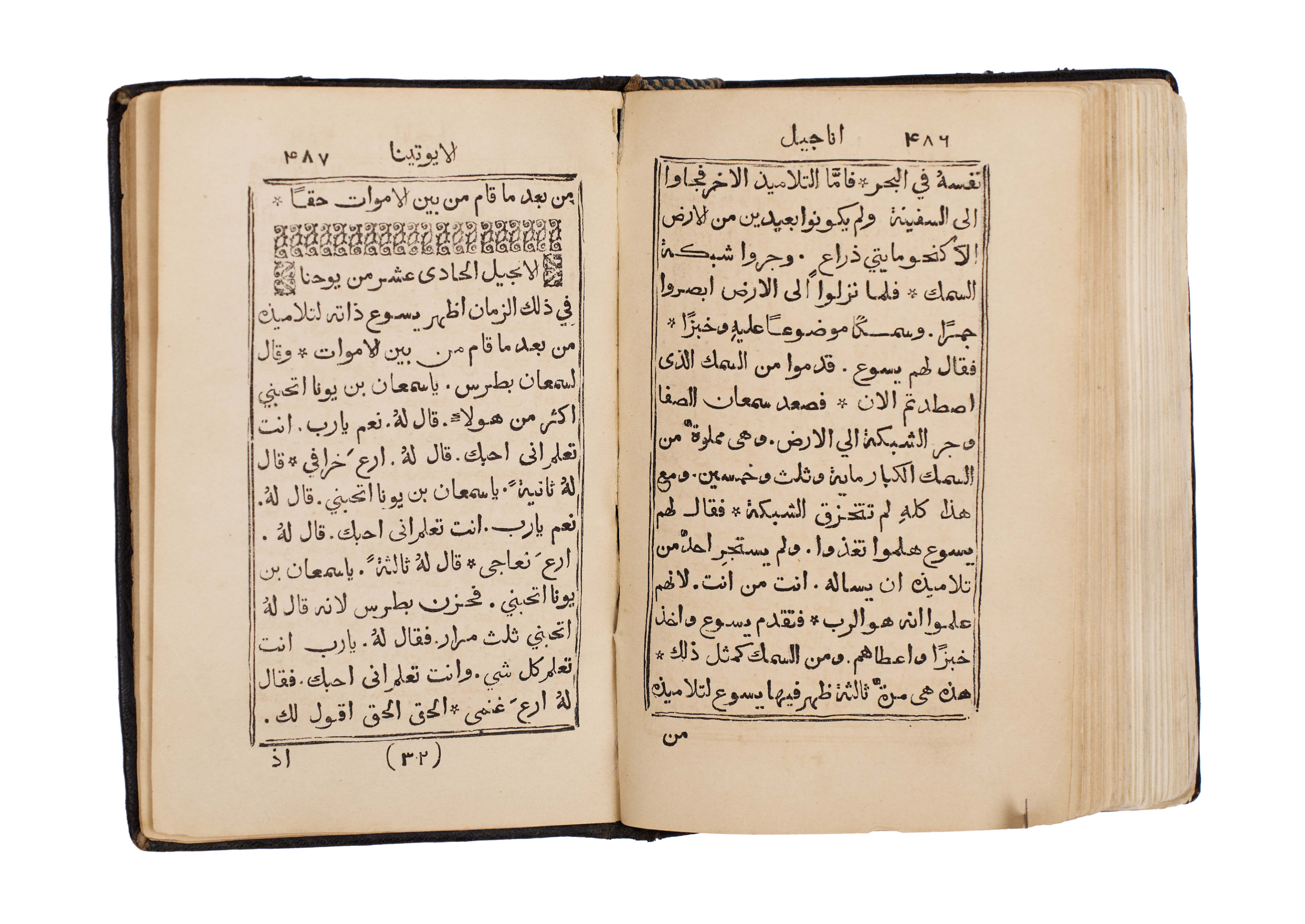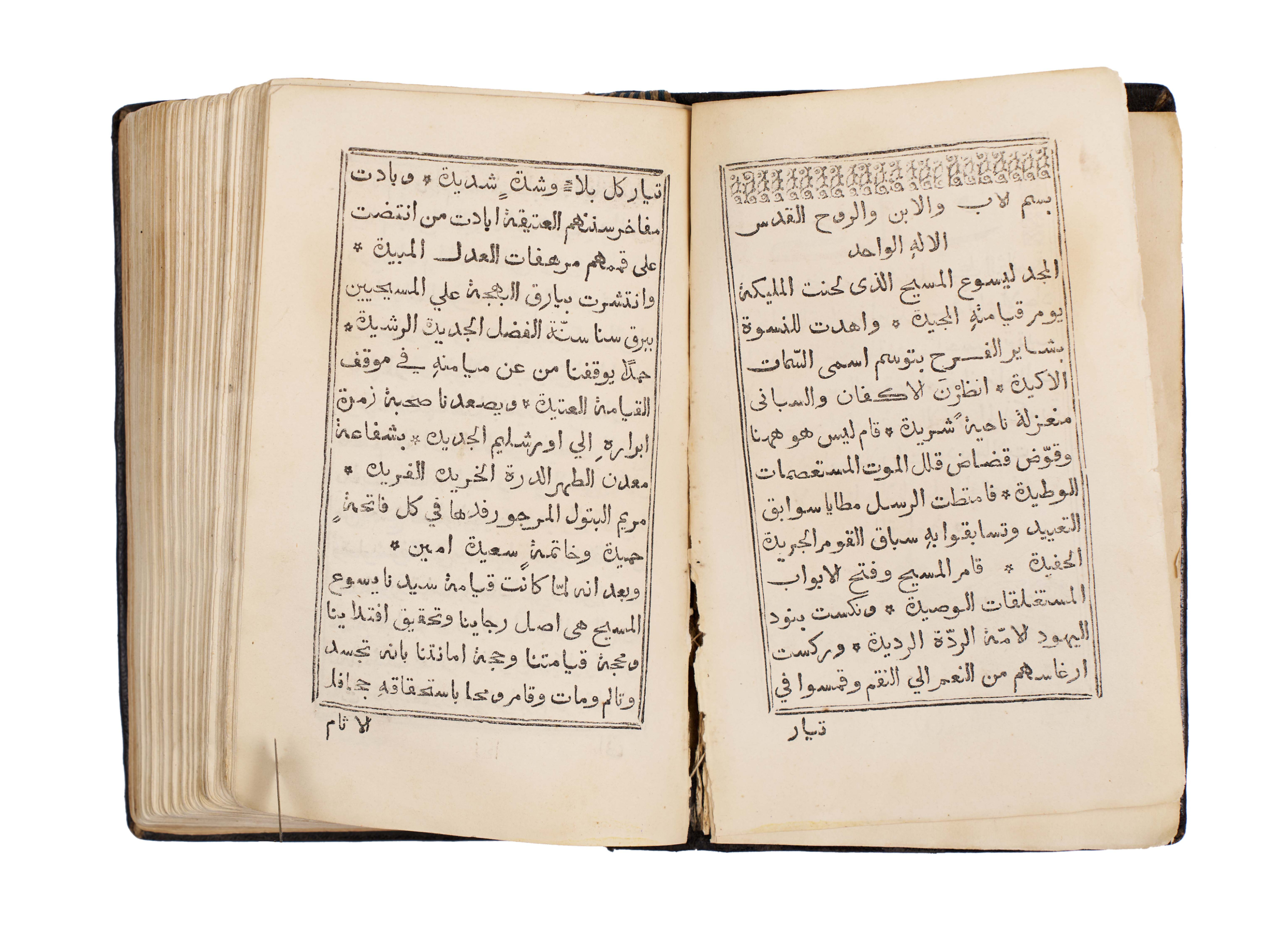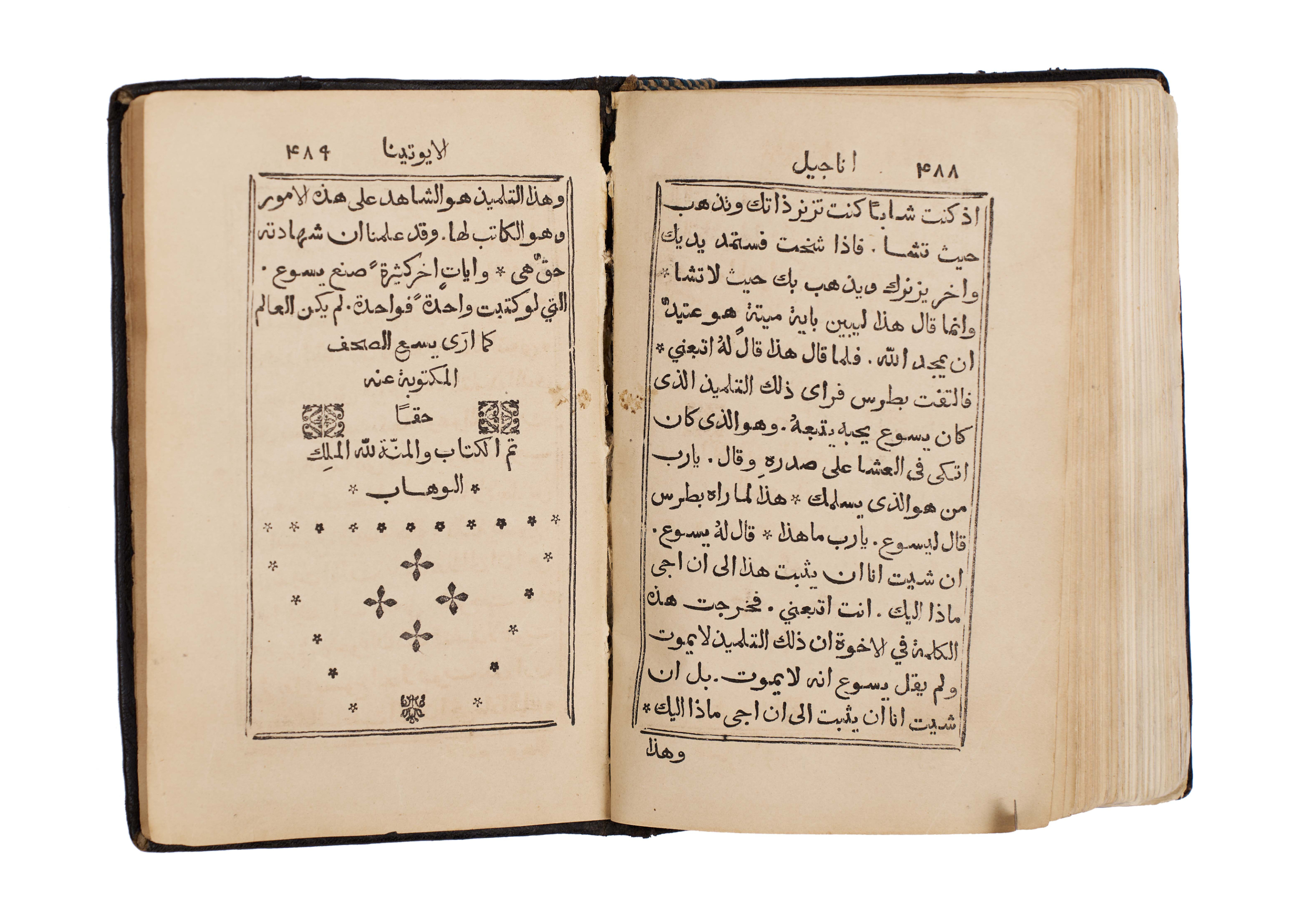 An exceptionally rare 1866 Arabic Christian liturgical book, The Book of Gospel Hymns and Chants attributed to Saint John Chrysostom (John “the Golden Mouth” / “Al-Fam al-Dhahabi”), printed at the historic Monastery of St. John the Goldsmith, Chouir Press, Lebanon. This scarce volume is a remarkable testament to the enduring Christian heritage of Lebanon, where Arabic Christian printing flourished during the 19th century. It contains a complete collection of gospel hymns, chants, and prayers, arranged according to the ecclesiastical calendar and used in church liturgy. The text is beautifully typeset in clear Arabic script with decorative headpieces, ornaments, and traditional ecclesiastical motifs. The binding is original, with dark tooled leather covers featuring blind-stamped floral and geometric designs.