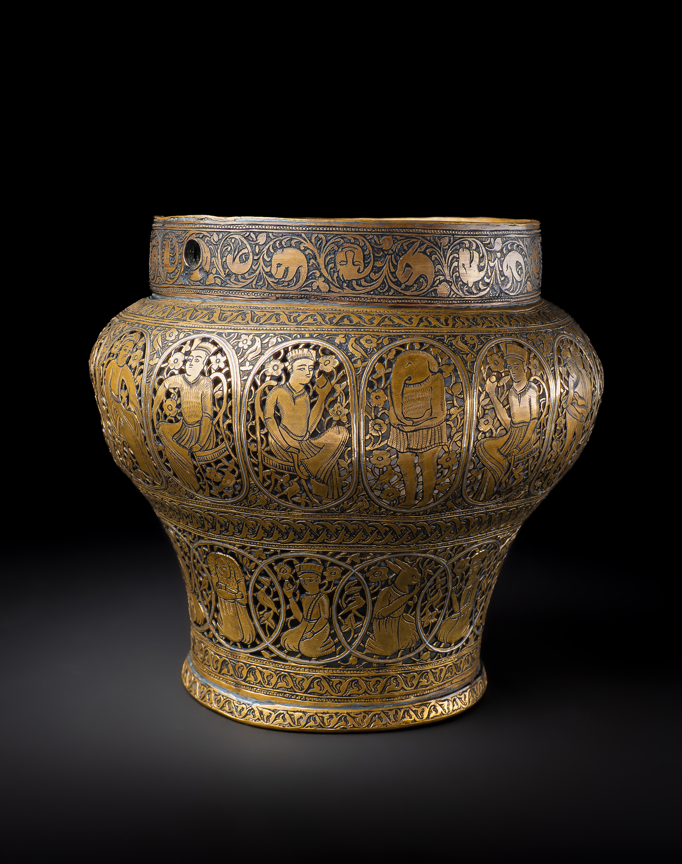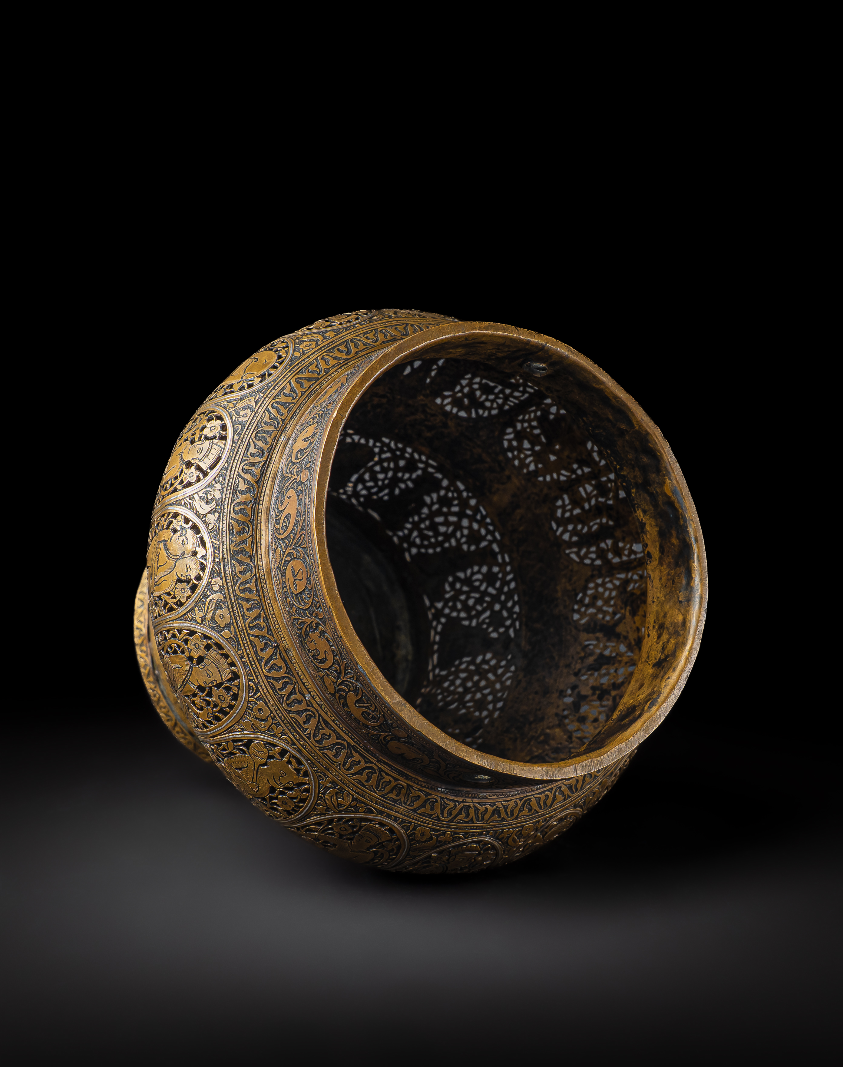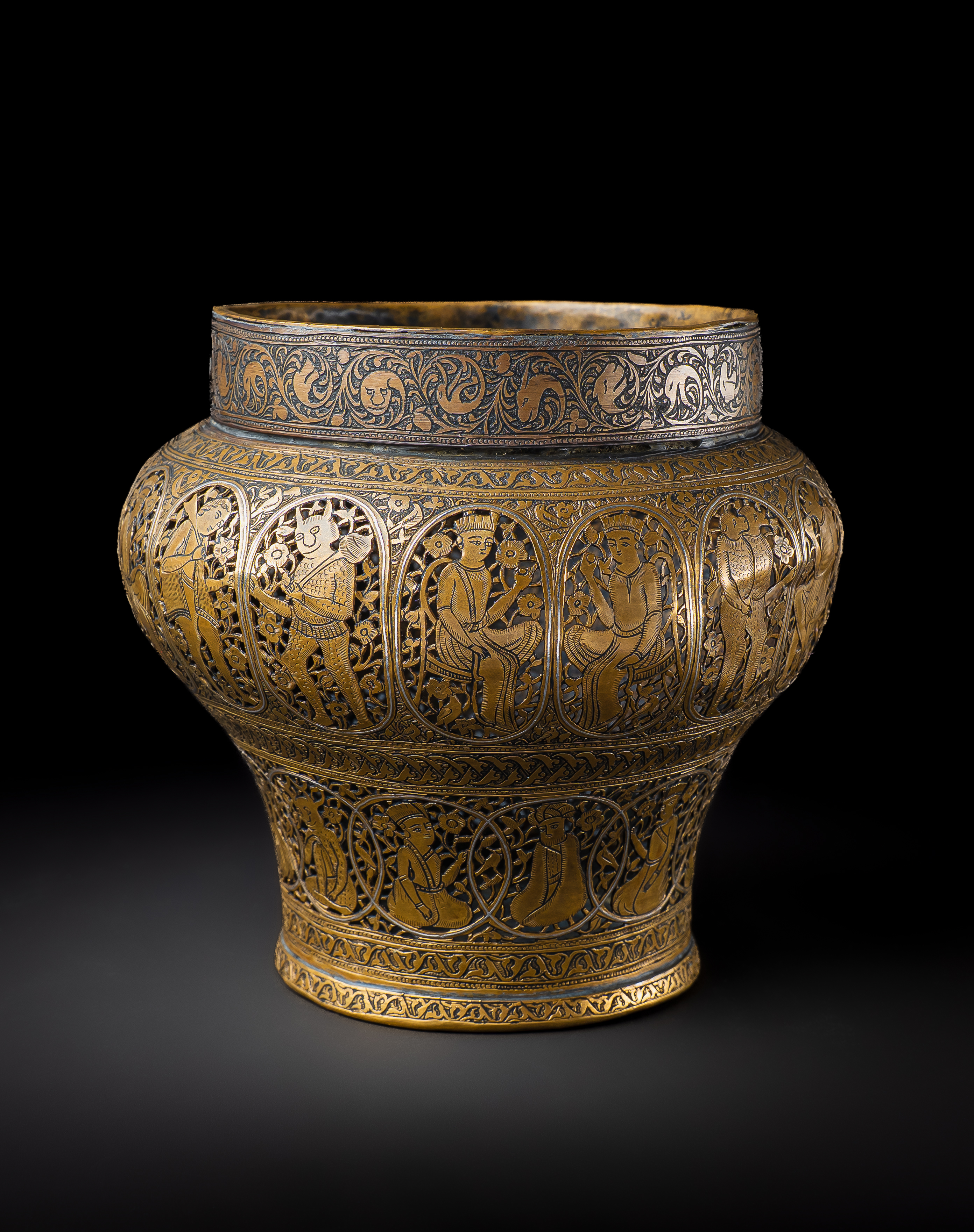 Of rounded baluster form with a wide mouth and slightly everted rim, this incense burner is finely decorated with silver inlay set against a darkened ground. The body is arranged in registers of cusped medallions, each enclosing courtly and narrative scenes: seated figures, musicians, attendants, and mythical beings, all framed within scrolling foliate surrounds. The upper band is pierced with arabesques interspersed with silver-inlaid palmettes and animal motifs, allowing the scented smoke to escape when in use.