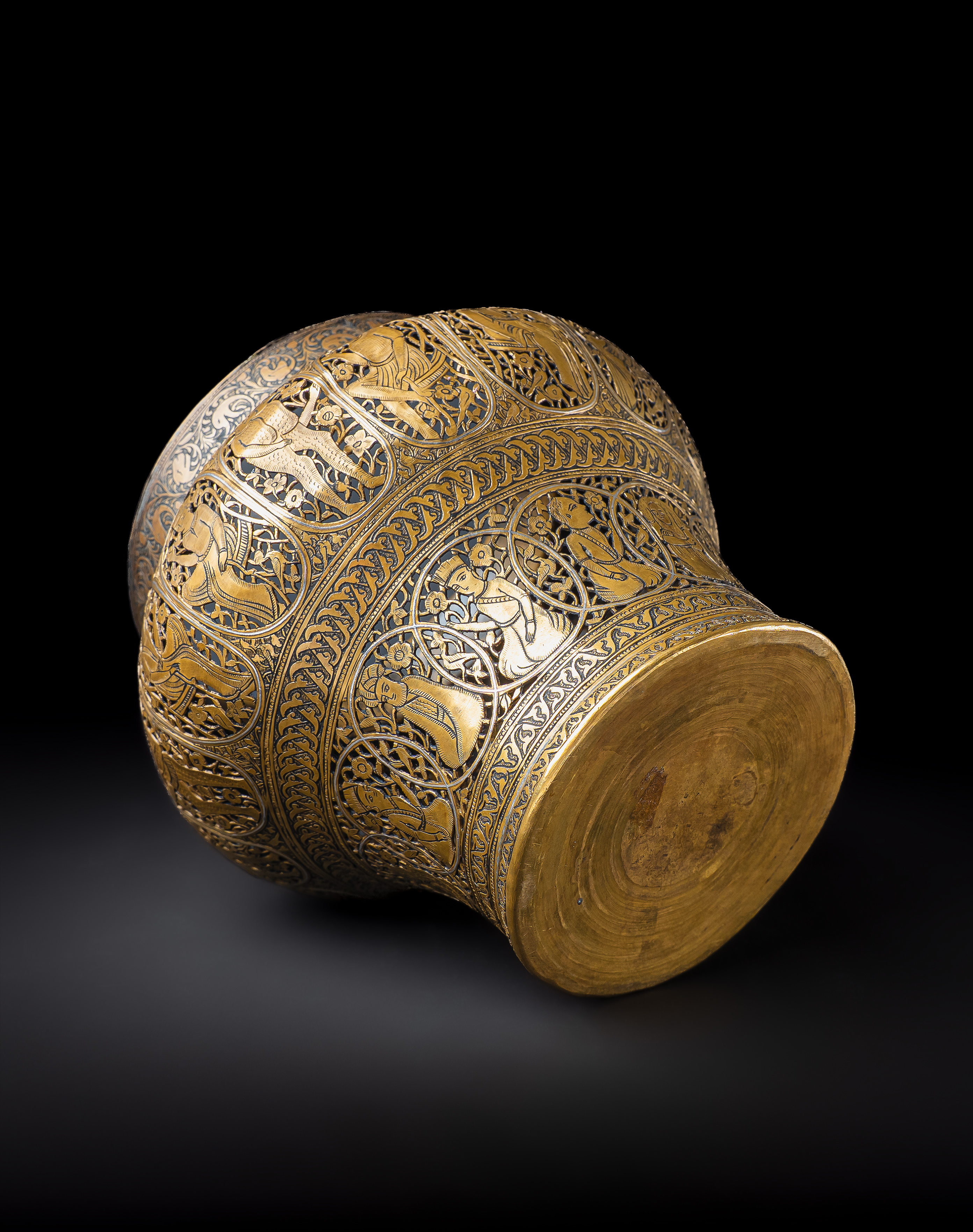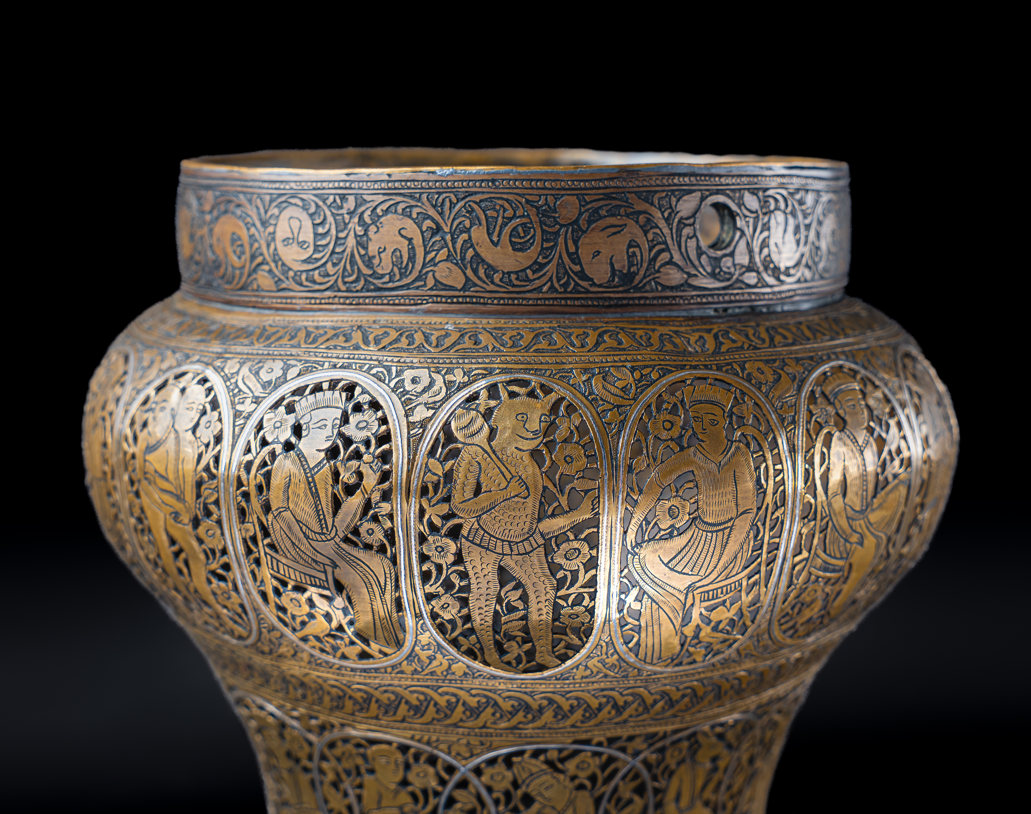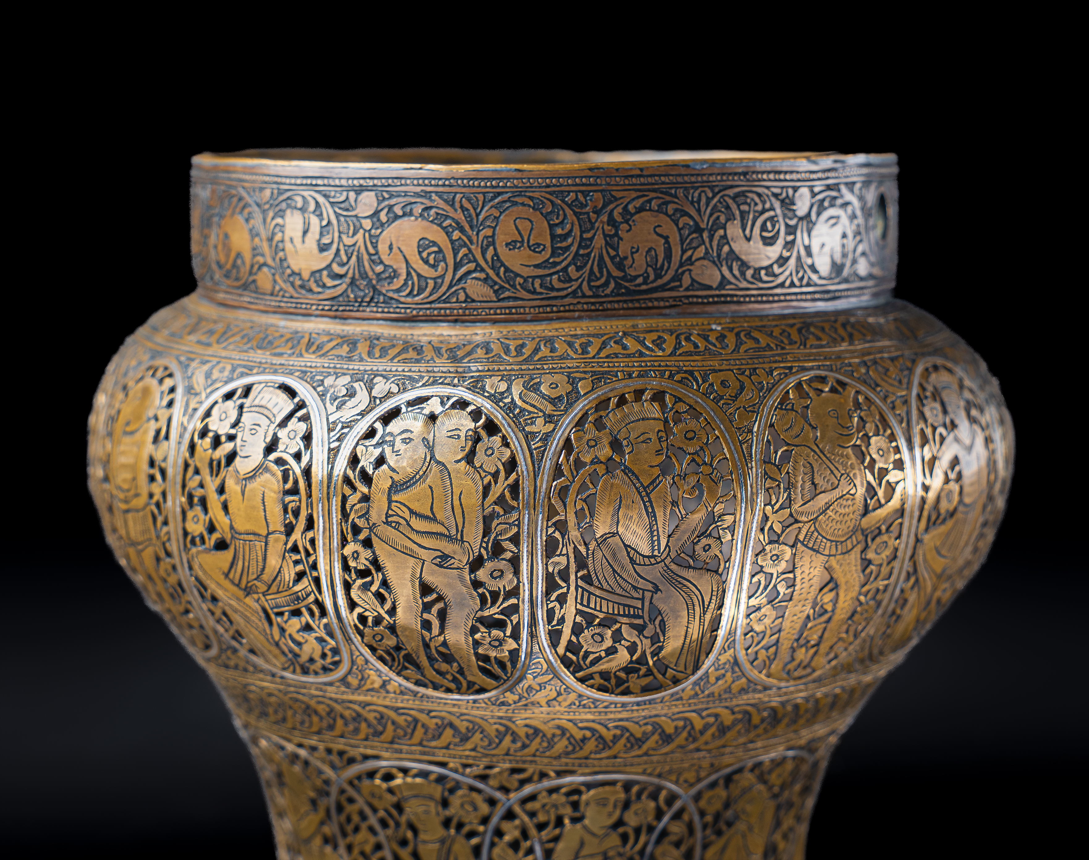 Of rounded baluster form with a wide mouth and slightly everted rim, this incense burner is finely decorated with silver inlay set against a darkened ground. The body is arranged in registers of cusped medallions, each enclosing courtly and narrative scenes: seated figures, musicians, attendants, and mythical beings, all framed within scrolling foliate surrounds. The upper band is pierced with arabesques interspersed with silver-inlaid palmettes and animal motifs, allowing the scented smoke to escape when in use.