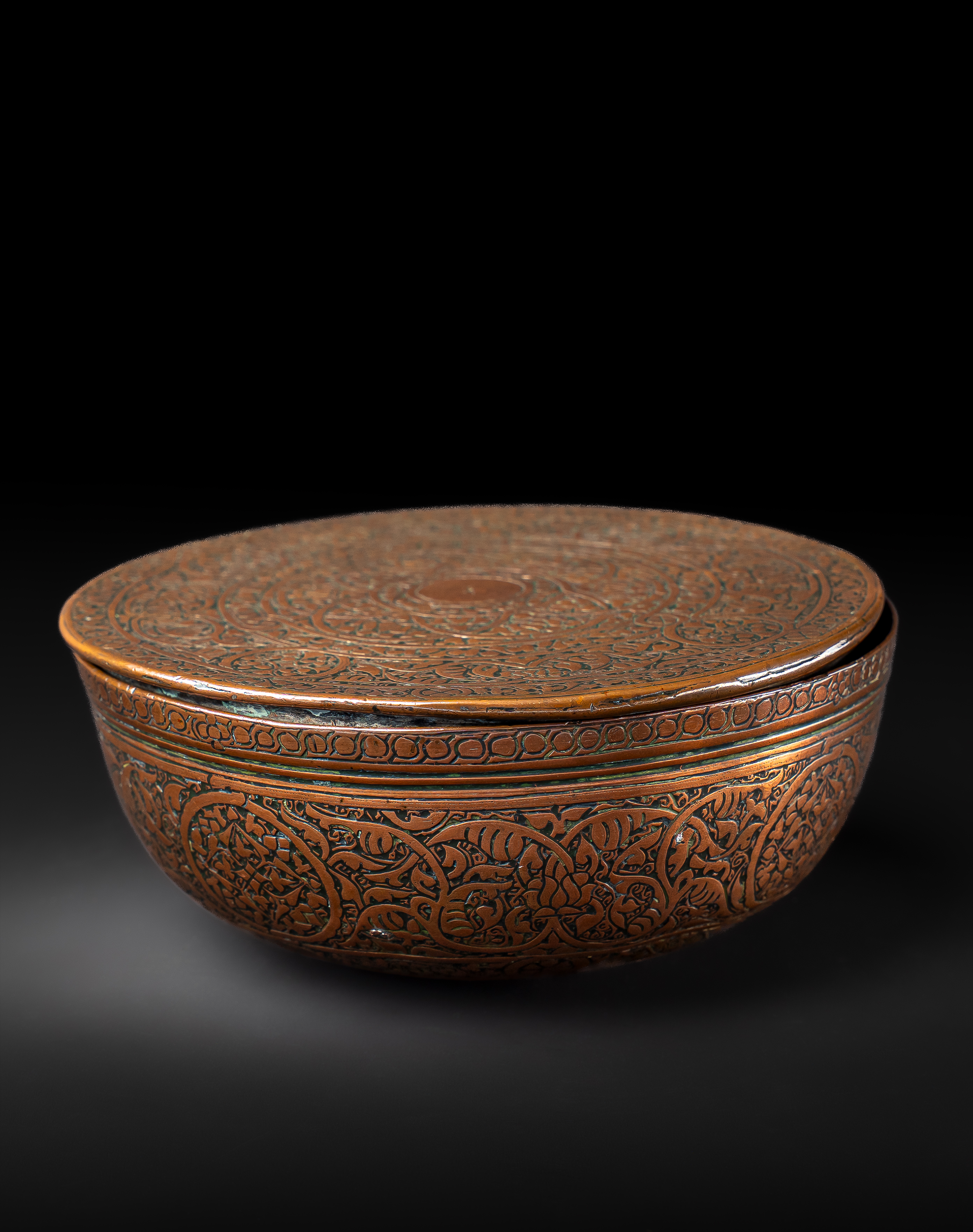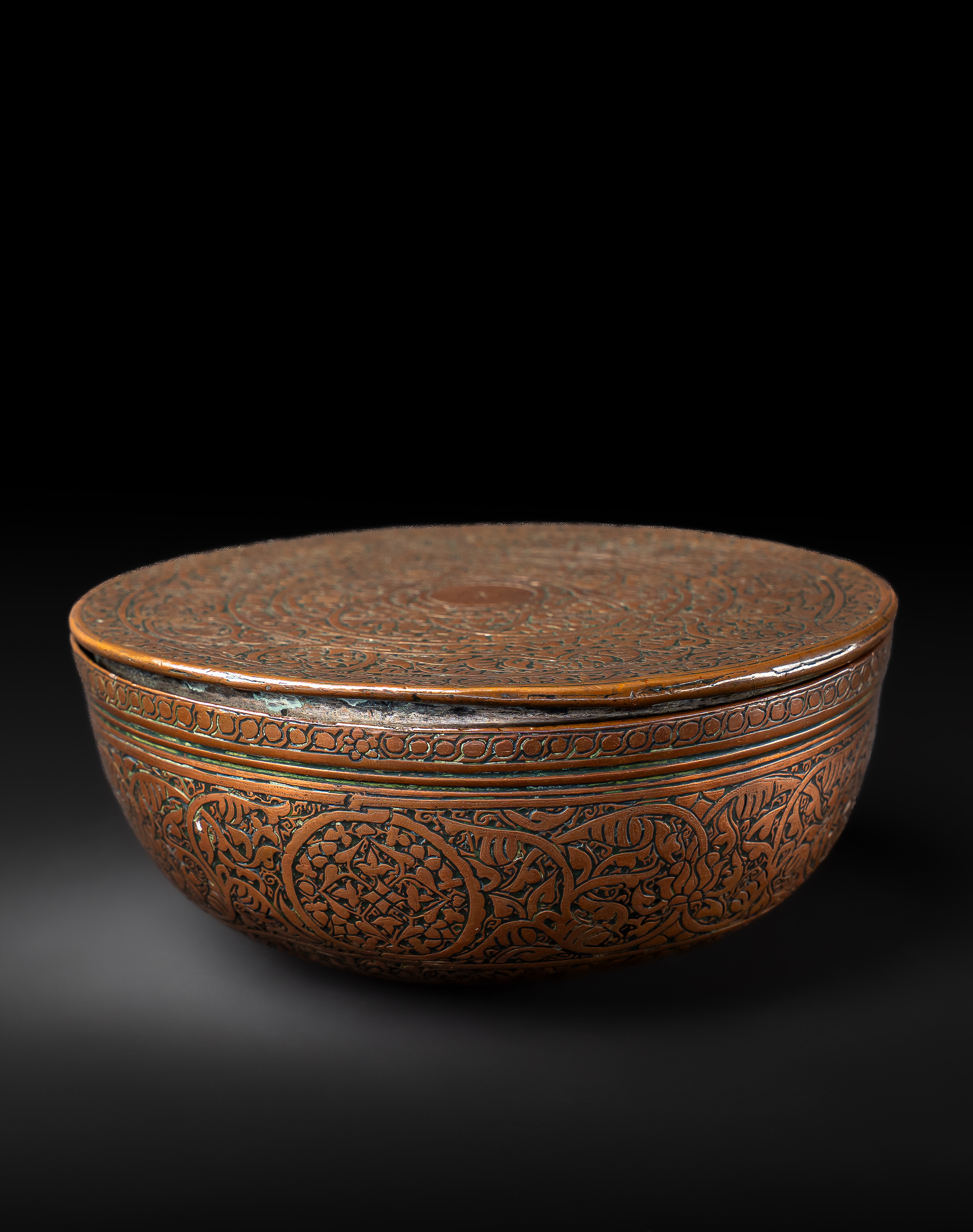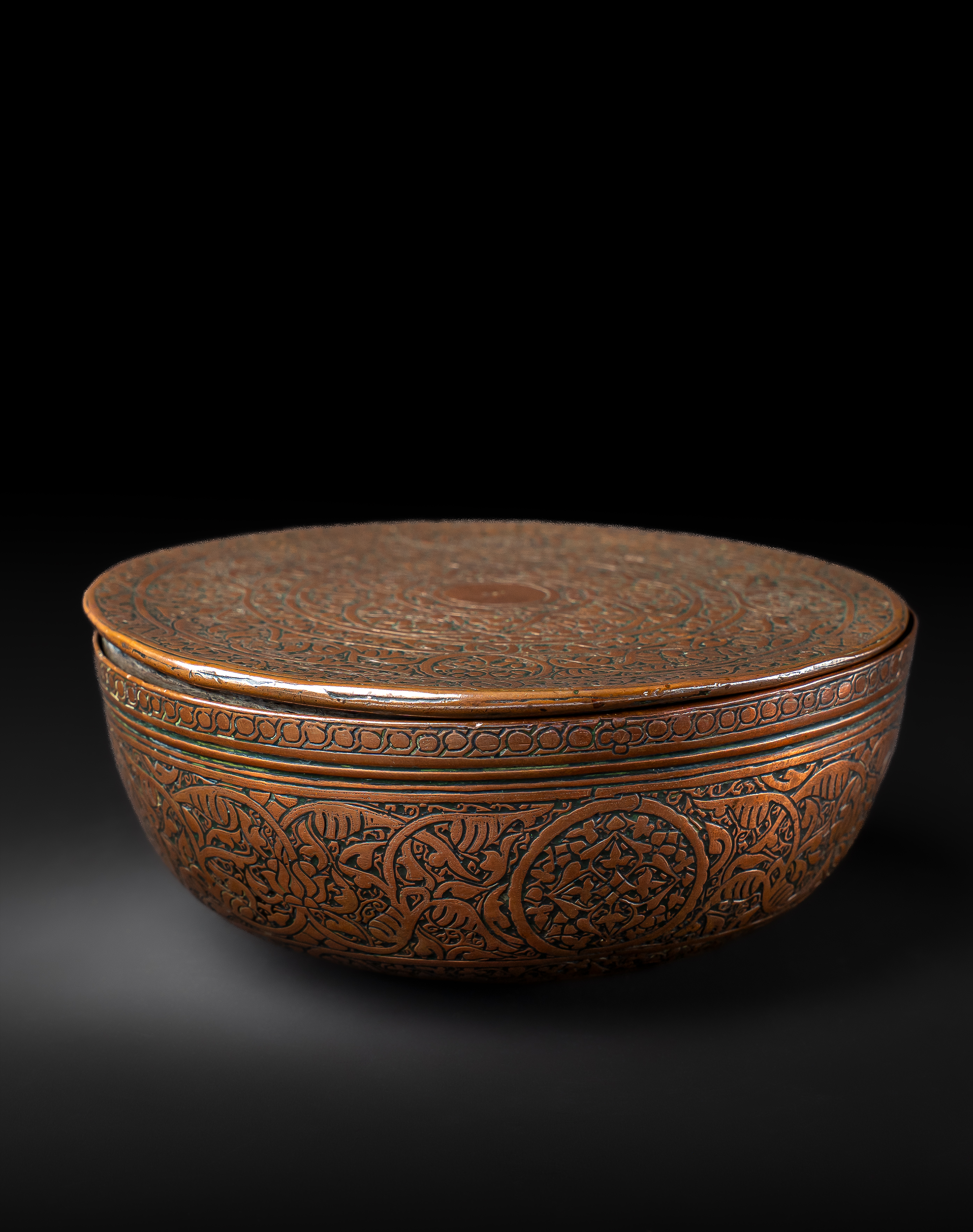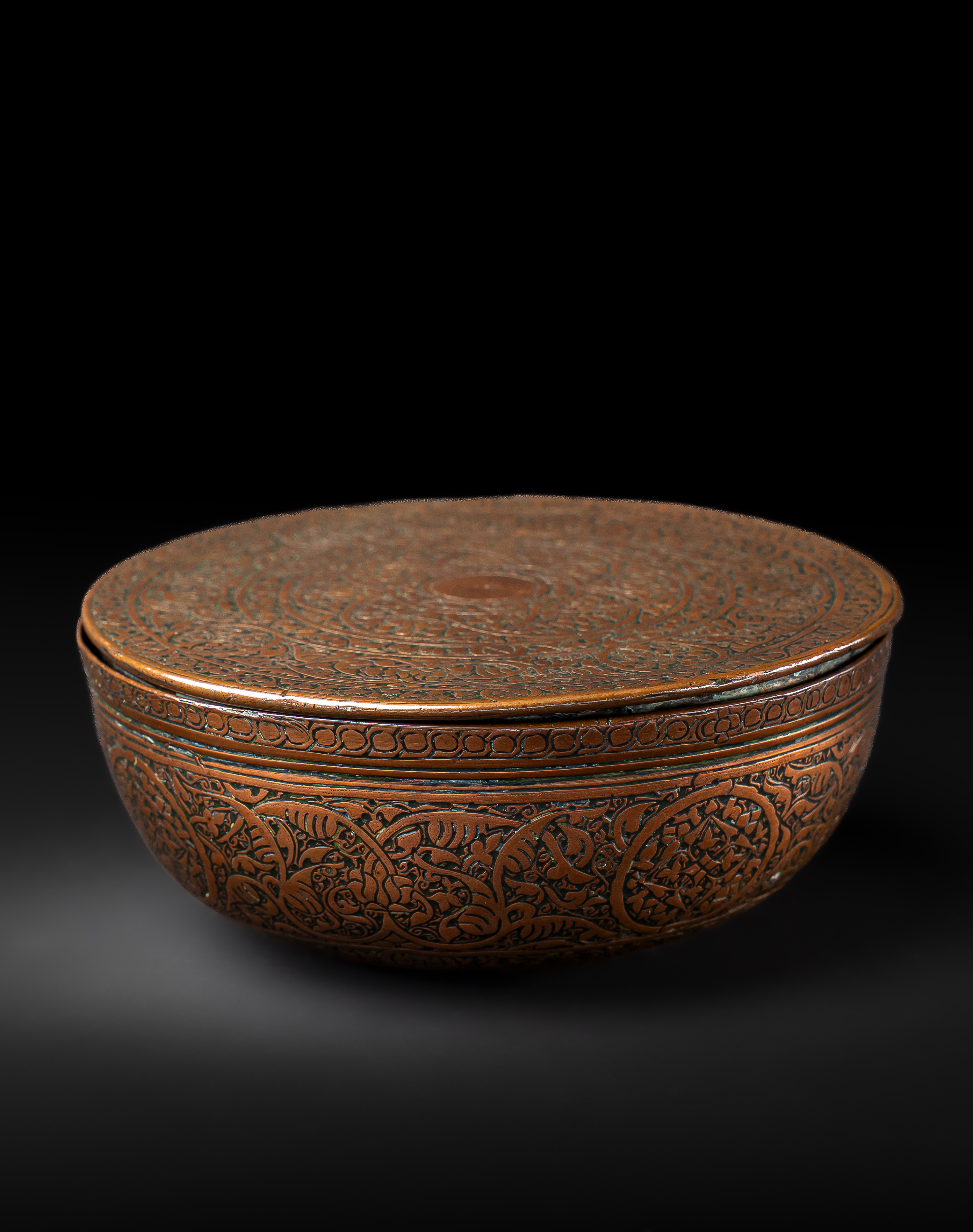Of rounded form with a fitted flat cover, this fine bowl is worked in engraved copper with intricate arabesques and geometric medallions filled with scrolling vegetal motifs. The exterior is divided into repeated roundels and cartouches, each filled with dense interlace patterns framed by flowing arabesques. The lid is decorated en suite, with concentric bands of floral scrolls radiating from a central medallion. The interior retains traces of tinning.