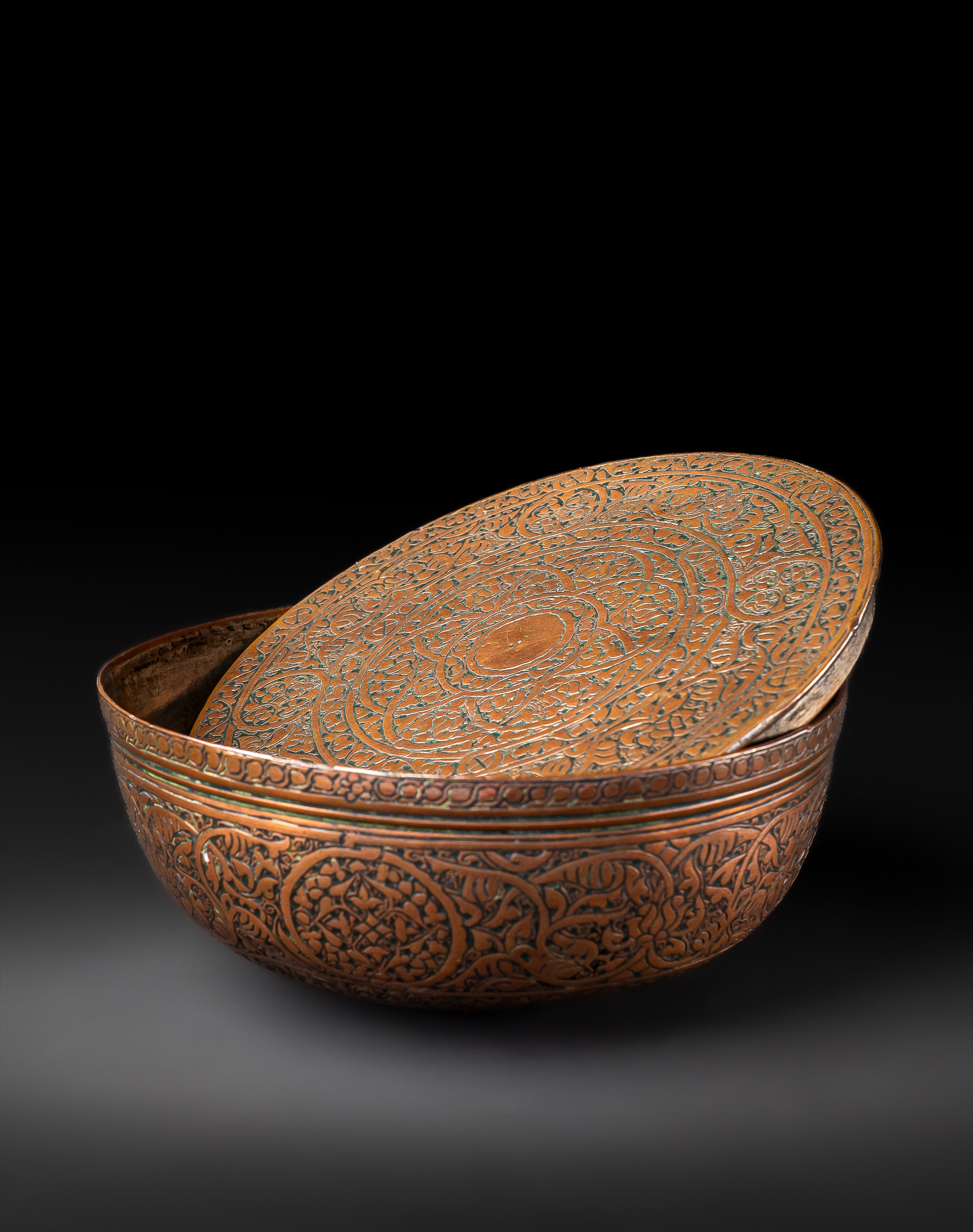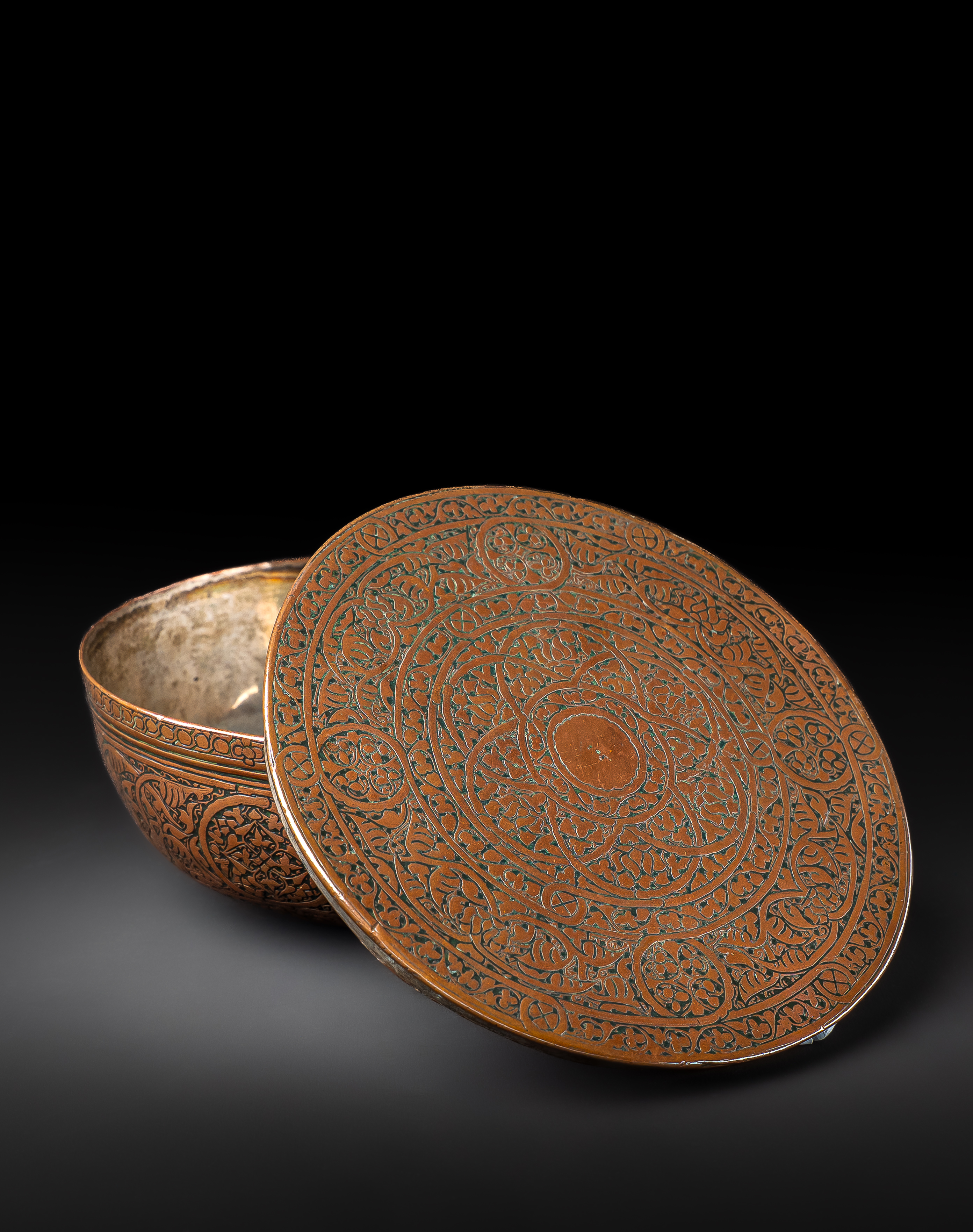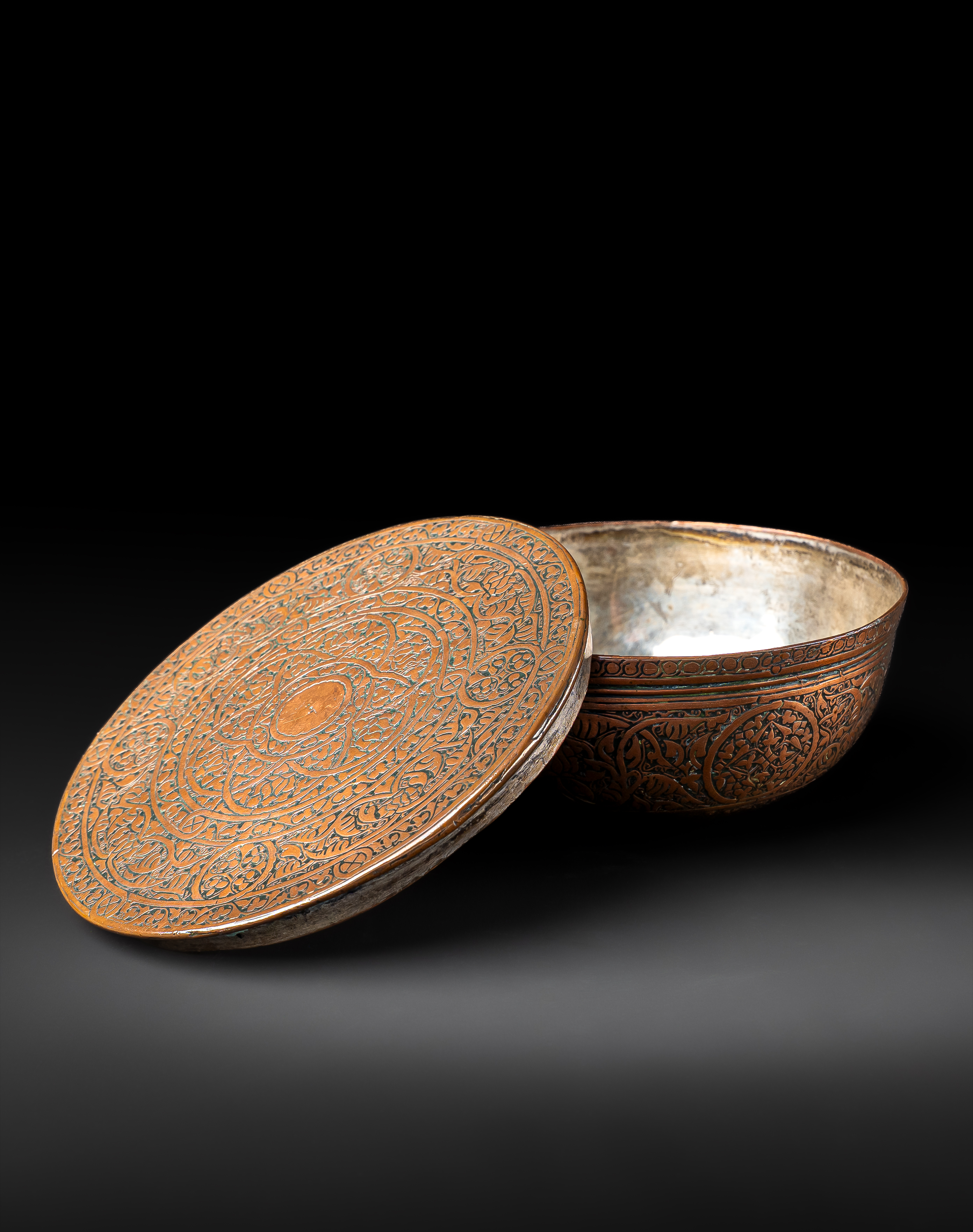 Of rounded form with a fitted flat cover, this fine bowl is worked in engraved copper with intricate arabesques and geometric medallions filled with scrolling vegetal motifs. The exterior is divided into repeated roundels and cartouches, each filled with dense interlace patterns framed by flowing arabesques. The lid is decorated en suite, with concentric bands of floral scrolls radiating from a central medallion. The interior retains traces of tinning.