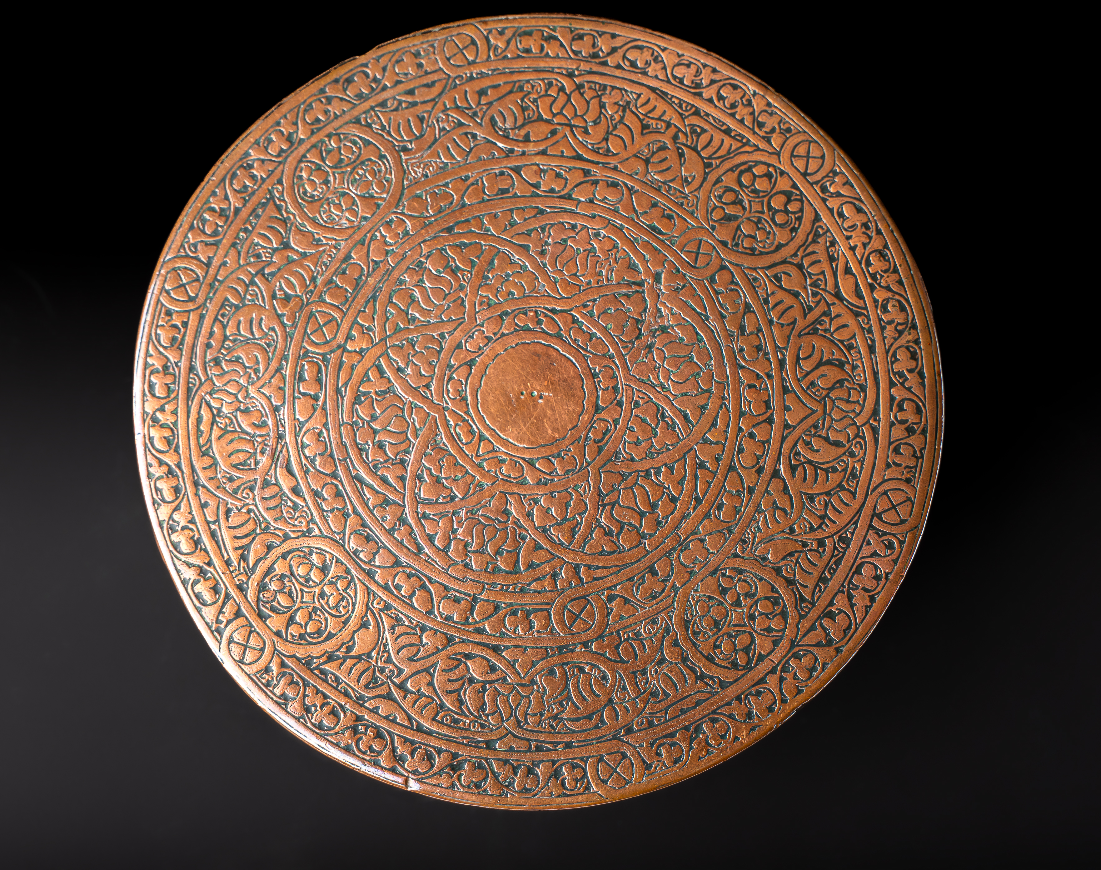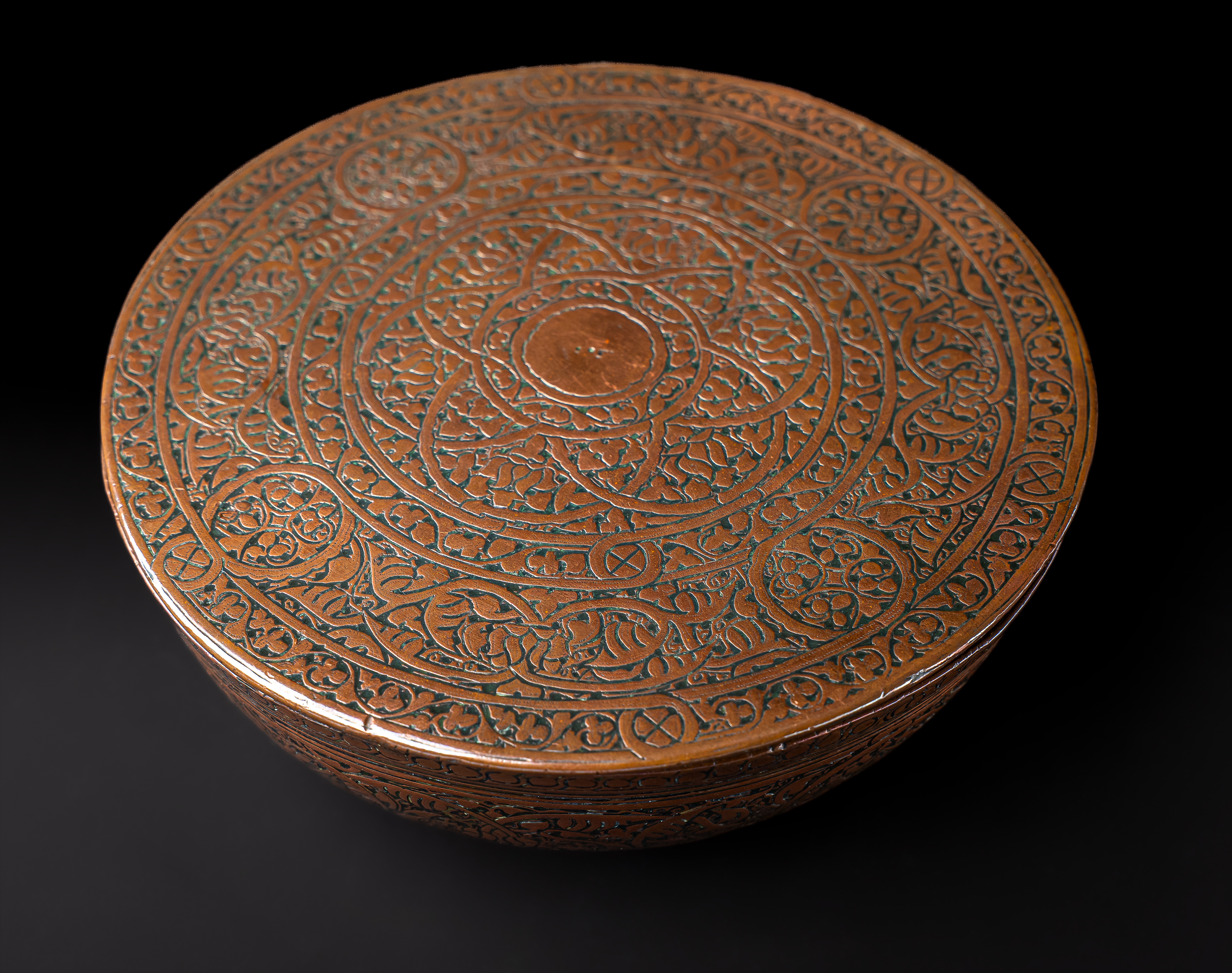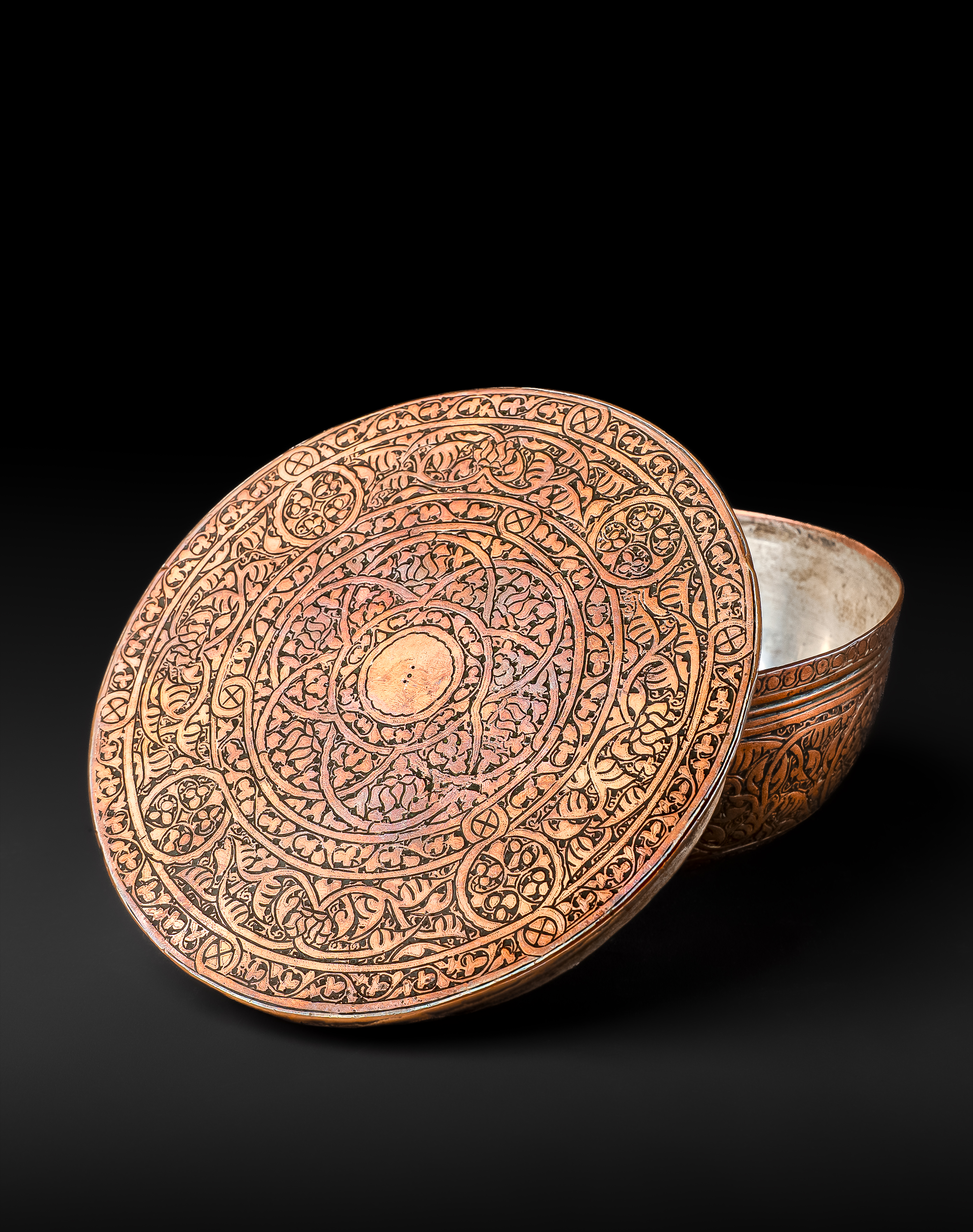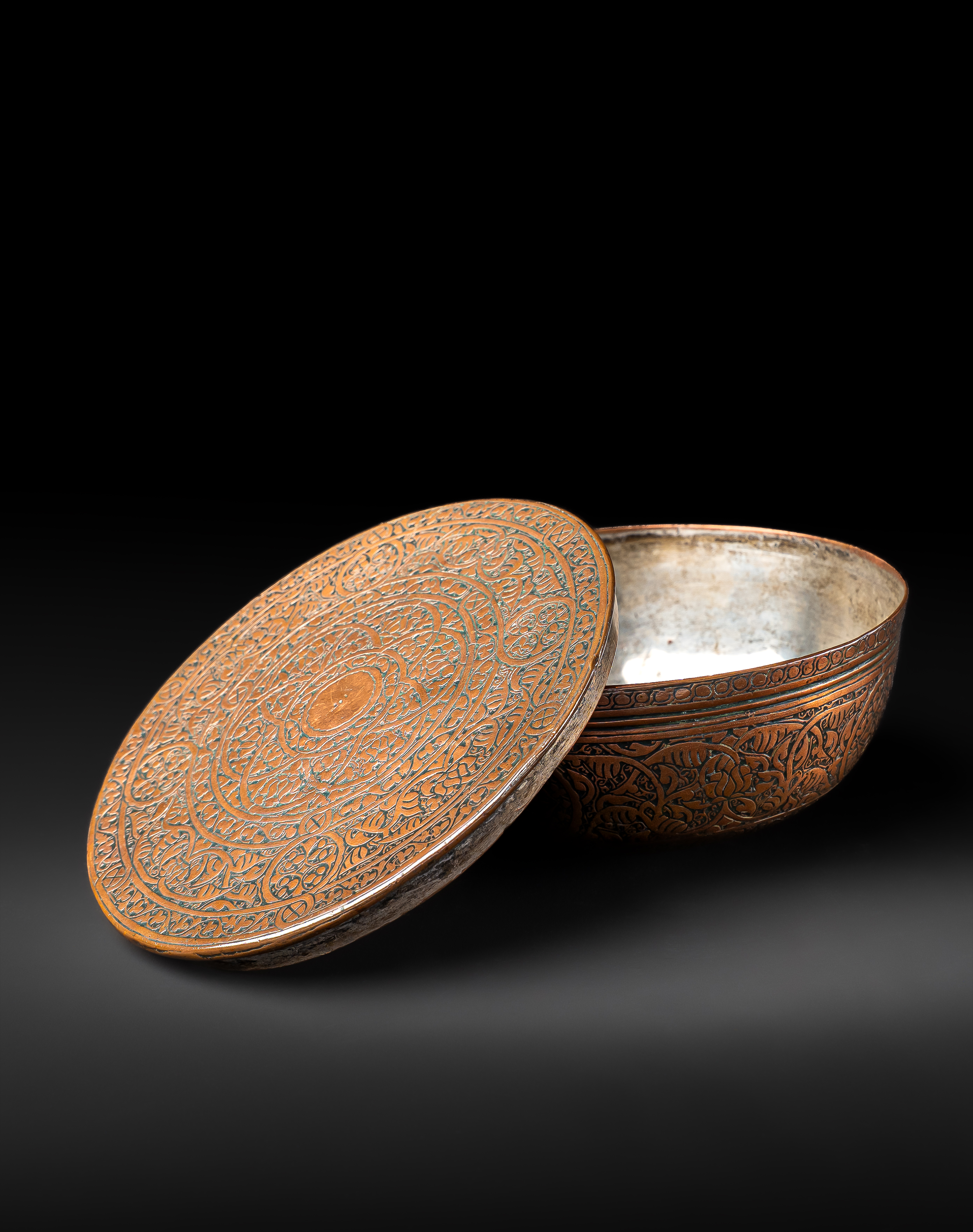 Of rounded form with a fitted flat cover, this fine bowl is worked in engraved copper with intricate arabesques and geometric medallions filled with scrolling vegetal motifs. The exterior is divided into repeated roundels and cartouches, each filled with dense interlace patterns framed by flowing arabesques. The lid is decorated en suite, with concentric bands of floral scrolls radiating from a central medallion. The interior retains traces of tinning.