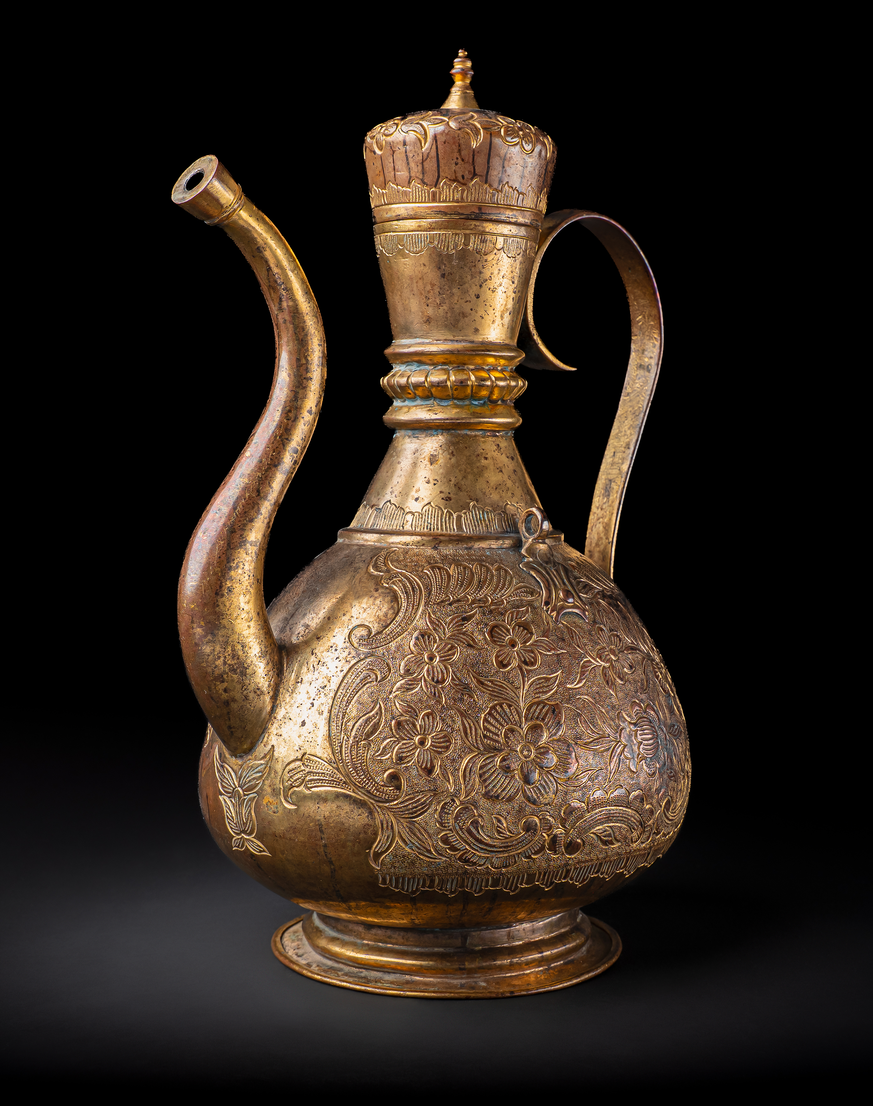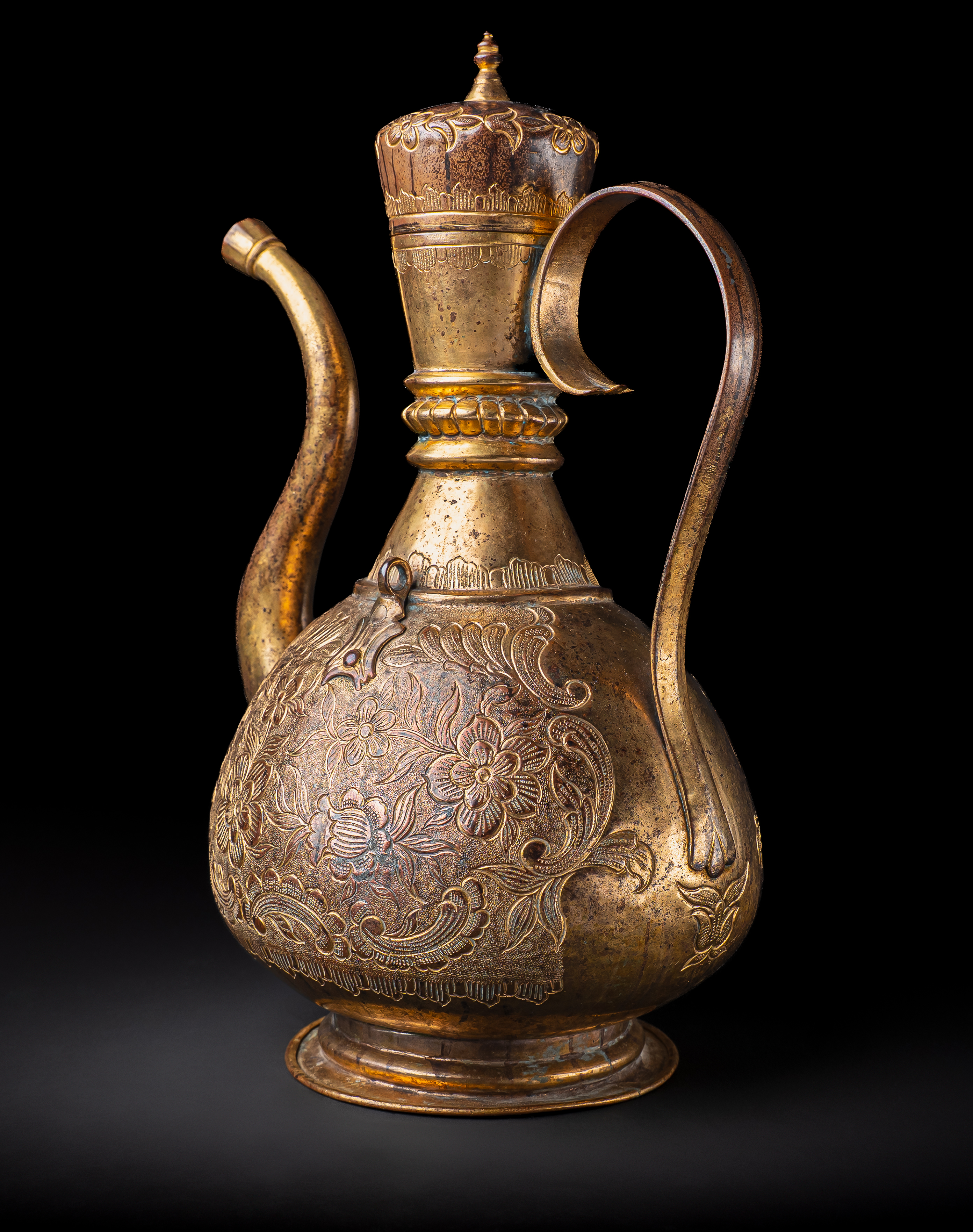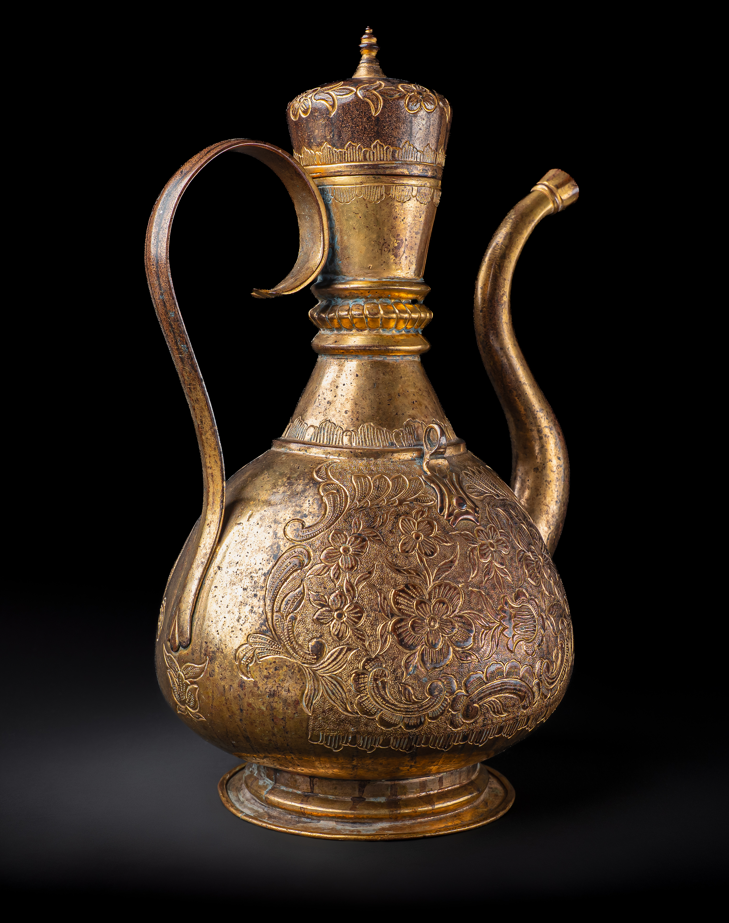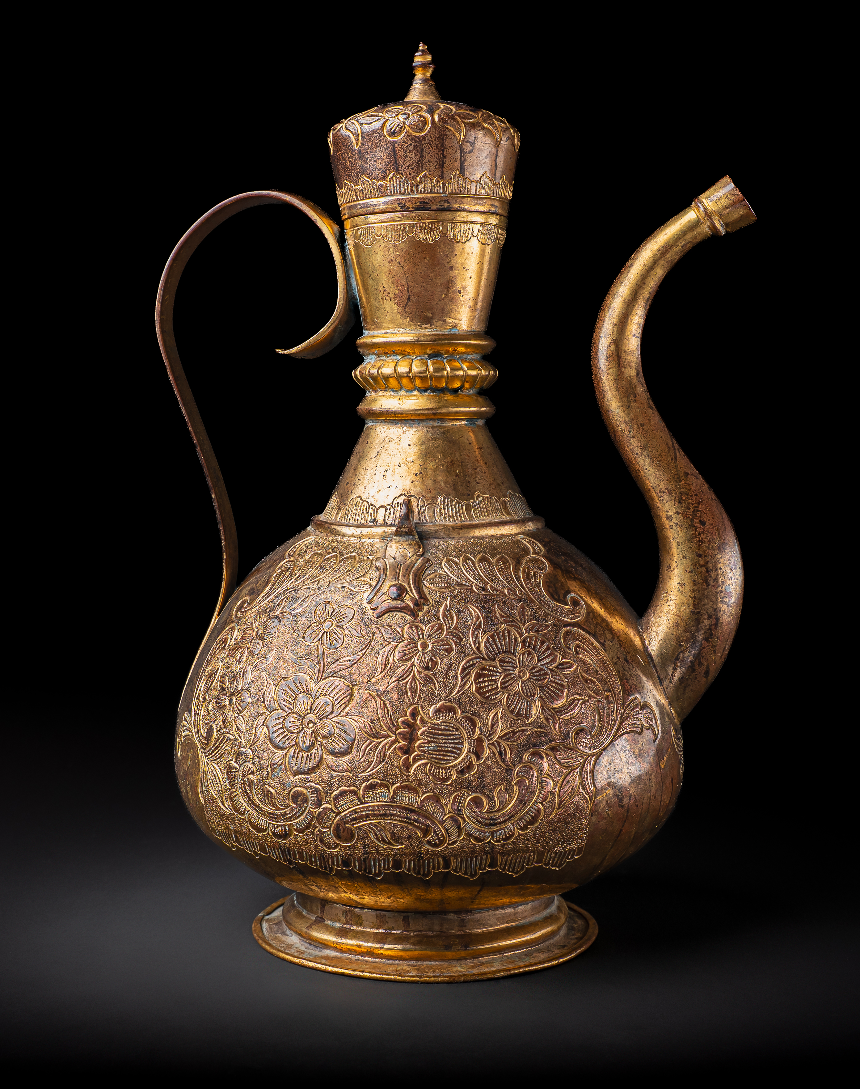 Of pear-shaped form on a spreading foot, with a tall tapering neck, domed lid, and curved spout, the ewer is finely worked in gilt copper (tombak). The body is richly decorated with repoussé and chased floral sprays of scrolling blossoms and foliage, continuing across the shoulder and lid. The tall neck is encircled with beaded bands and further floral motifs, while the domed cover is surmounted by a finial.