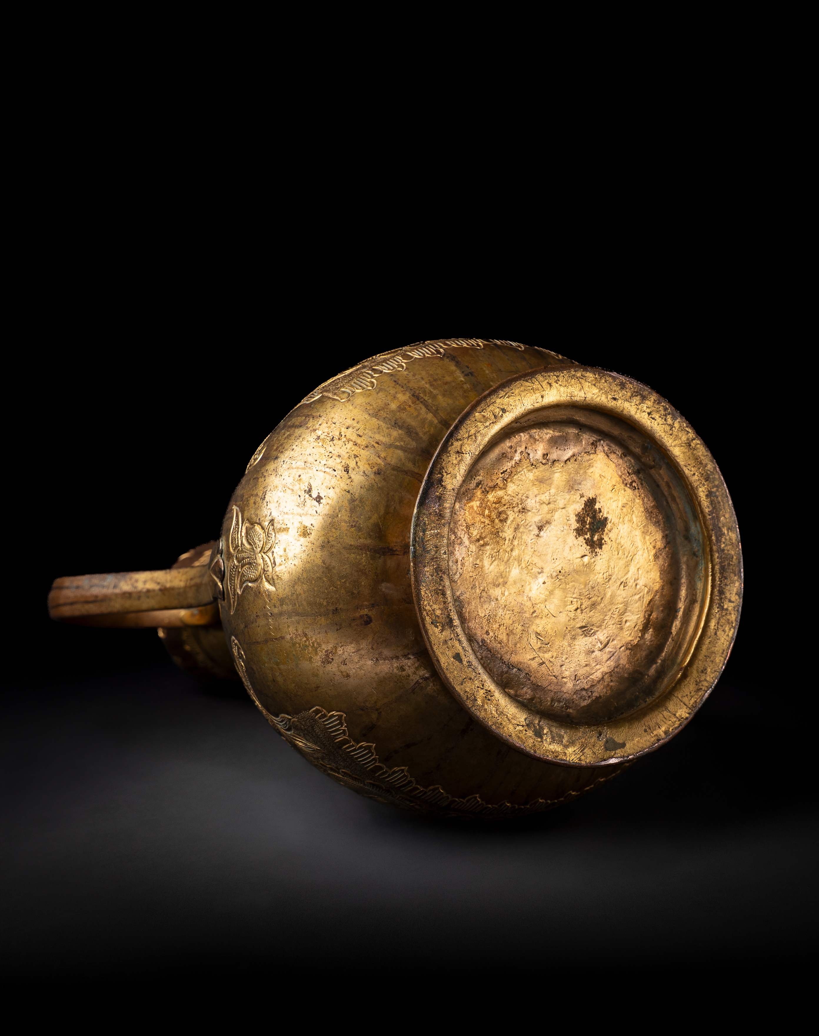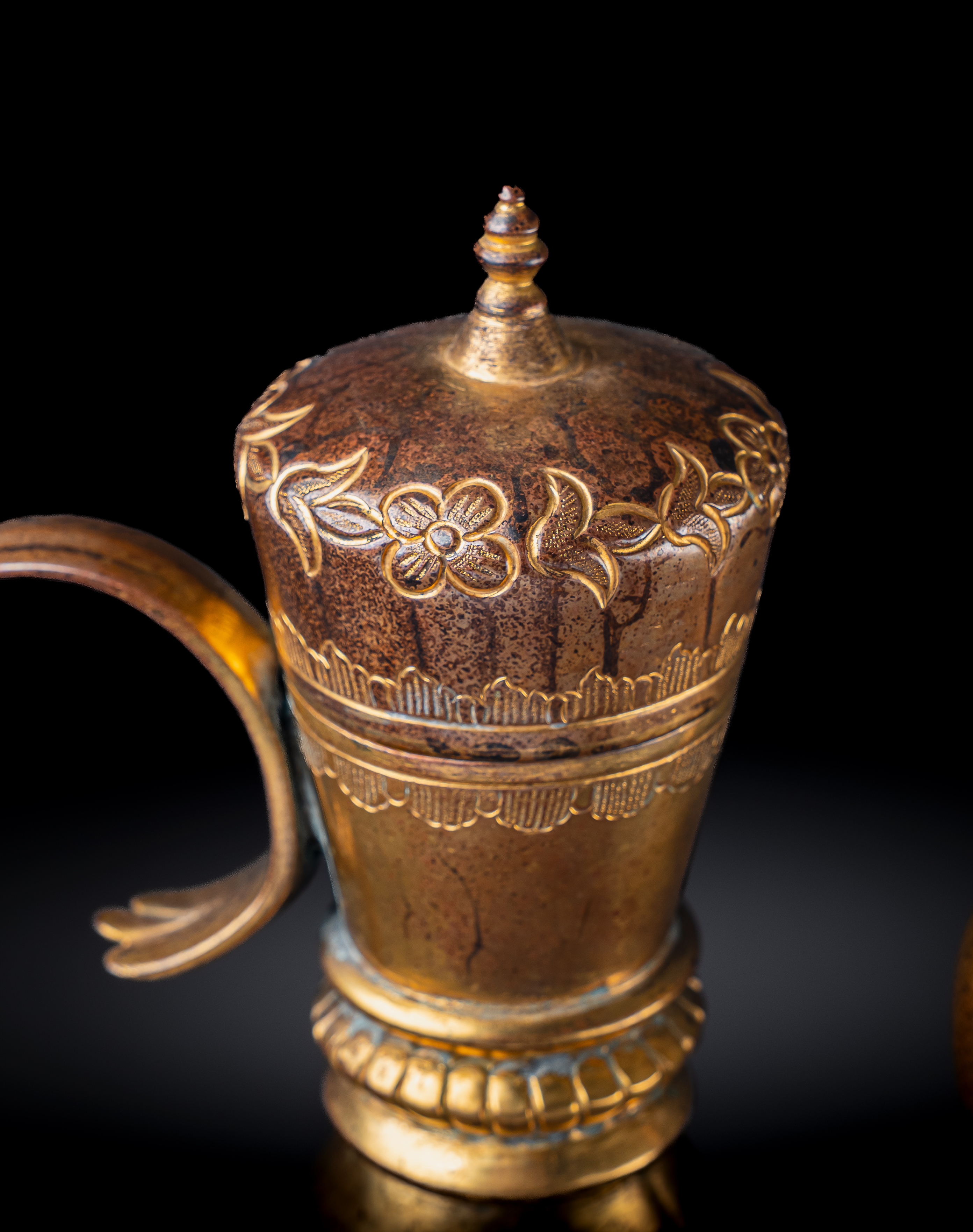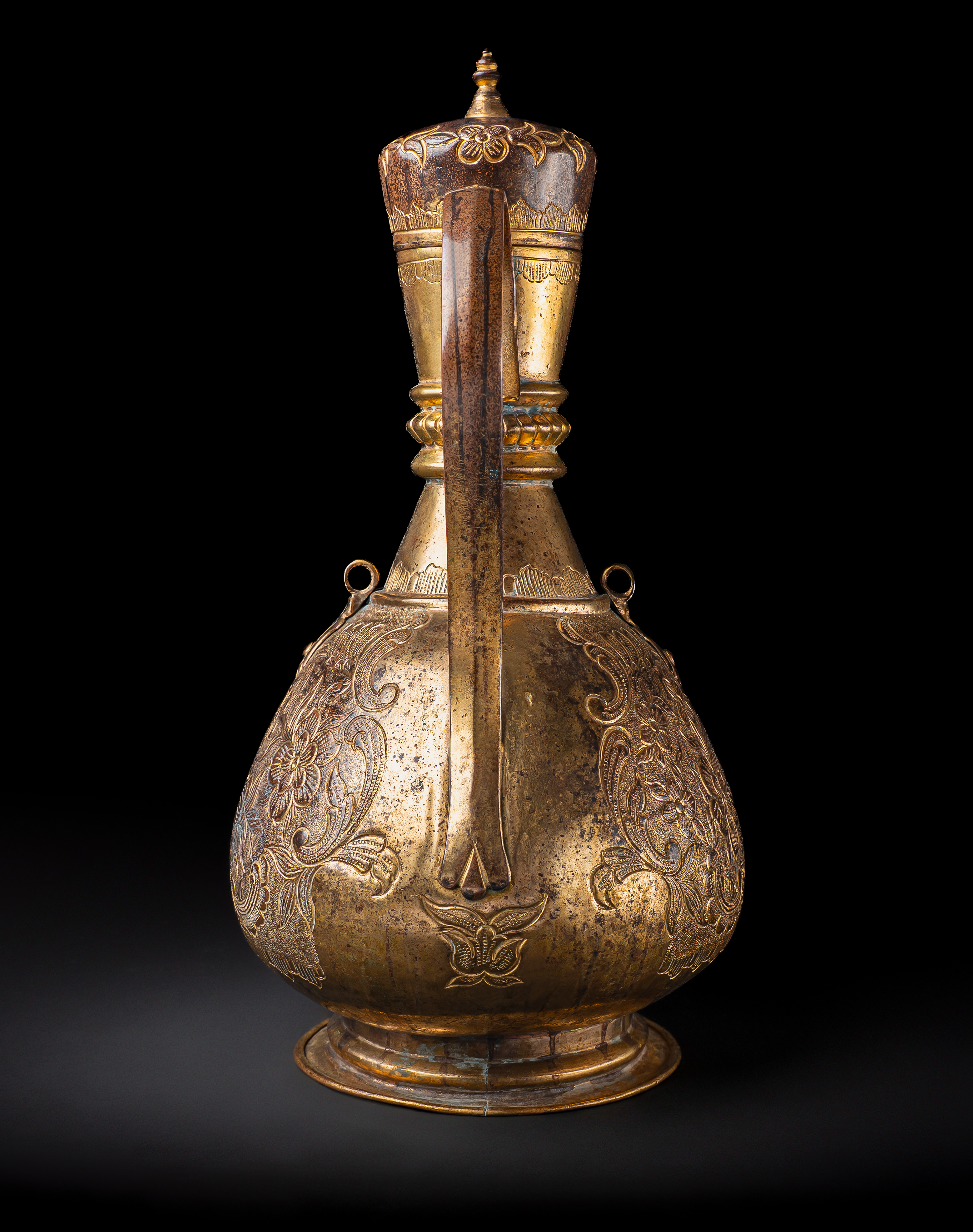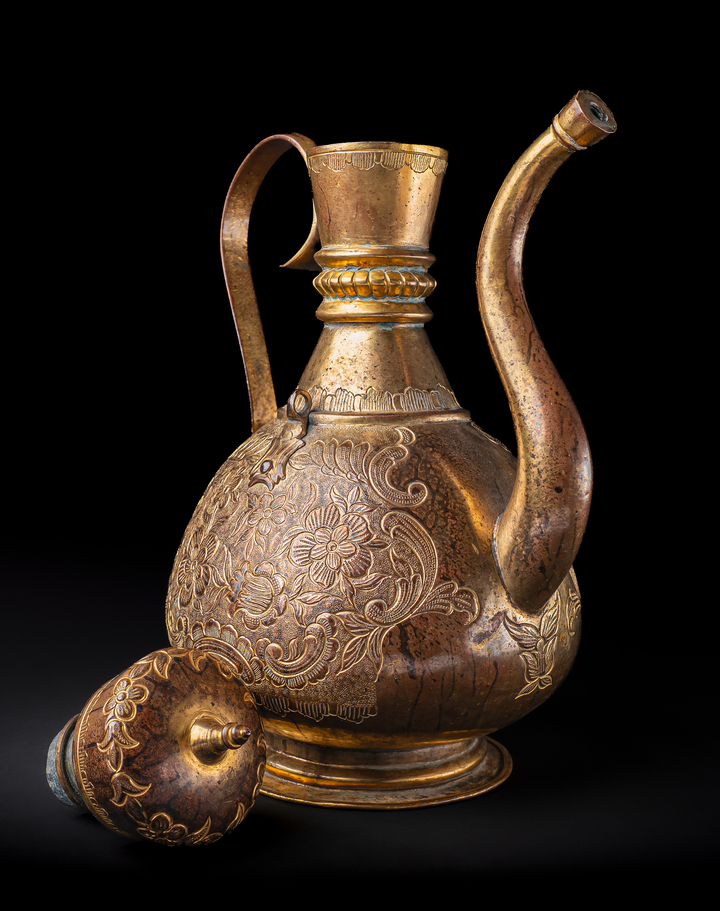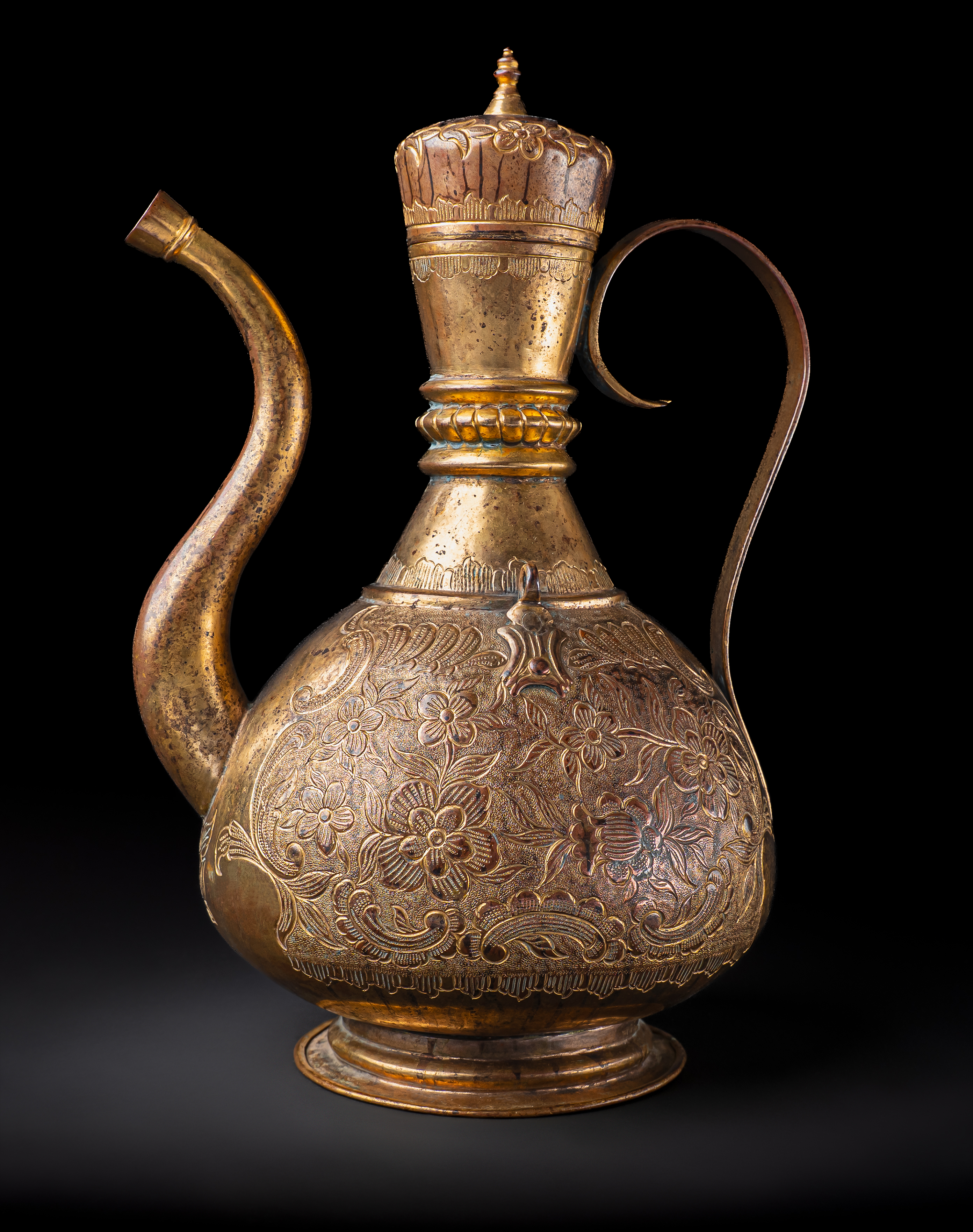 Of pear-shaped form on a spreading foot, with a tall tapering neck, domed lid, and curved spout, the ewer is finely worked in gilt copper (tombak). The body is richly decorated with repoussé and chased floral sprays of scrolling blossoms and foliage, continuing across the shoulder and lid. The tall neck is encircled with beaded bands and further floral motifs, while the domed cover is surmounted by a finial.