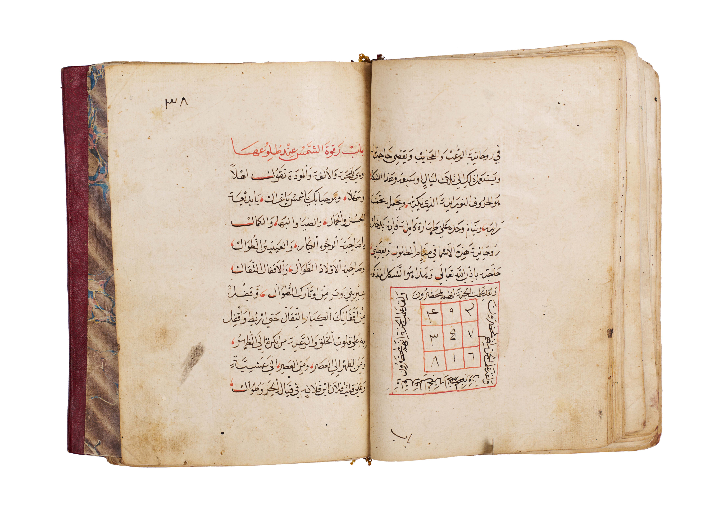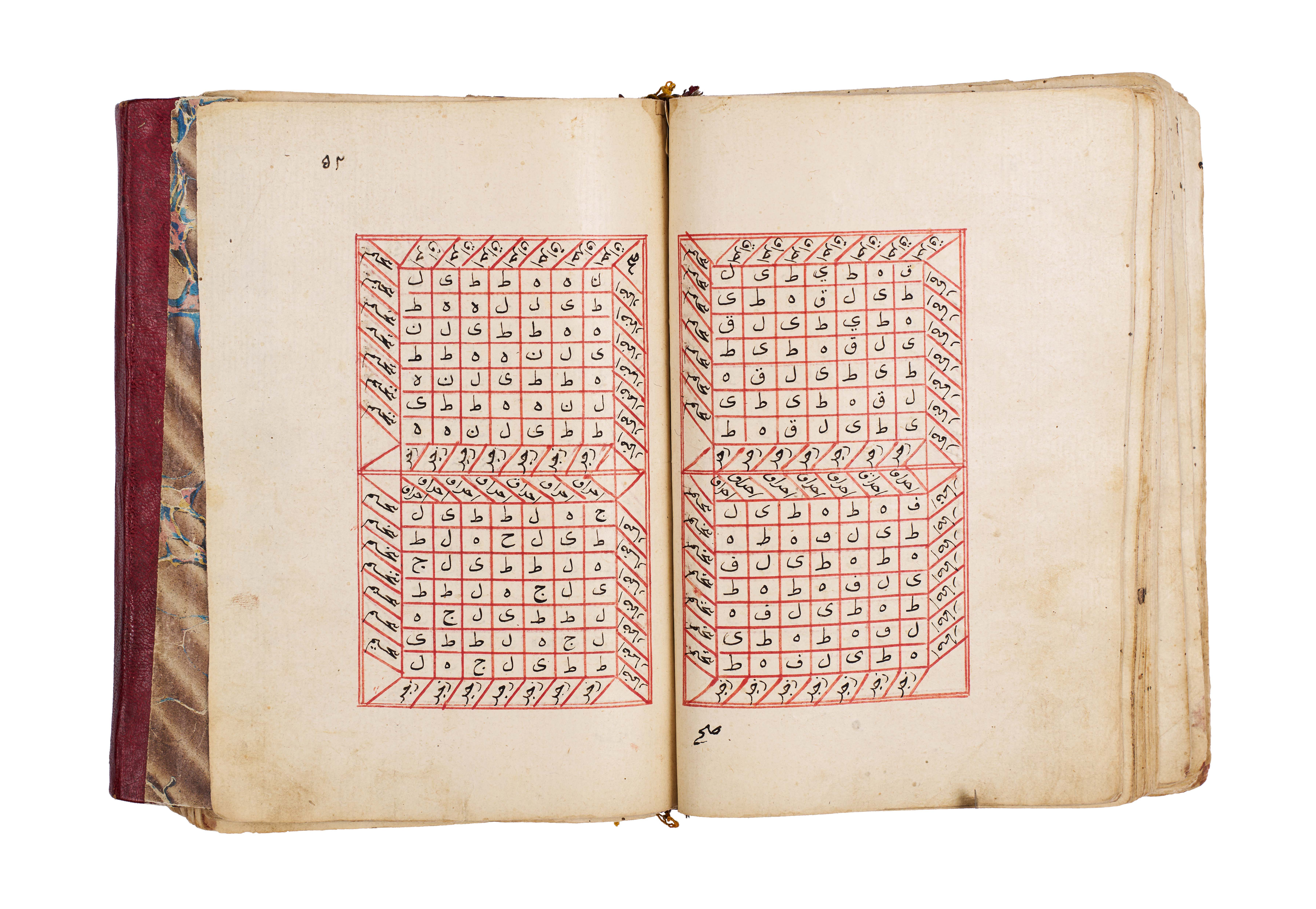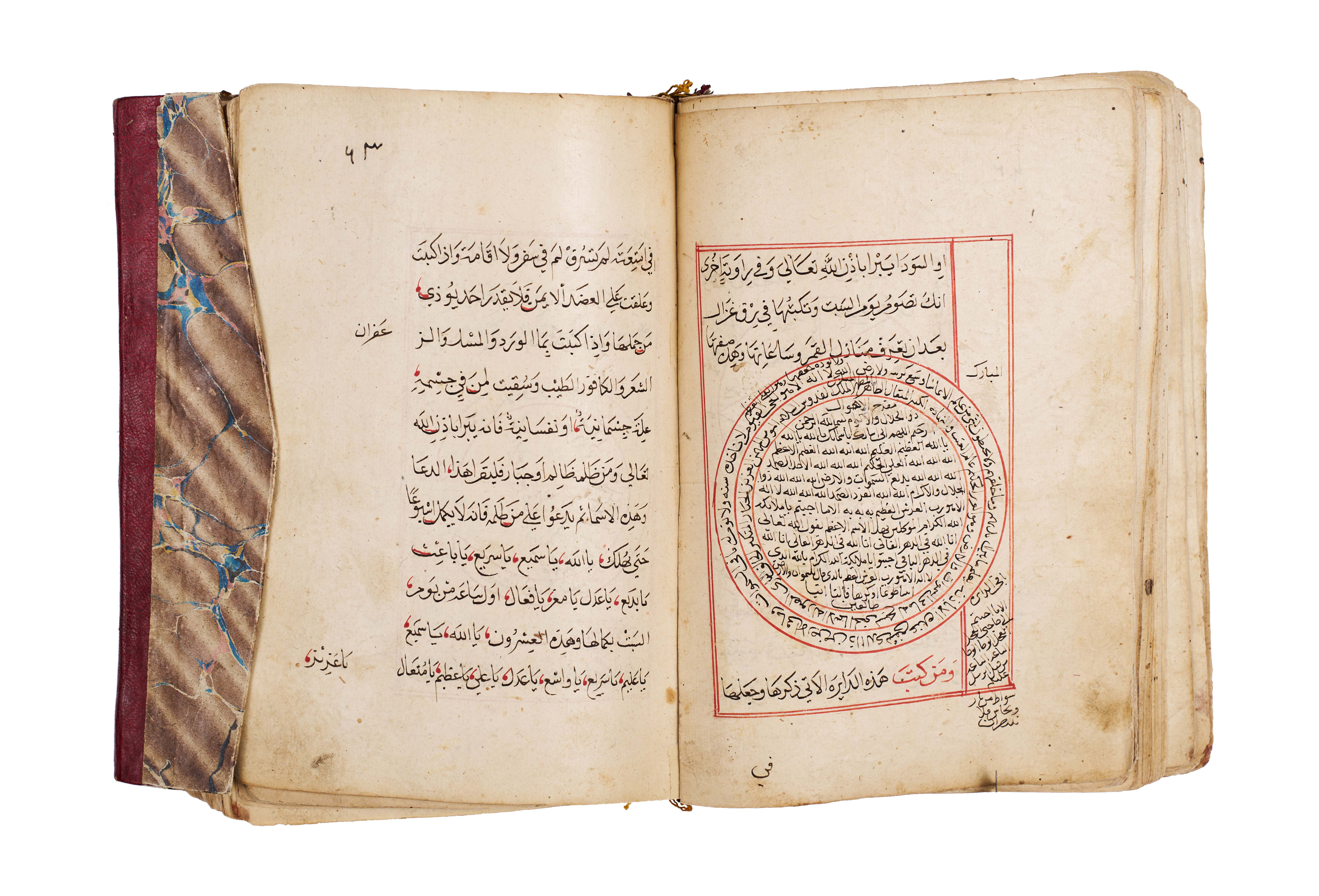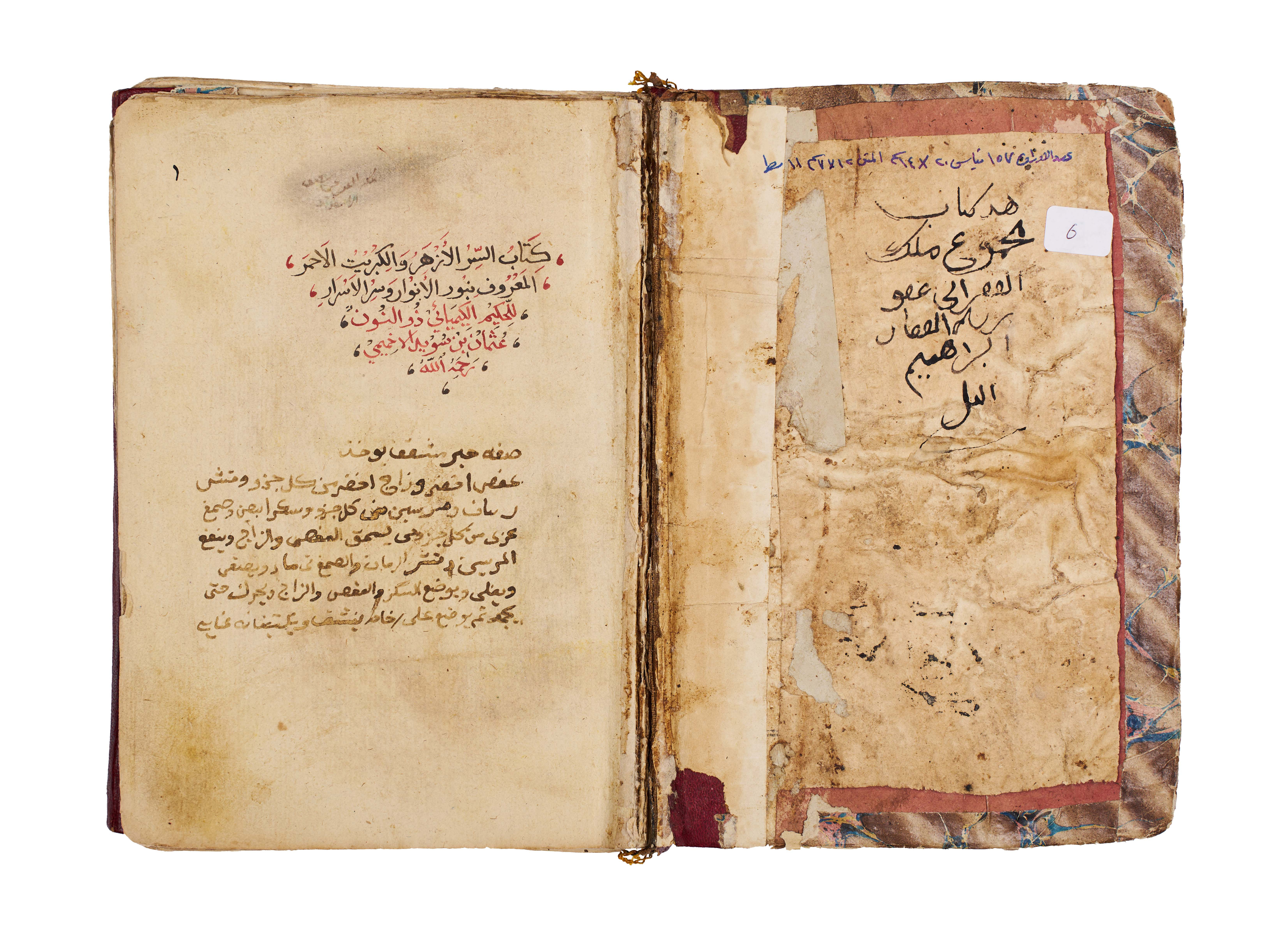 Arabic manuscript on alchemy and mystical philosophy. This work, attributed to the alchemical sage Dhul-Nun Uthman bin Suwayd al-Akhimi, is known as The Radiant Secret and the Red Sulfur, also referred to as Light of Lights and Secret of Secrets. It explores hidden sciences, metaphysical wisdom, and the transformative art of alchemy, blending esoteric knowledge with mystical thought. The manuscript is written in Arabic, with black and red ink throughout, the red rubrication highlighting key words, divine names, and mystical formulae. Several folios contain striking circular diagrams, talismanic tables, and geometric arrangements, integral to the manuscript’s esoteric purpose. The binding features marbled paper boards with a leather spine and corners.