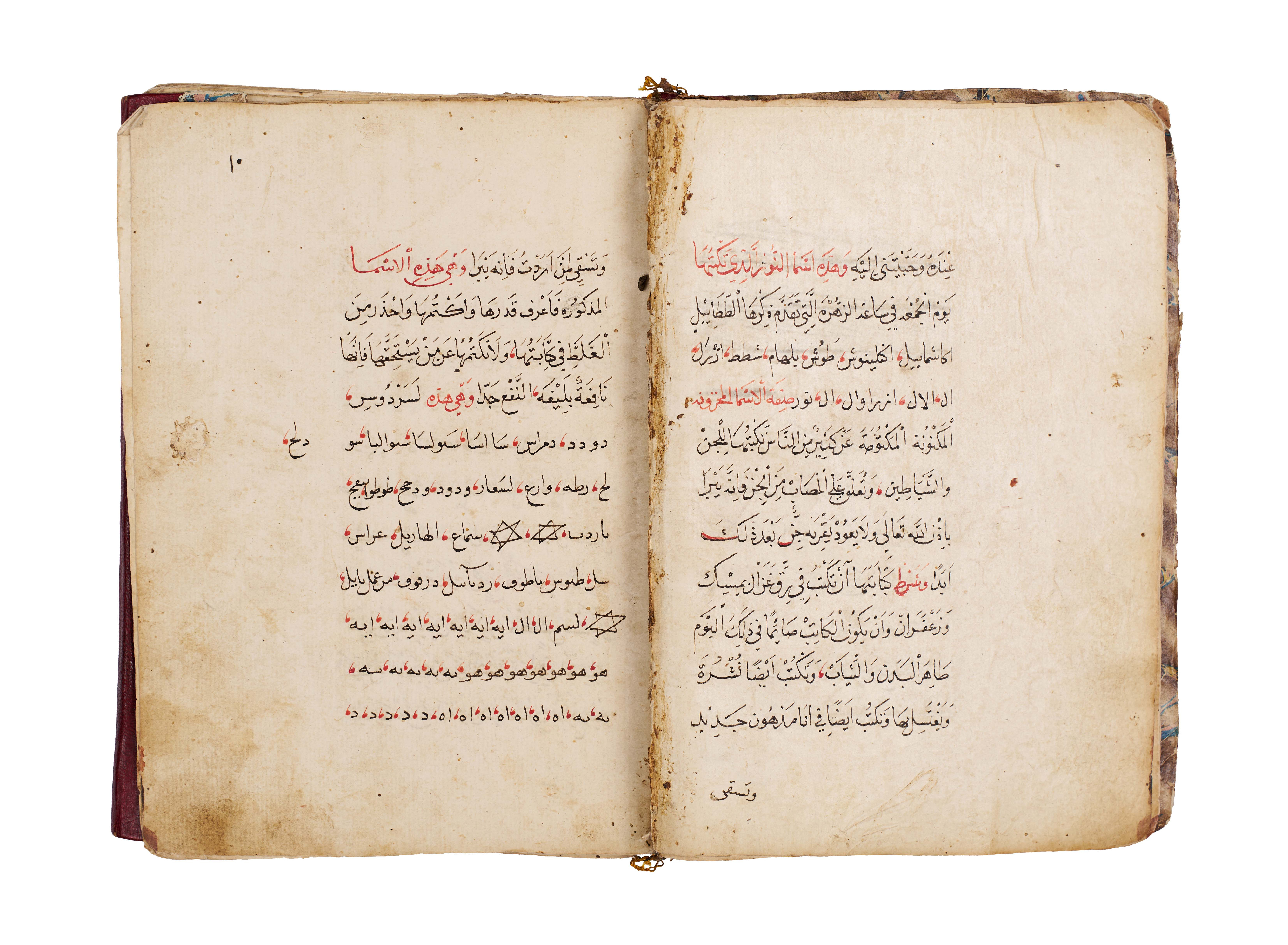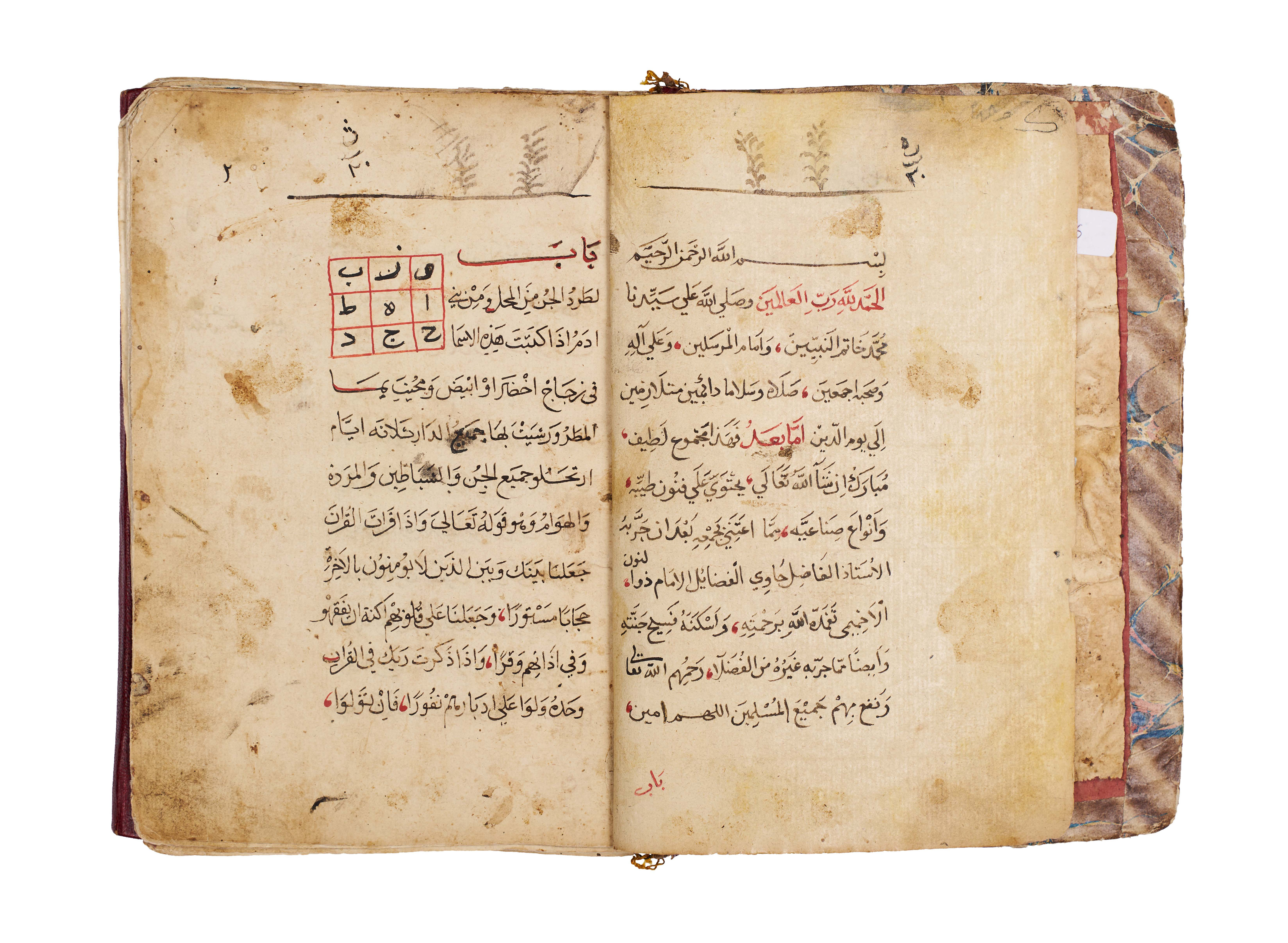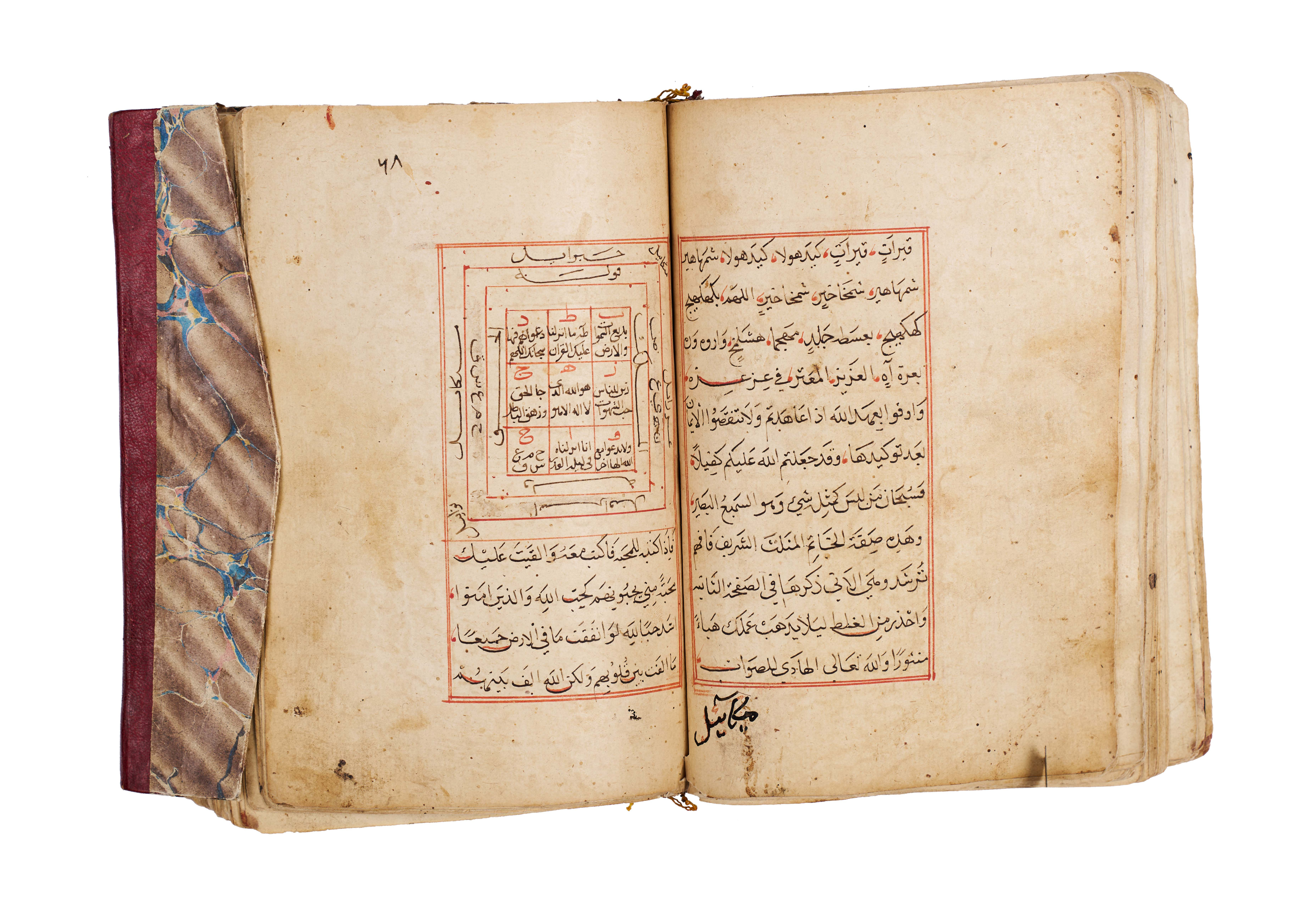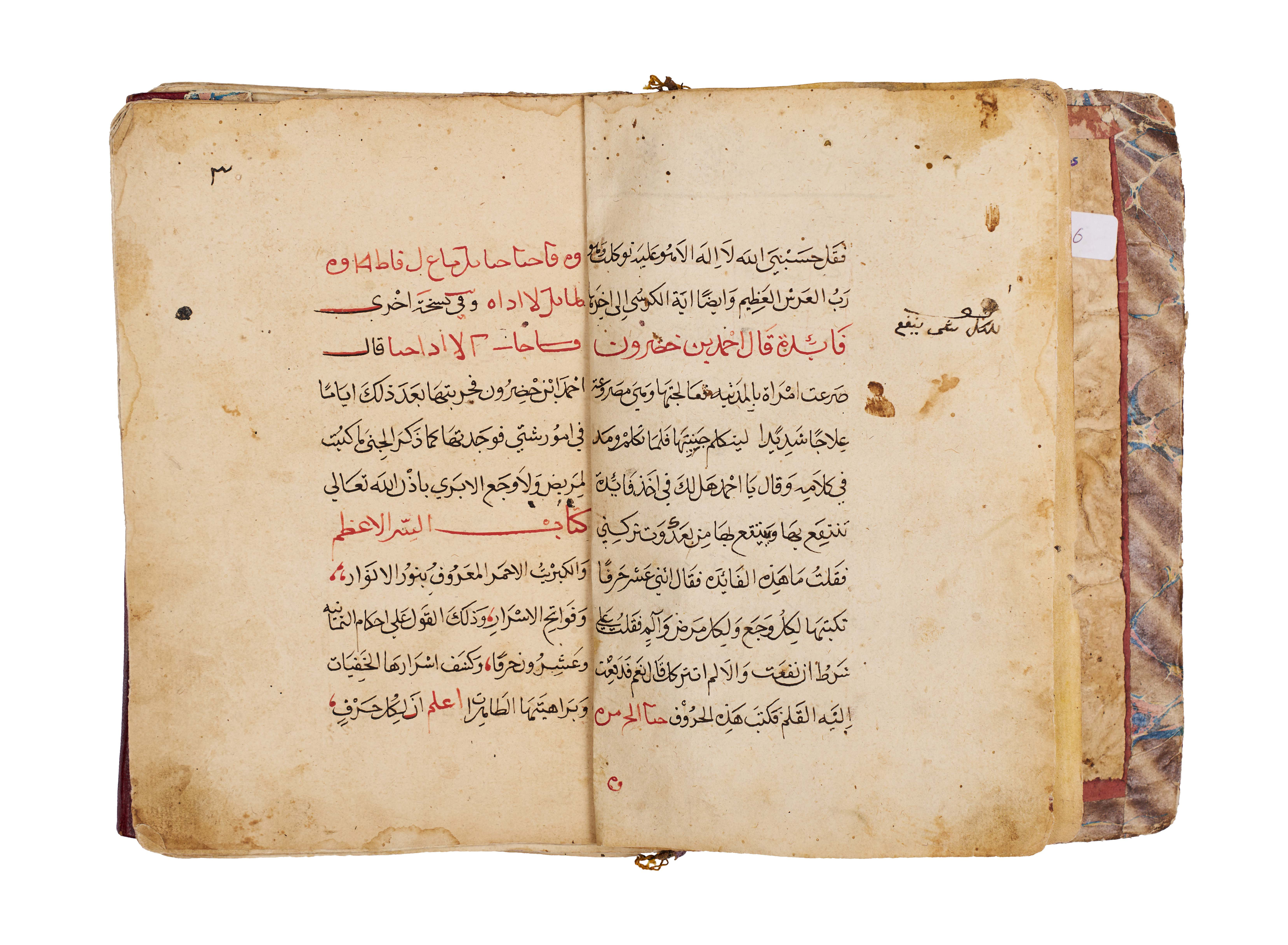 Arabic manuscript on alchemy and mystical philosophy. This work, attributed to the alchemical sage Dhul-Nun Uthman bin Suwayd al-Akhimi, is known as The Radiant Secret and the Red Sulfur, also referred to as Light of Lights and Secret of Secrets. It explores hidden sciences, metaphysical wisdom, and the transformative art of alchemy, blending esoteric knowledge with mystical thought. The manuscript is written in Arabic, with black and red ink throughout, the red rubrication highlighting key words, divine names, and mystical formulae. Several folios contain striking circular diagrams, talismanic tables, and geometric arrangements, integral to the manuscript’s esoteric purpose. The binding features marbled paper boards with a leather spine and corners.