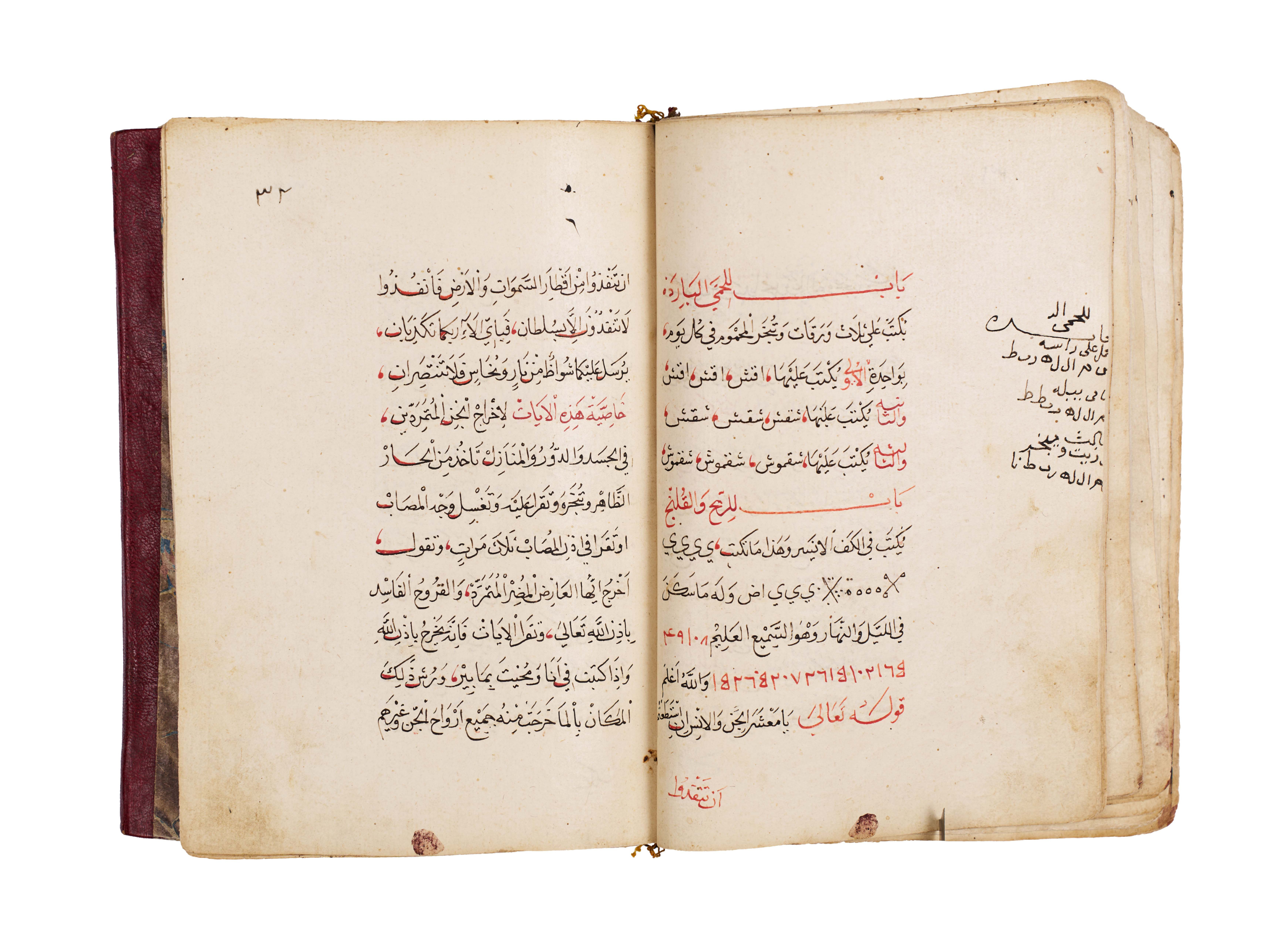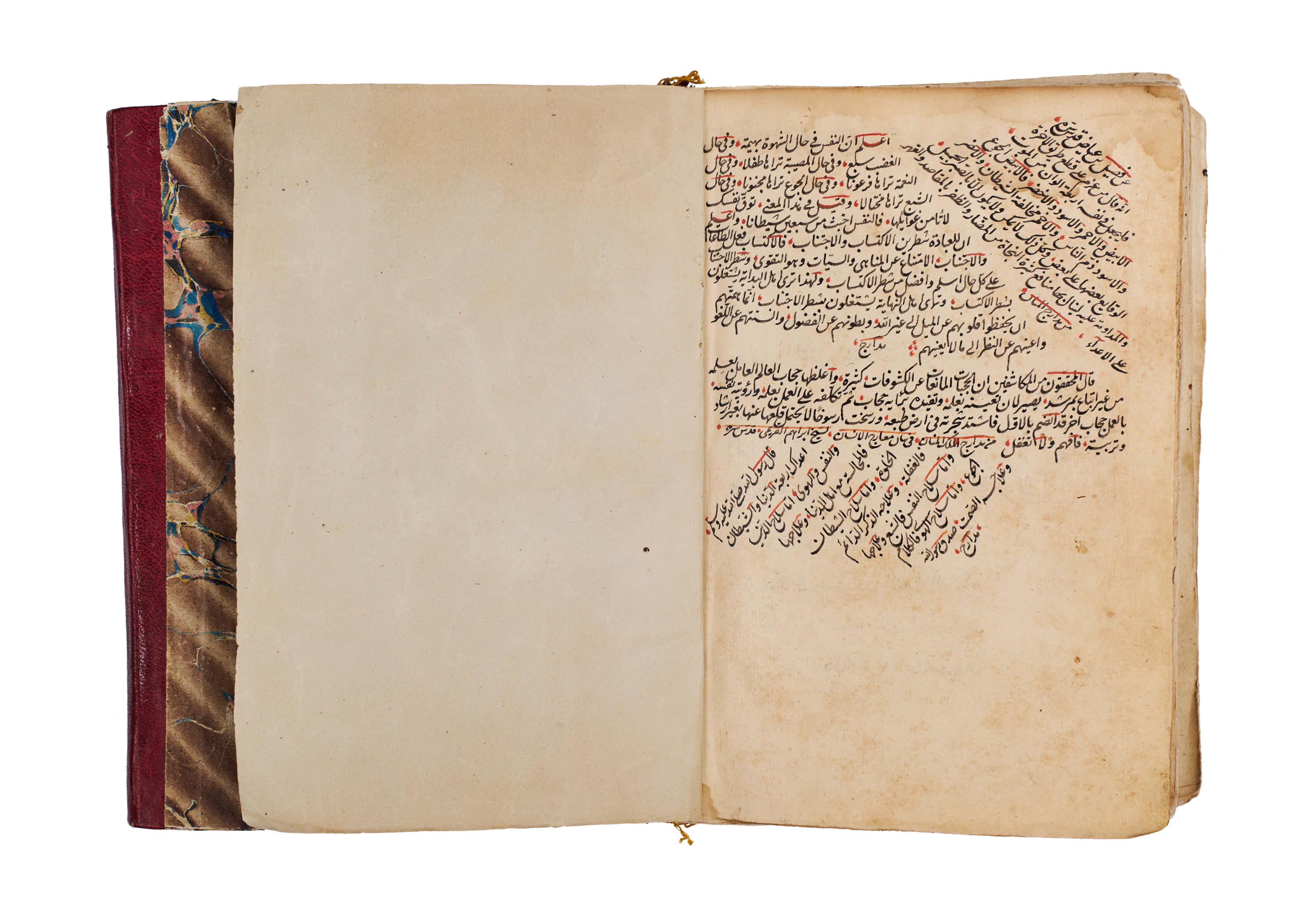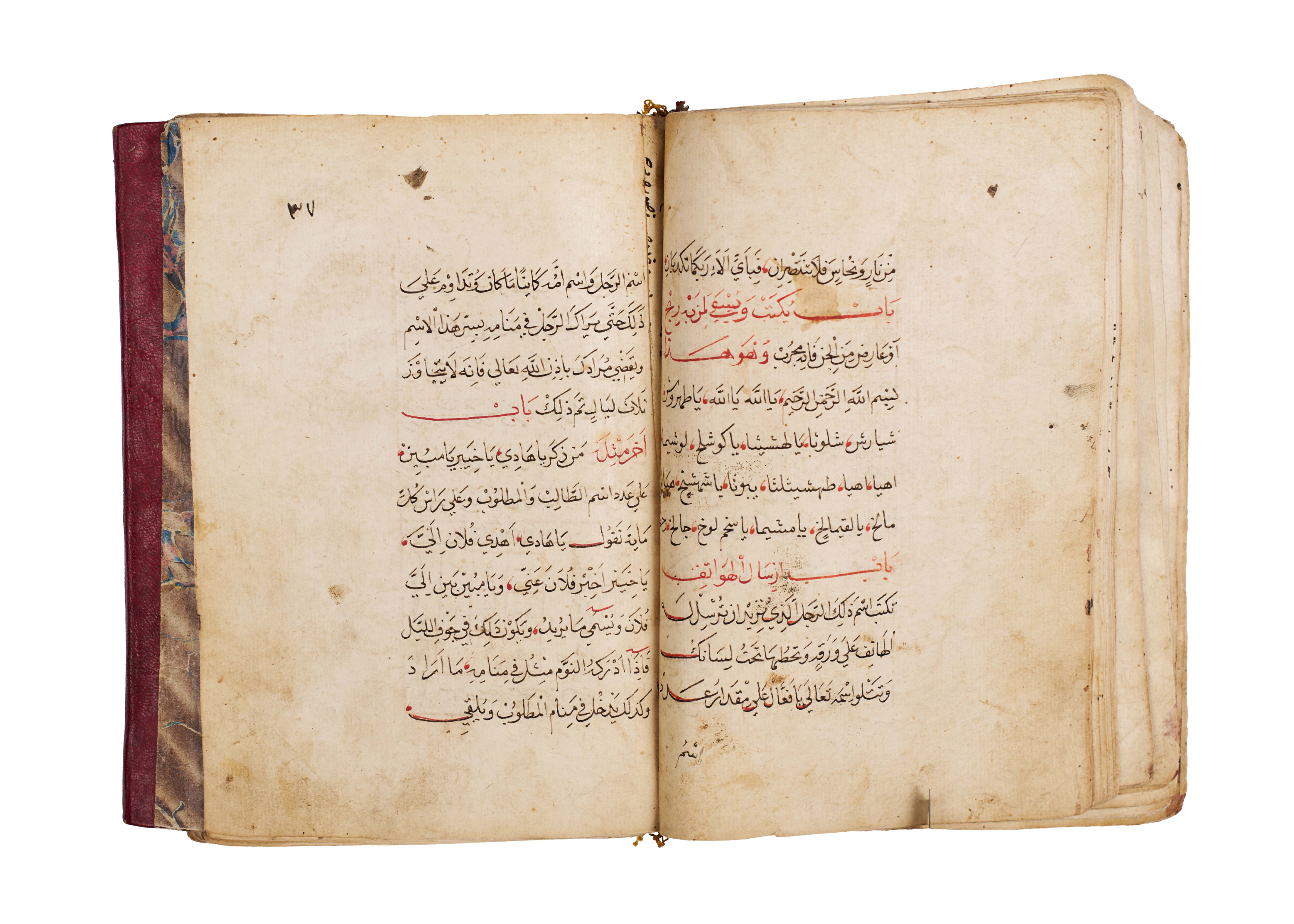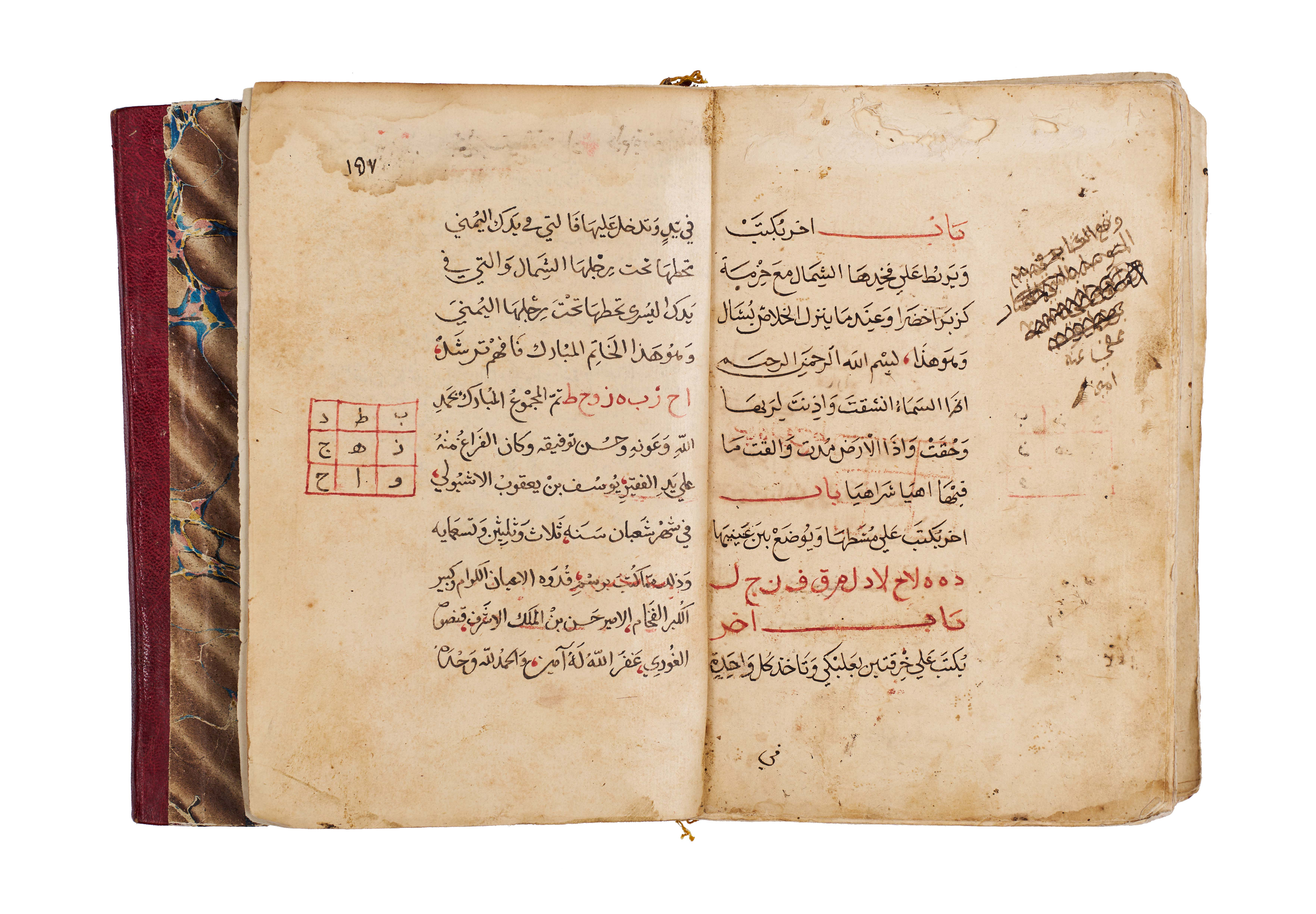 Arabic manuscript on alchemy and mystical philosophy. This work, attributed to the alchemical sage Dhul-Nun Uthman bin Suwayd al-Akhimi, is known as The Radiant Secret and the Red Sulfur, also referred to as Light of Lights and Secret of Secrets. It explores hidden sciences, metaphysical wisdom, and the transformative art of alchemy, blending esoteric knowledge with mystical thought. The manuscript is written in Arabic, with black and red ink throughout, the red rubrication highlighting key words, divine names, and mystical formulae. Several folios contain striking circular diagrams, talismanic tables, and geometric arrangements, integral to the manuscript’s esoteric purpose. The binding features marbled paper boards with a leather spine and corners.