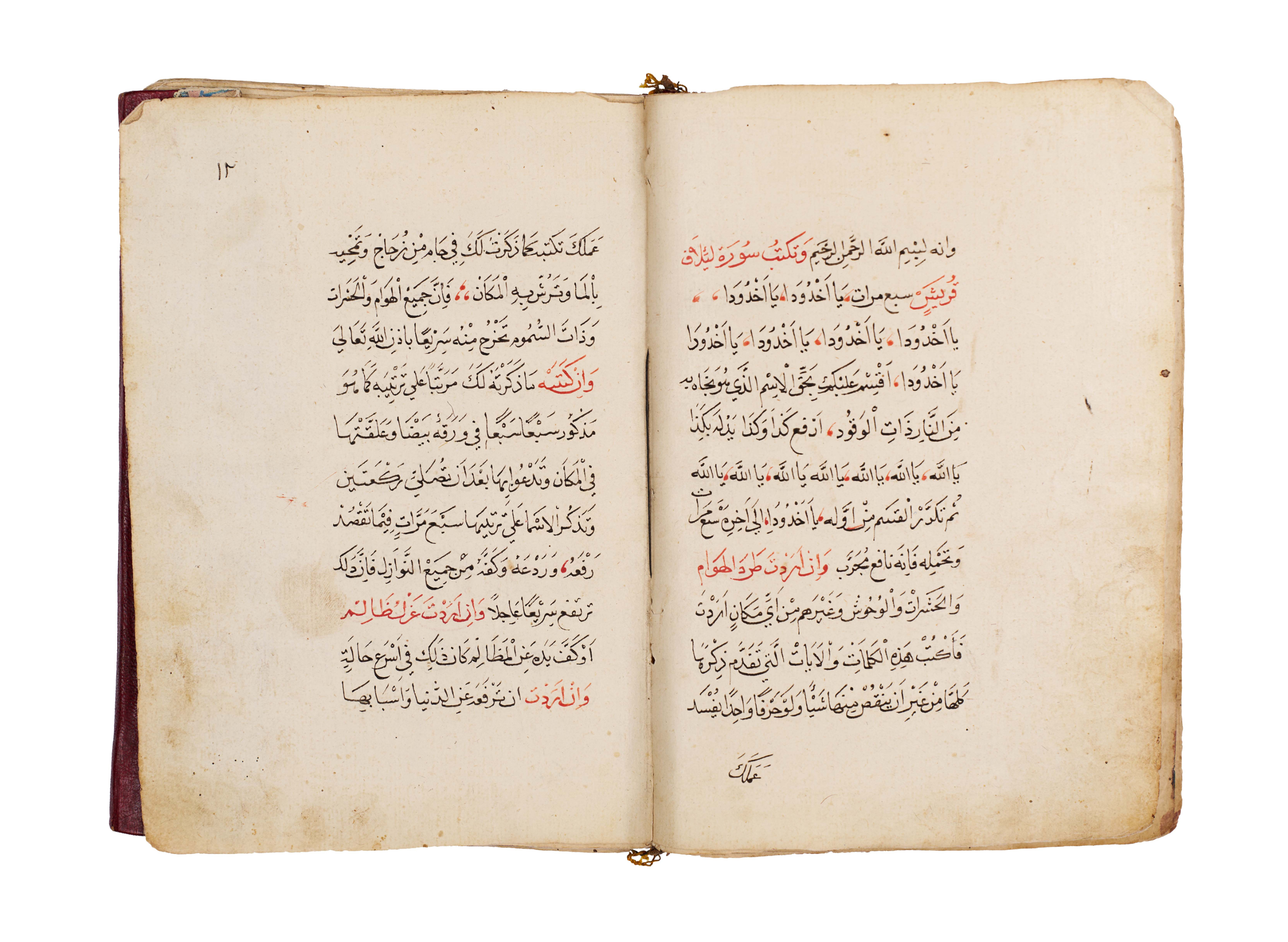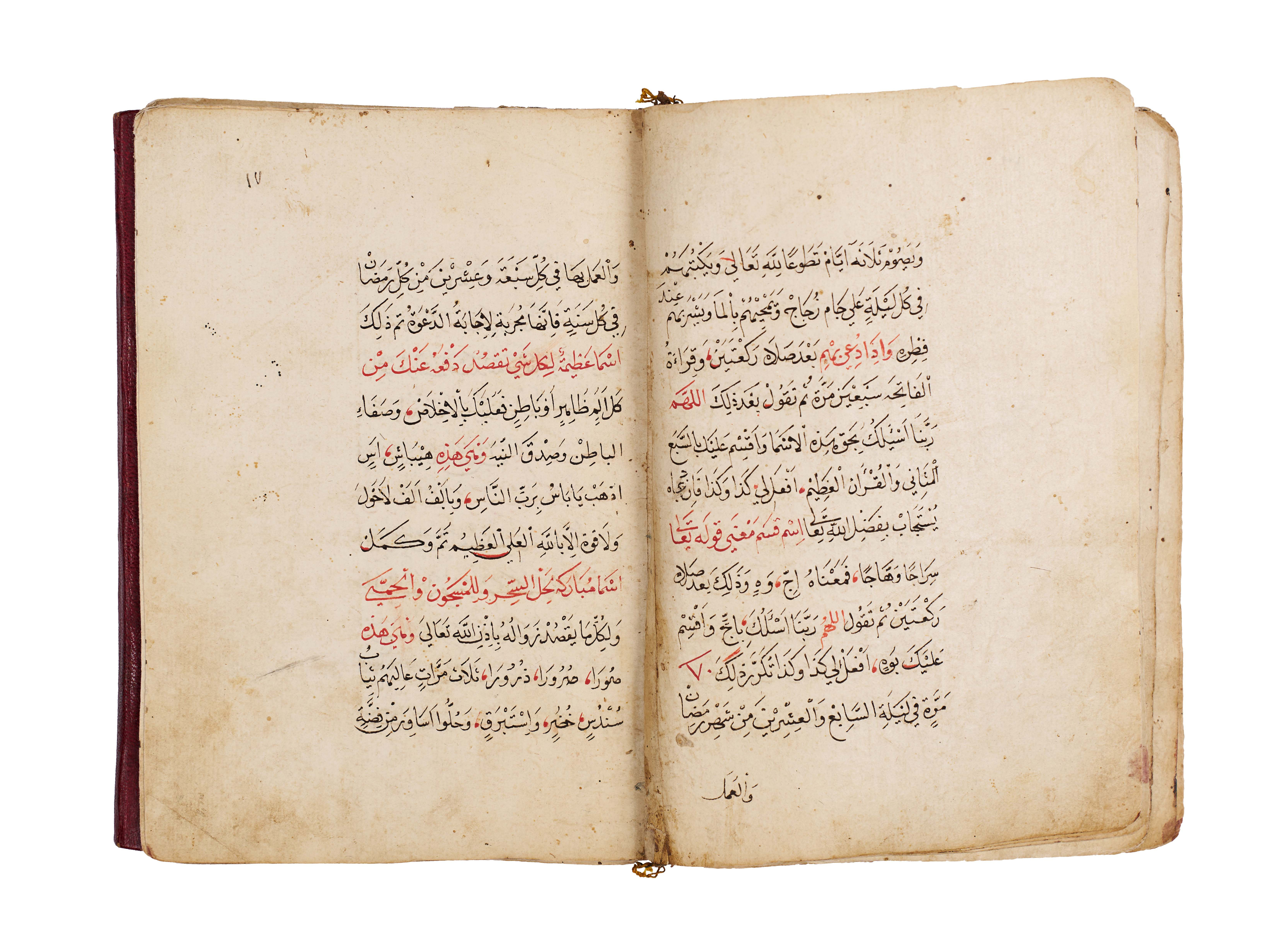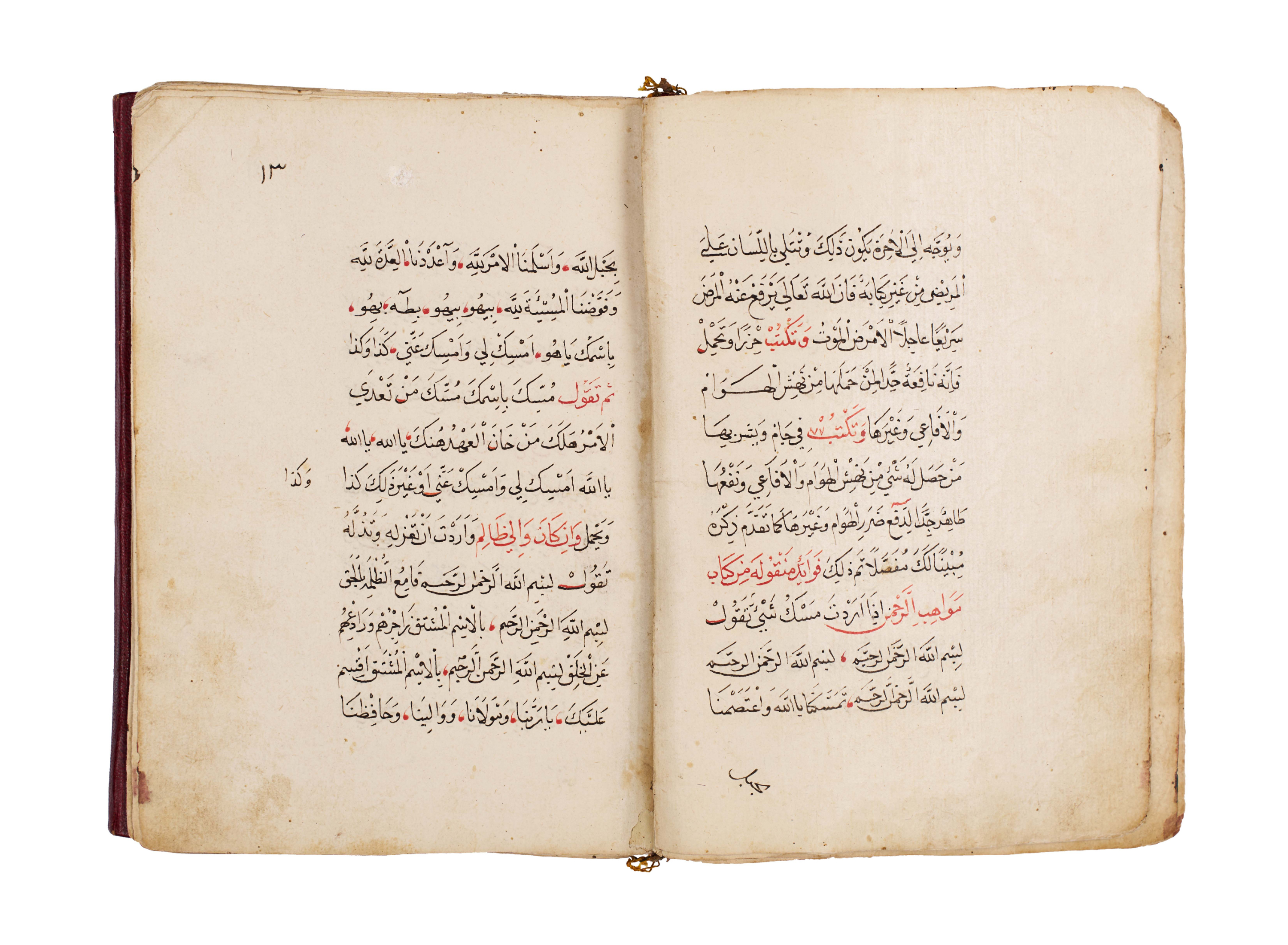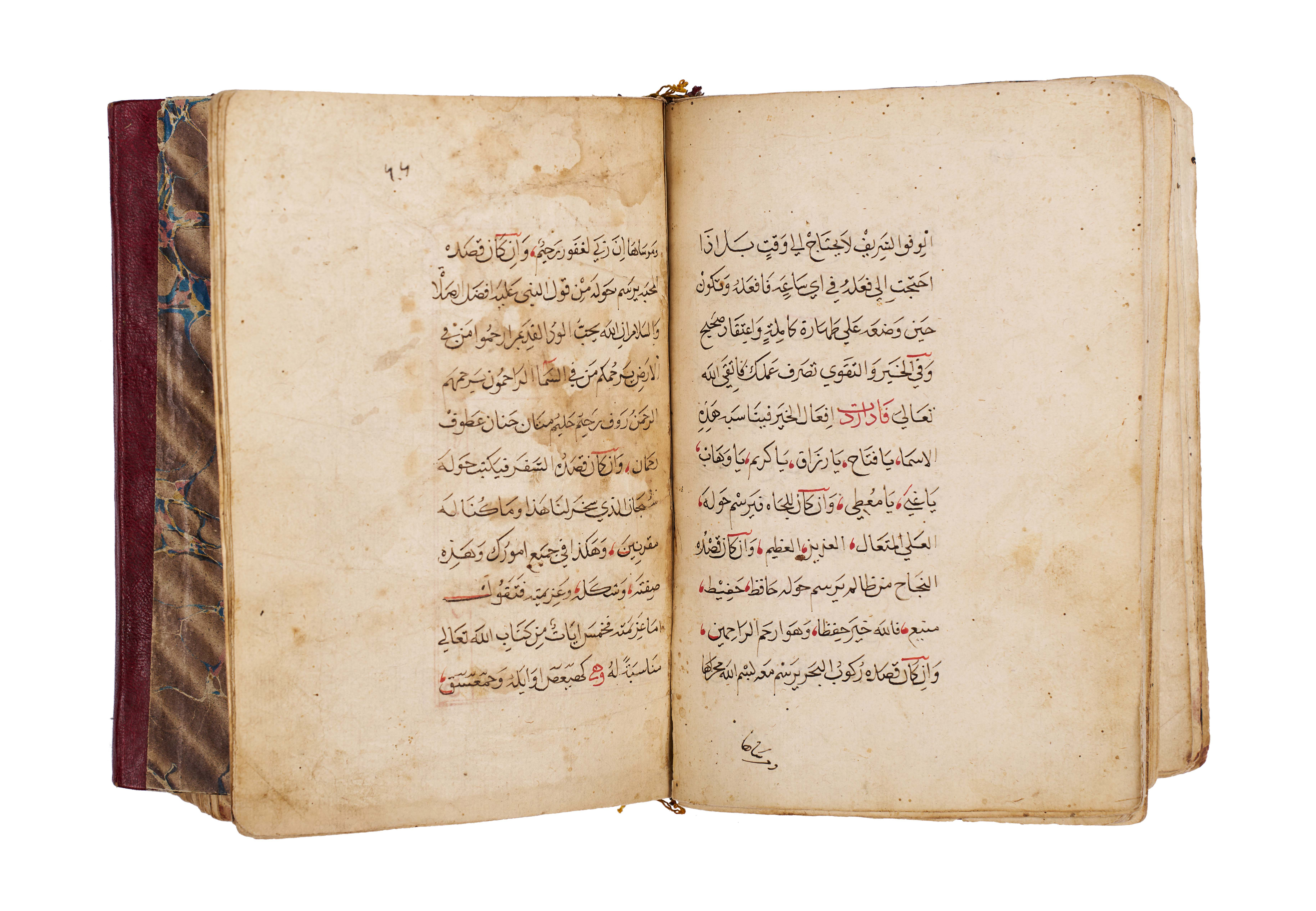 Arabic manuscript on alchemy and mystical philosophy. This work, attributed to the alchemical sage Dhul-Nun Uthman bin Suwayd al-Akhimi, is known as The Radiant Secret and the Red Sulfur, also referred to as Light of Lights and Secret of Secrets. It explores hidden sciences, metaphysical wisdom, and the transformative art of alchemy, blending esoteric knowledge with mystical thought. The manuscript is written in Arabic, with black and red ink throughout, the red rubrication highlighting key words, divine names, and mystical formulae. Several folios contain striking circular diagrams, talismanic tables, and geometric arrangements, integral to the manuscript’s esoteric purpose. The binding features marbled paper boards with a leather spine and corners.