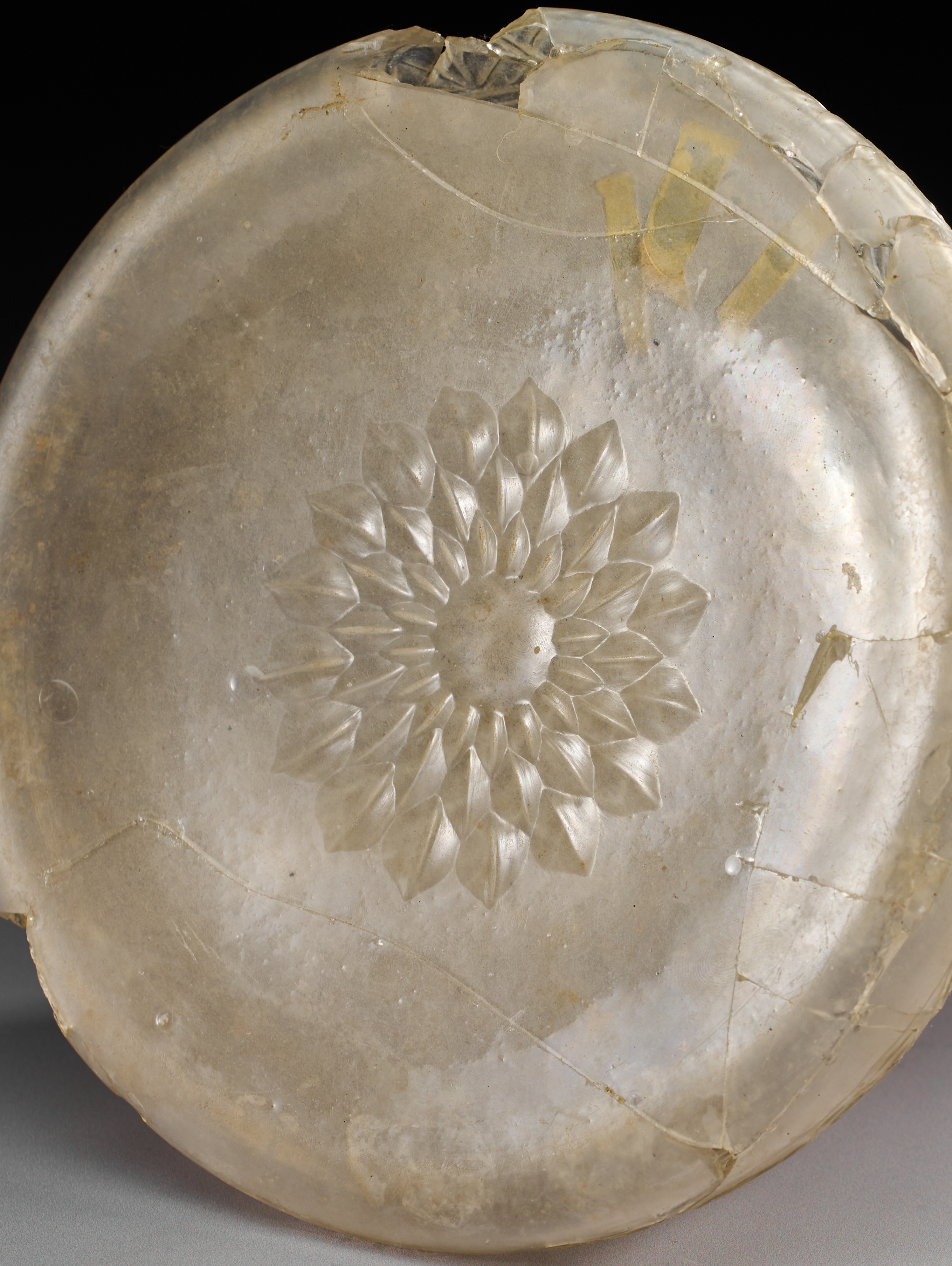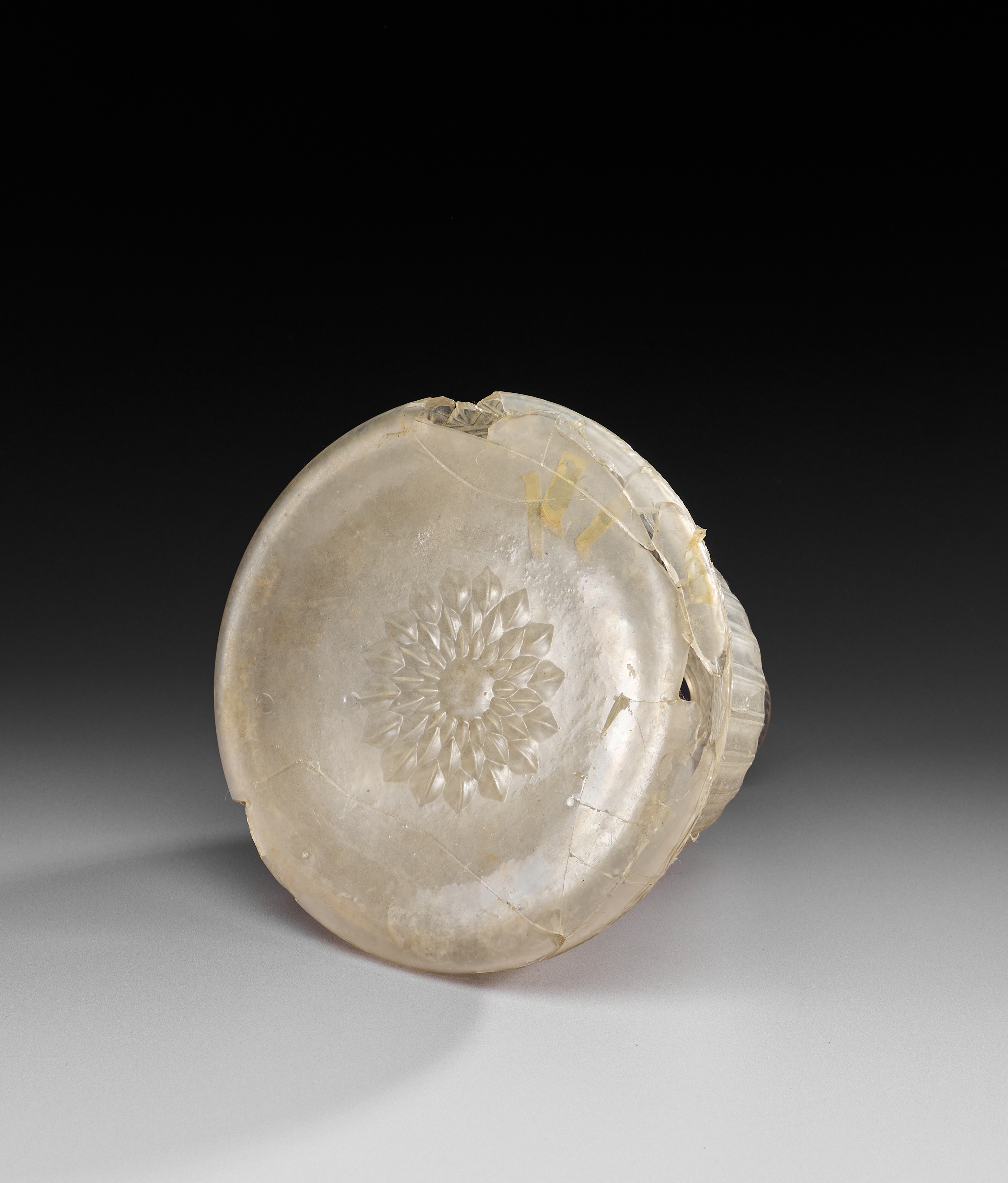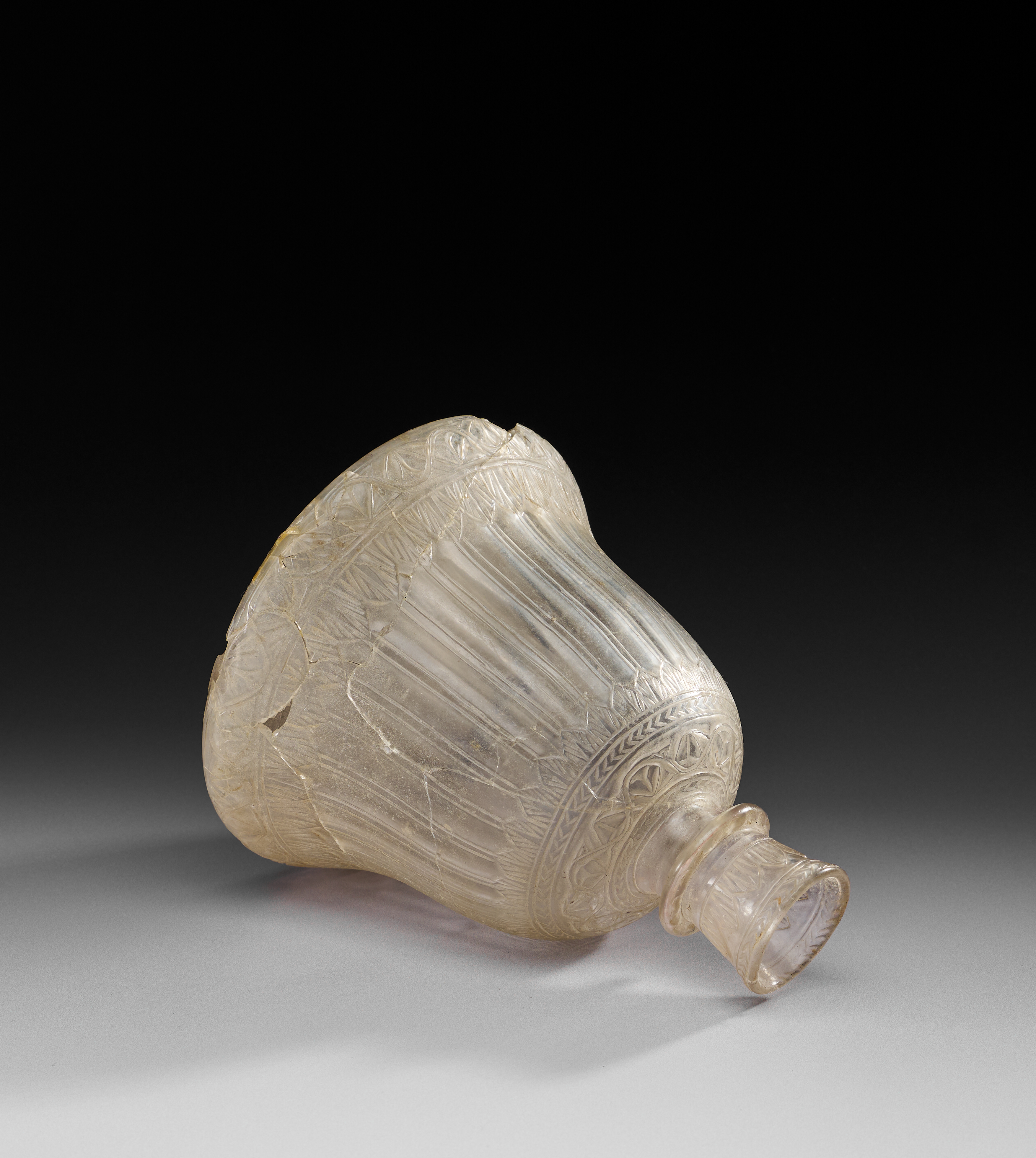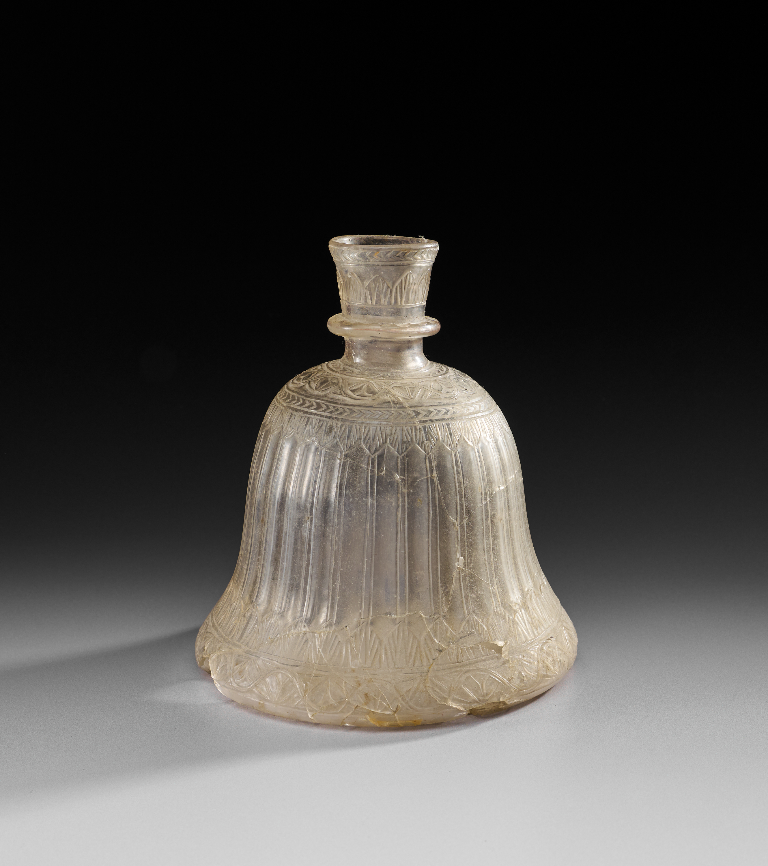 Of bell-shaped form rising to a short cylindrical neck with everted rim and applied collar, the body is carved from clear glass with vertical flutes descending towards a wide base. The upper shoulder is encircled with a band of leaf motifs, while the lower register is defined by a frieze of overlapping lotus petals. The underside is intricately carved with a radiating rosette, lending further refinement to the composition.