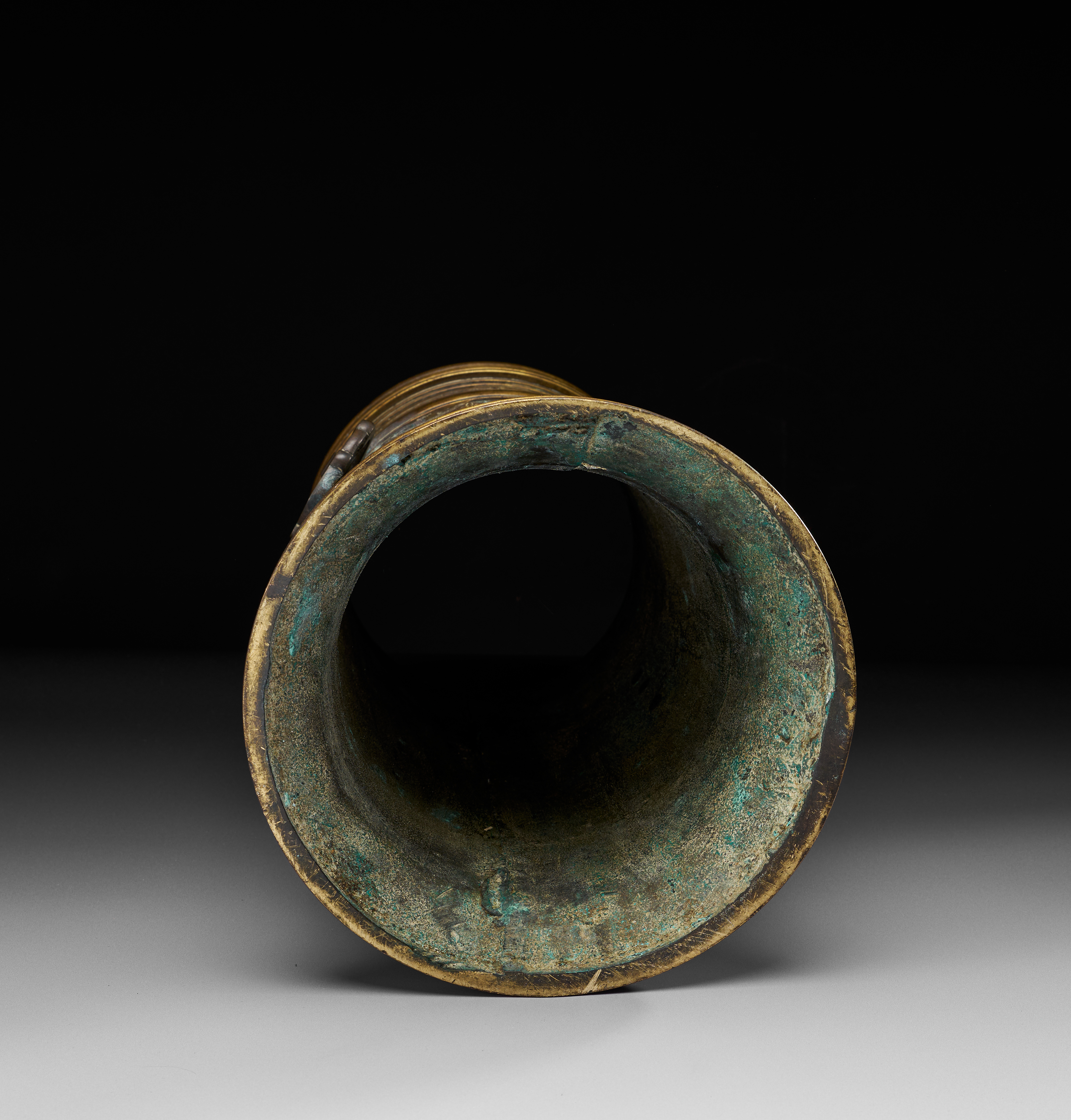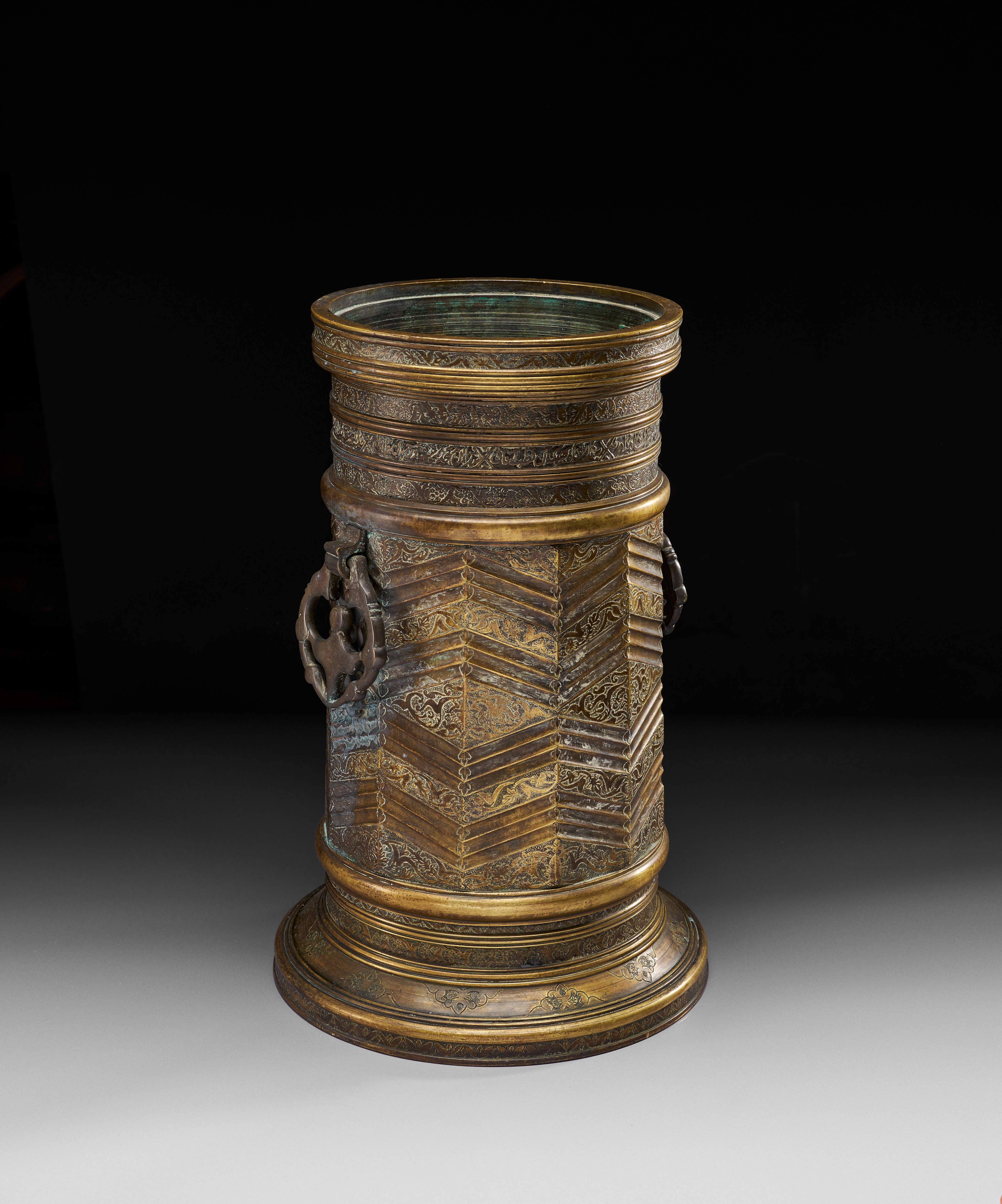 A LARGE ENGRAVED BRASS AND SILVER INLAID TORCH STAND, 19TH – 20TH CENTURY