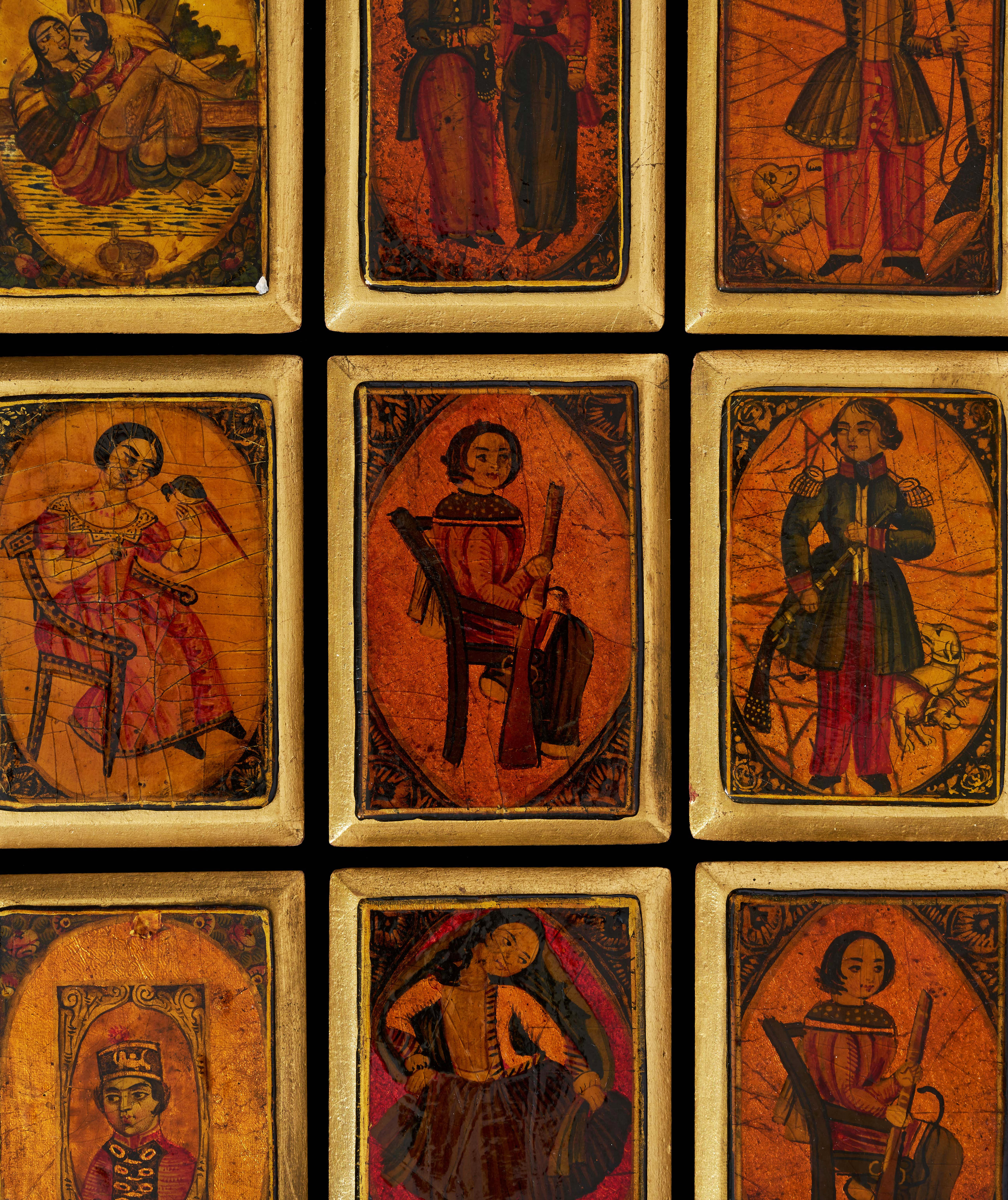 This fine group of Qajar lacquer playing cards, Persia, 18th–19th century, is executed in papier-mache and richly decorated with vivid pigments and gilt. Each rectangular card is painted with figures in courtly and theatrical poses, mythological beings, or musicians, all within ornamental borders.