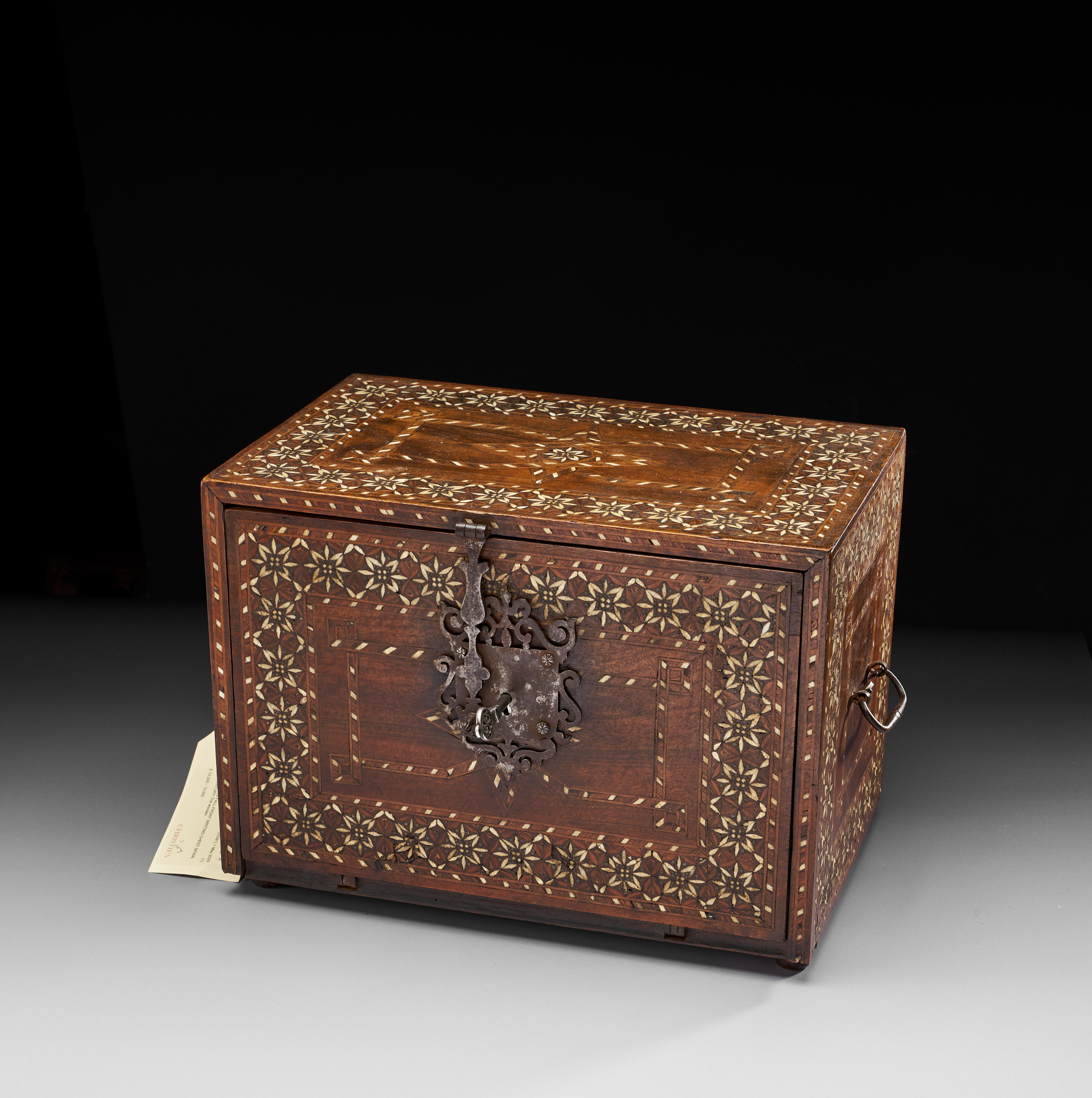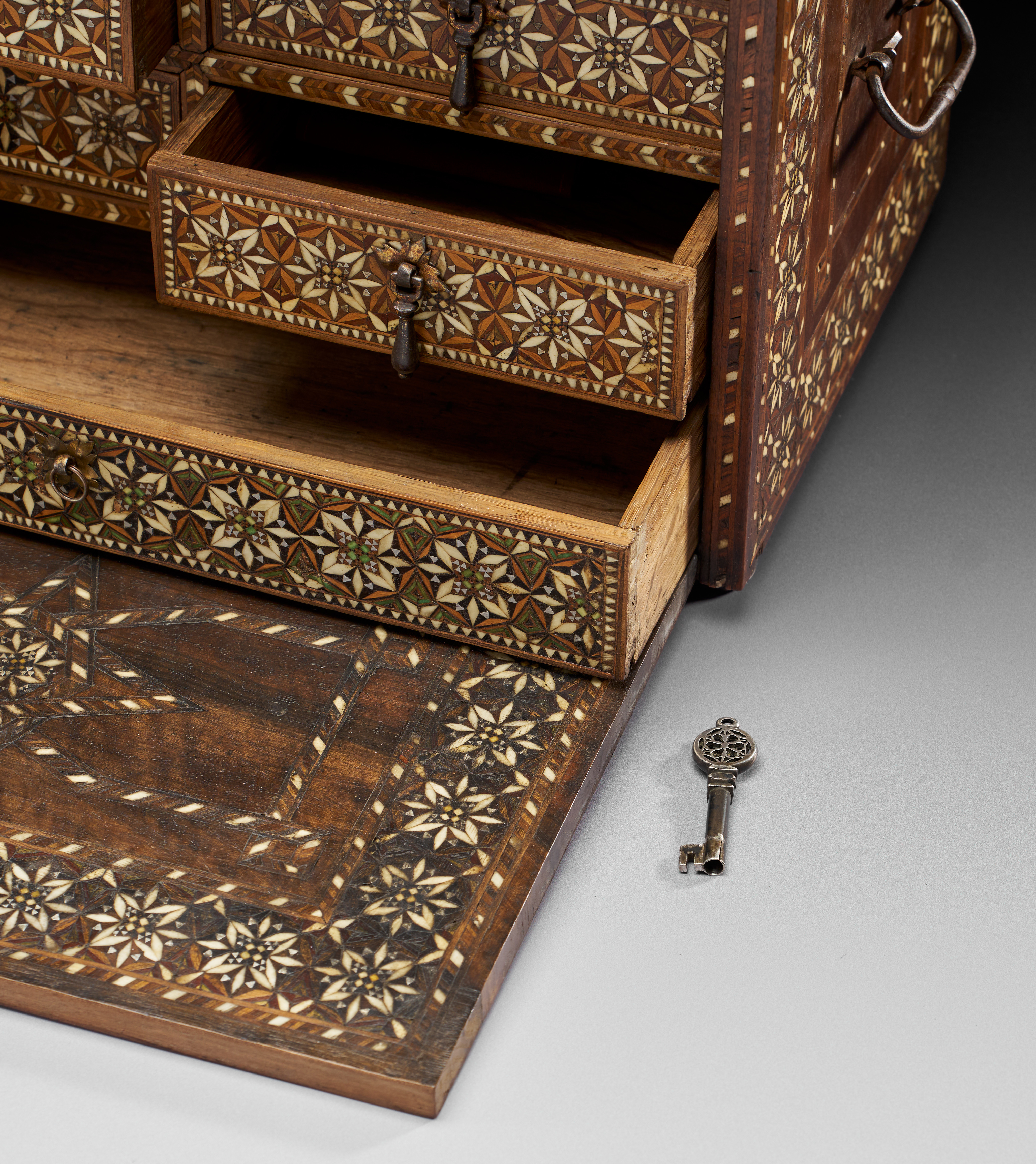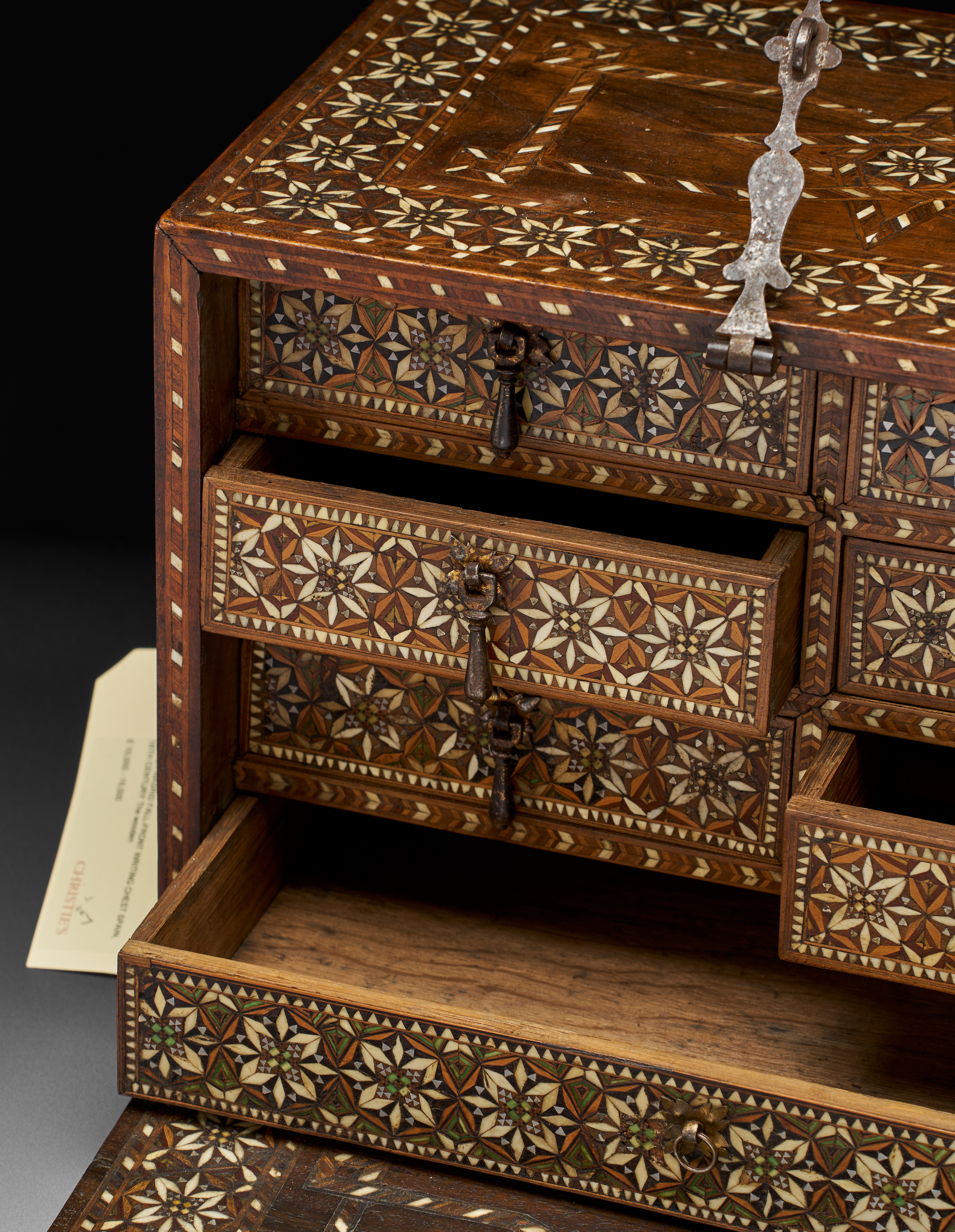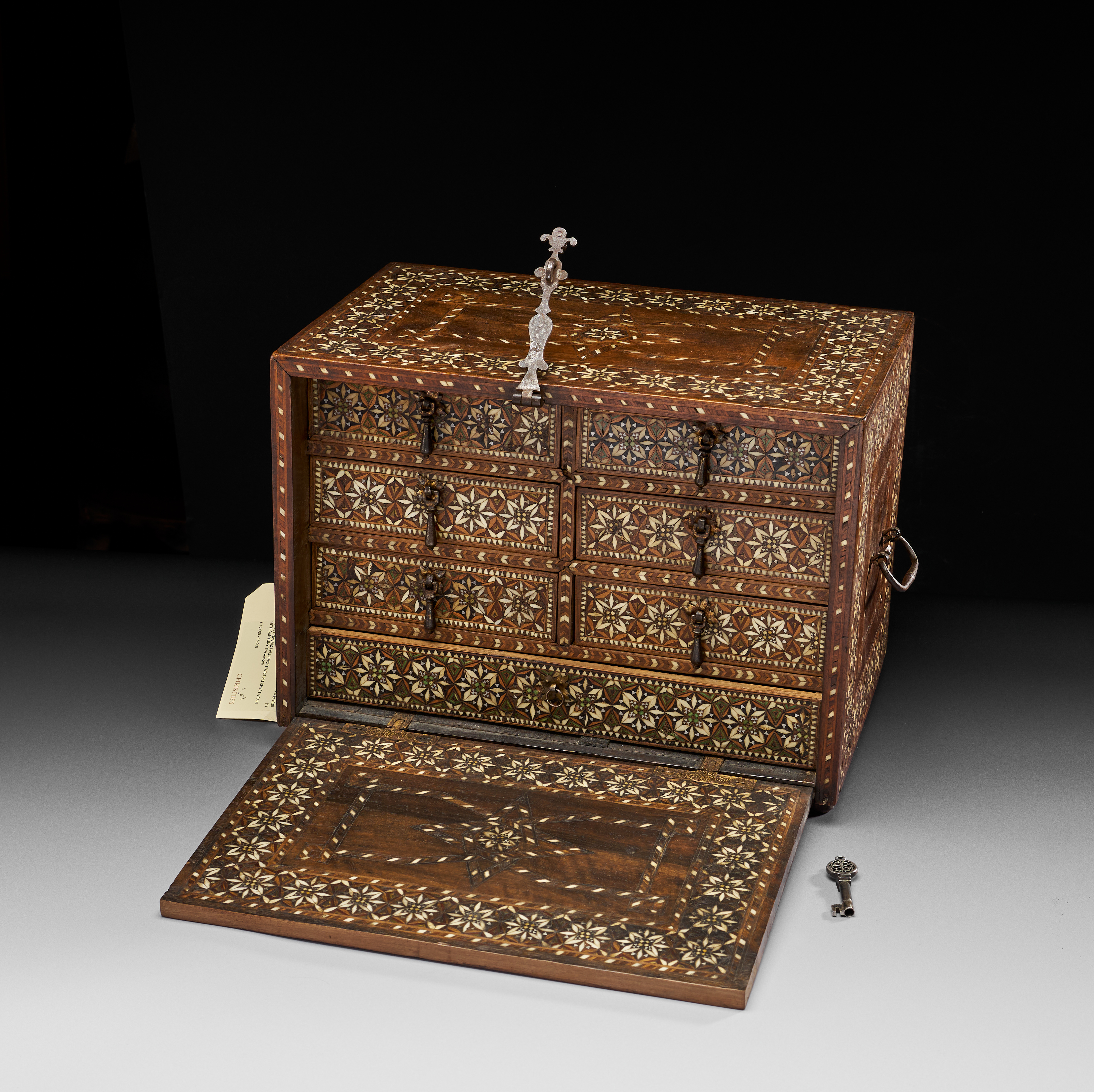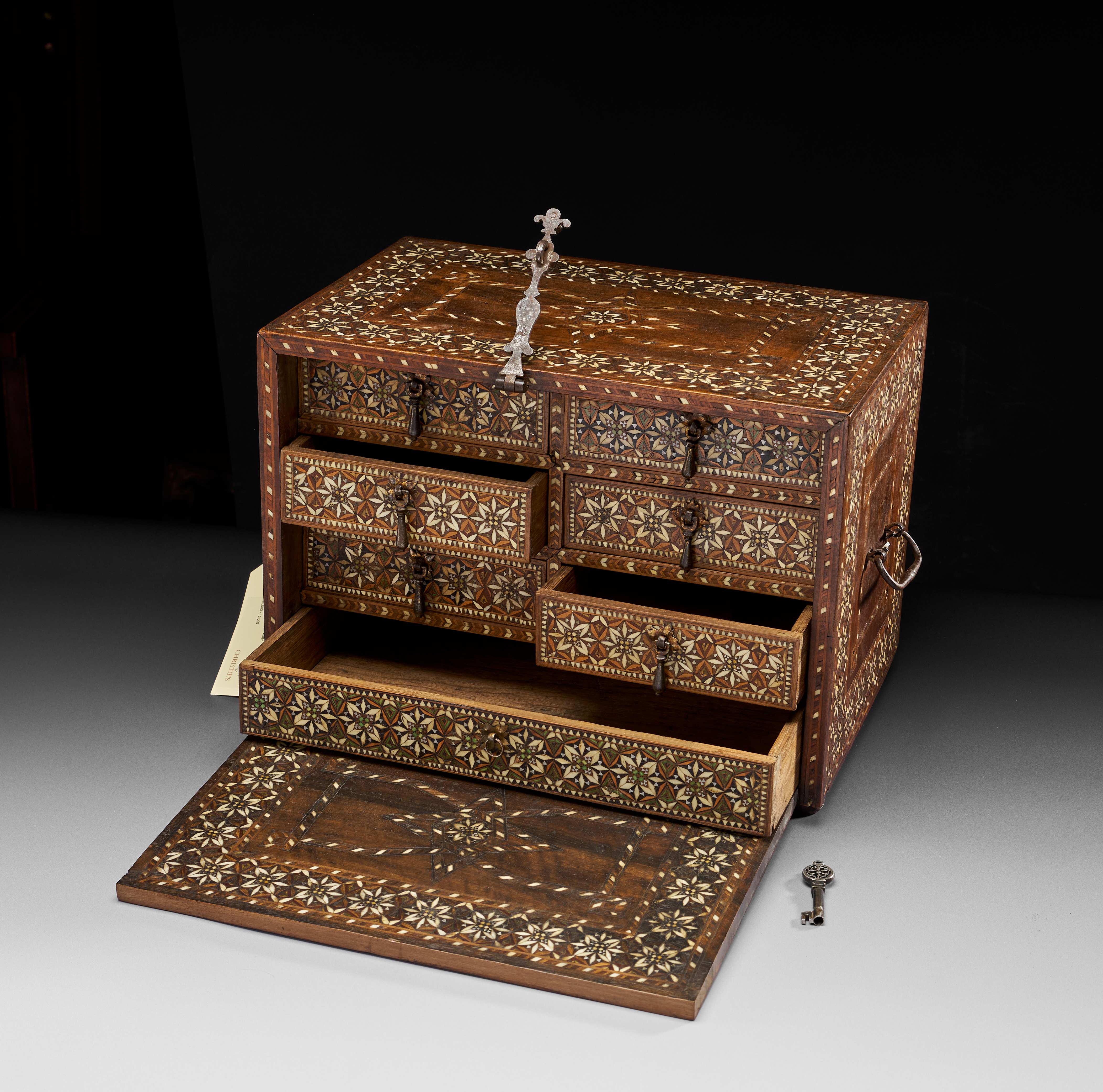 The wooden body inlaid with bone, ebony, and silver tesserae, the front panel with a border of stellar motifs within octagons, the side and upper surfaces similar, the base and reverse undecorated, hinged handles to the sides, the front with a large lock and hinged clasp with key, the hinge at the base with elegant chasing to the interior, the front opening to reveal six equal-sized drawers and one longer one with handles, the fronts inlaid, on small knop feet.