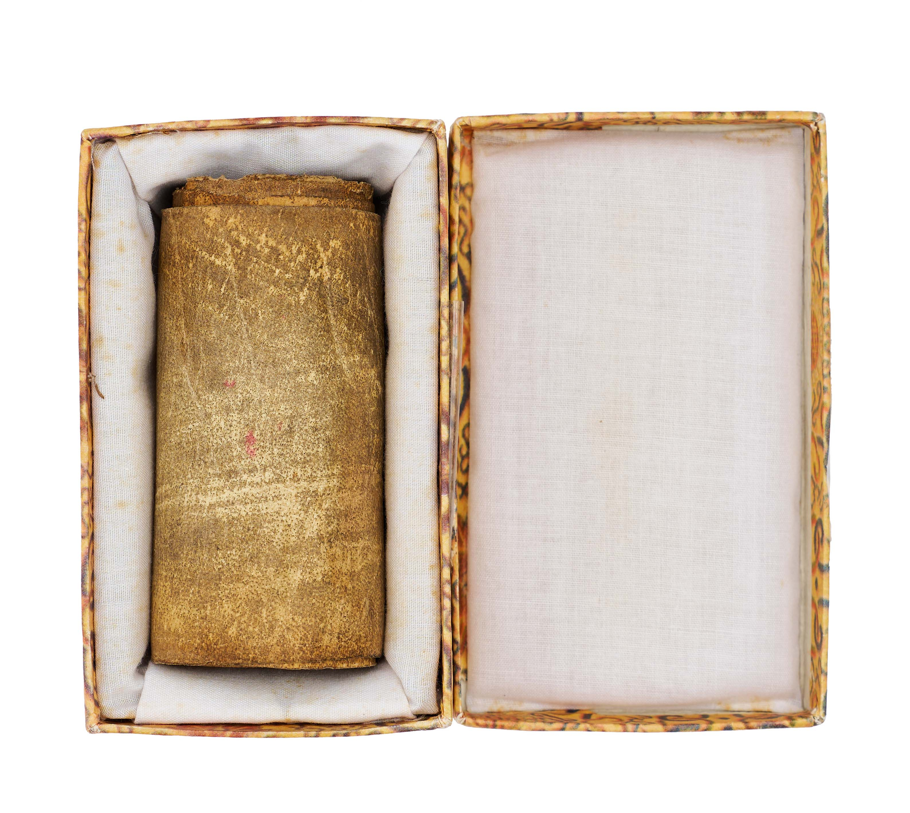 An Ethiopian Christian prayer scroll, written on vellum in Ge’ez, the ancient liturgical language of Ethiopia. Produced between the 18th and 19th centuries, such scrolls were traditionally created as protective talismans, commissioned to safeguard their owners from illness, misfortune, and spiritual harm. This example is richly illustrated with vivid painted depictions of saints and protective figures, rendered in the distinctive Ethiopian style with bold outlines and expressive faces. The scroll contains alternating passages of black and red ink, the red highlighting key invocations, names, and sacred formulas. Geometric and patterned borders further embellish the text and images.