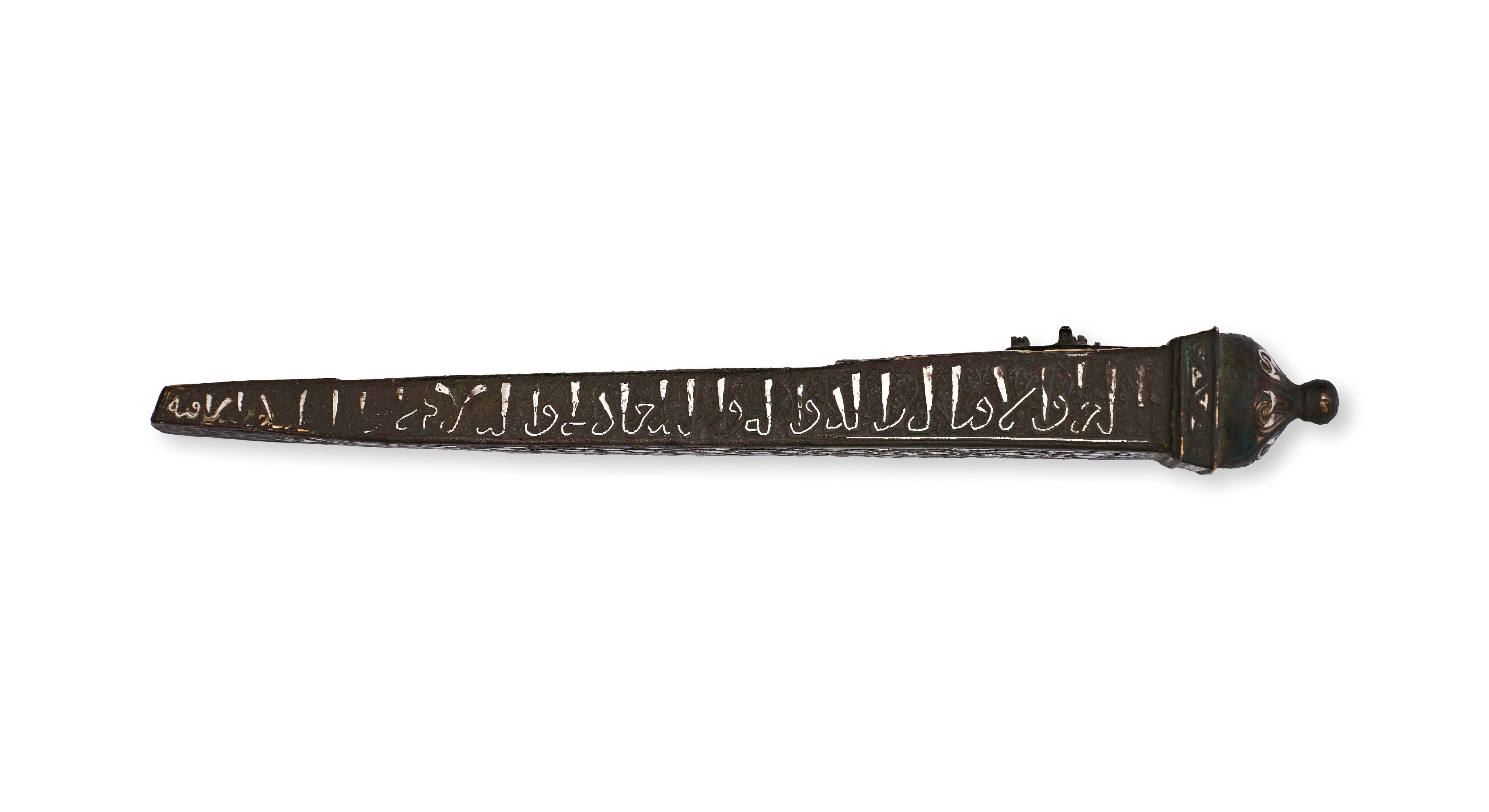 A domed lid and rounded finial, the bronze pen box is finely inlaid with silver, its surfaces enriched with a combination of geometric, epigraphic, and vegetal ornament. The lid is decorated with a central arcade of lobed panels enclosing palmettes and scrolling tendrils, while the sides bear long bands of kufic inscriptions inlaid in silver against a darkened ground, invoking blessings and good fortune. The underside and reverse continue the decoration with interlaced strapwork and scrolling arabesques.