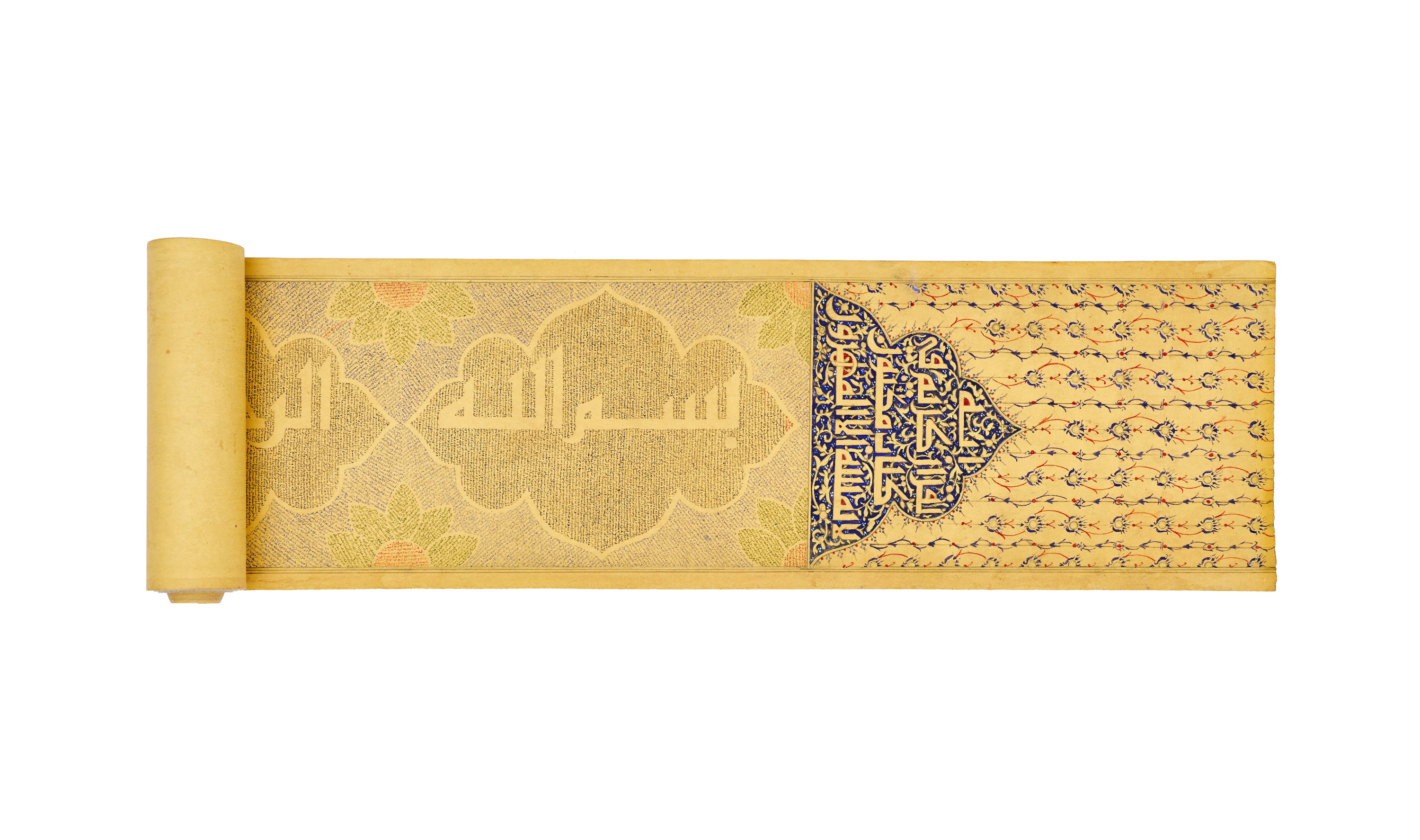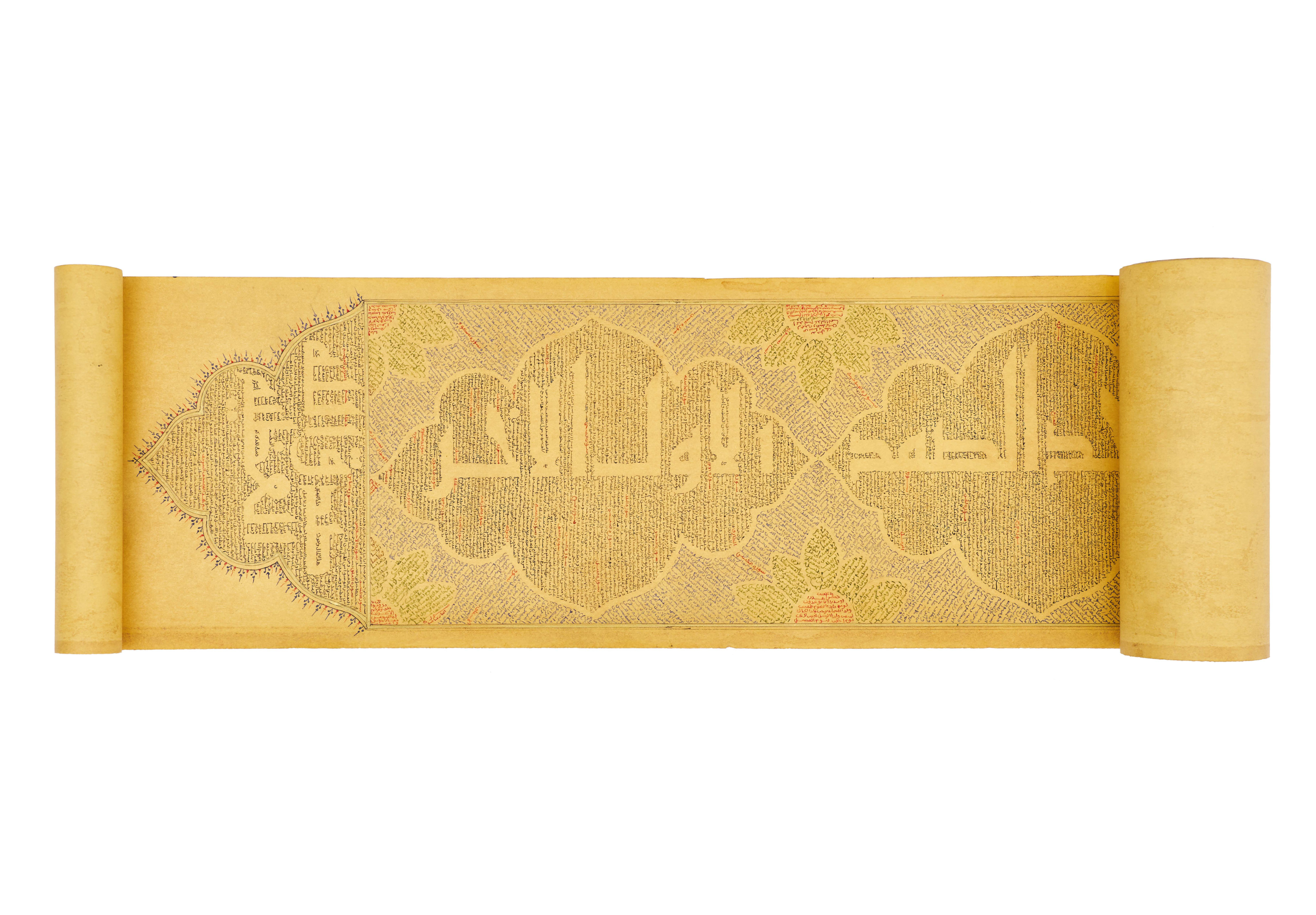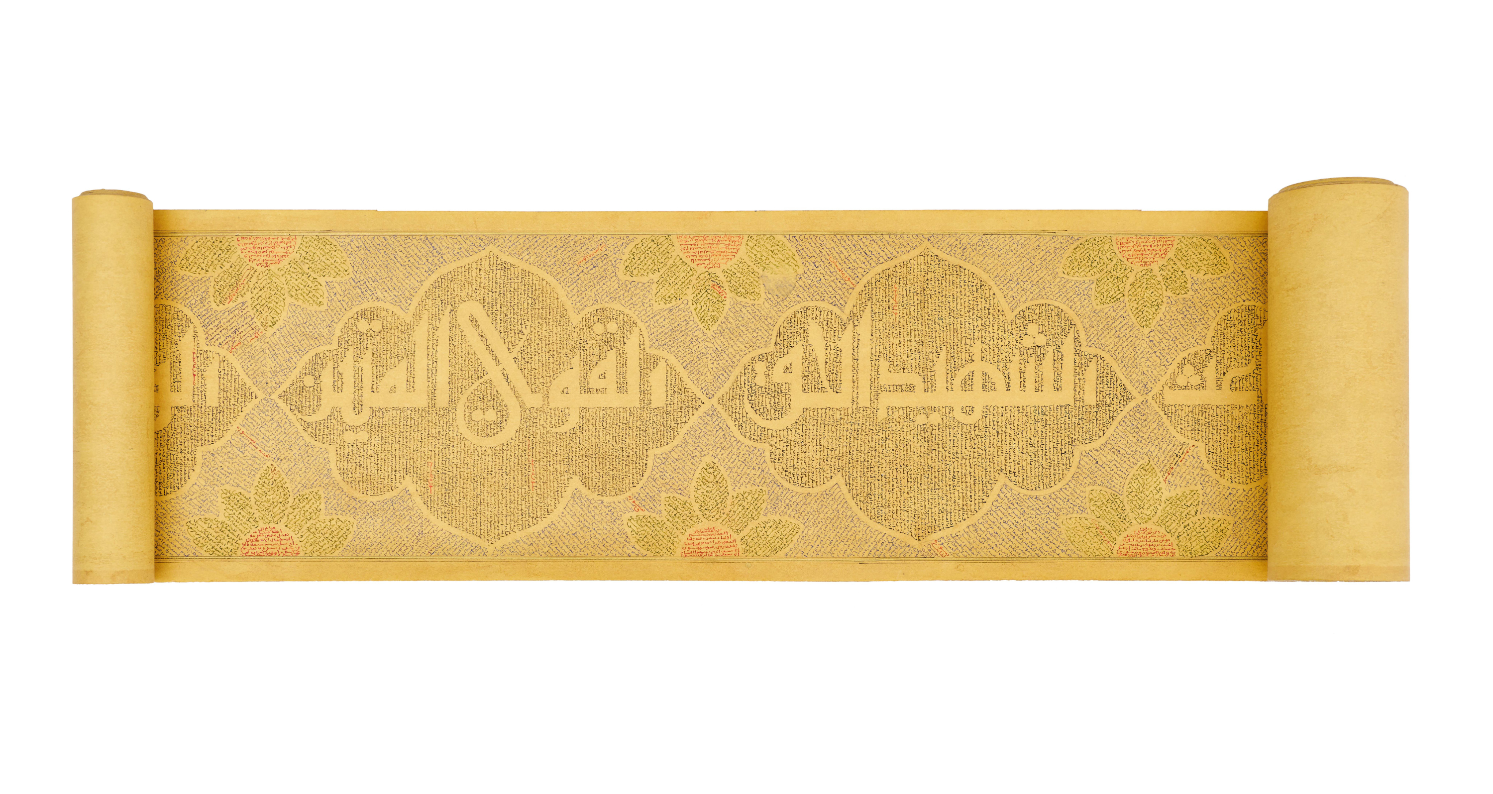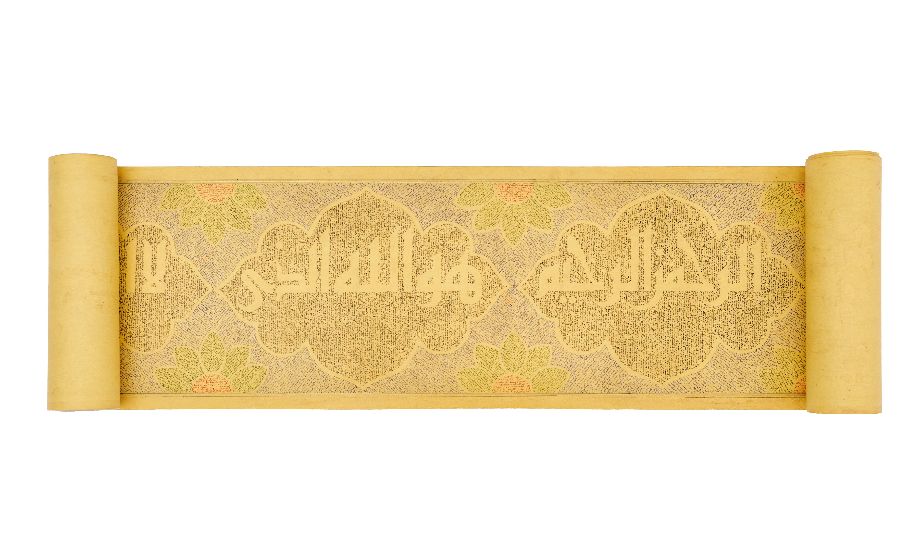 This is a beautifully illuminated Quran scroll, meticulously written by the calligrapher Maryam bint Alshaikh Ibrahim Alhasani in the 20th century. Maryam was the daughter of a respected Muezzin at the Ibrahimi Mosque.