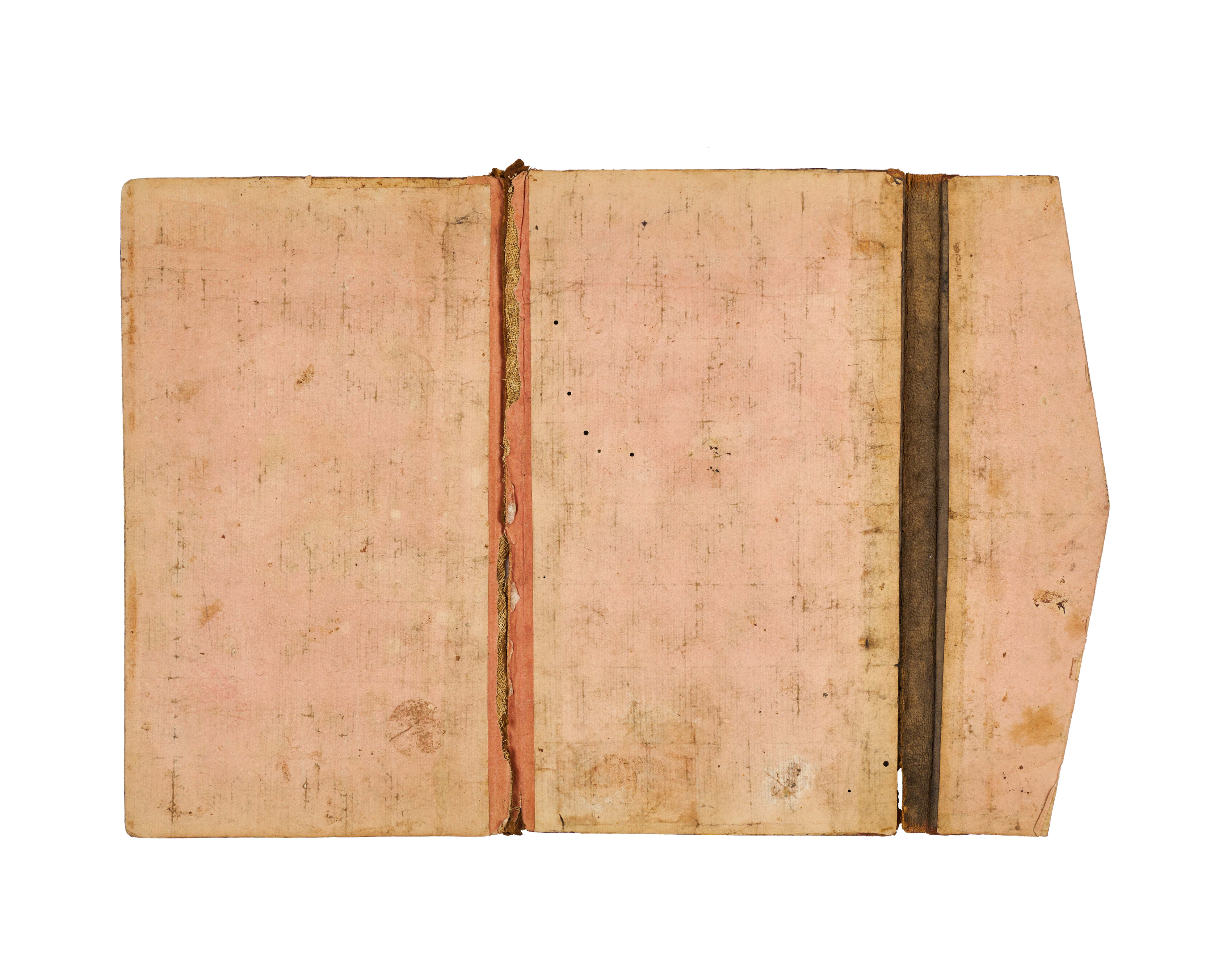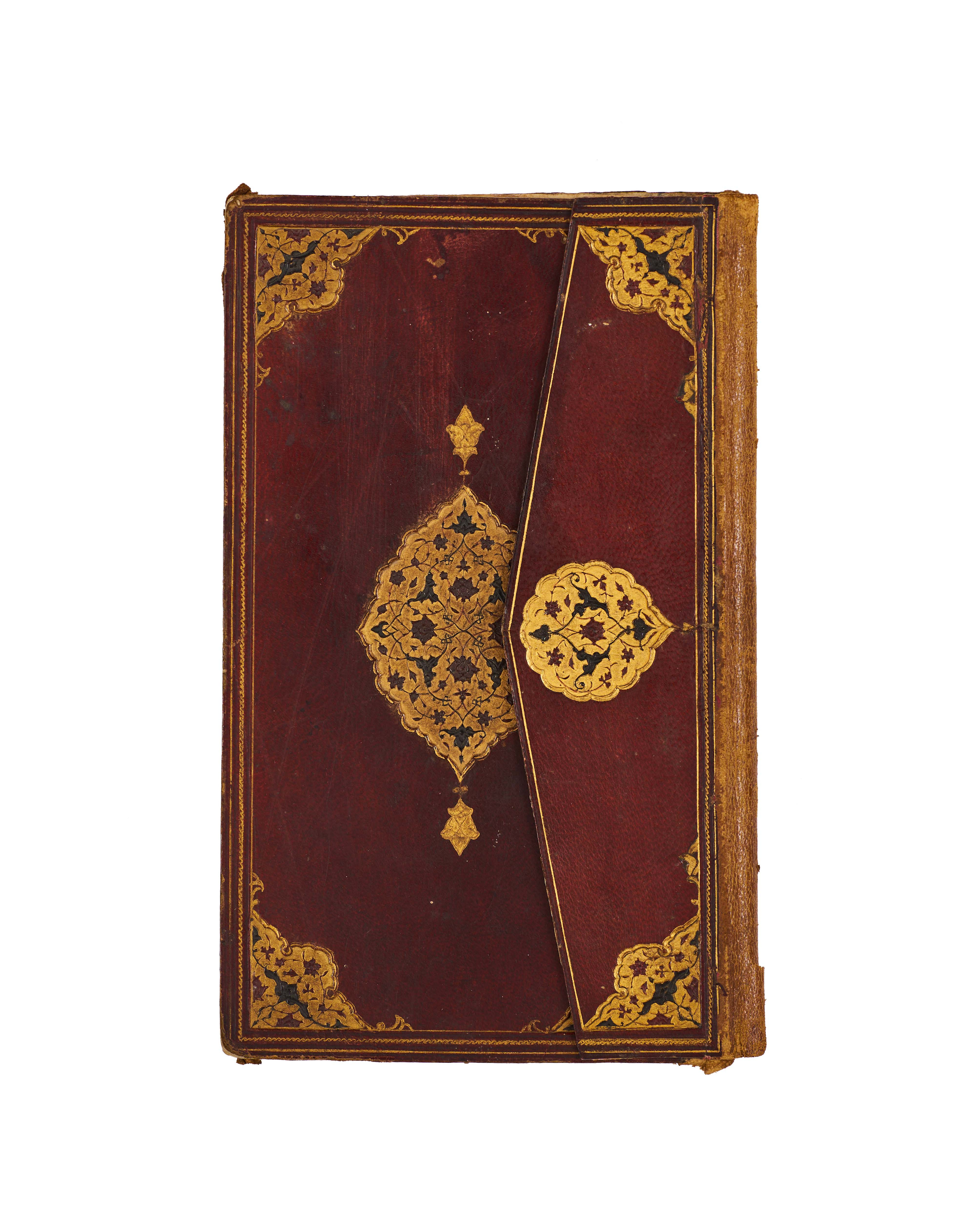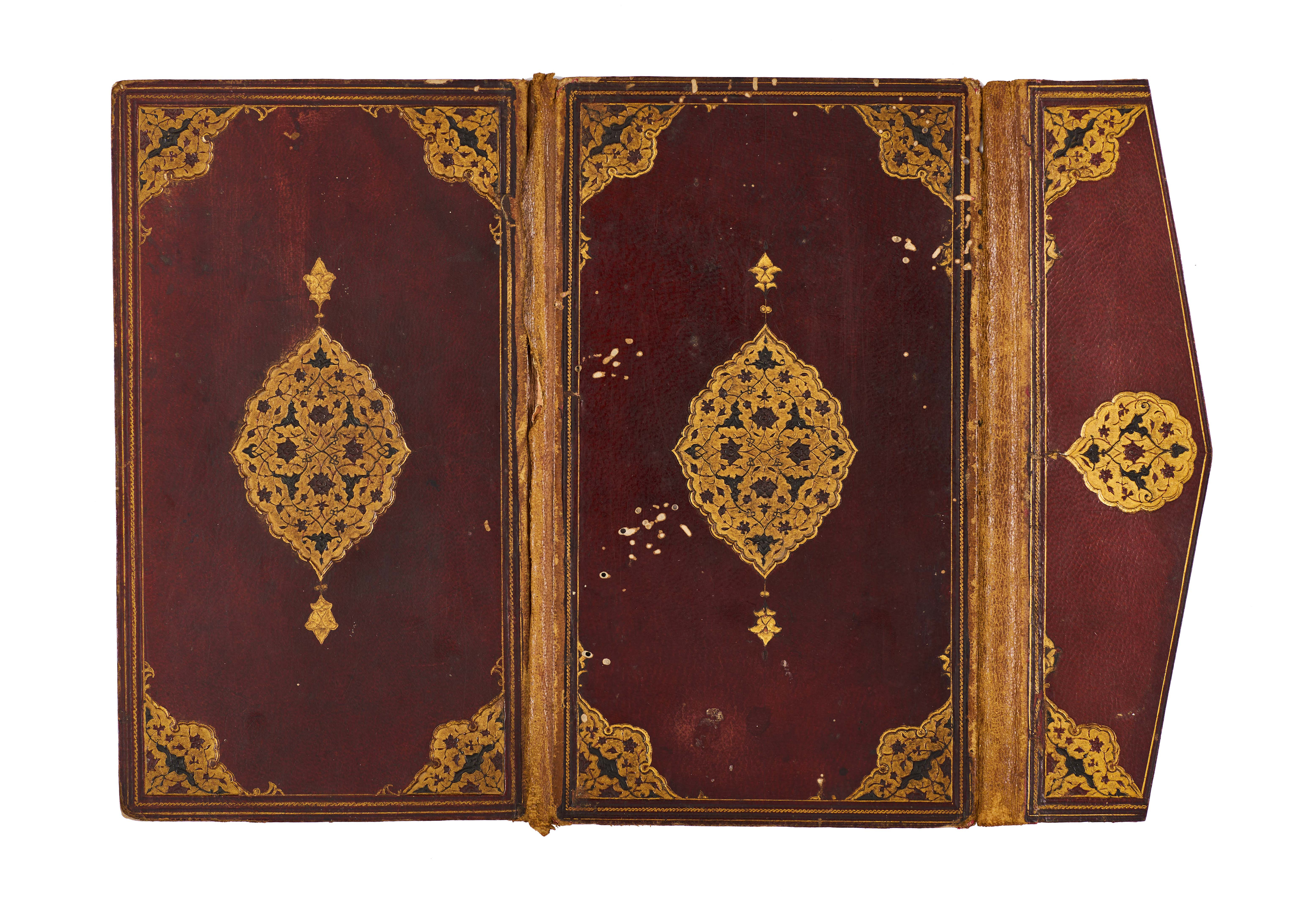 The binding is covered in deep reddish-brown leather, tooled and gilt with central lobed medallions of interlacing arabesques and floral scrolls, surmounted and pendant with smaller finials. The corner-pieces are decorated with scrolling gilt designs framed by double-ruled borders, while the flap repeats the ornament with a smaller gilt medallion. The interior is lined with plain pink paper.