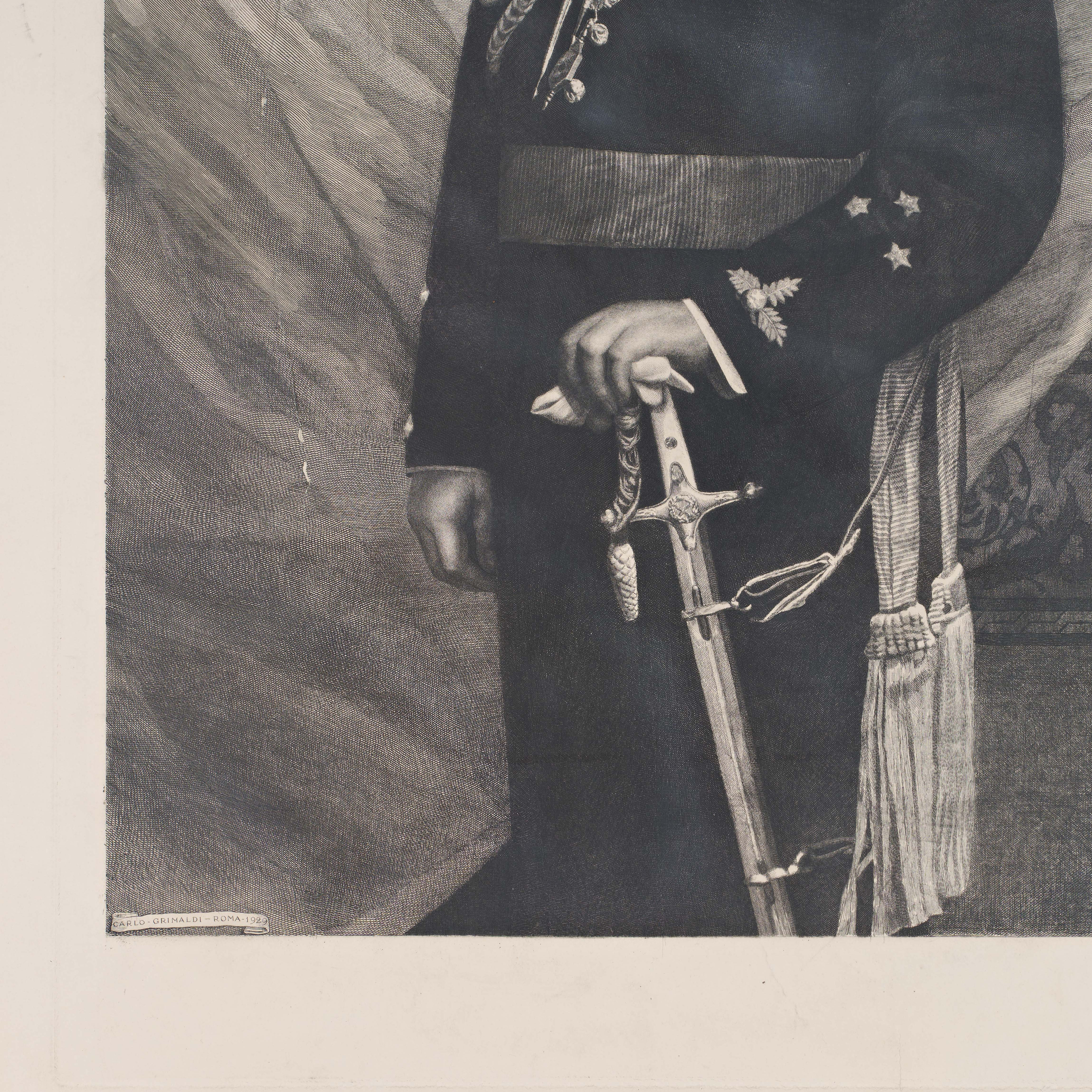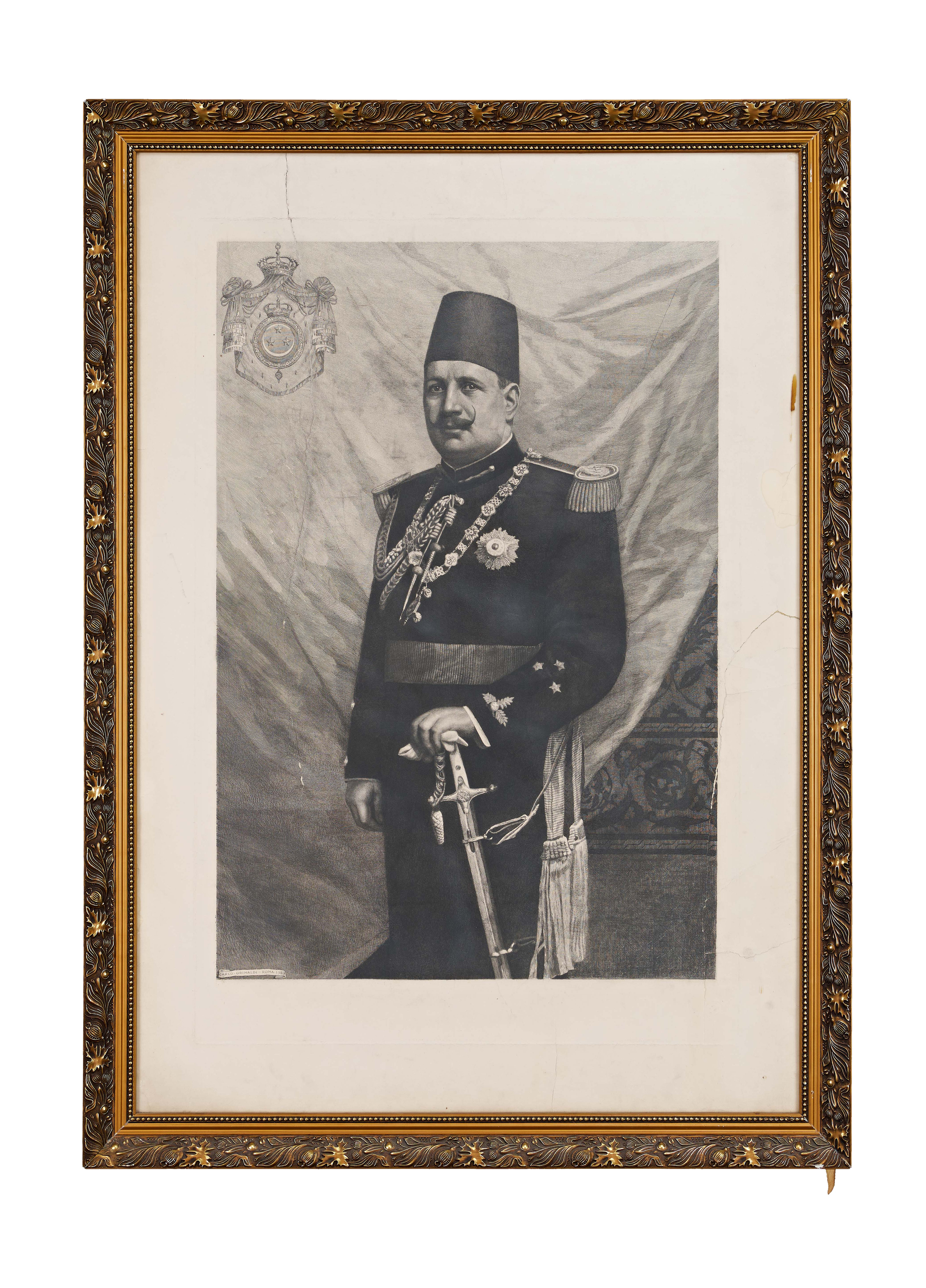 A large lithograph portrait depicts King Fuad I of Egypt (r. 1922–1936), rendered in full regalia, wearing a fez, military uniform, and numerous orders, with his hand resting on an ornate sword. Executed with striking detail and gravitas, the work captures the monarch against a draped backdrop with the royal coat of arms above. Signed Carlo Grimaldi, Roma, 1929, it reflects both the royal court’s taste for European academic portraiture and the broader cultural ties between Egypt and Italy during the early 20th century.