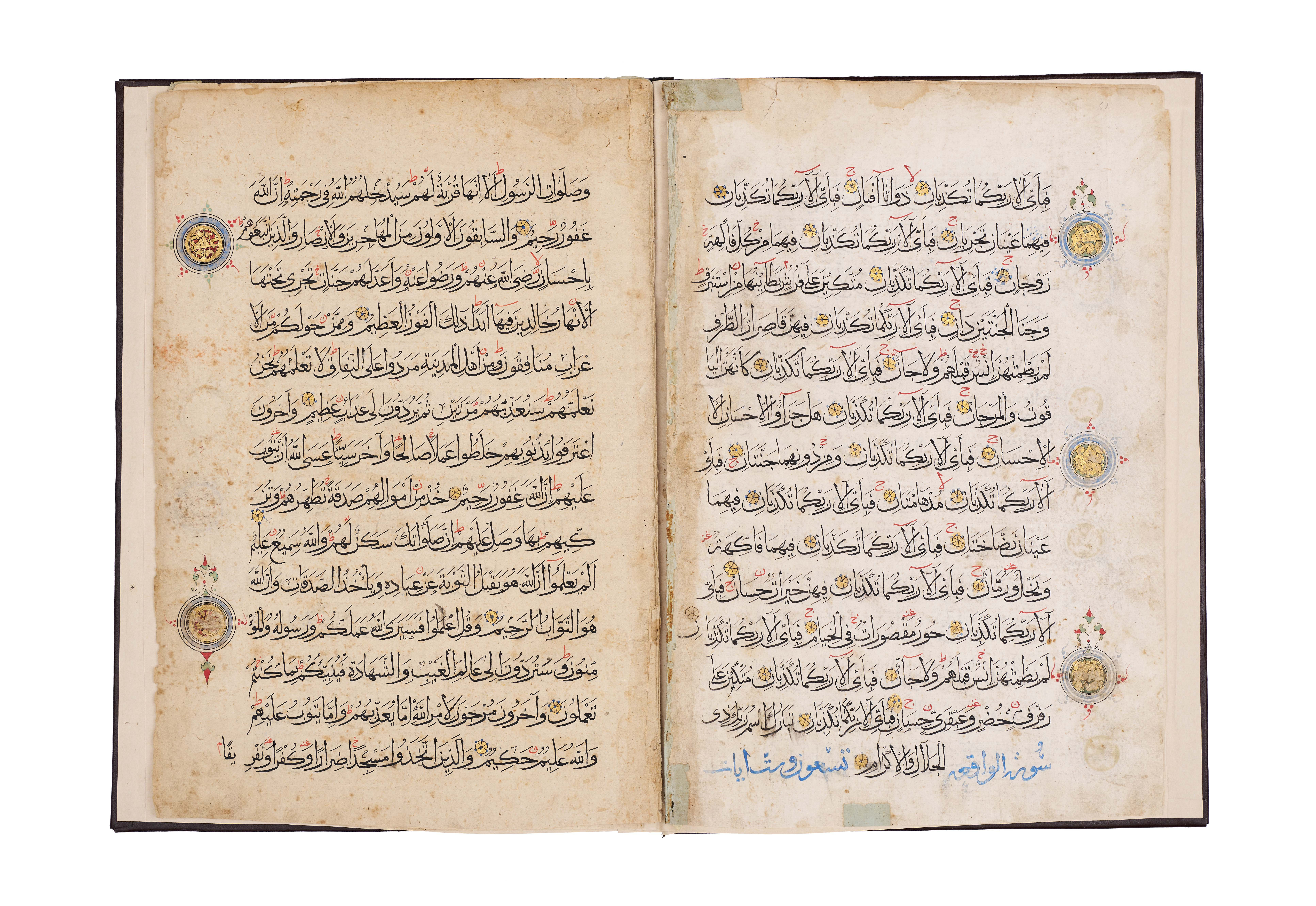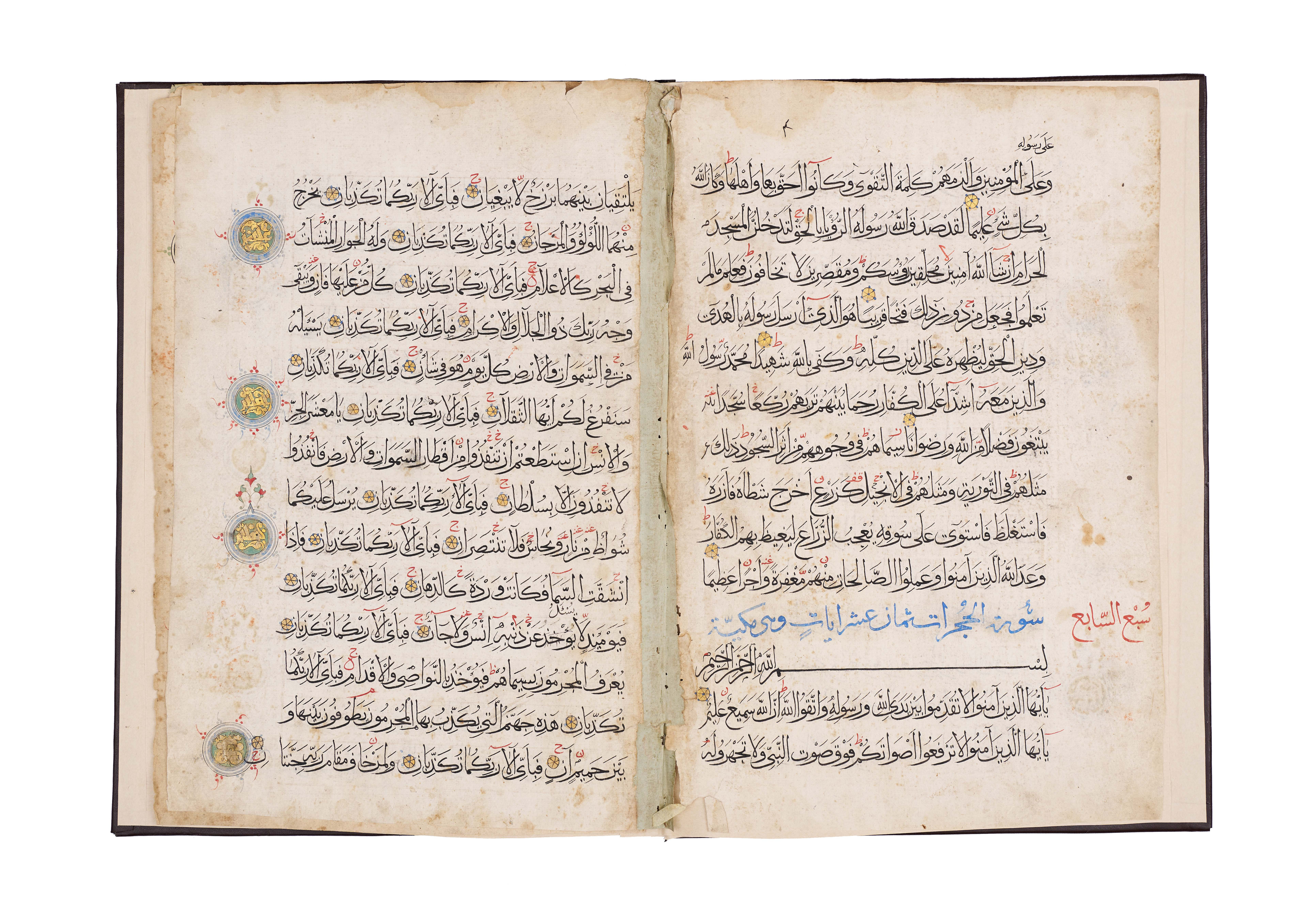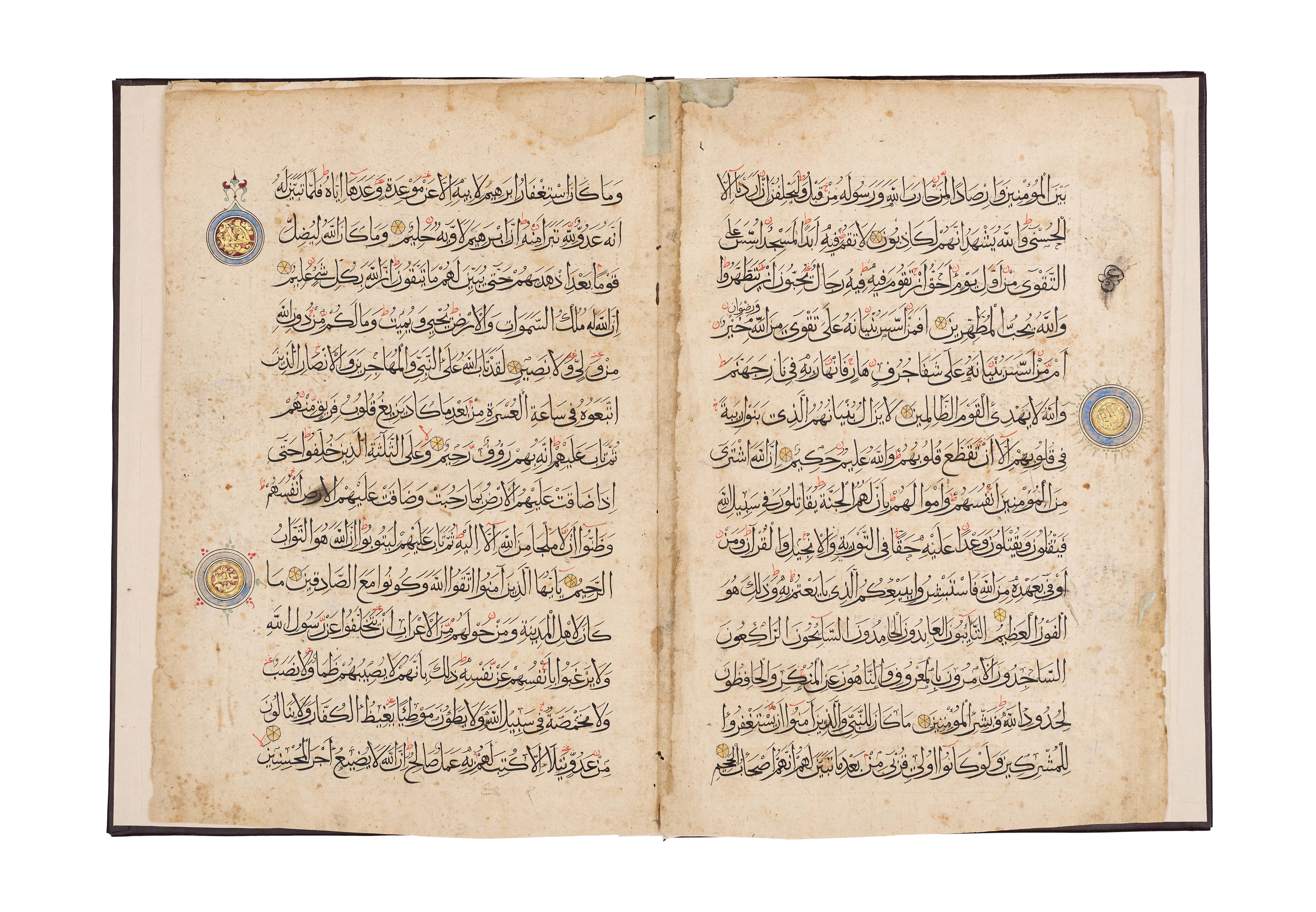 This rare and important manuscript comprises six large Quran pages written by the calligrapher Yaqut bin Abdullah al-Mosly during the Atabeg era in the 7th century Hijri (13th century CE), featuring bold black script with red diacritical marks, illuminated verse markers in gilt with polychrome rosettes and medallions, occasional headings in red and blue, and exquisite floral and geometric decoration, all preserved within a later binding.