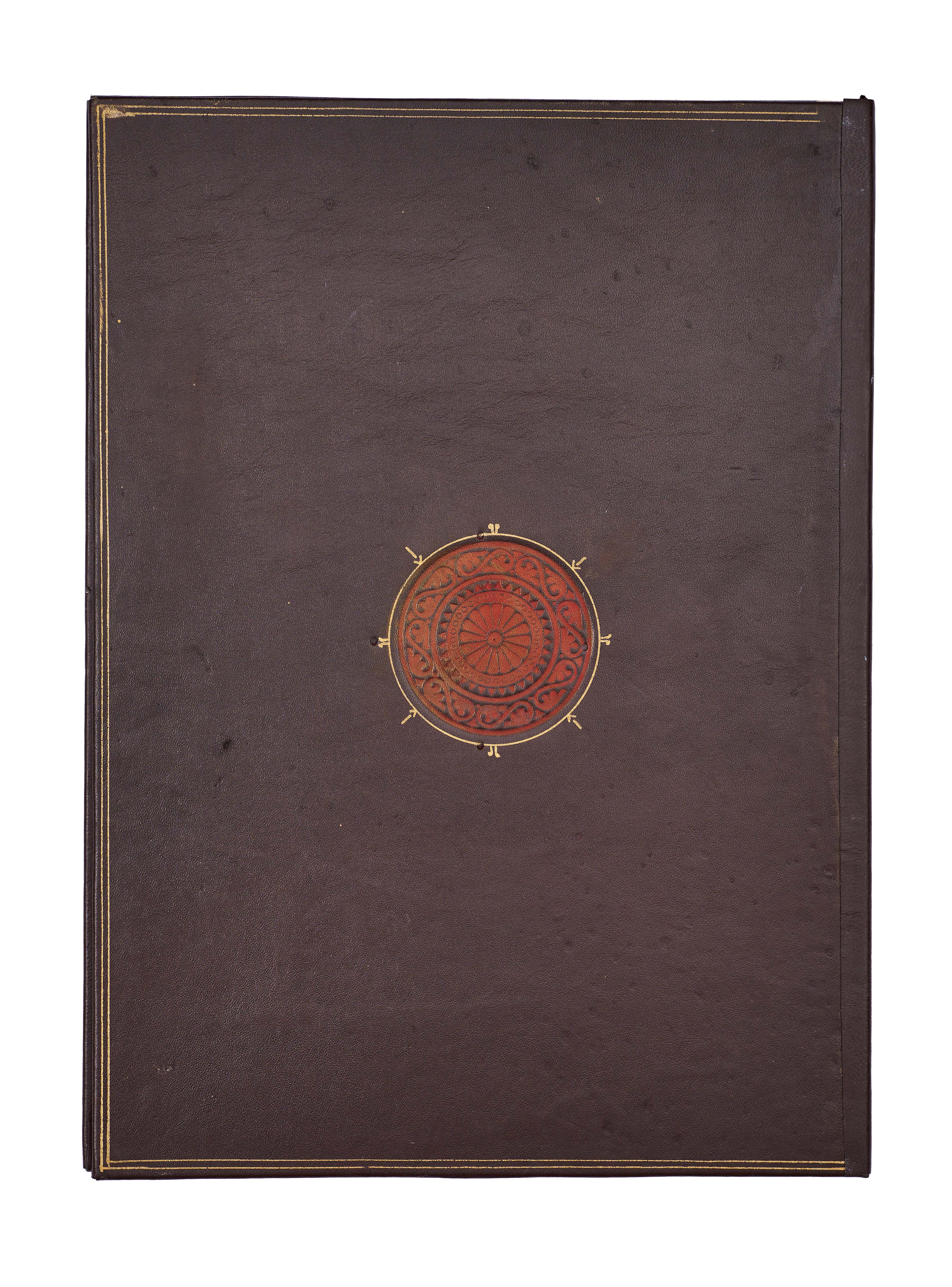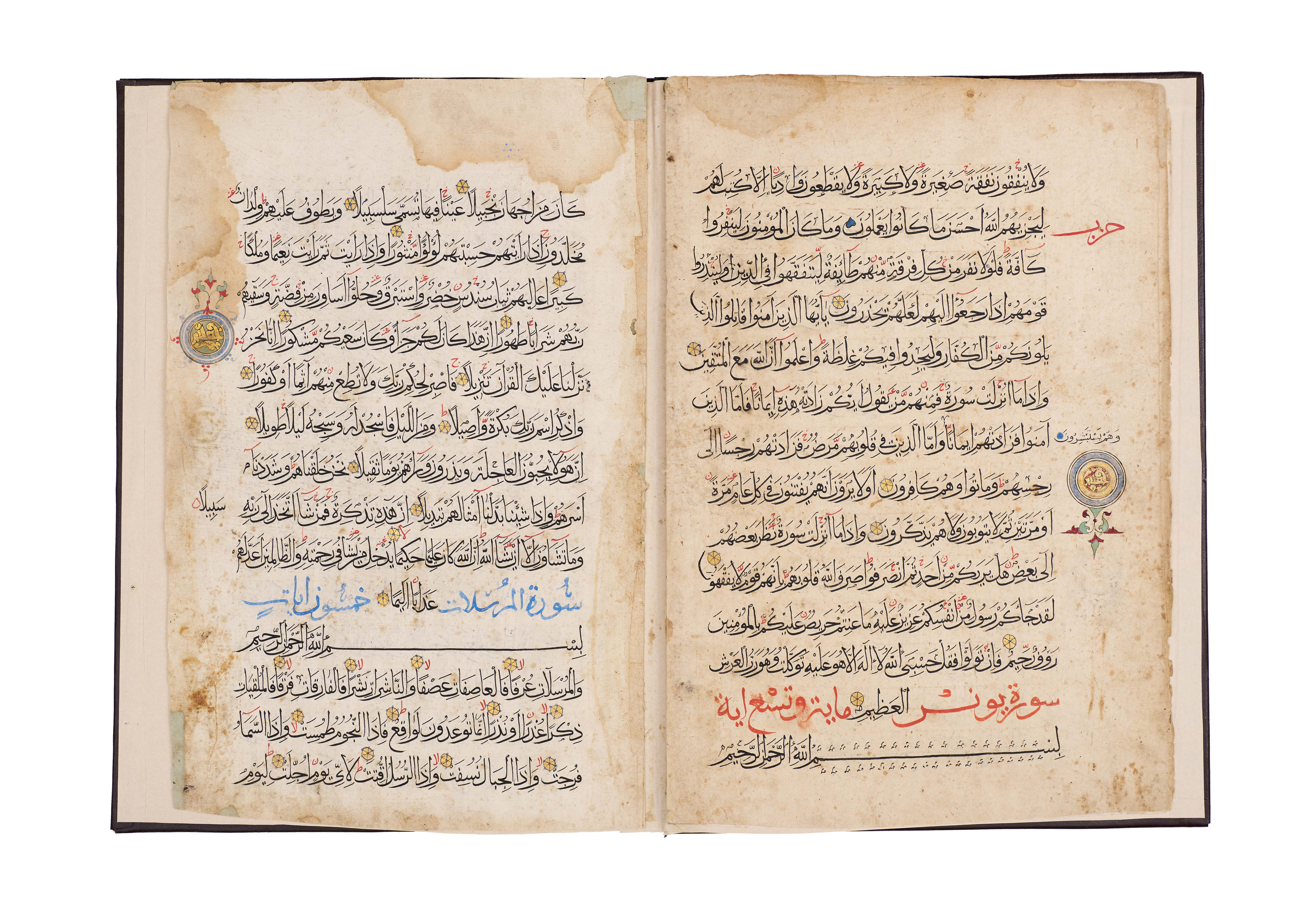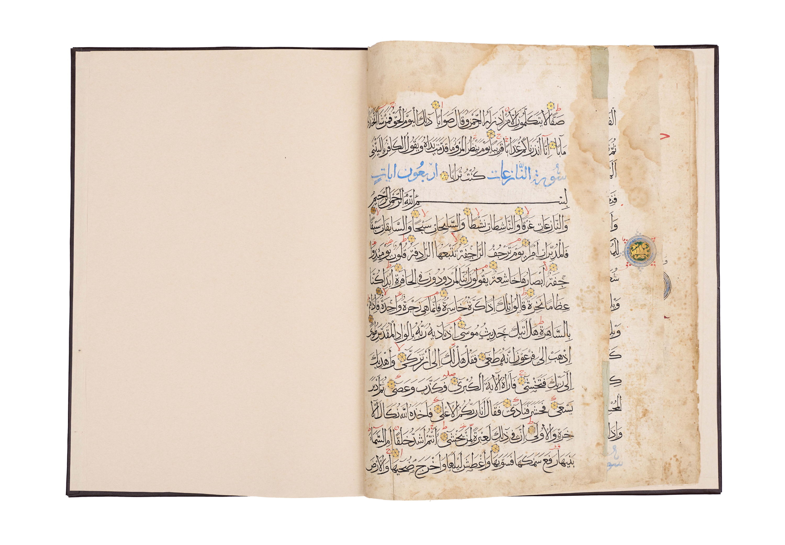 This rare and important manuscript comprises six large Quran pages written by the calligrapher Yaqut bin Abdullah al-Mosly during the Atabeg era in the 7th century Hijri (13th century CE), featuring bold black script with red diacritical marks, illuminated verse markers in gilt with polychrome rosettes and medallions, occasional headings in red and blue, and exquisite floral and geometric decoration, all preserved within a later binding.