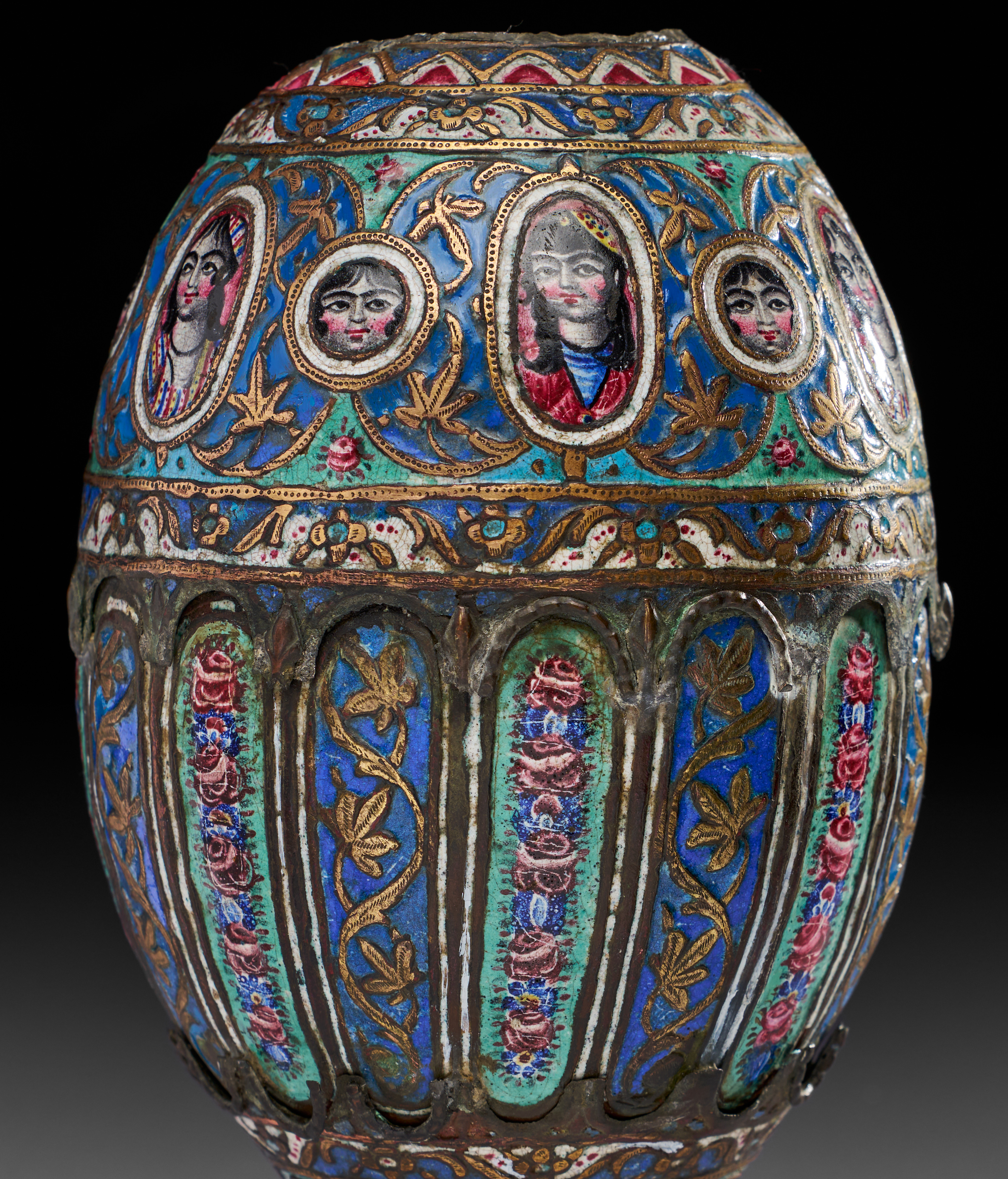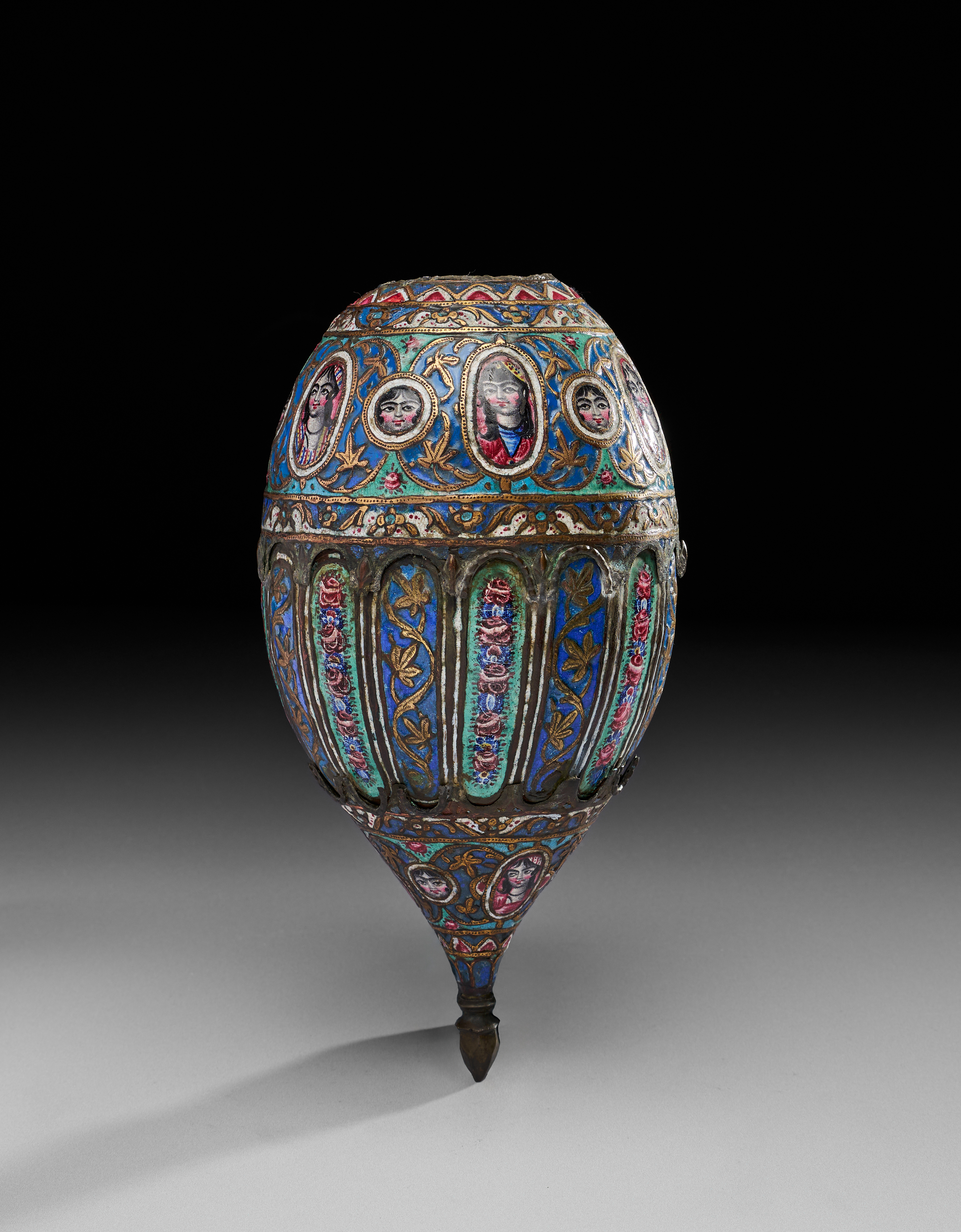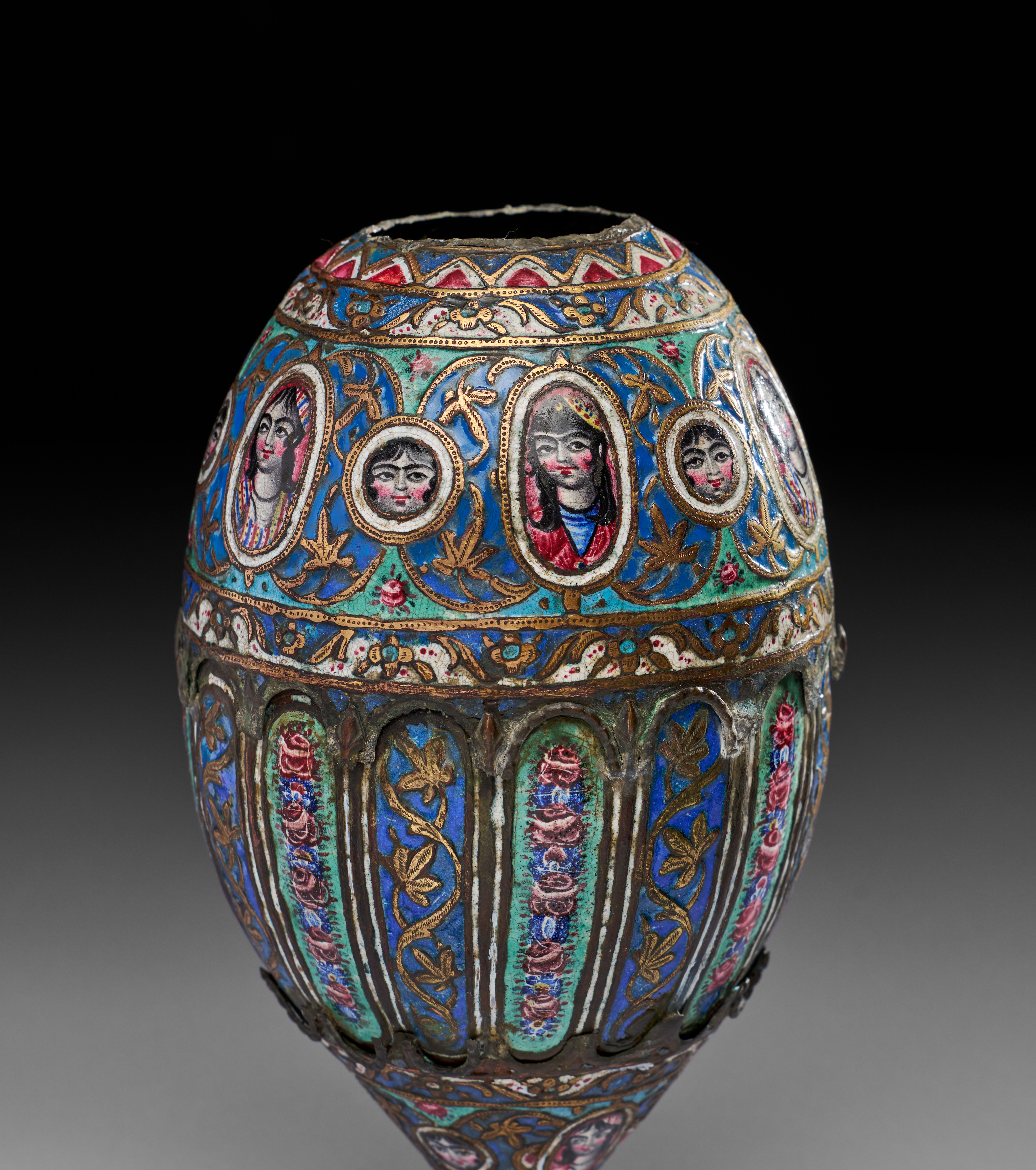 It is of bulbous form, tapering to a pointed base, crafted from copper alloy and richly decorated with colourful enamels in blue, green, red, white, and gold. The decoration features alternating vertical panels of floral motifs with garlands of roses, separated by gilt vine scrolls. Around the shoulder, there is a striking band of portrait medallions depicting expressive human faces in vibrant enamels, framed by gilded oval cartouches and floral sprays. The upper register is encircled with floral ornament, bordered with zigzag and foliate patterns. The piece is further enhanced with gilt highlights, which emphasis both the floral arabesques and the figural portraits.