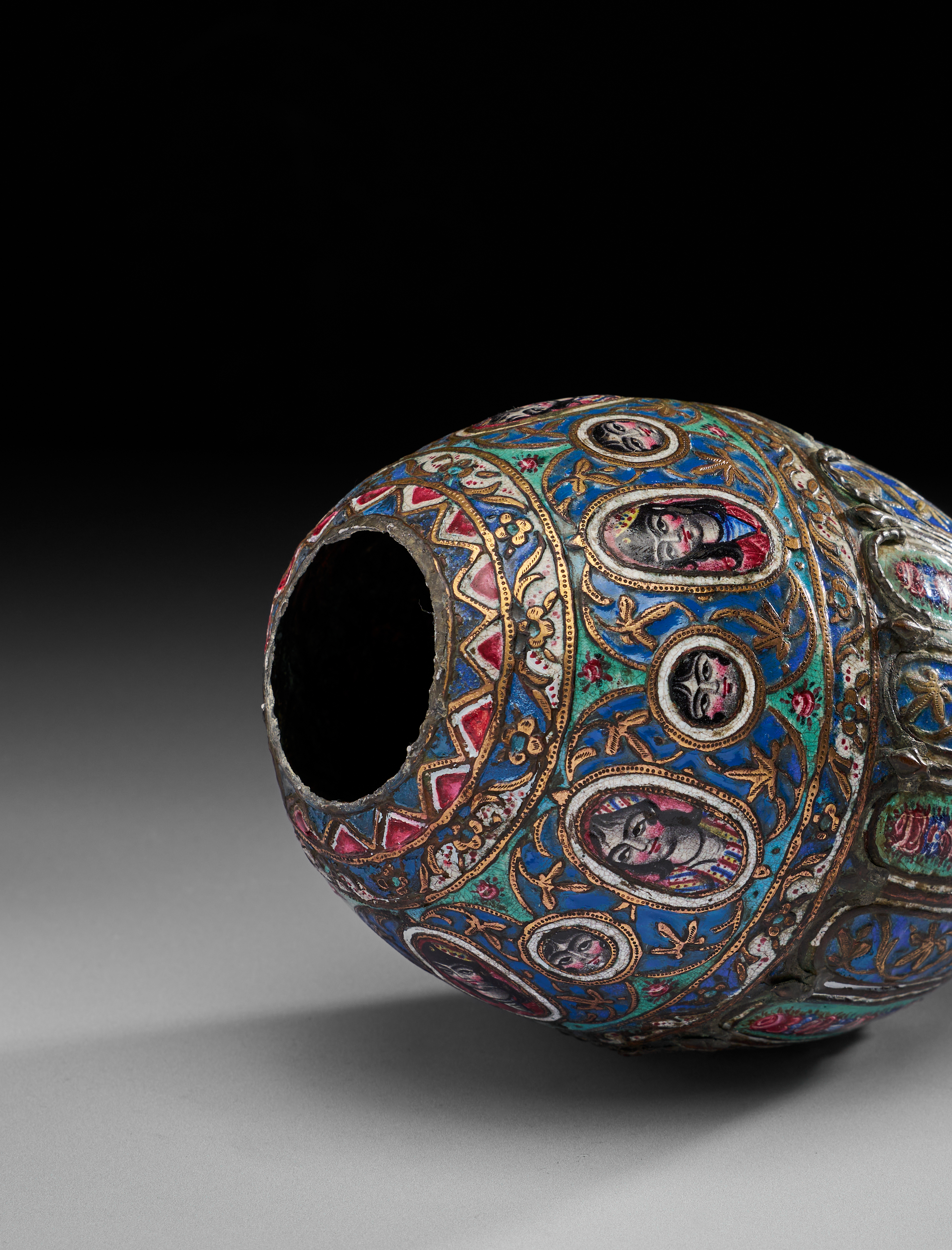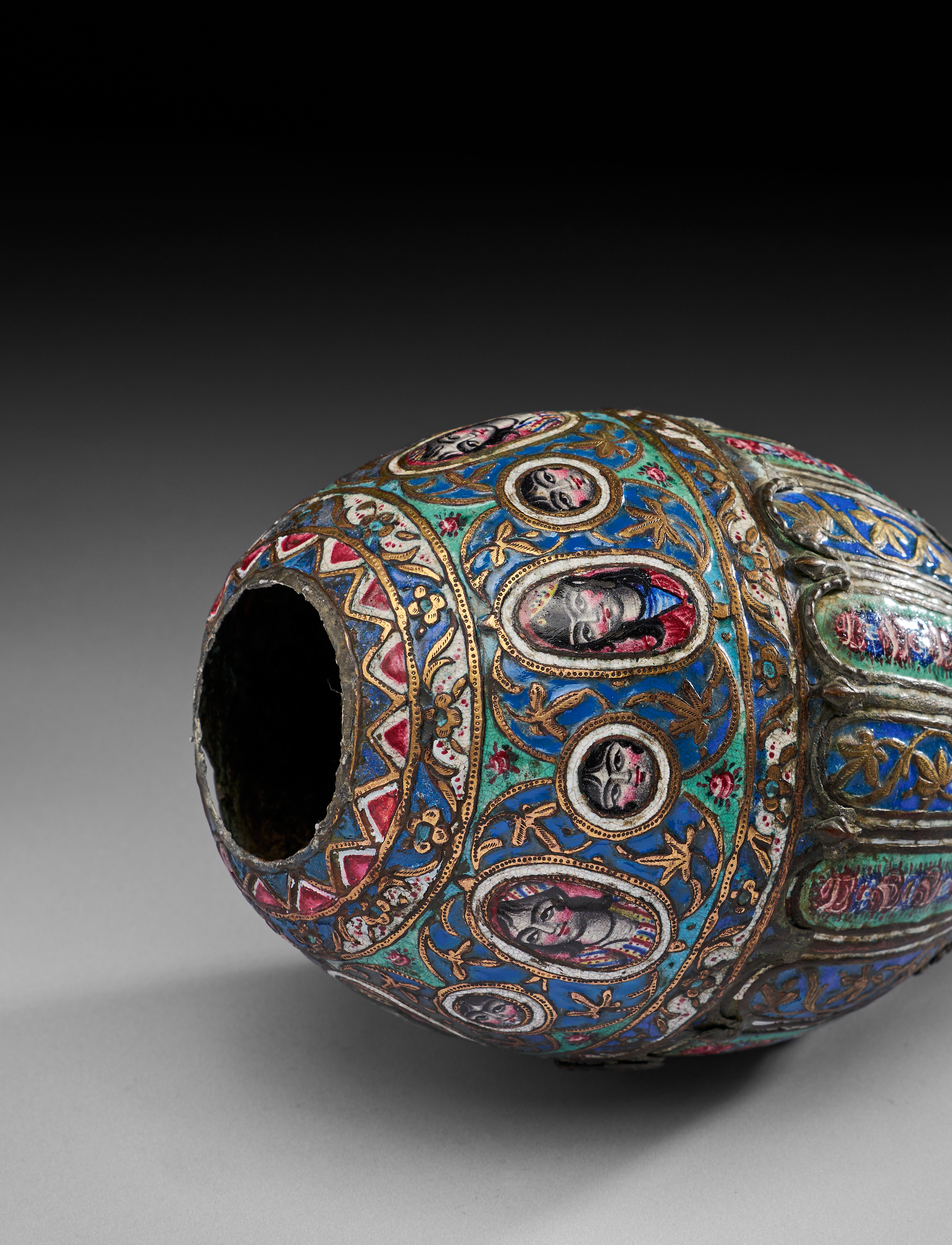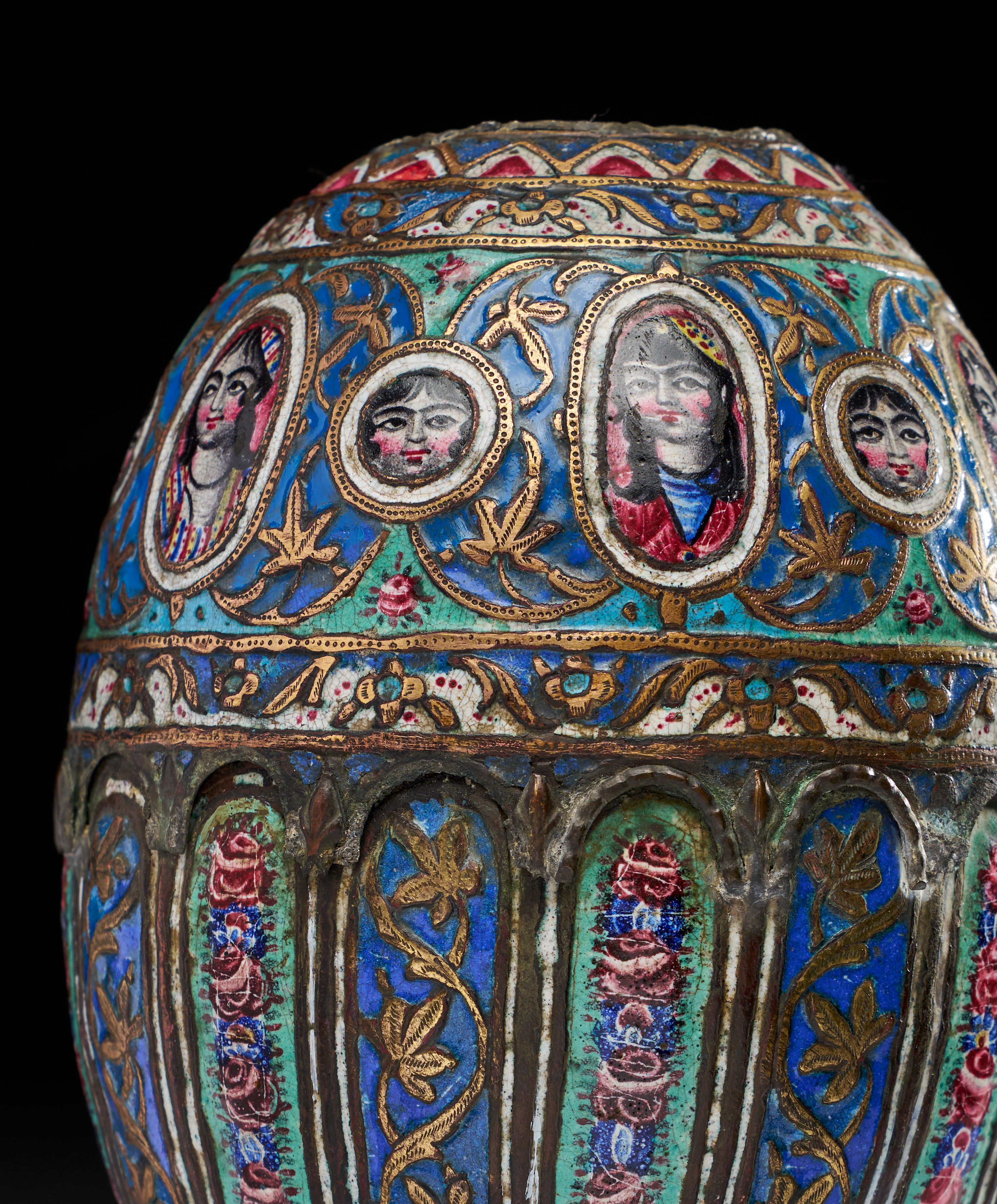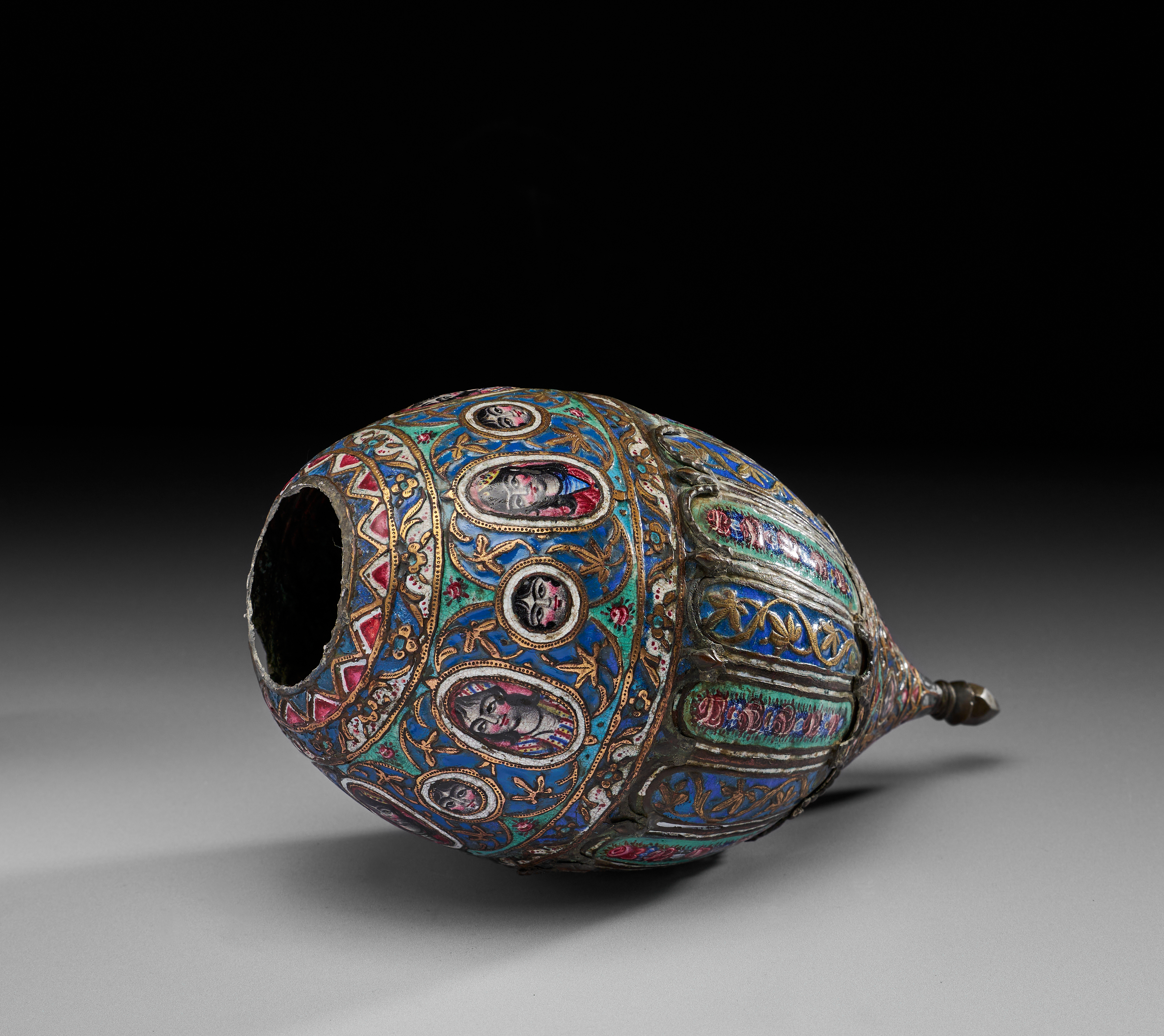 It is of bulbous form, tapering to a pointed base, crafted from copper alloy and richly decorated with colourful enamels in blue, green, red, white, and gold. The decoration features alternating vertical panels of floral motifs with garlands of roses, separated by gilt vine scrolls. Around the shoulder, there is a striking band of portrait medallions depicting expressive human faces in vibrant enamels, framed by gilded oval cartouches and floral sprays. The upper register is encircled with floral ornament, bordered with zigzag and foliate patterns. The piece is further enhanced with gilt highlights, which emphasis both the floral arabesques and the figural portraits.