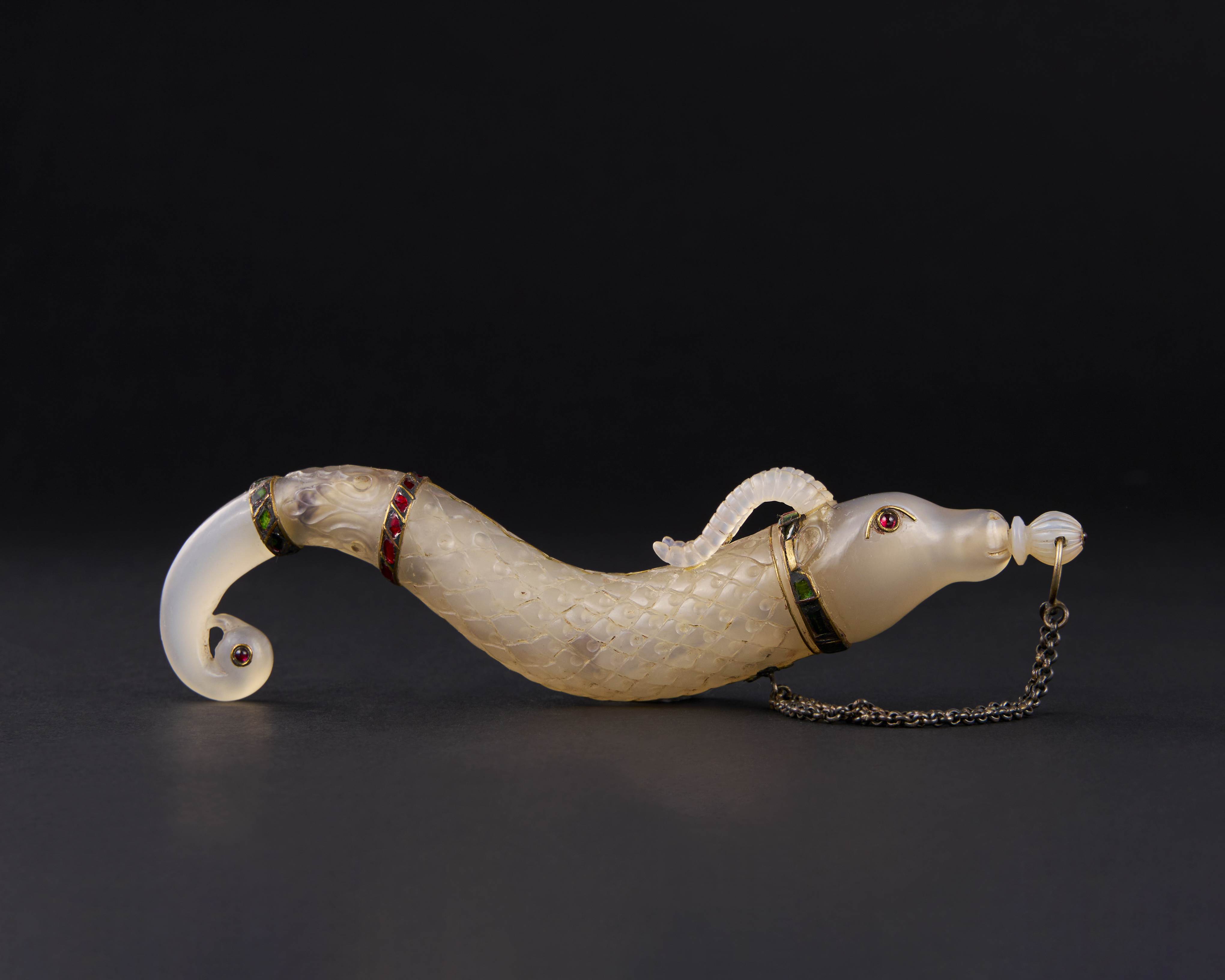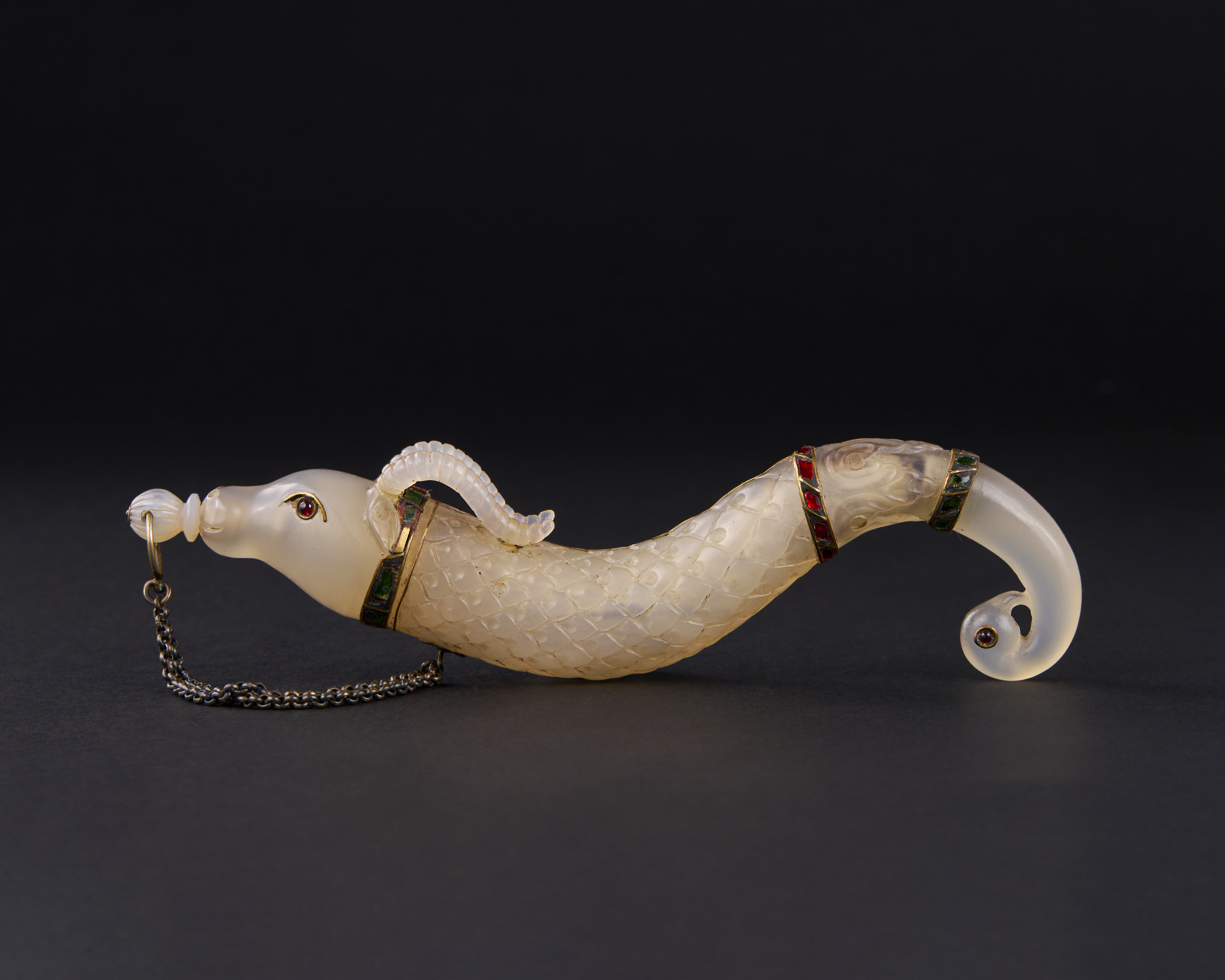 A MUGHAL WHITE JADE GEM SET POWDER FLASK, 19TH CENTURY, INDIA