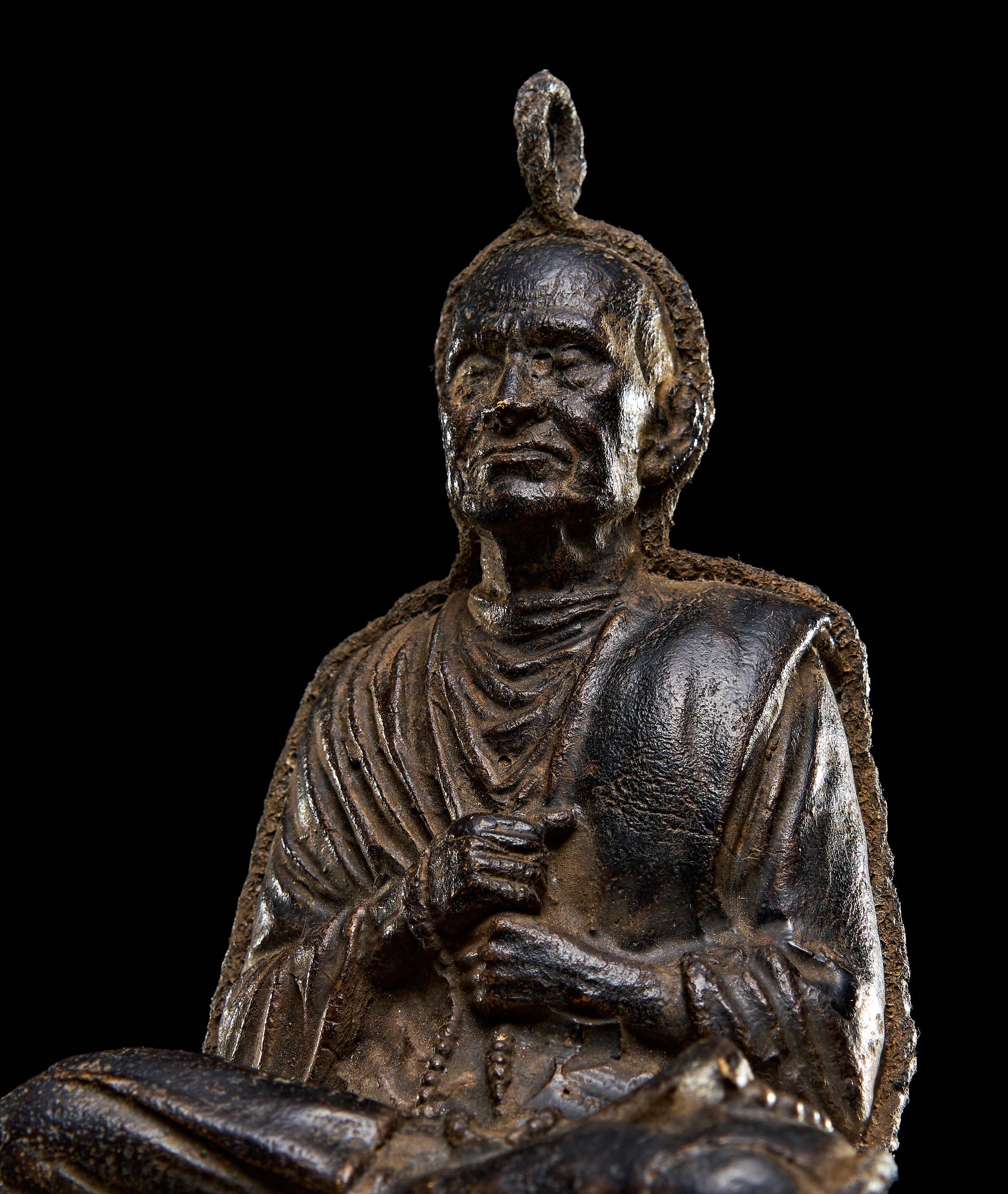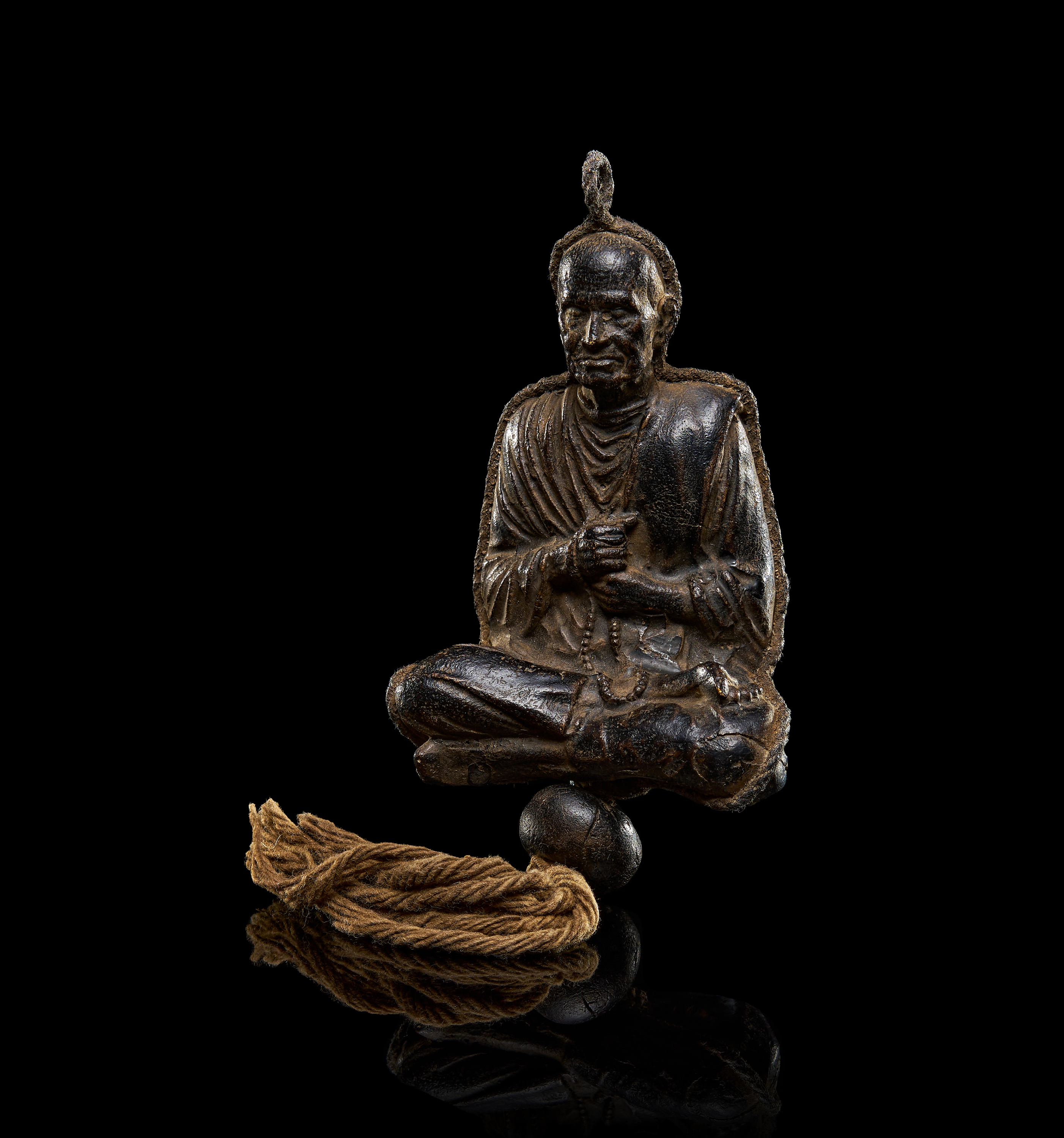 A LEATHER BUDDHIST DEITY OR MONK, POSSIBLY CHINESE, 19TH CENTURY OR EARLIER