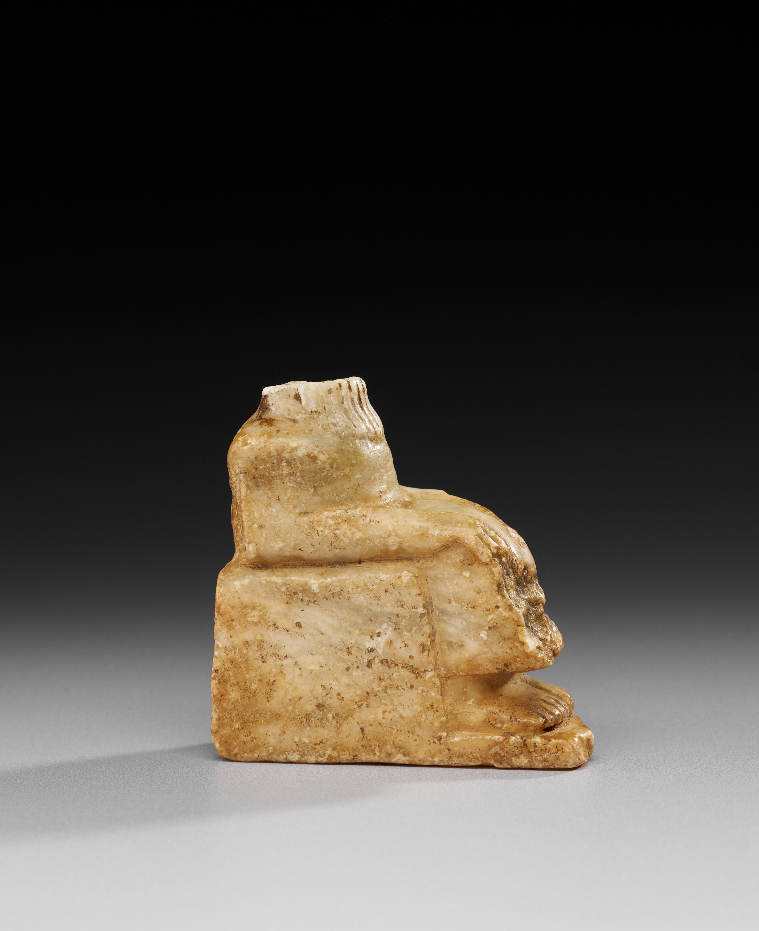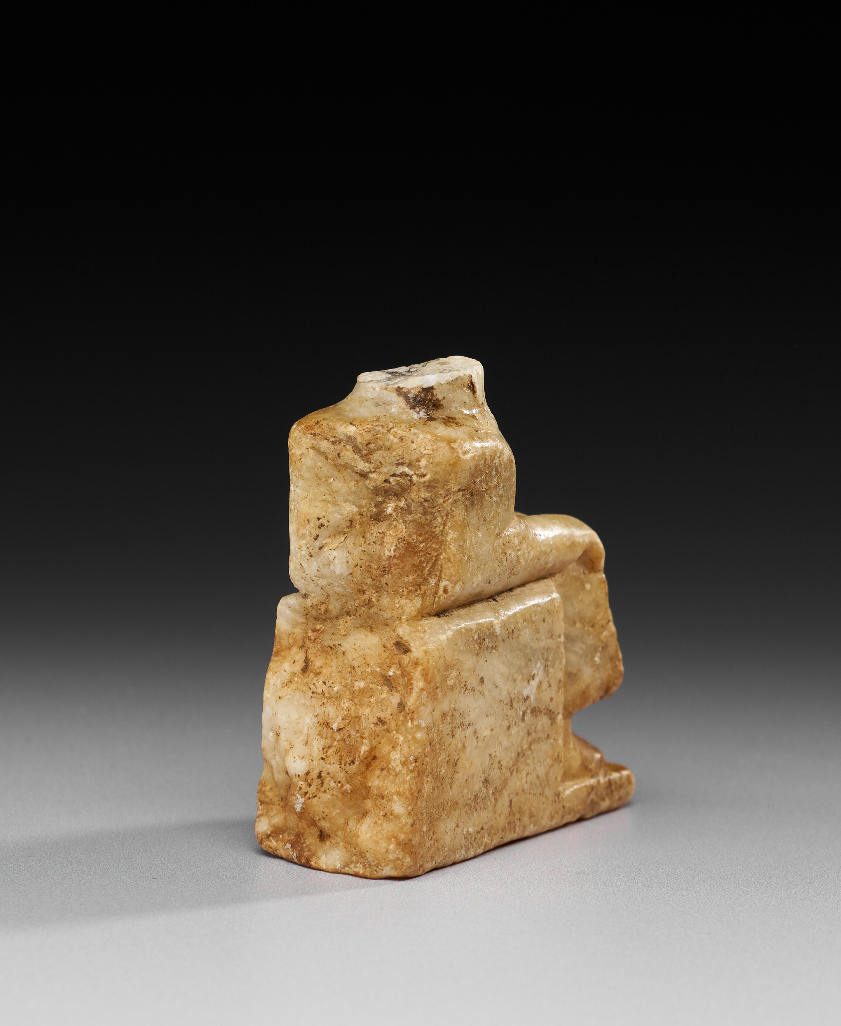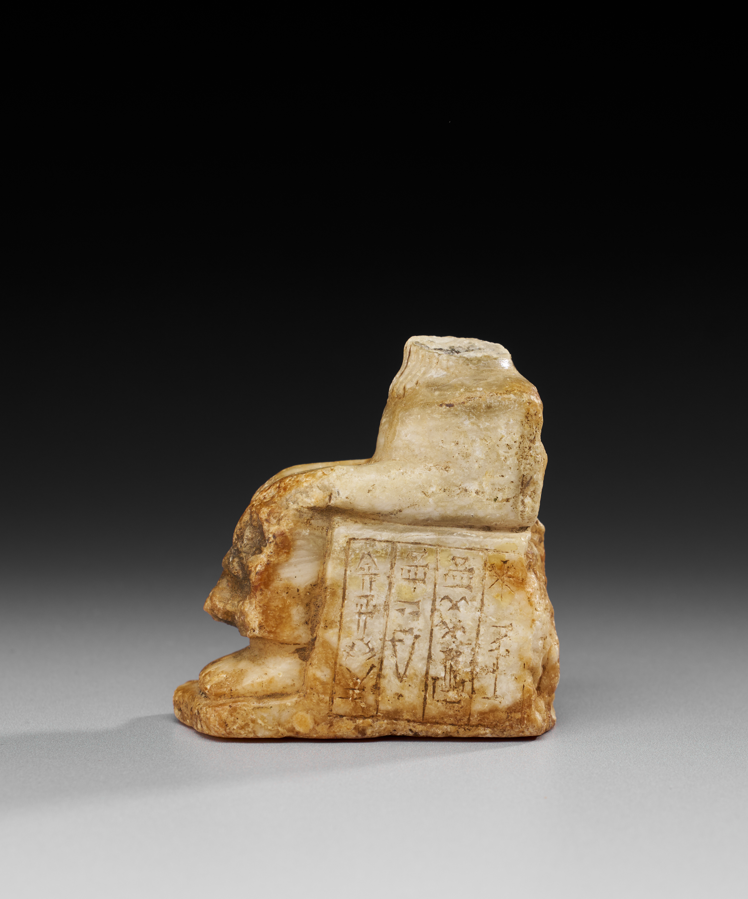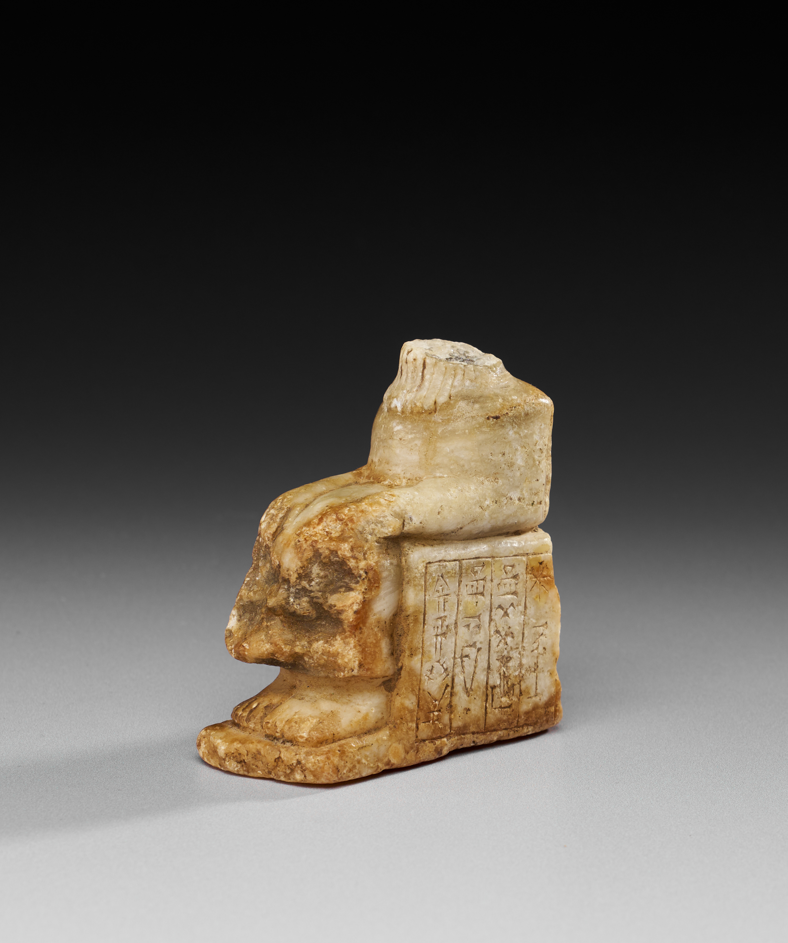 Carved in white marble, this fragment represents the lower part of a seated figure, preserved from the chest down. The figure rests upon a block-like seat, the front incised with four vertical registers of cuneiform inscription, including a star symbol. The right hand is shown clasped across the lap, while the feet are placed flat upon an integral base. The surface bears an aged patina with areas of iron staining.