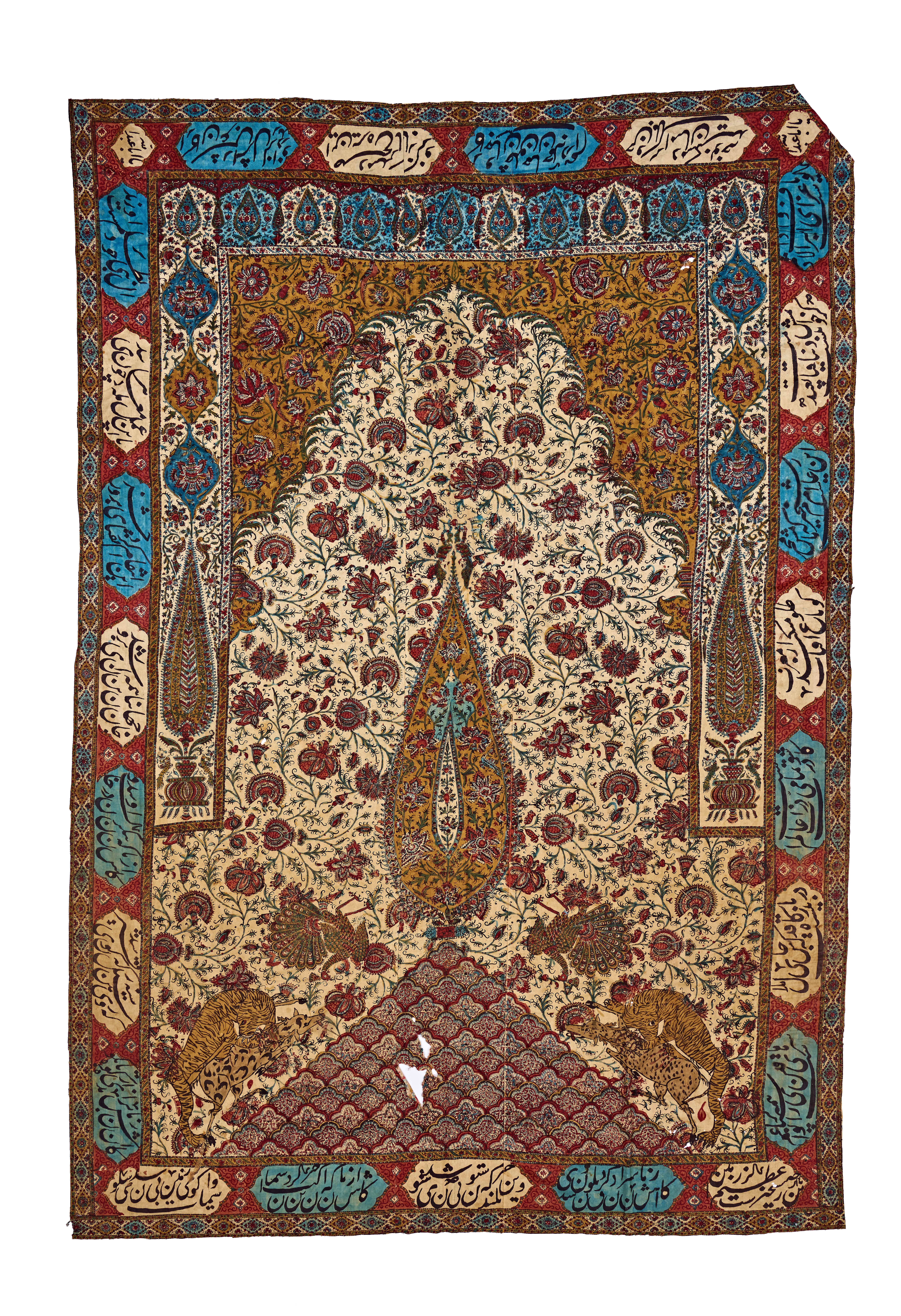 At the base, pairs of confronted animals—including tigers and peacocks—add a lively narrative element, their bodies integrated into the surrounding vegetal scrolls. The lower section is articulated with a series of scalloped, overlapping registers in red and blue.