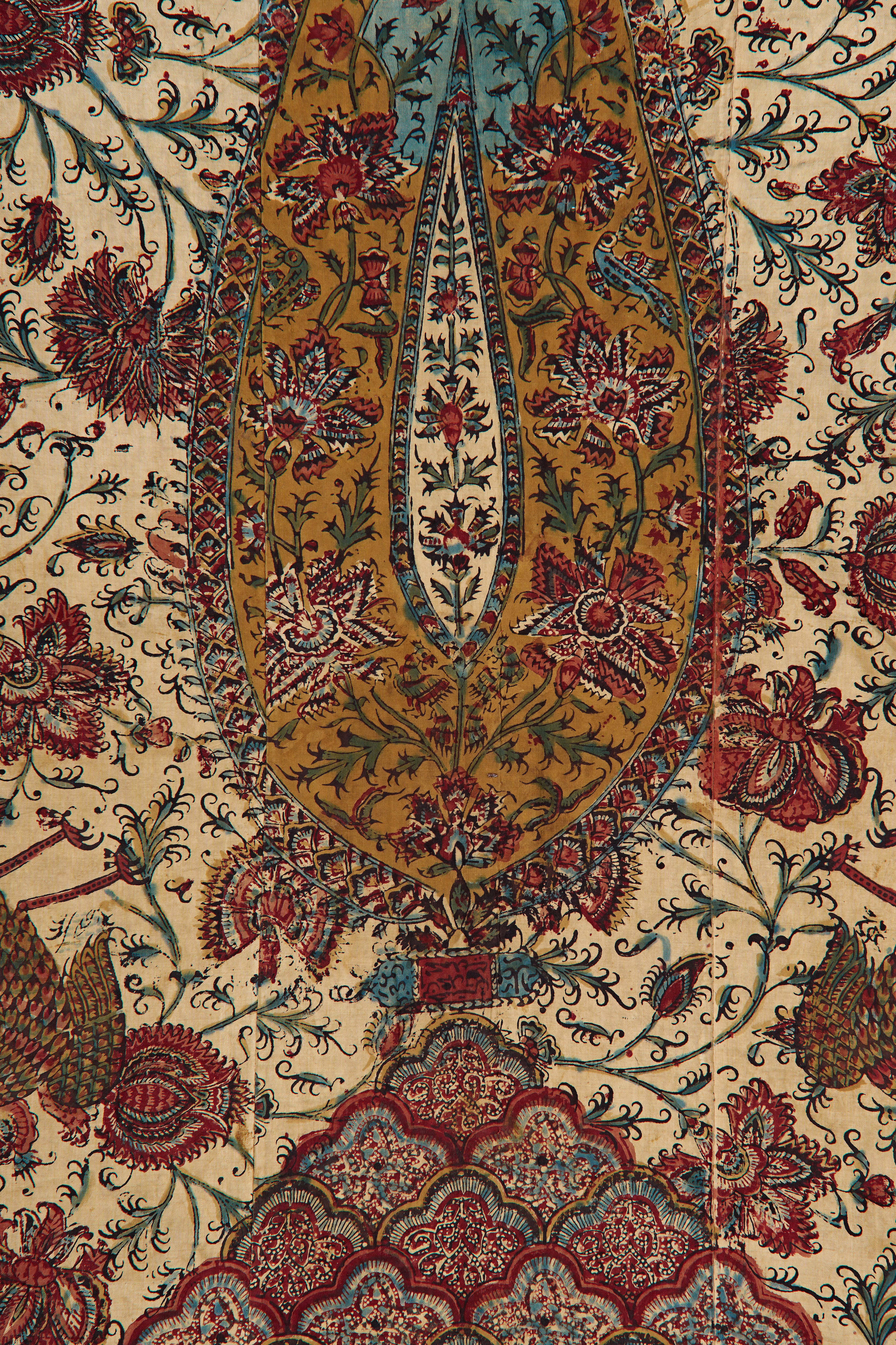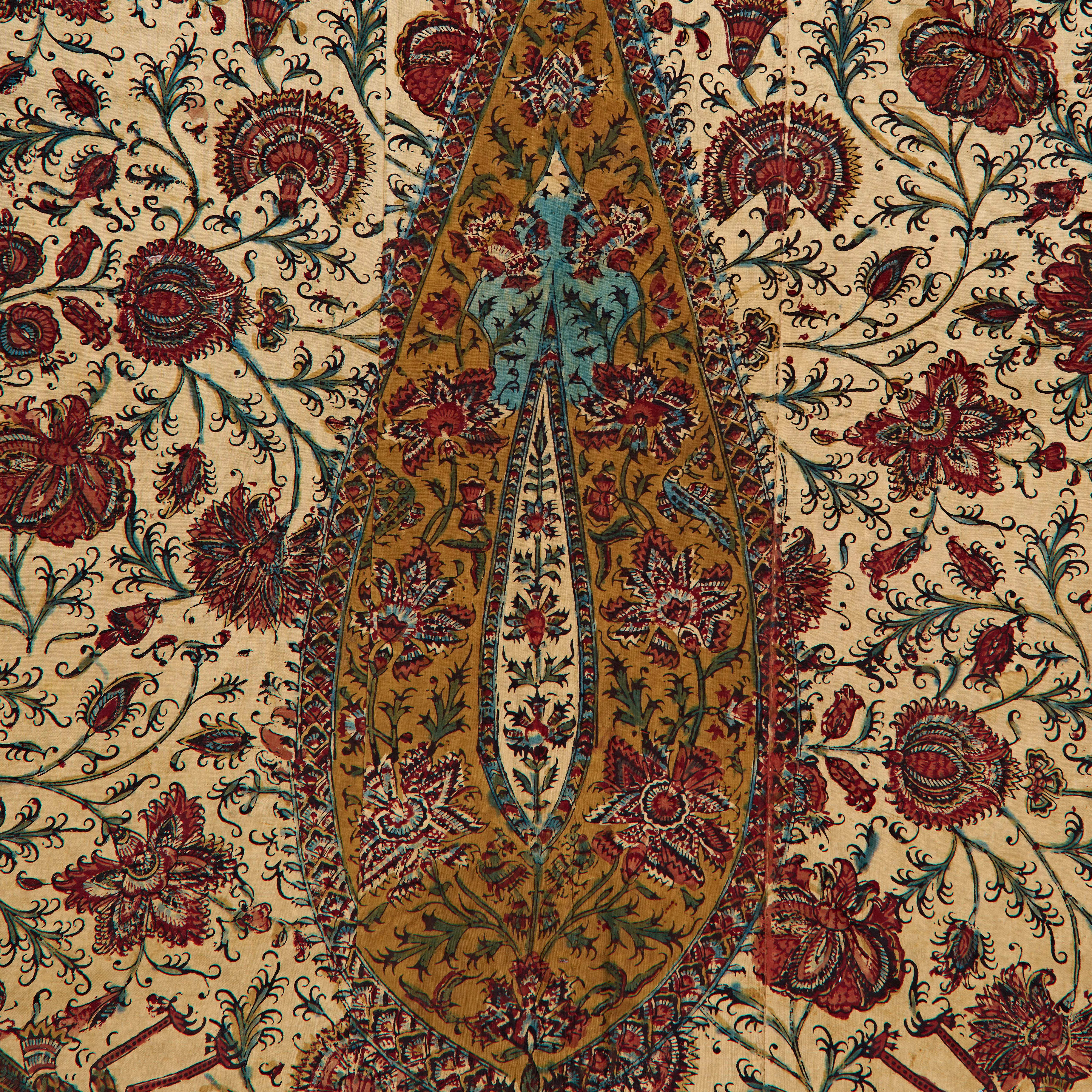 Of rectangular form, the ground is richly painted and resist-dyed in shades of deep red, indigo, ochre, and black, with finely drawn details heightened by delicate line work. The central field is dominated by a large lobed mihrab-shaped arch enclosing a teardrop medallion filled with scrolling floral sprays, rendered with remarkable naturalism in red and blue against a golden ground. Surrounding the arch are dense floral arabesques, including carnations and blossoms, set against a cream field that enhances the vibrancy of the palette.
