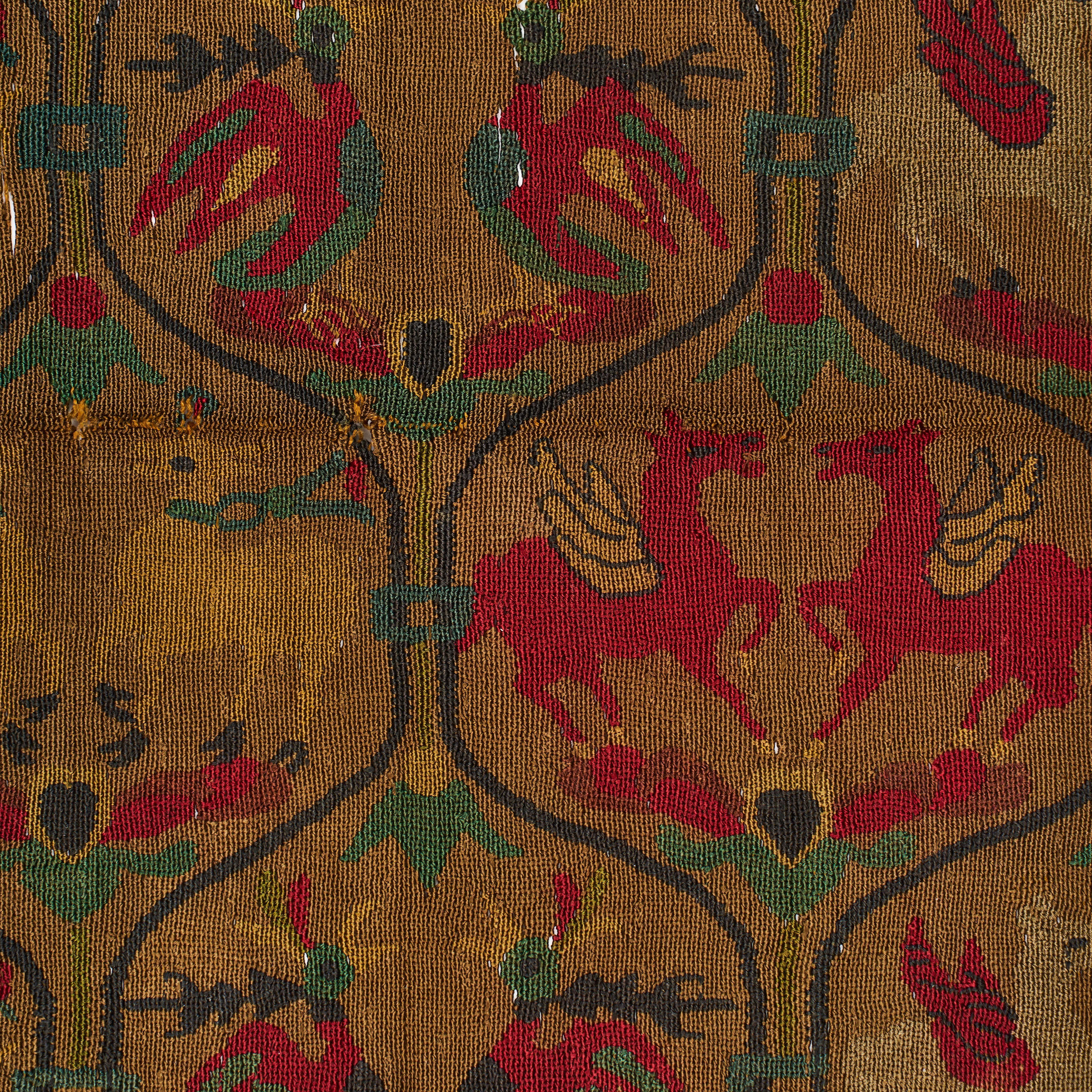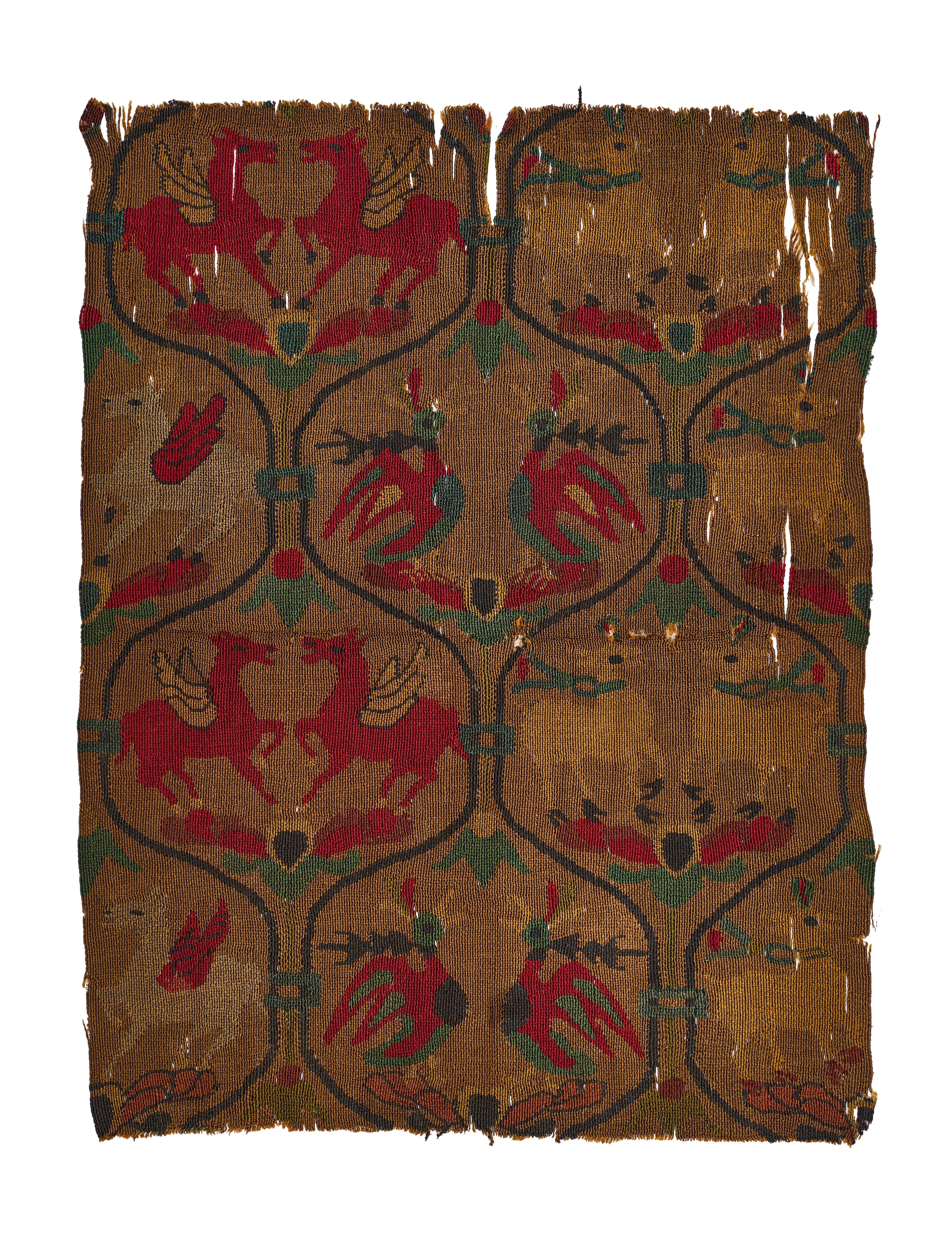 Woven in rich hues of red, green, and black against a golden-brown ground, this silk samite fragment is patterned with alternating roundels containing winged horses and paired birds. The design is enclosed within a lattice of intersecting lines forming ogival medallions, each containing motifs imbued with symbolic meaning. The winged horses, shown in mirrored pairs, recall Central Asian mythological imagery, while the birds—possibly pheasants or parrots—evoke themes of fertility, prosperity, and divine protection.