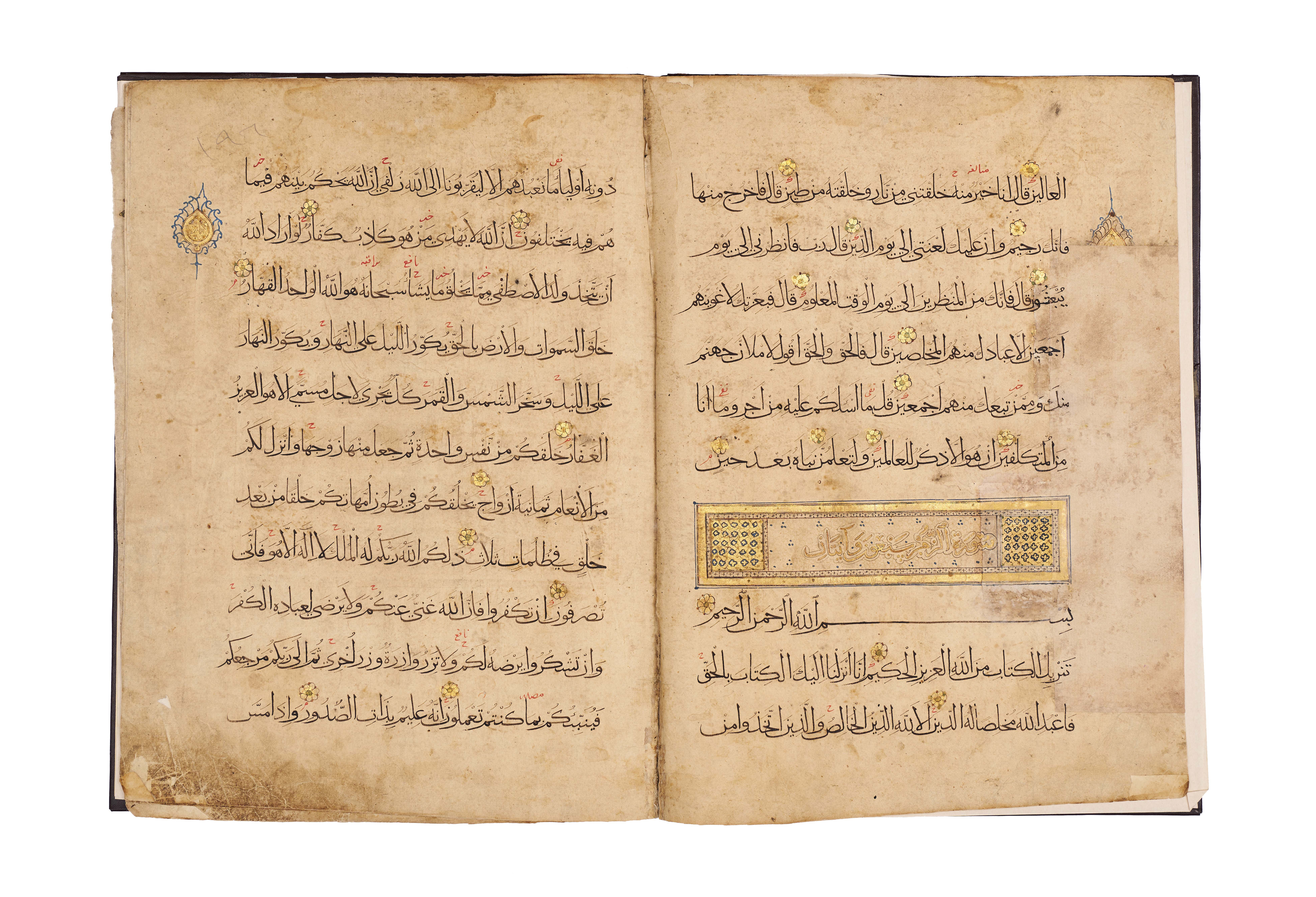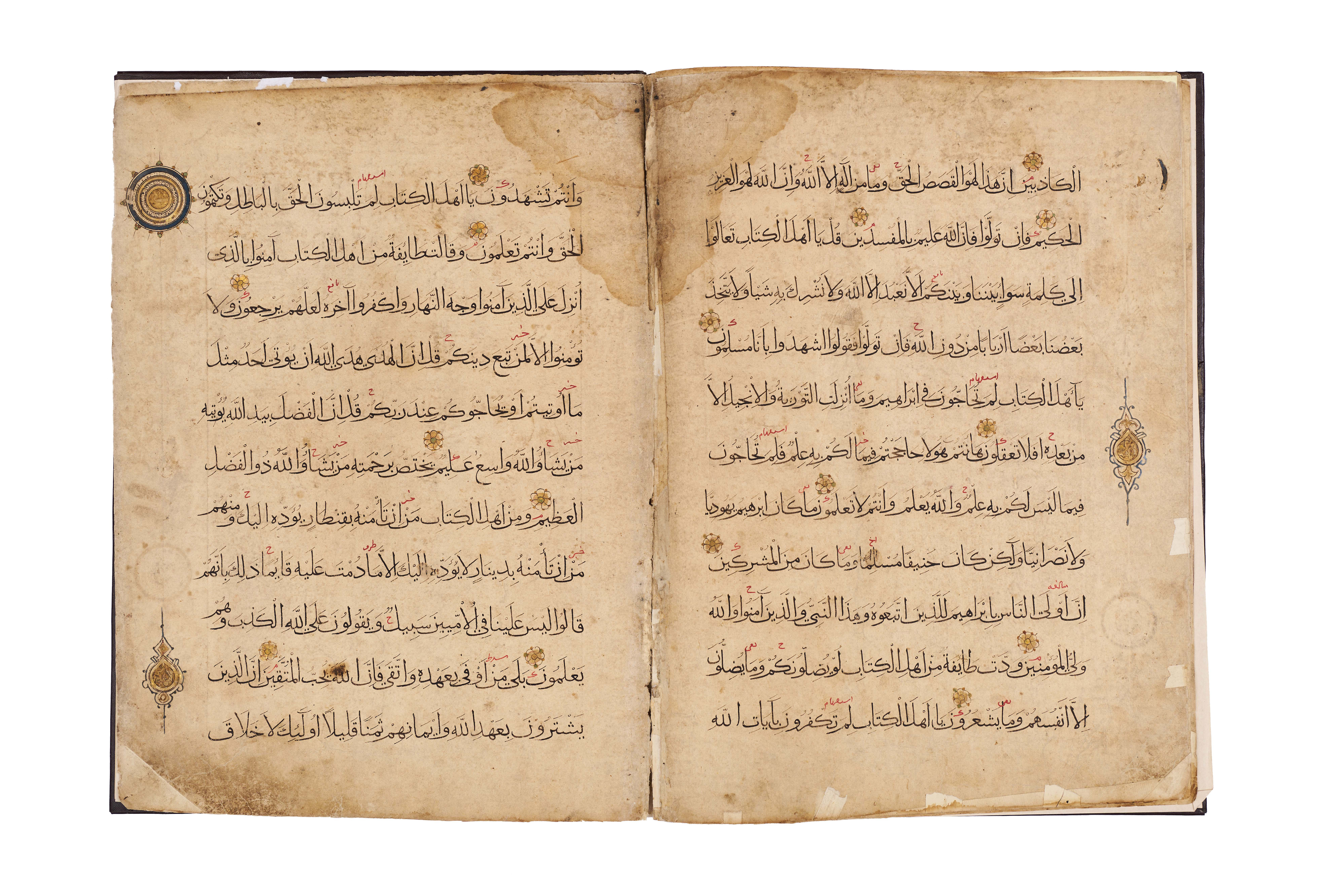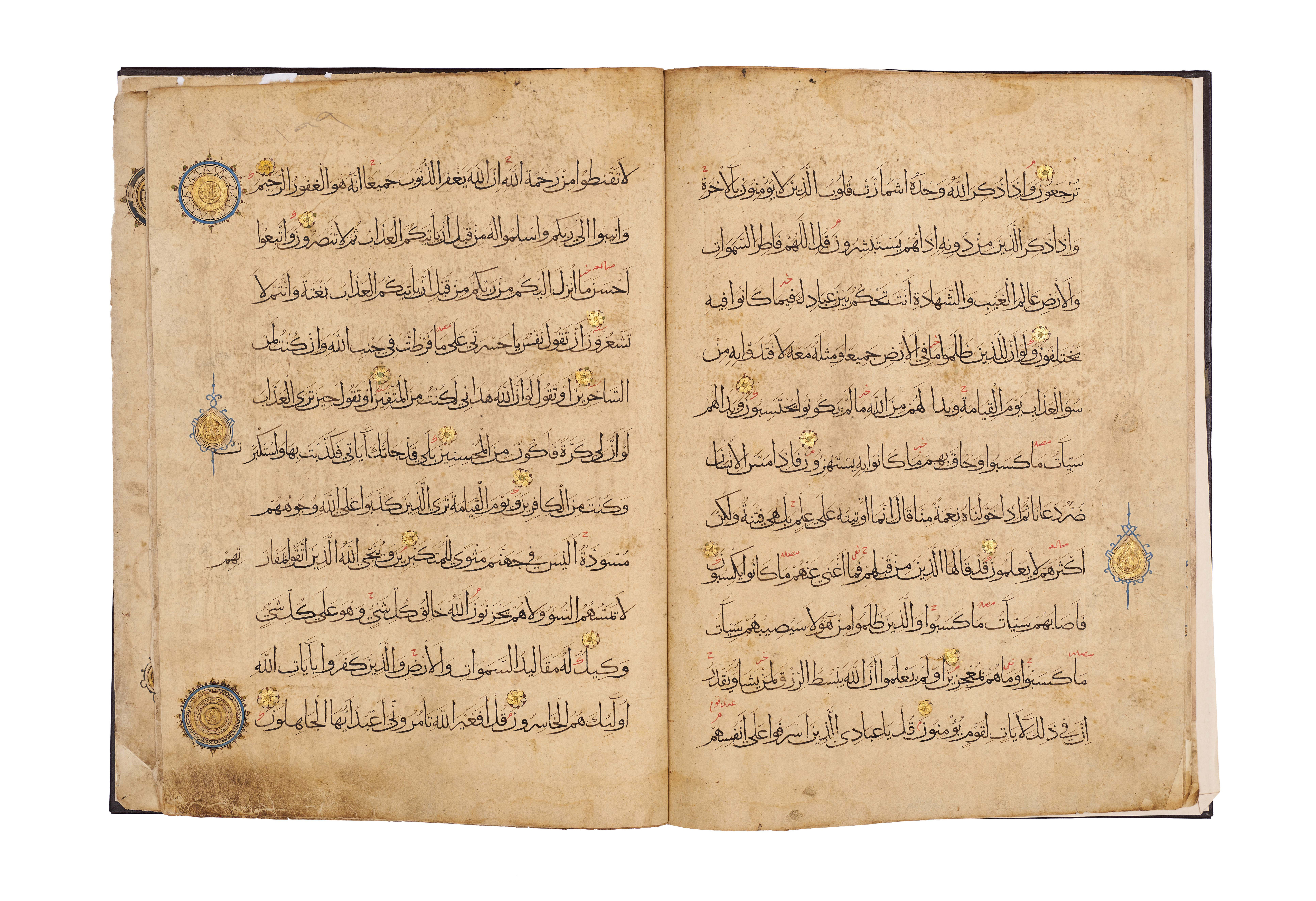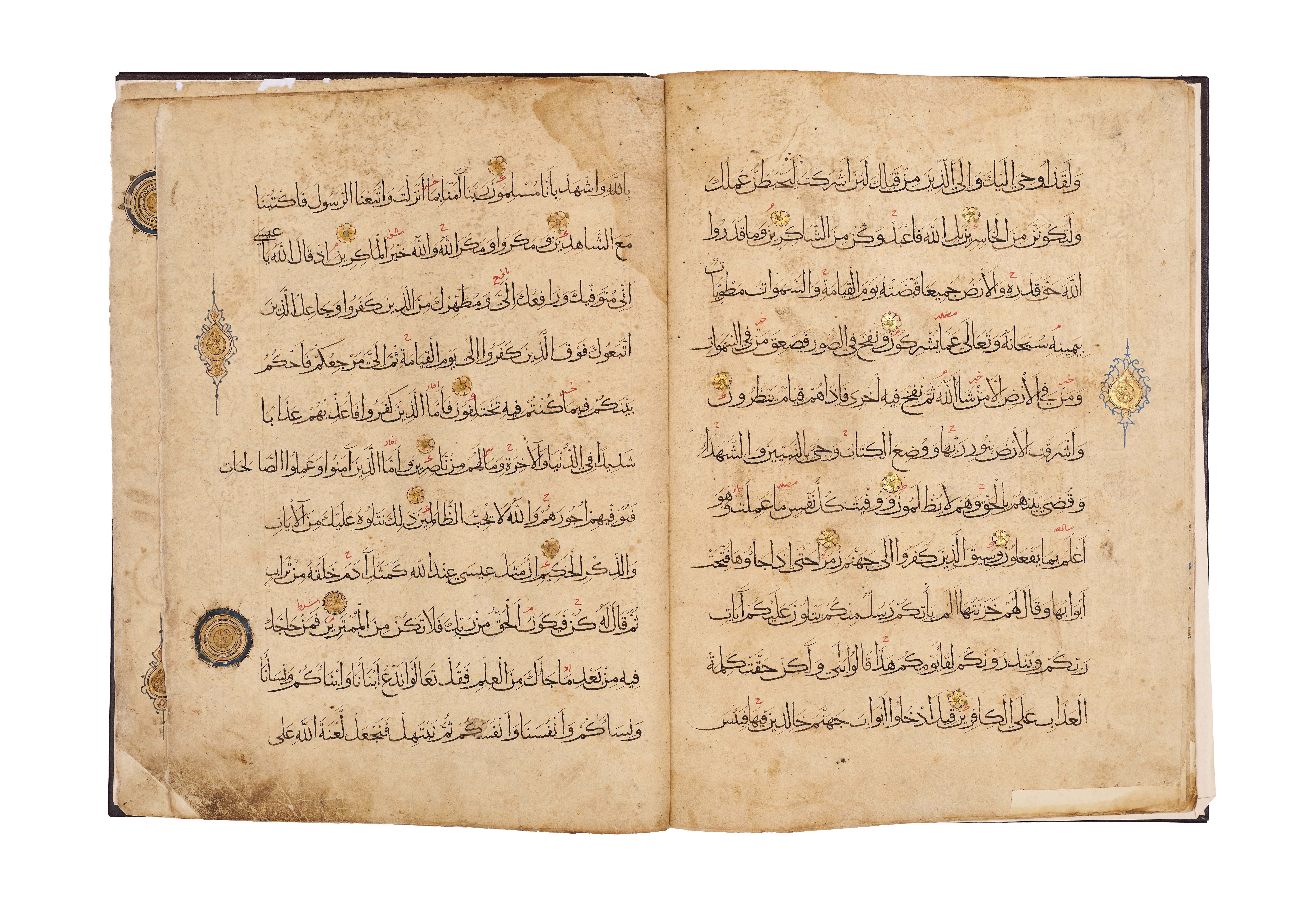 Comprises five pages from Juz’ 23 and 24, beginning with Surah Al-Zumar, together with three pages from Surah Al ‘Imran, written in elegant black script with red diacritical marks and illuminated with delicate rosettes and geometric medallions. Each page is carefully executed with clear, spacious lines of text, enriched with gold verse markers and occasional ornamental panels, including a highlighted cartouche at the opening of a section.Bound in a later brown leather binding.