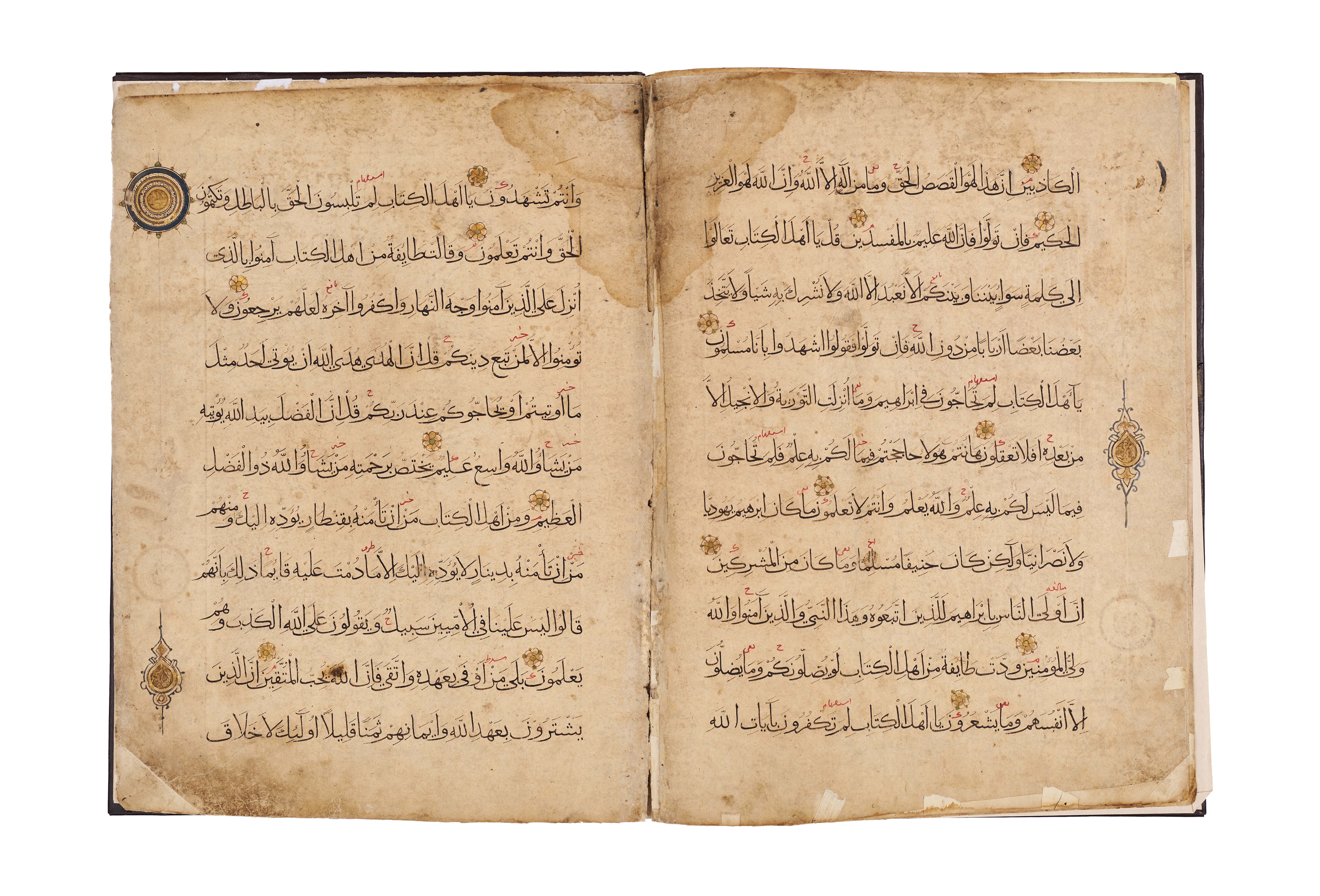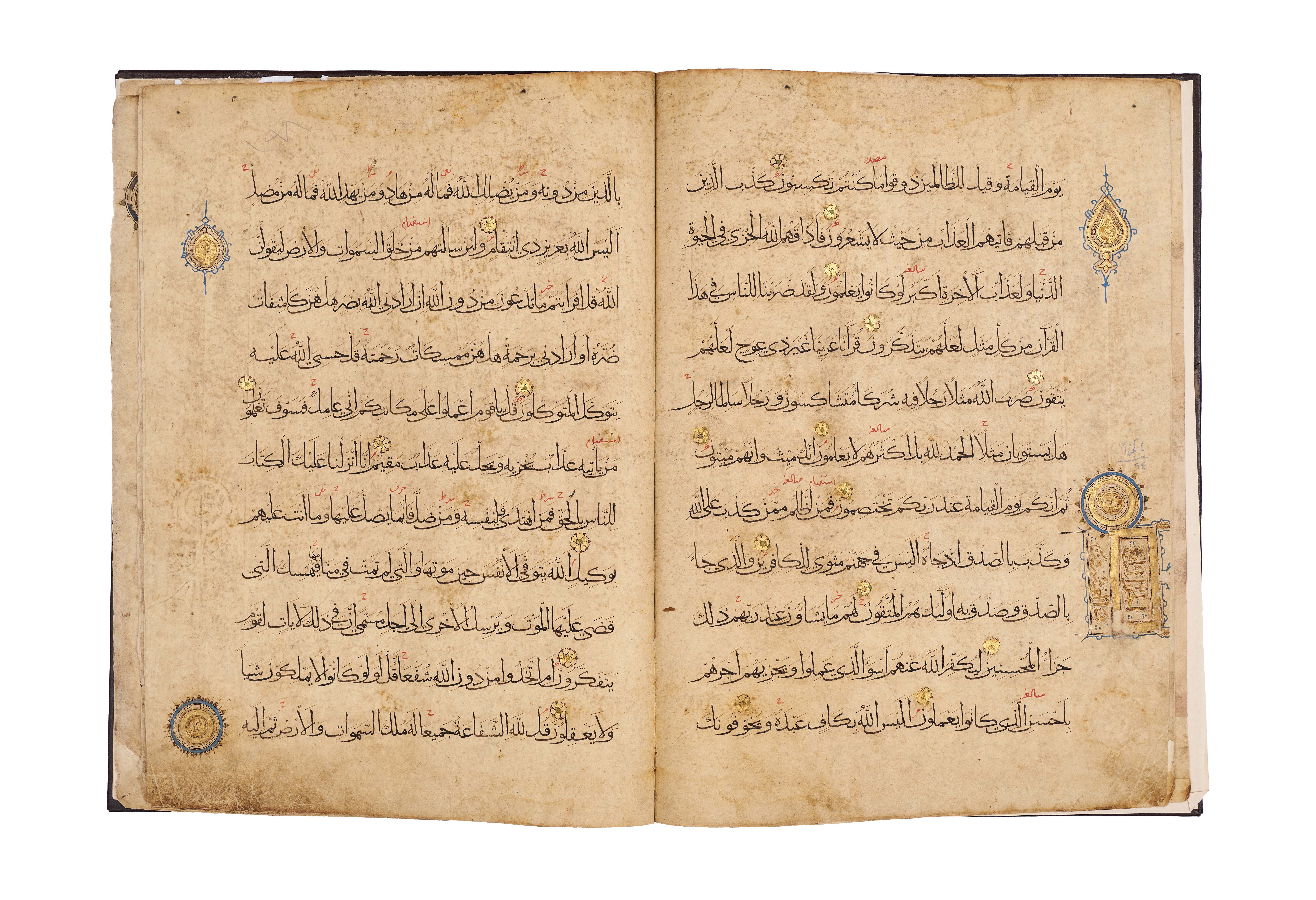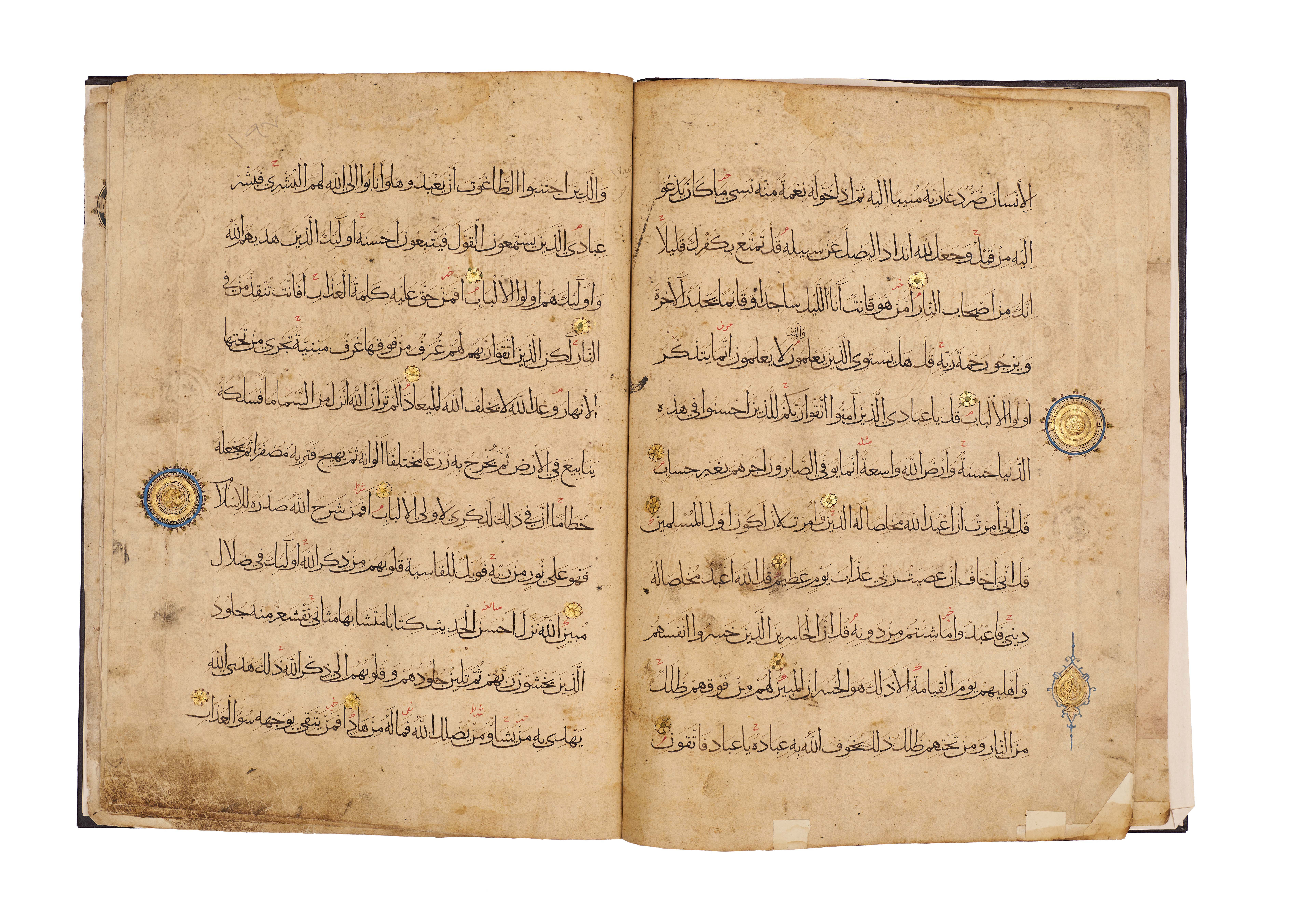 Comprises five pages from Juz’ 23 and 24, beginning with Surah Al-Zumar, together with three pages from Surah Al ‘Imran, written in elegant black script with red diacritical marks and illuminated with delicate rosettes and geometric medallions. Each page is carefully executed with clear, spacious lines of text, enriched with gold verse markers and occasional ornamental panels, including a highlighted cartouche at the opening of a section.Bound in a later brown leather binding.
