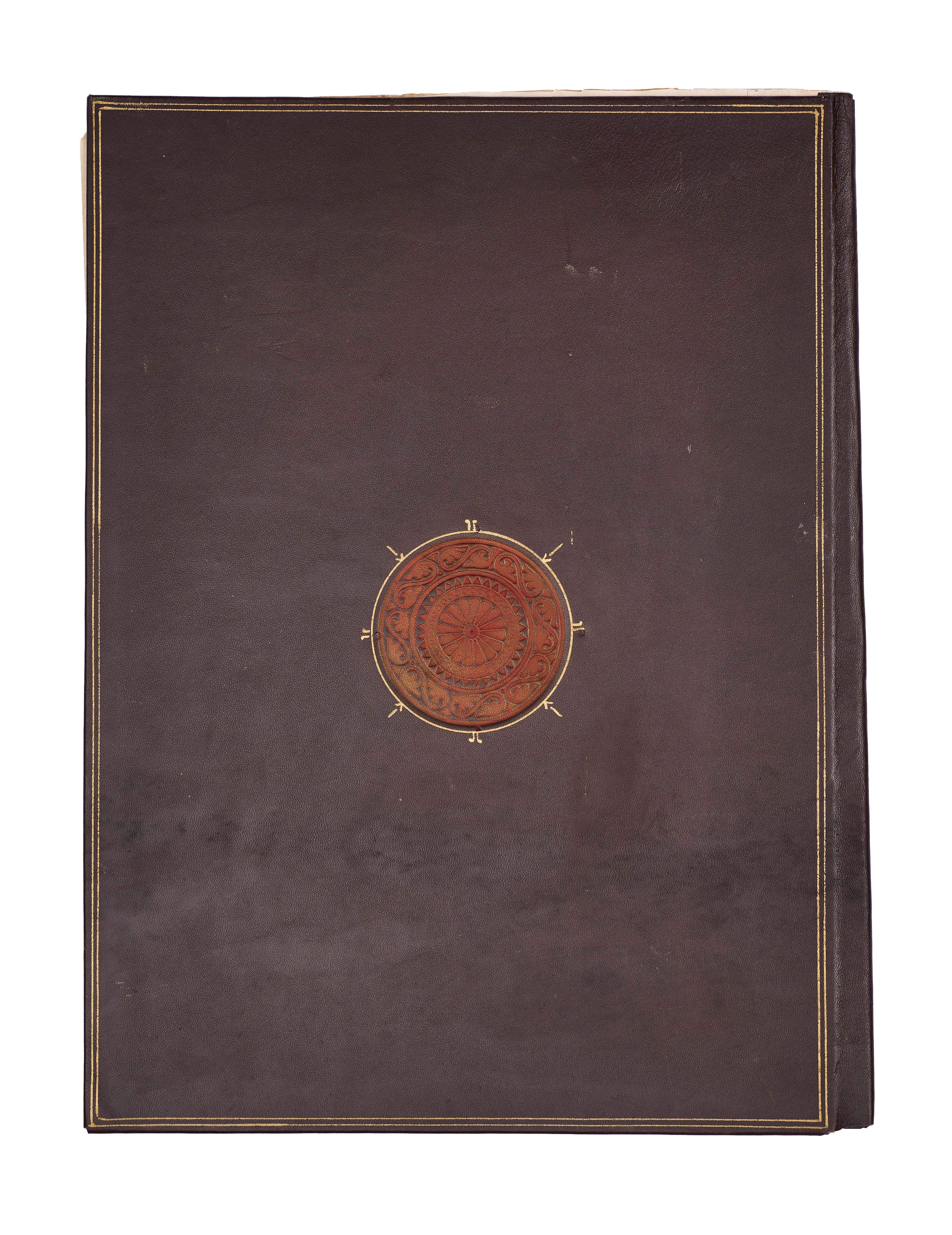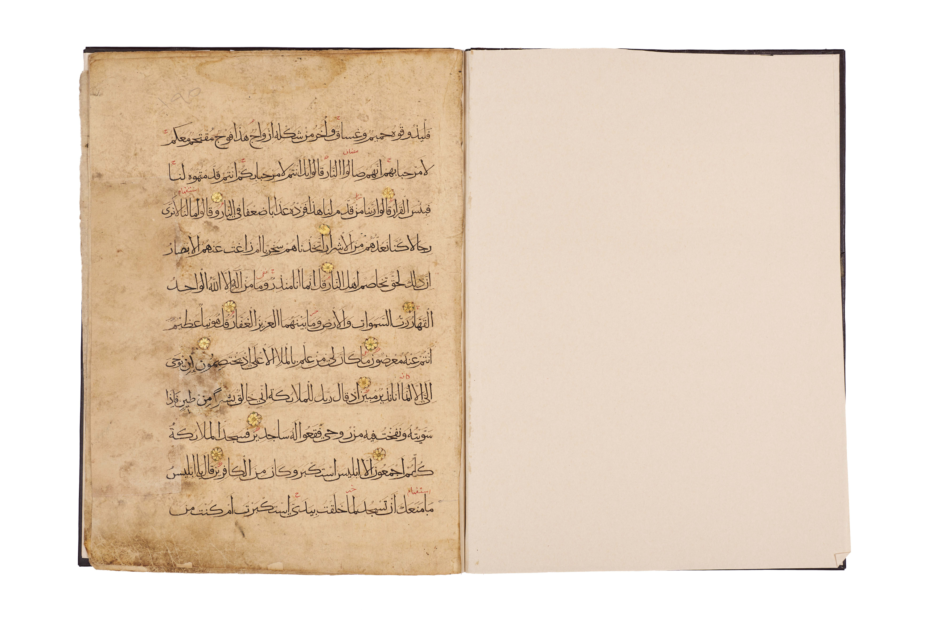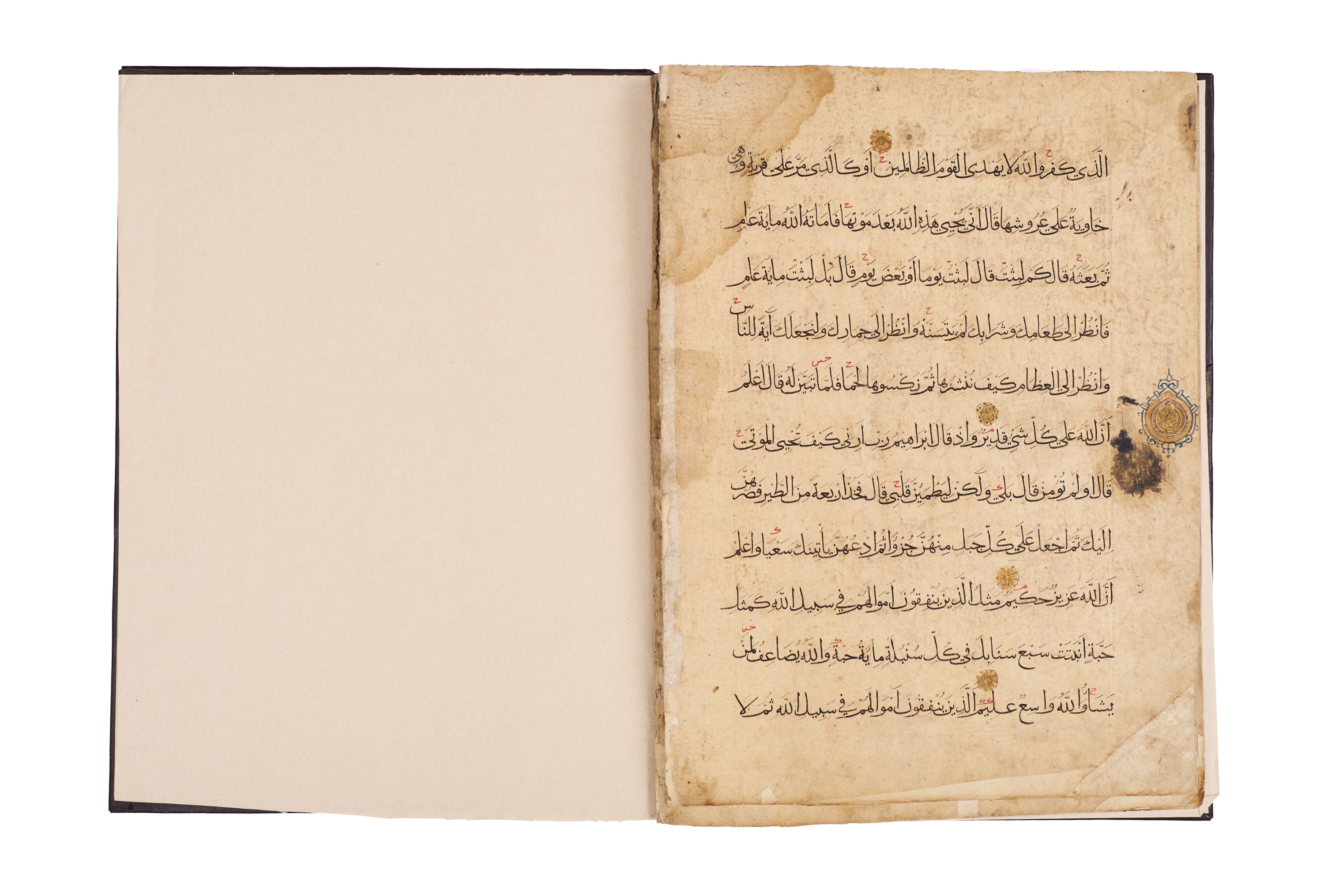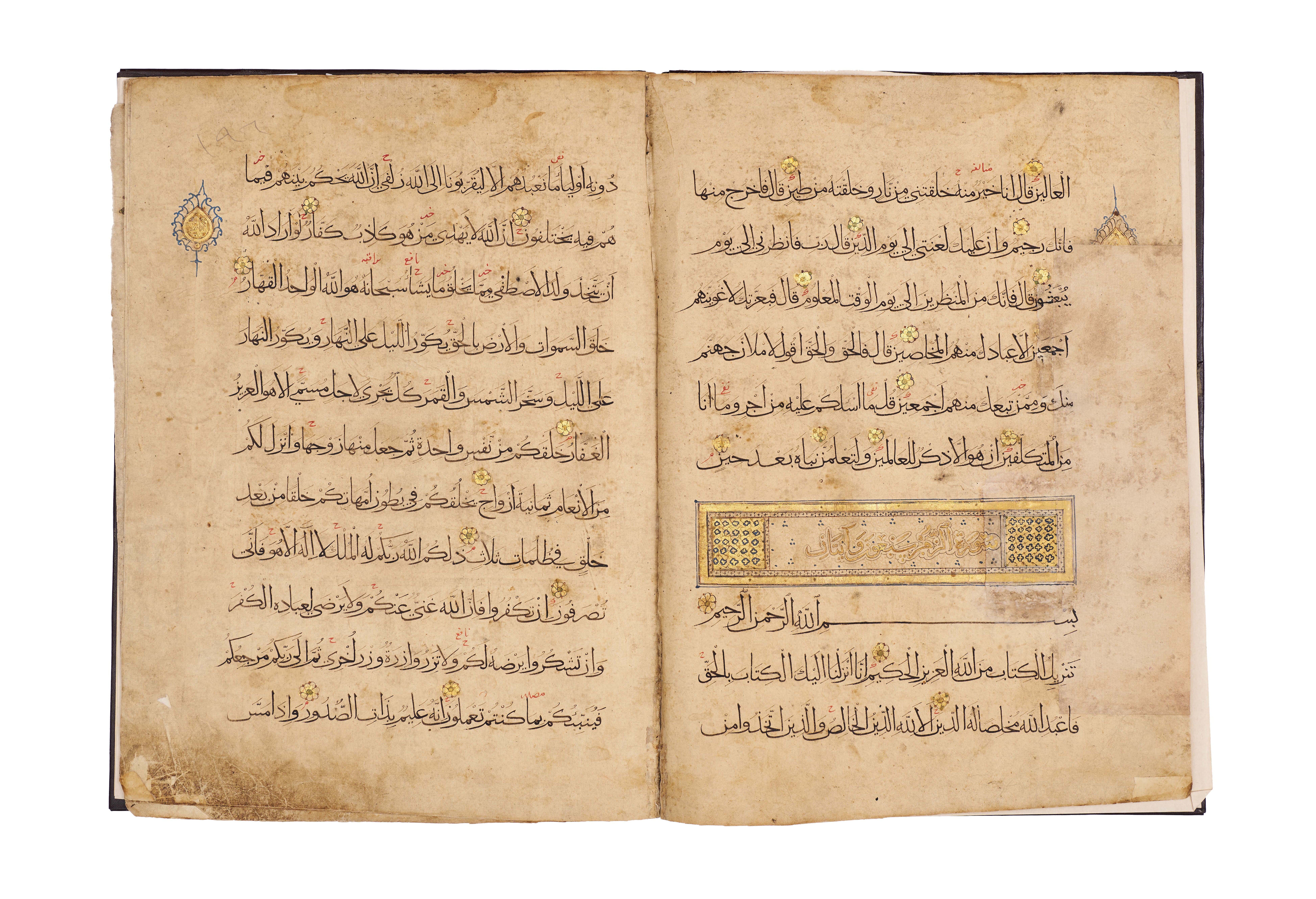 Comprises five pages from Juz’ 23 and 24, beginning with Surah Al-Zumar, together with three pages from Surah Al ‘Imran, written in elegant black script with red diacritical marks and illuminated with delicate rosettes and geometric medallions. Each page is carefully executed with clear, spacious lines of text, enriched with gold verse markers and occasional ornamental panels, including a highlighted cartouche at the opening of a section.Bound in a later brown leather binding.
