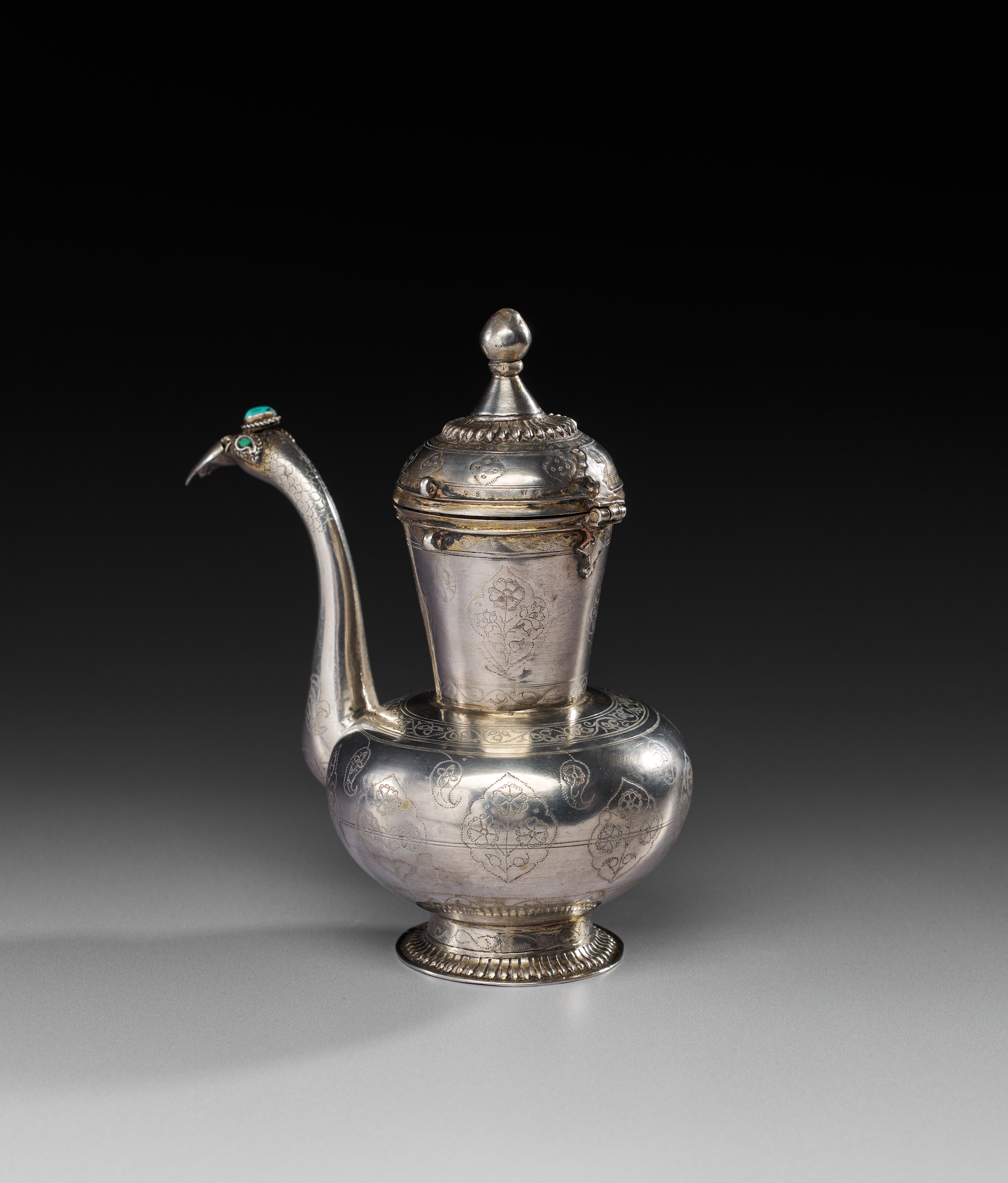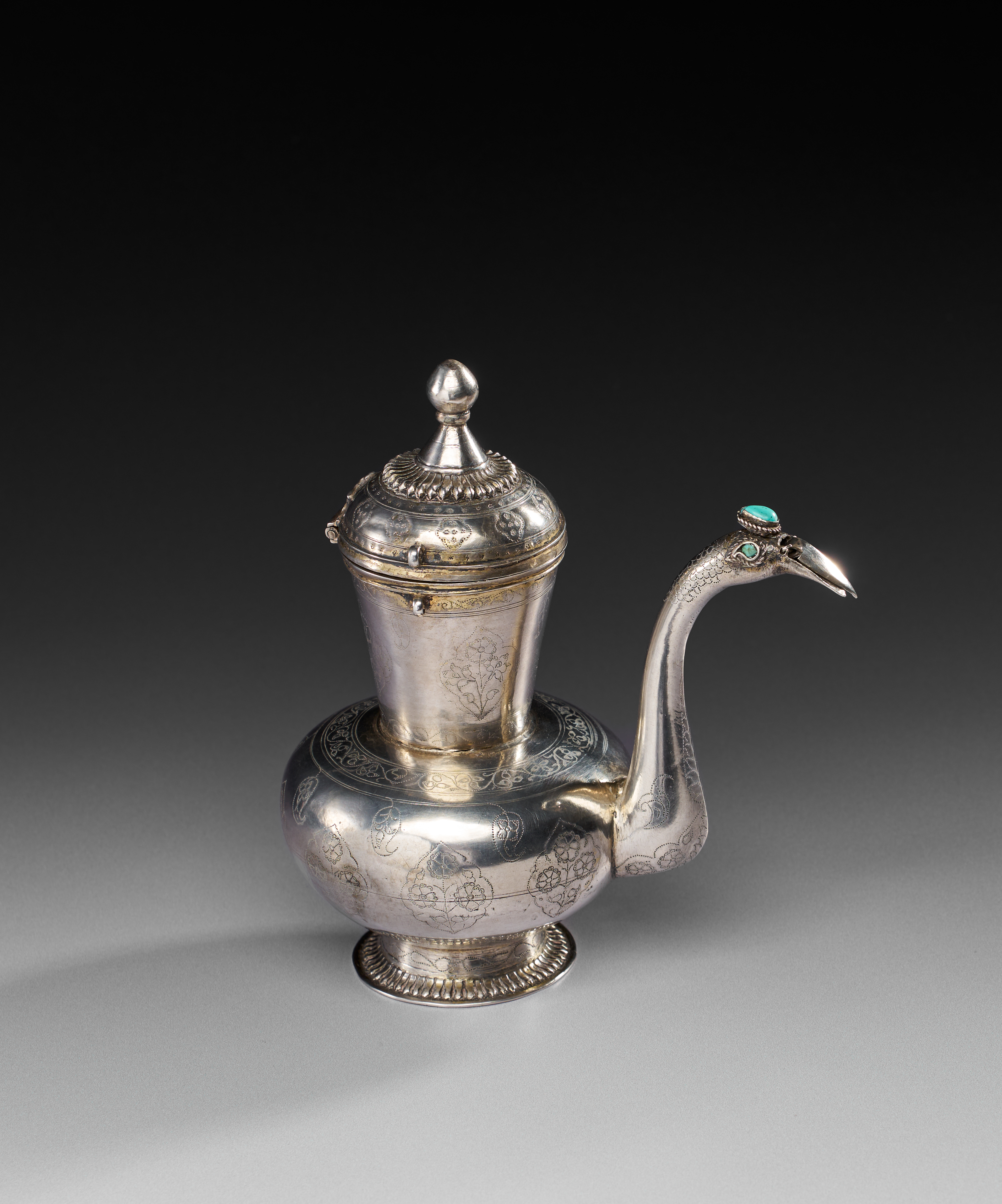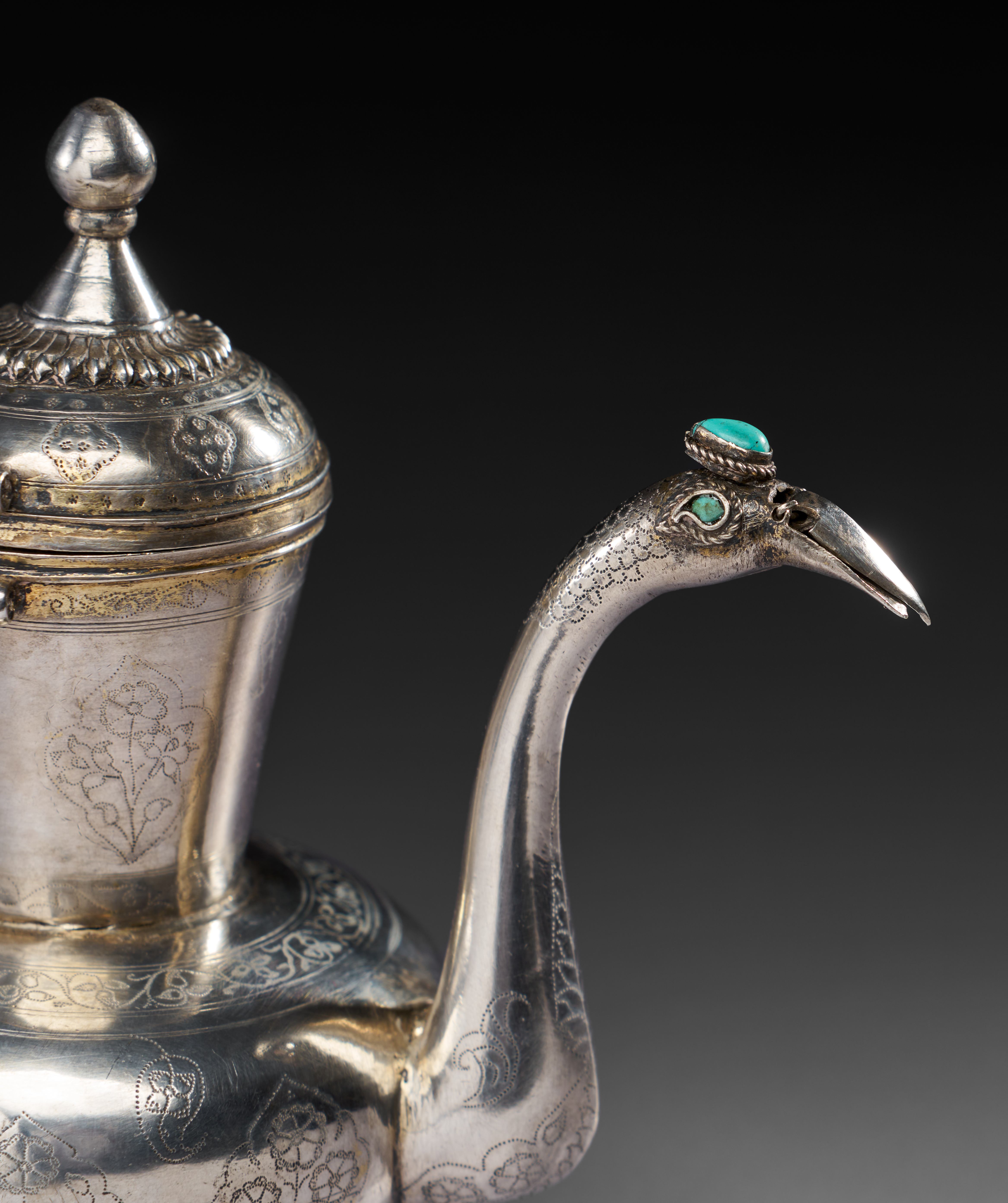 Of bulbous form on a spreading foot, rising to a tall flaring neck with domed hinged cover, the spout modelled as a bird’s head. The eyes and crown of the spout are set with turquoise cabochons, lending a striking accent to the silver surface. The body is engraved with delicate arabesques and floral motifs within medallions, the lid decorated en suite with petal and rosette borders.